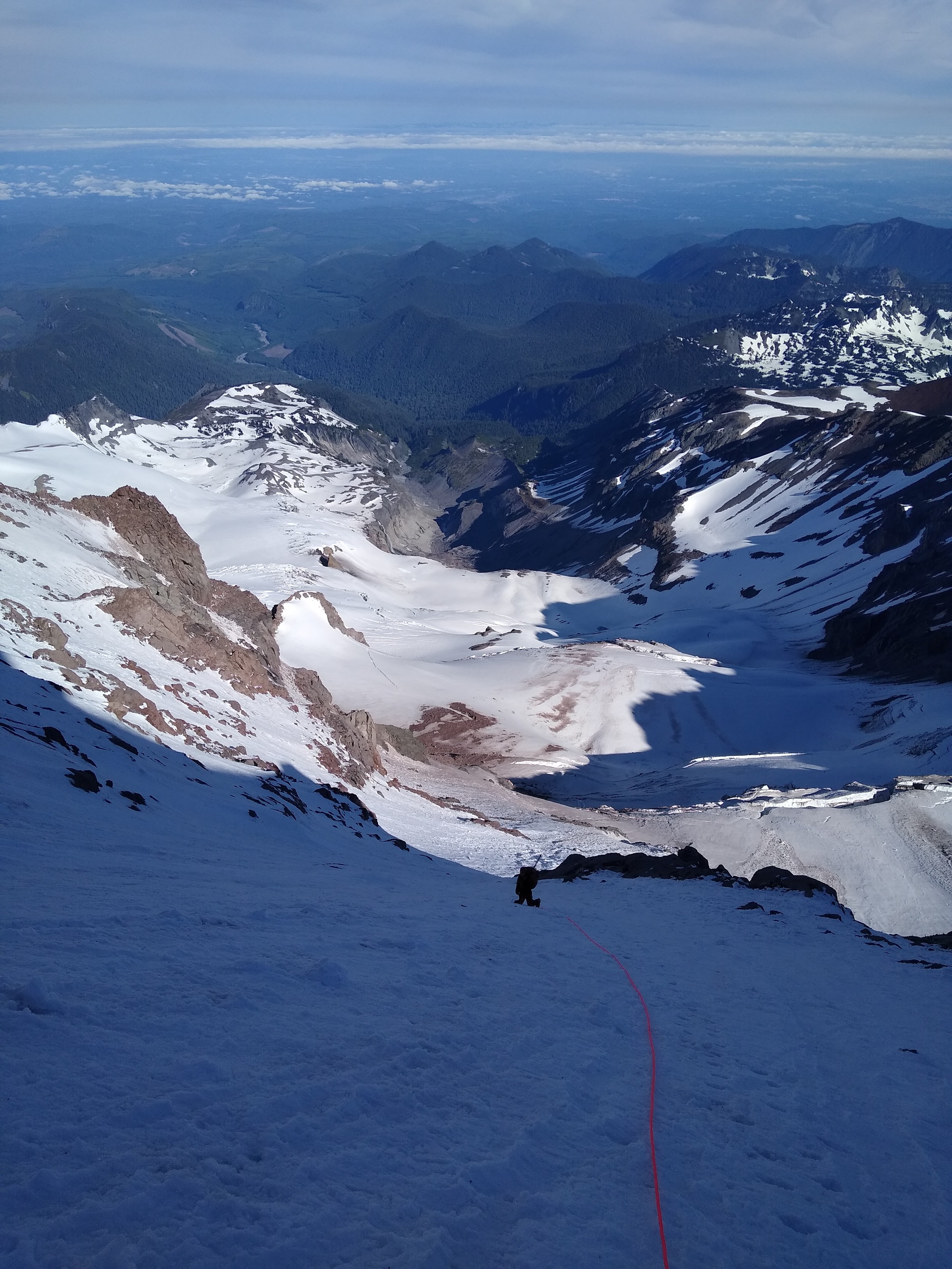 After that photo I took of John starting the final gully to the mixed/ice step at the top of the technical section of the route, we didn't get a single photo until most of the way down the Emmons. It was certainly a relief when we started walking downhill, however we still had difficulties to surmount. A long horizontal traverse to the east was required to meetup with the flagged path for the Emmons, and a few large crevasses required crossing. Since the Emmons was east facing, it was cold and shady in the late afternoon, and the wind was still whipping down the slopes. It wasn't until we got about 3000 feet down that the winds died off and I warmed up. I was felling pretty ill though from being battered all afternoon and being cold.