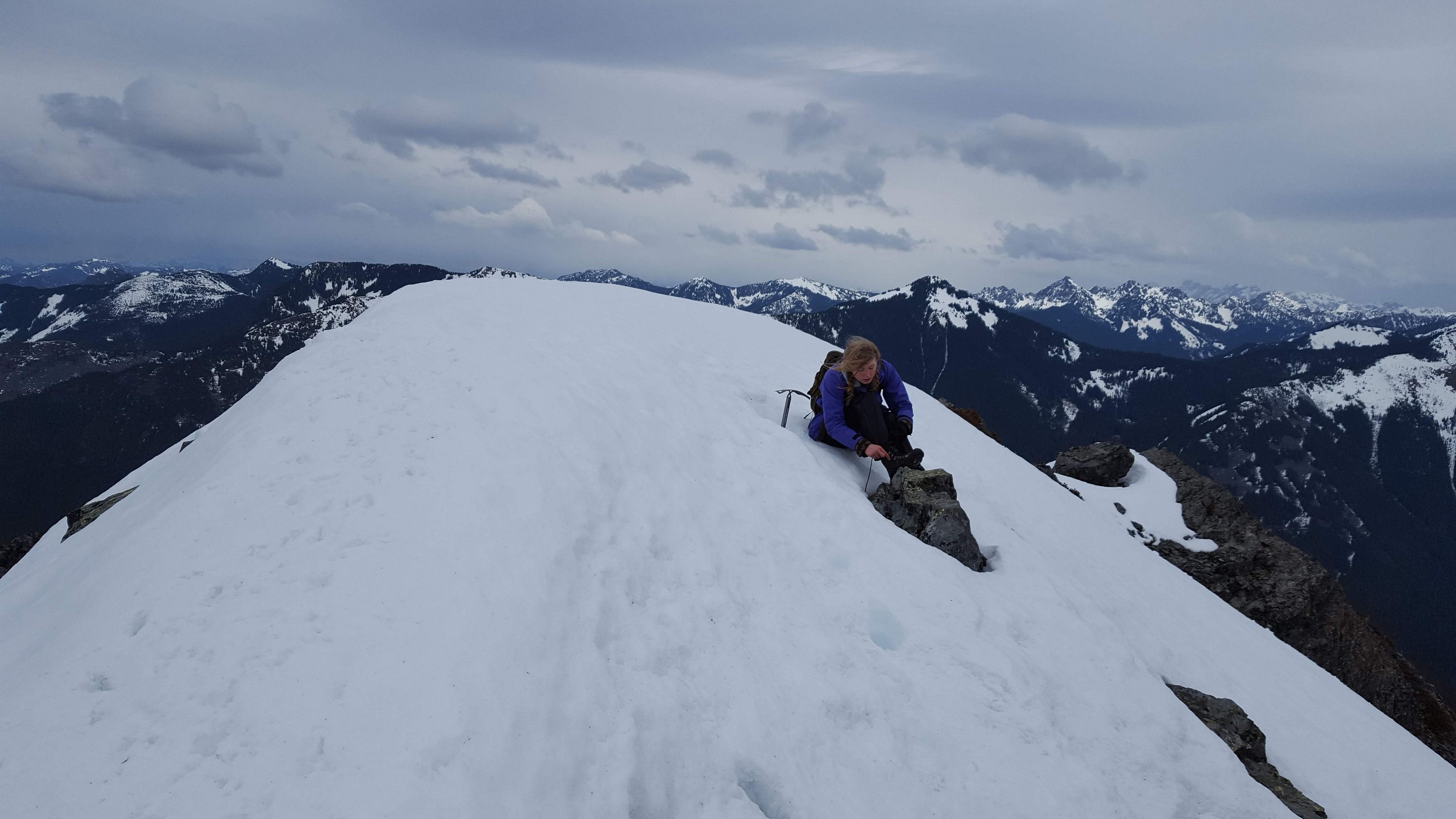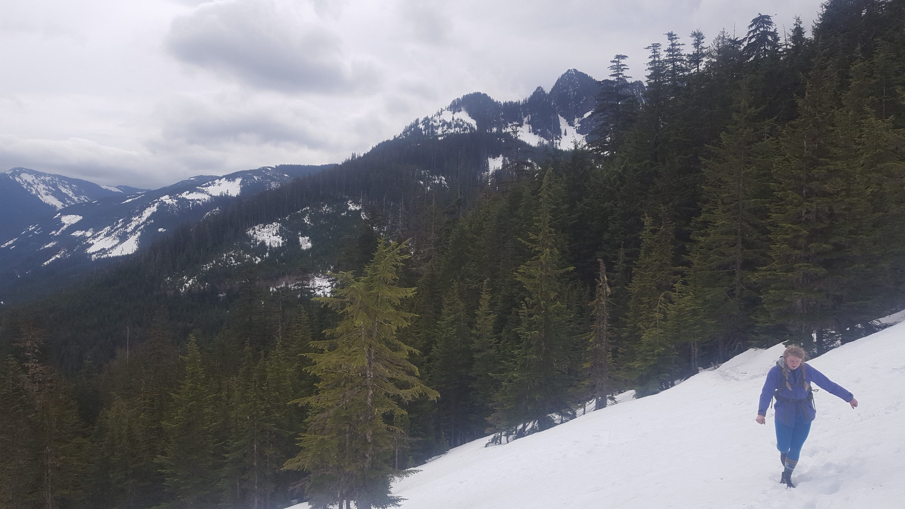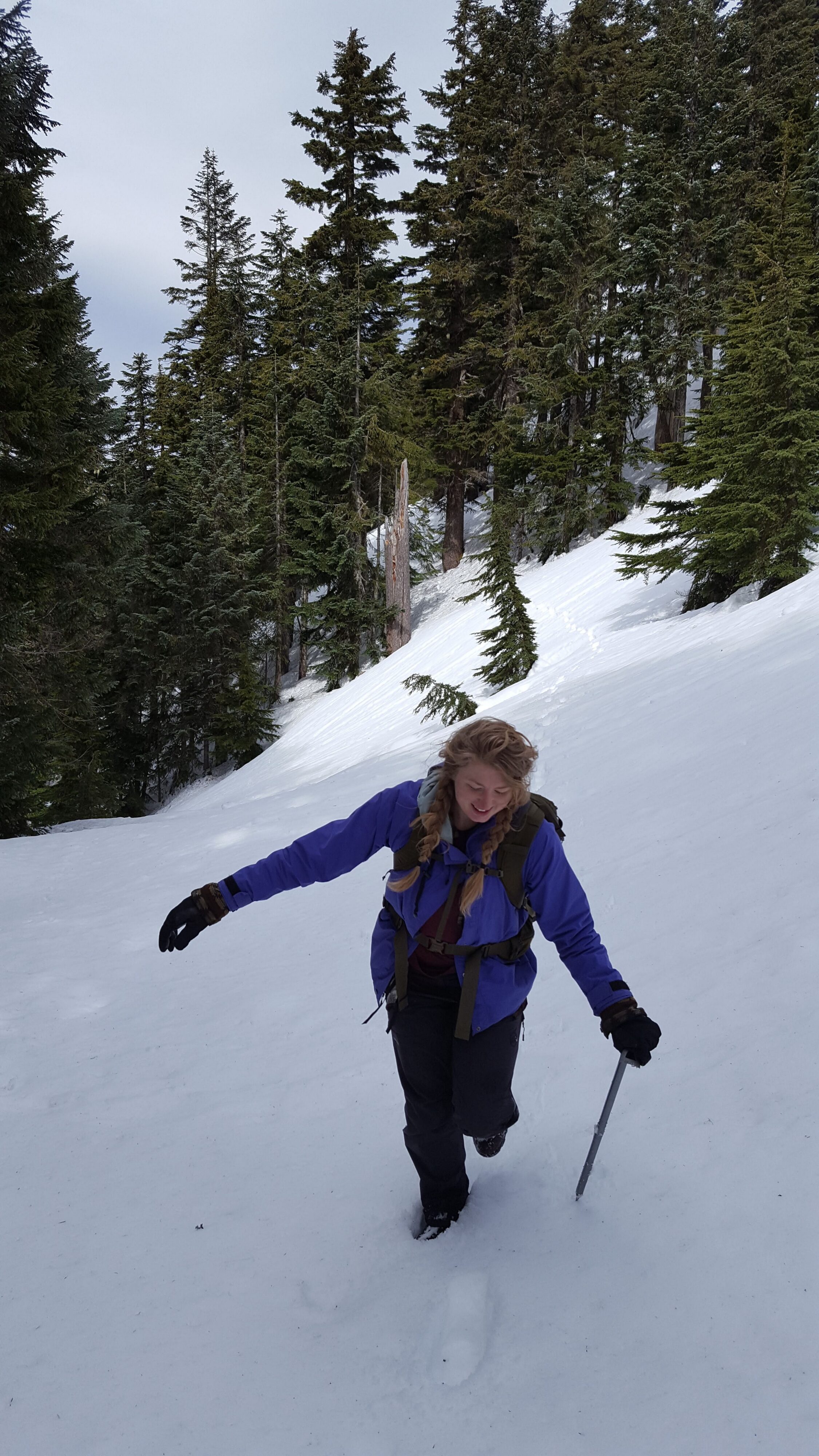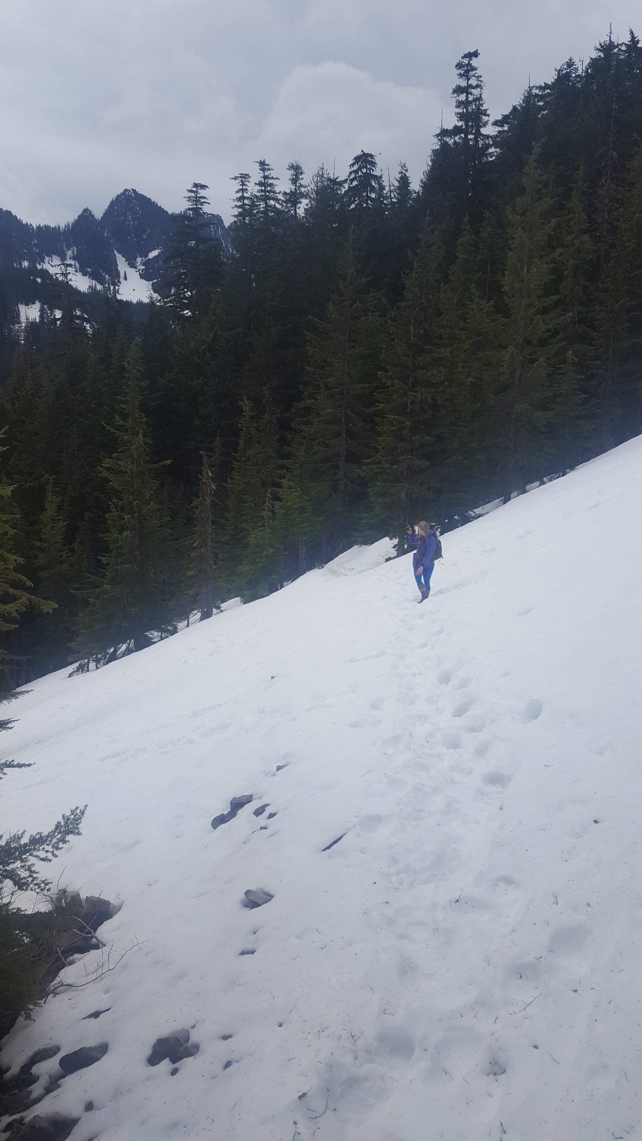 I hiked up McClellan Butte last Monday with my friend Ariana, and we hit the trail at about 9:30am after a quick stop at a lovely cafe in North Bend. The road to the trailhead was still closed but only added about a quarter mile each way. We started up the trail, which was mostly dry for the first couple of miles, as we passed by a few old logging roads. Luckily the signage was real clear so we never wondered which trail to take. When the trail began to switchback up about the 3200 foot level, the snow really became continuous however there were tracks from a few parties that had ascended the previous week of great weather. Just as the switchbacks ended and the trail began the long ascending traverse across the SE slopes of McClellan, we started heading straight up the first open gully we came across leading directly towards the summit.