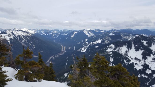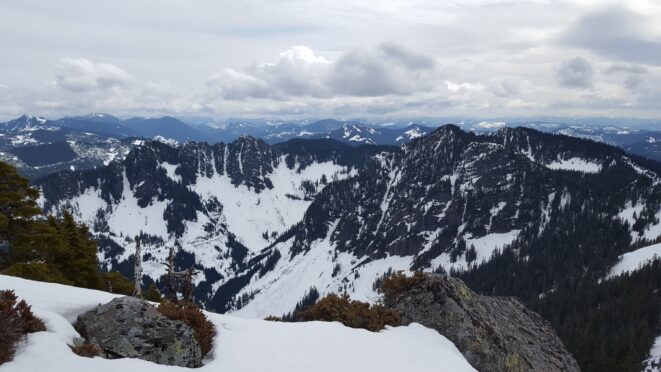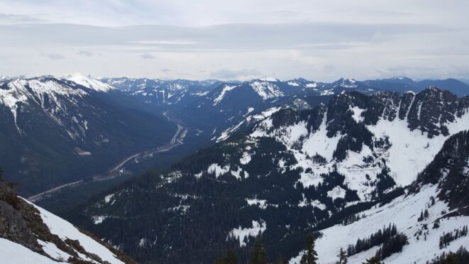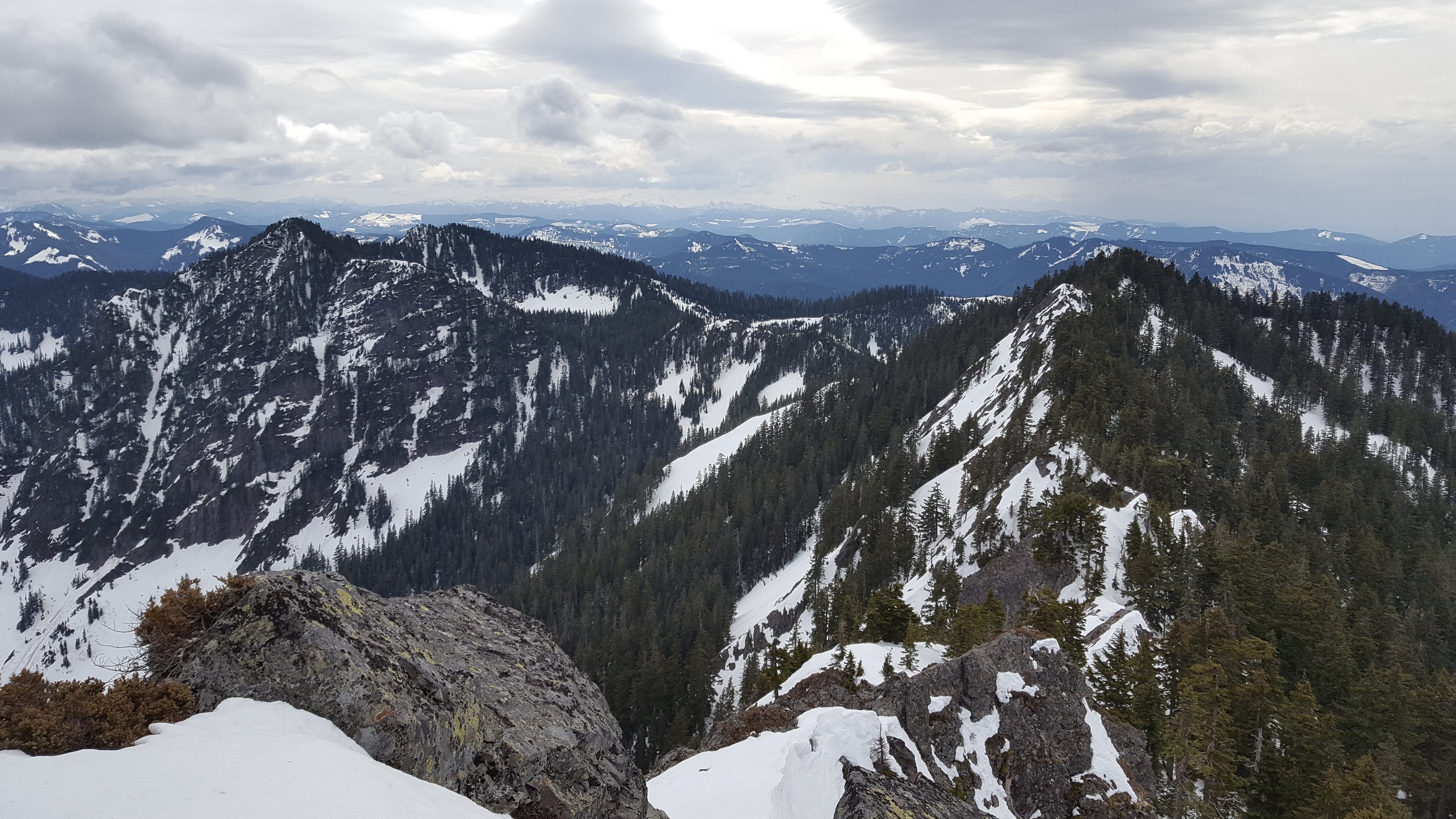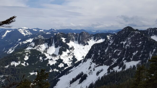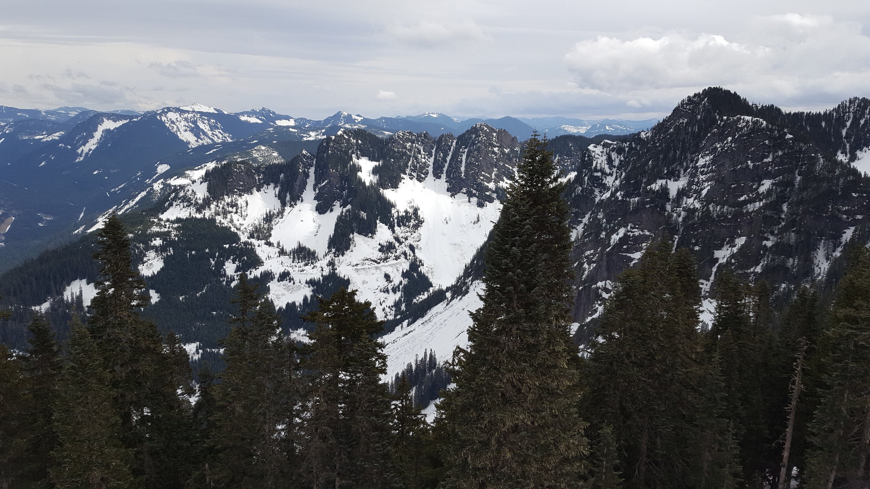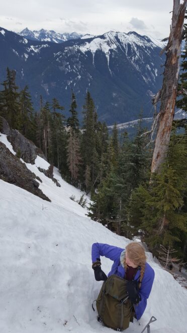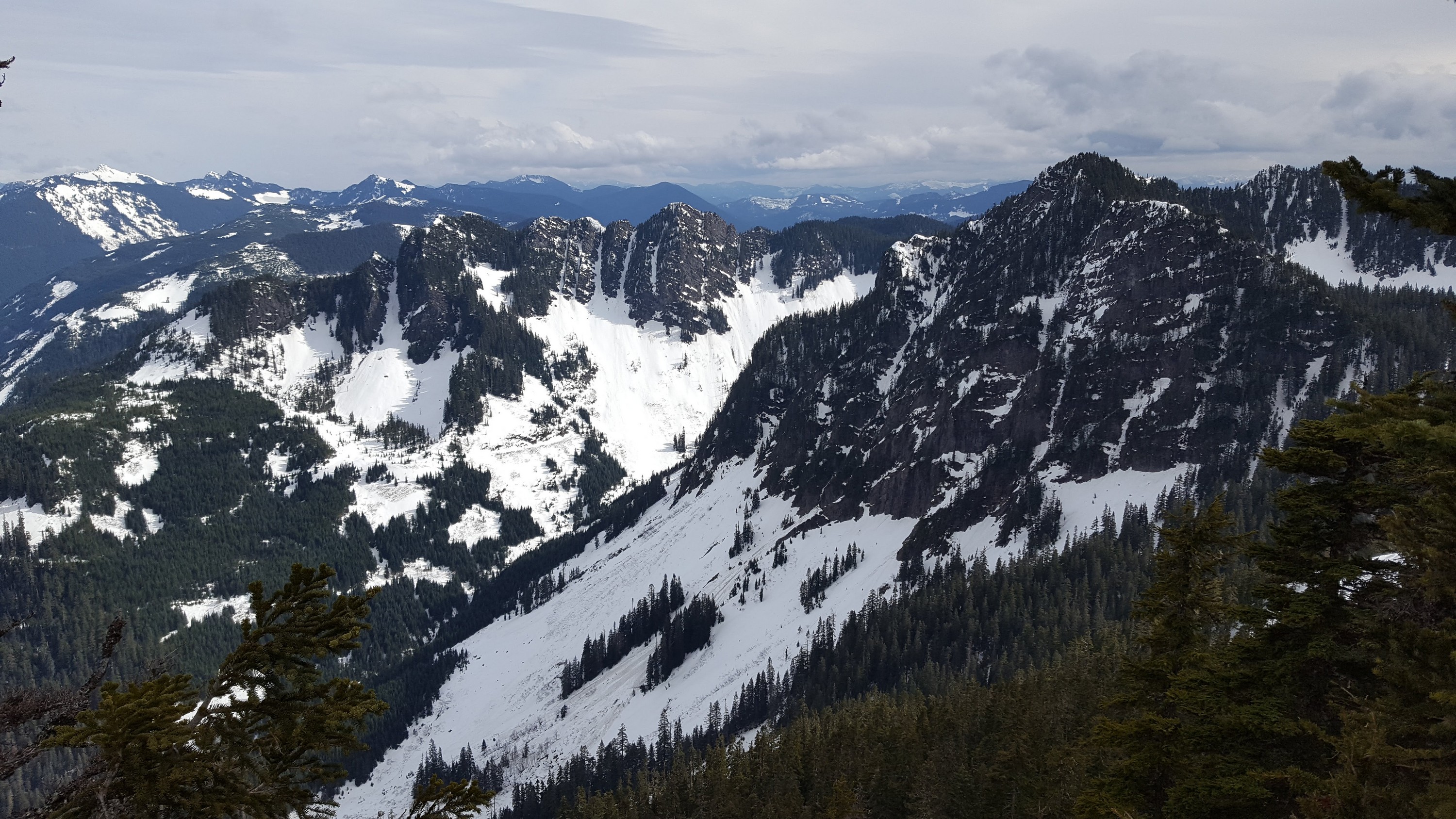 I hiked up McClellan Butte last Monday with my friend Ariana, and we hit the trail at about 9:30am after a quick stop at a lovely cafe in North Bend. The road to the trailhead was still closed but only added about a quarter mile each way. We started up the trail, which was mostly dry for the first couple of miles, as we passed by a few old logging roads. Luckily the signage was real clear so we never wondered which trail to take. When the trail began to switchback up about the 3200 foot level, the snow really became continuous however there were tracks from a few parties that had ascended the previous week of great weather. Just as the switchbacks ended and the trail began the long ascending traverse across the SE slopes of McClellan, we started heading straight up the first open gully we came across leading directly towards the summit.
