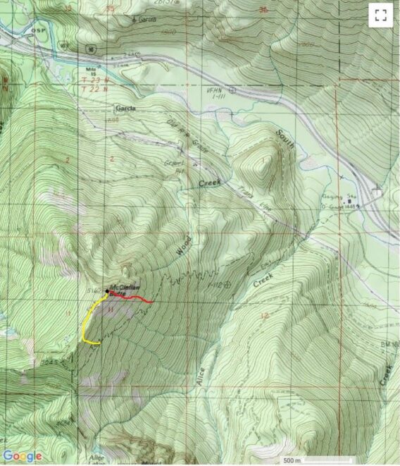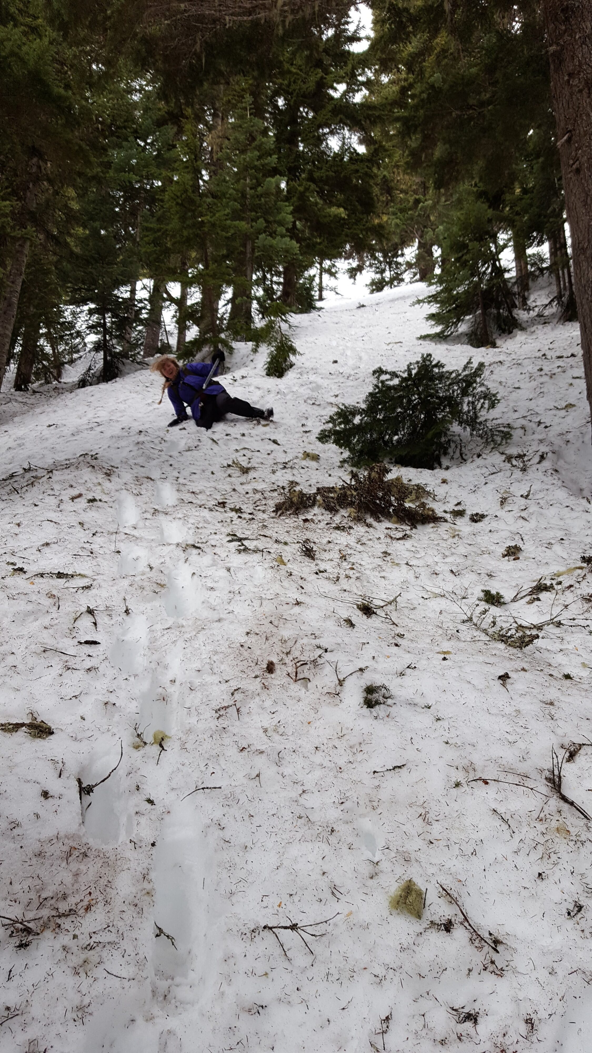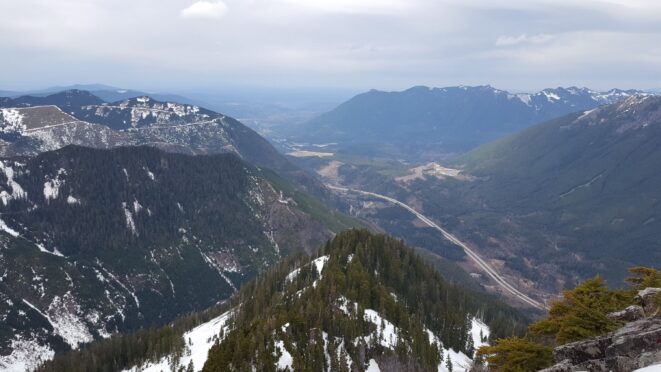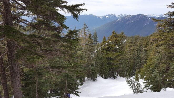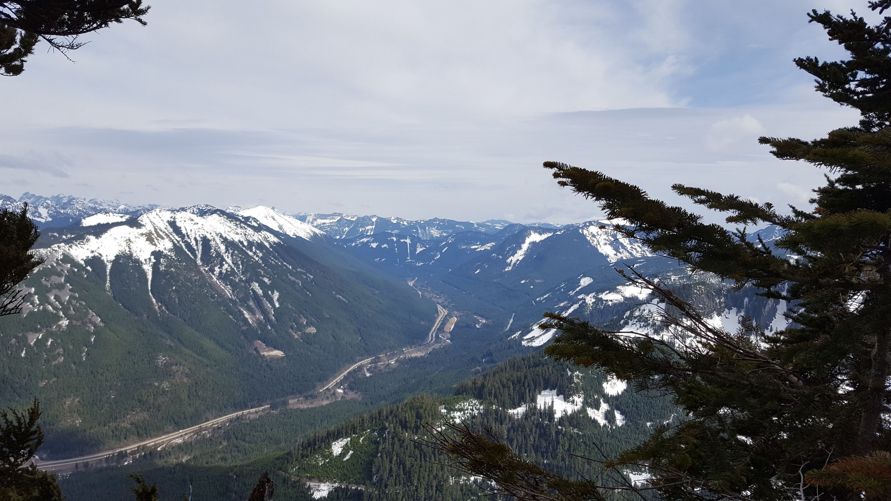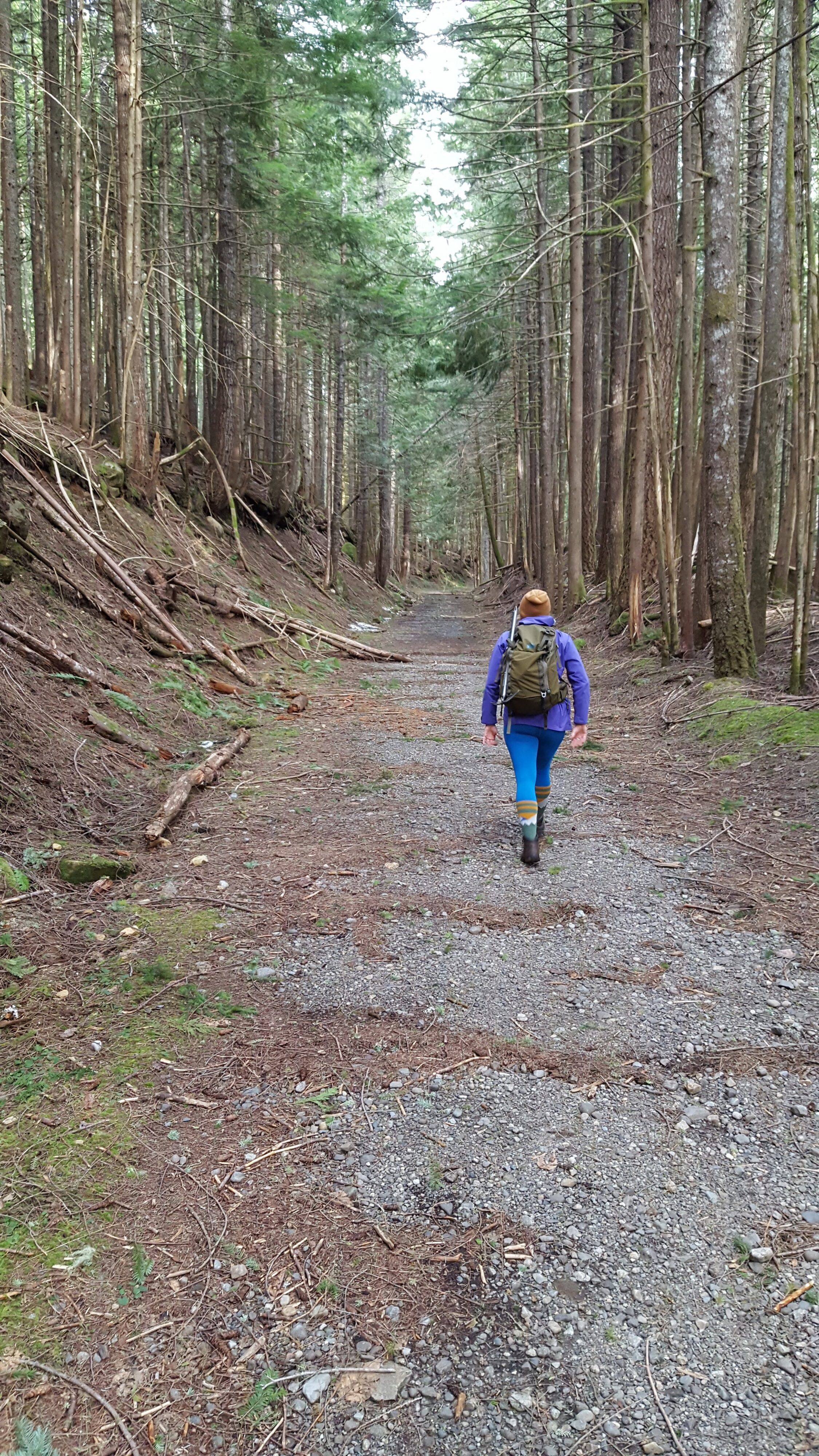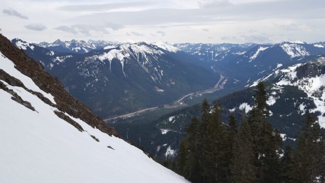 I hiked up McClellan Butte last Monday with my friend Ariana, and we hit the trail at about 9:30am after a quick stop at a lovely cafe in North Bend. The road to the trailhead was still closed but only added about a quarter mile each way. We started up the trail, which was mostly dry for the first couple of miles, as we passed by a few old logging roads. Luckily the signage was real clear so we never wondered which trail to take. When the trail began to switchback up about the 3200 foot level, the snow really became continuous however there were tracks from a few parties that had ascended the previous week of great weather. Just as the switchbacks ended and the trail began the long ascending traverse across the SE slopes of McClellan, we started heading straight up the first open gully we came across leading directly towards the summit.