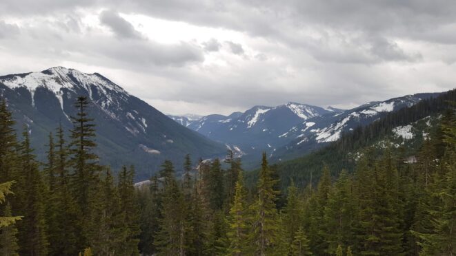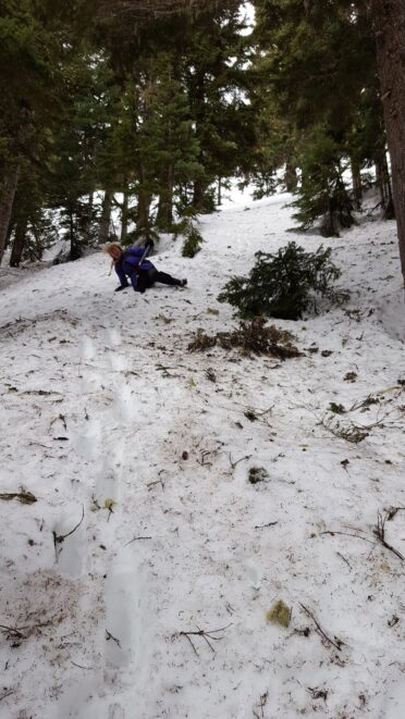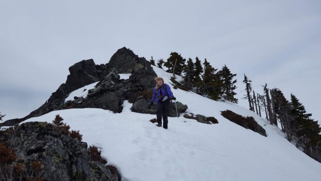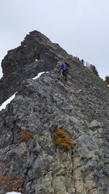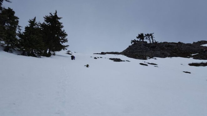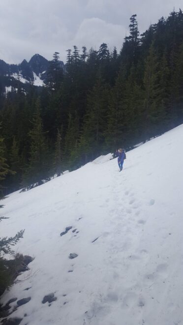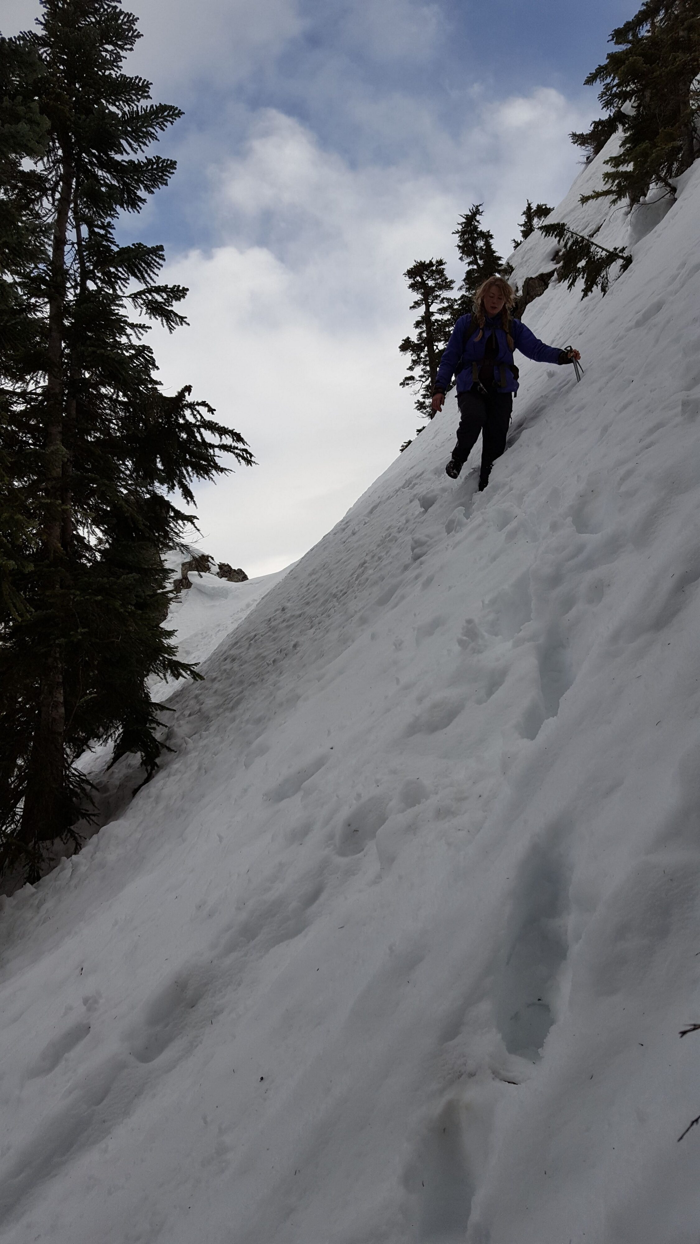 Despite the forecast calling for some rain during the afternoon, we made out way up the snow gully, and found a way up onto the rocks. We scrambled up class 3 wet rock with the occasional class 4 move or two until we entered another, narrower snow gully which narrowed to just a few feet wide at a choke point where we had to squeeze through a few scraggly trees. Ariana did incredible for never having scrambled on rock before.
