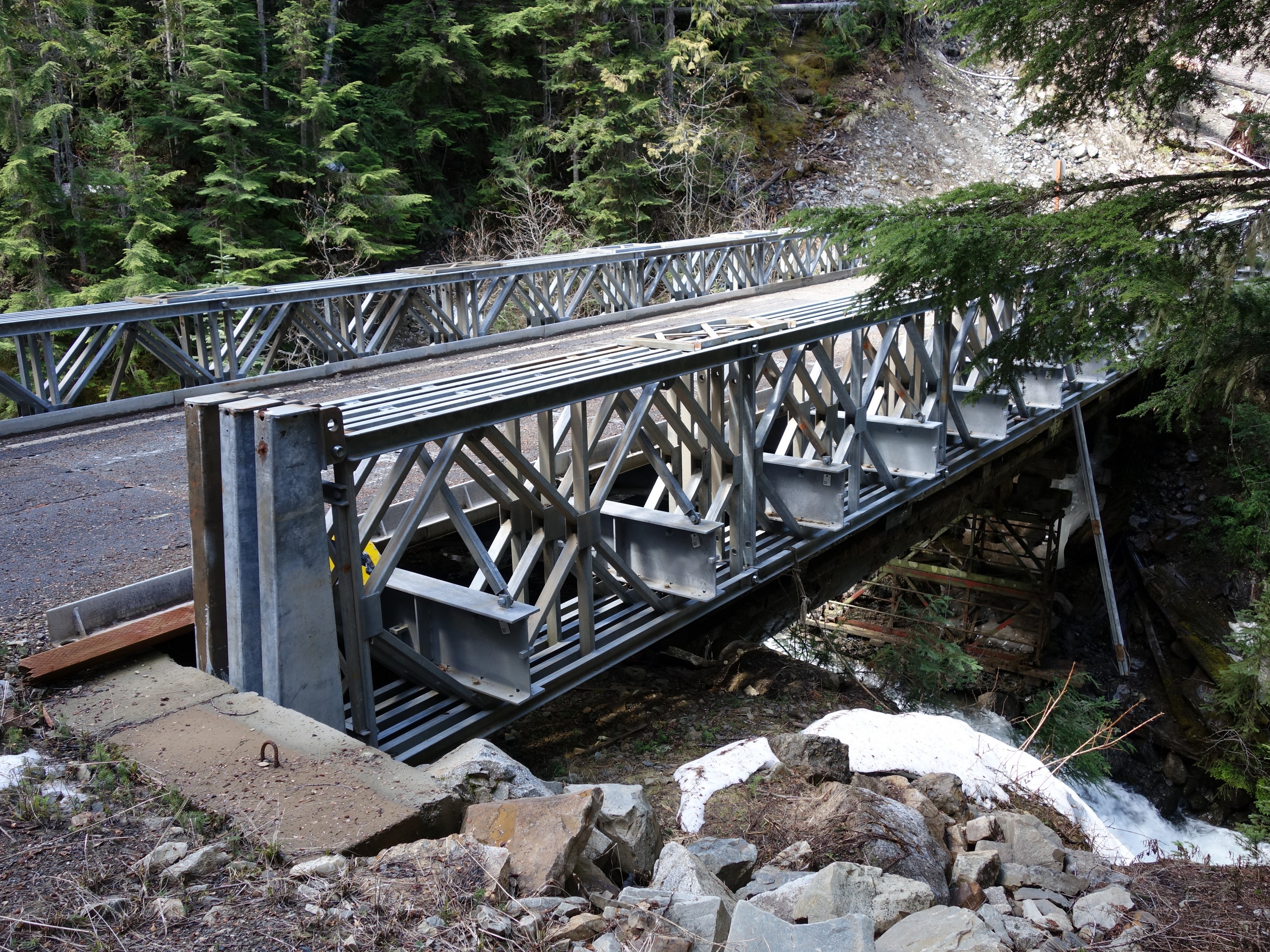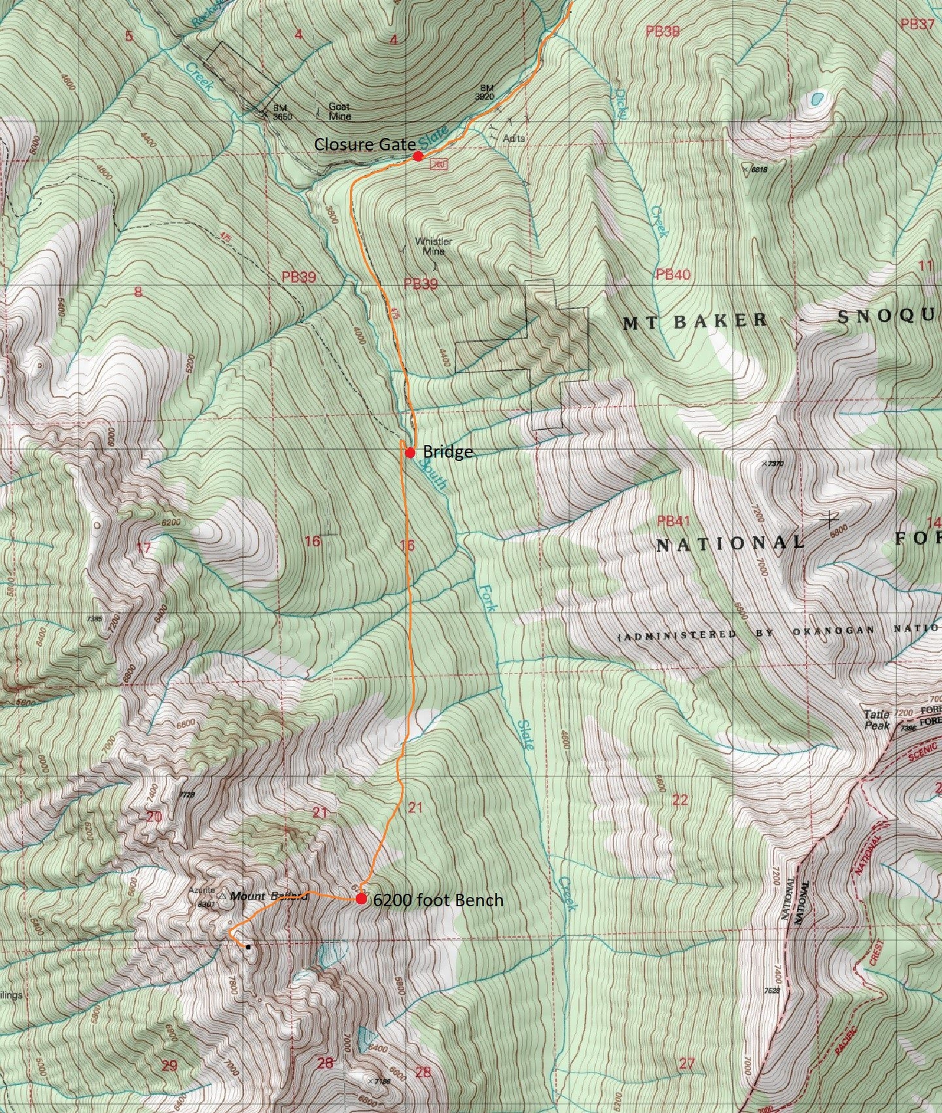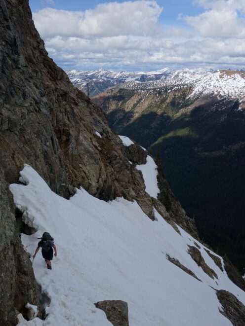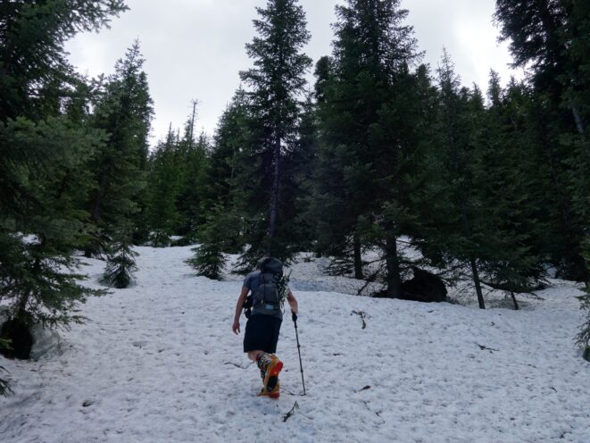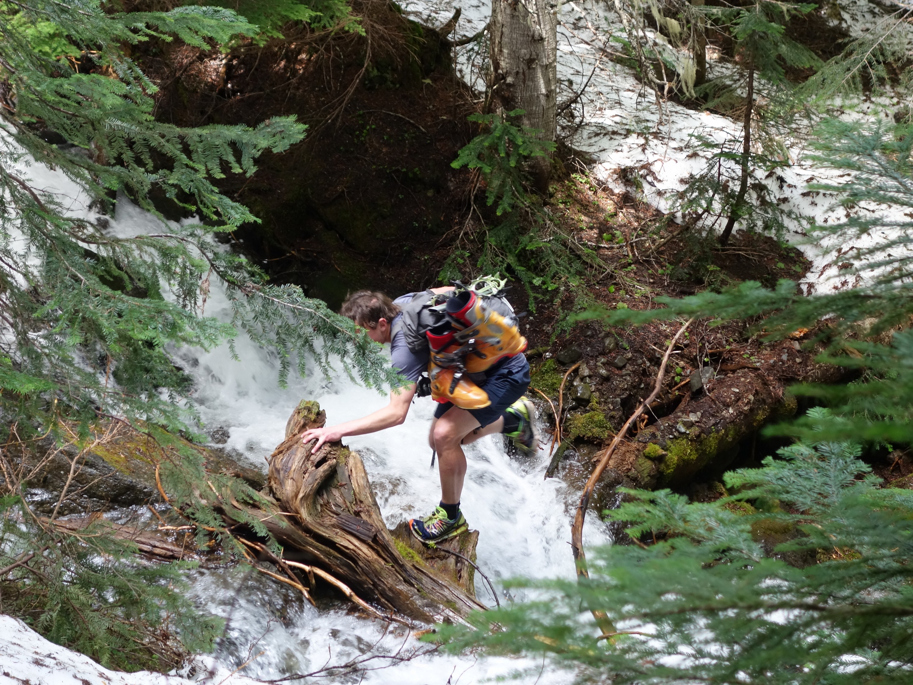 We continued the additional mile (about 9.5 miles total from the car) beyond the gate, curving left towards the south as the old road continued a gentle traverse to the bridge over South Fork Slate Creek at 4000 feet. This bridge at some point had been rebuilt directly over top of the old bridge. We stashed our overnight gear here as it was only noon by this point and we knew we would have plenty of daylight to make it up and down before dark.