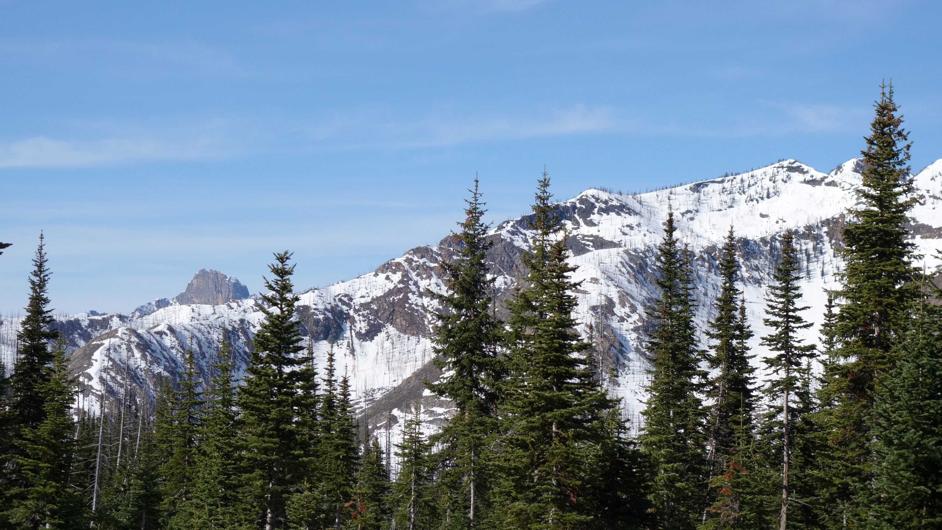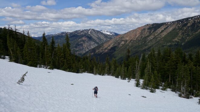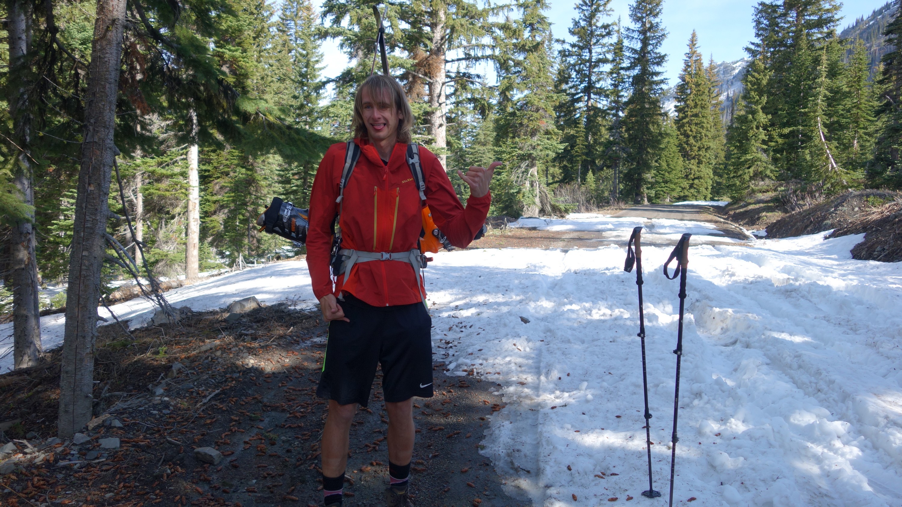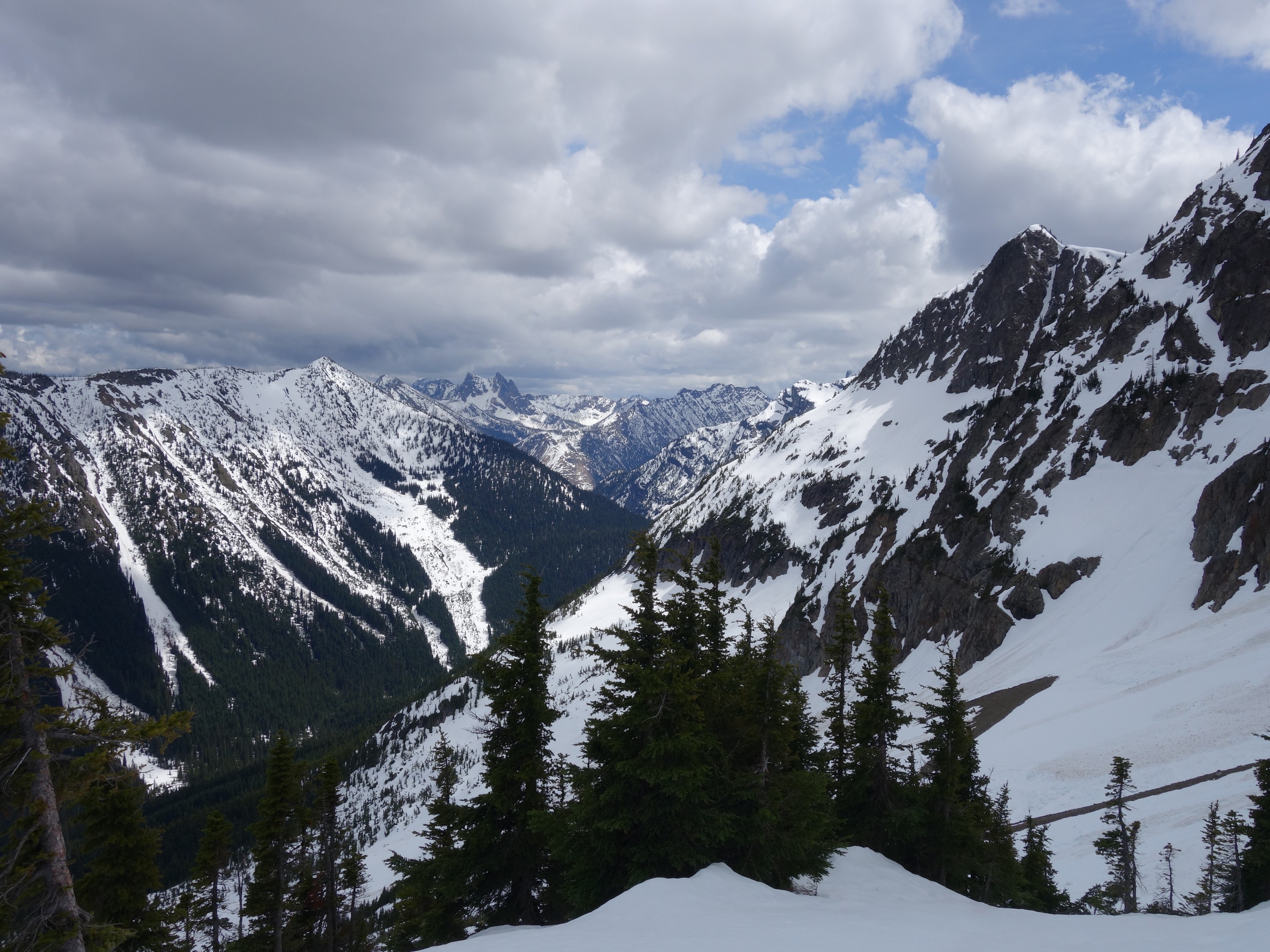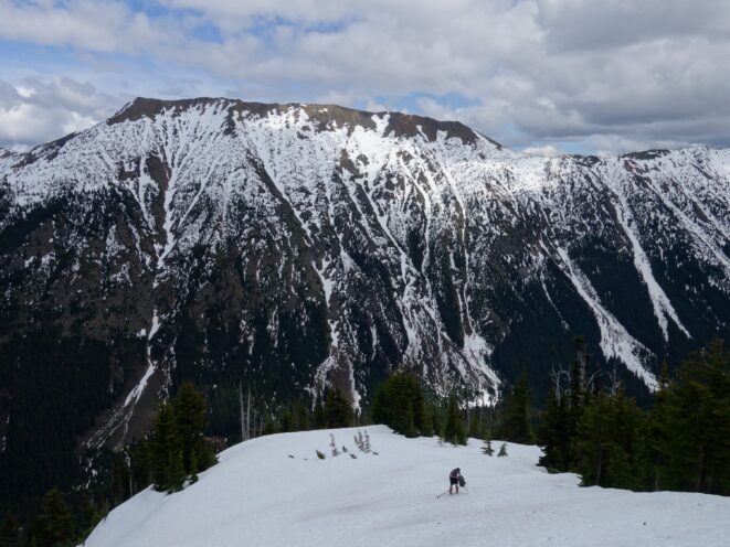 We drove over to Mazama, and found a spot to take a 1 hour nap in the car. By 7am we started driving up the Harts Pass Road. We were able to drive up to an elevation of 5250 feet, stopping about 3 miles from Harts Pass due to a deeper snow patch covering the road in a low rider vehicle. High clearance 4WD vehicles were getting up another mile or so, to within 2 miles of the pass. We saddled up with skis and started walking shortly before 8am, hoping to be able to ski down the road on the opposite side of the pass a bunch. We made quick work walking the first 3 miles to Harts Pass, which we were able to find mostly bare ground along the edge of the road. Once at the pass at 6200 feet, there was 2 feet of snow on the ground, contrary to ranger reports stating there would be 4-5 feet. We switched into our ski boots and put the skis on, and after a quick snack we started skiing down the road heading down into the Slate Creek Valley on the west side of the pass.