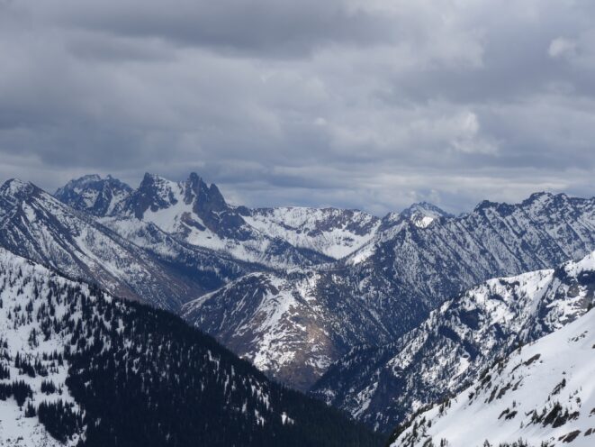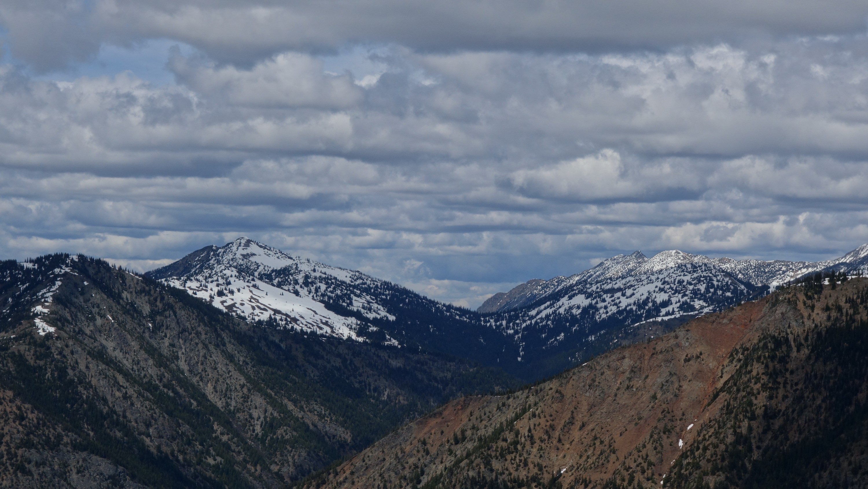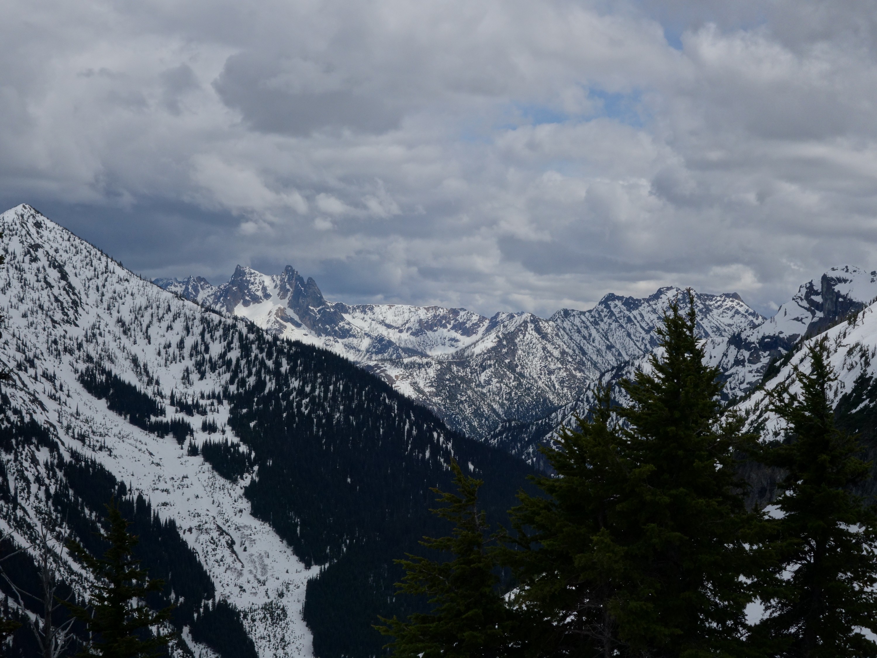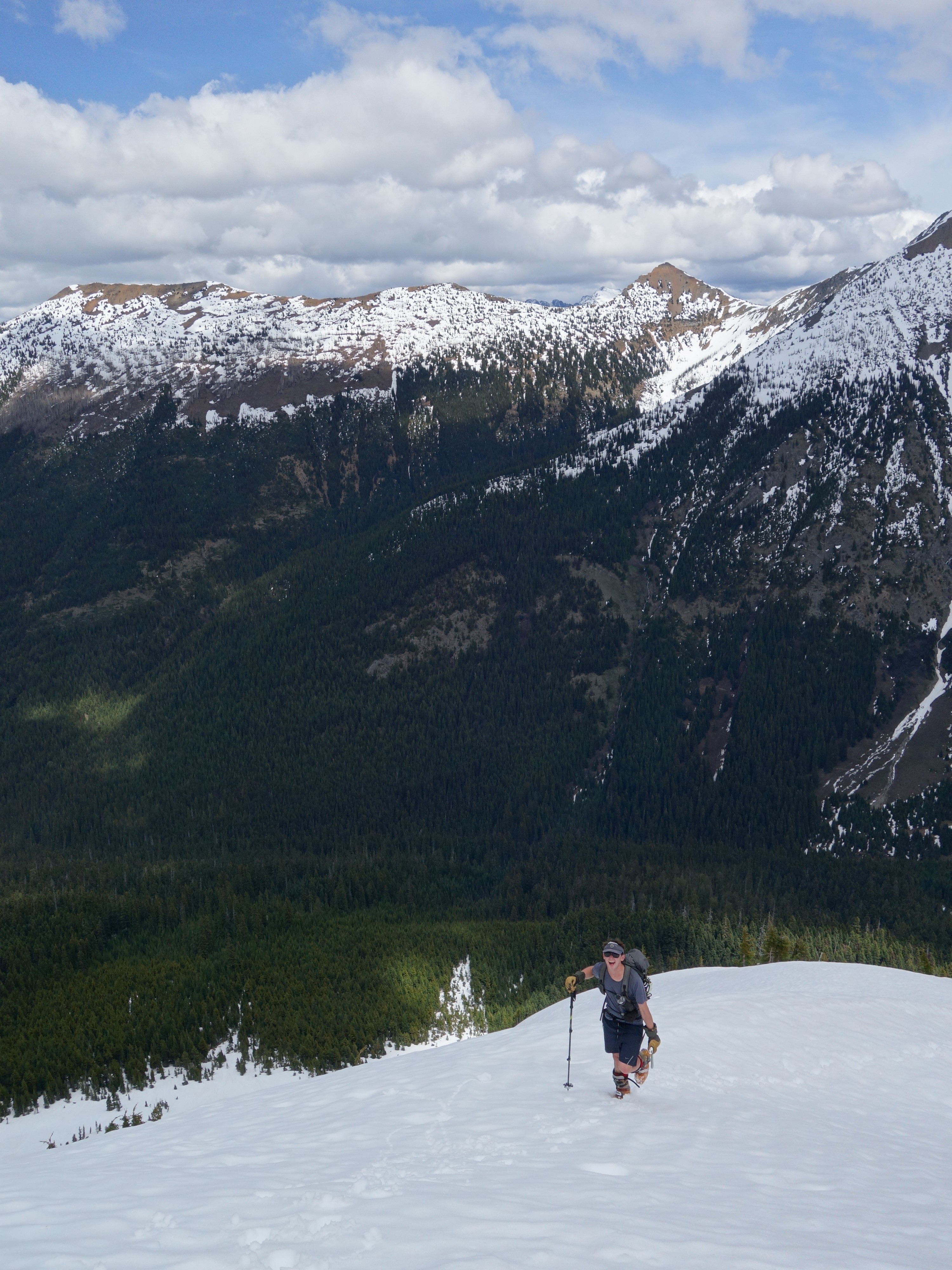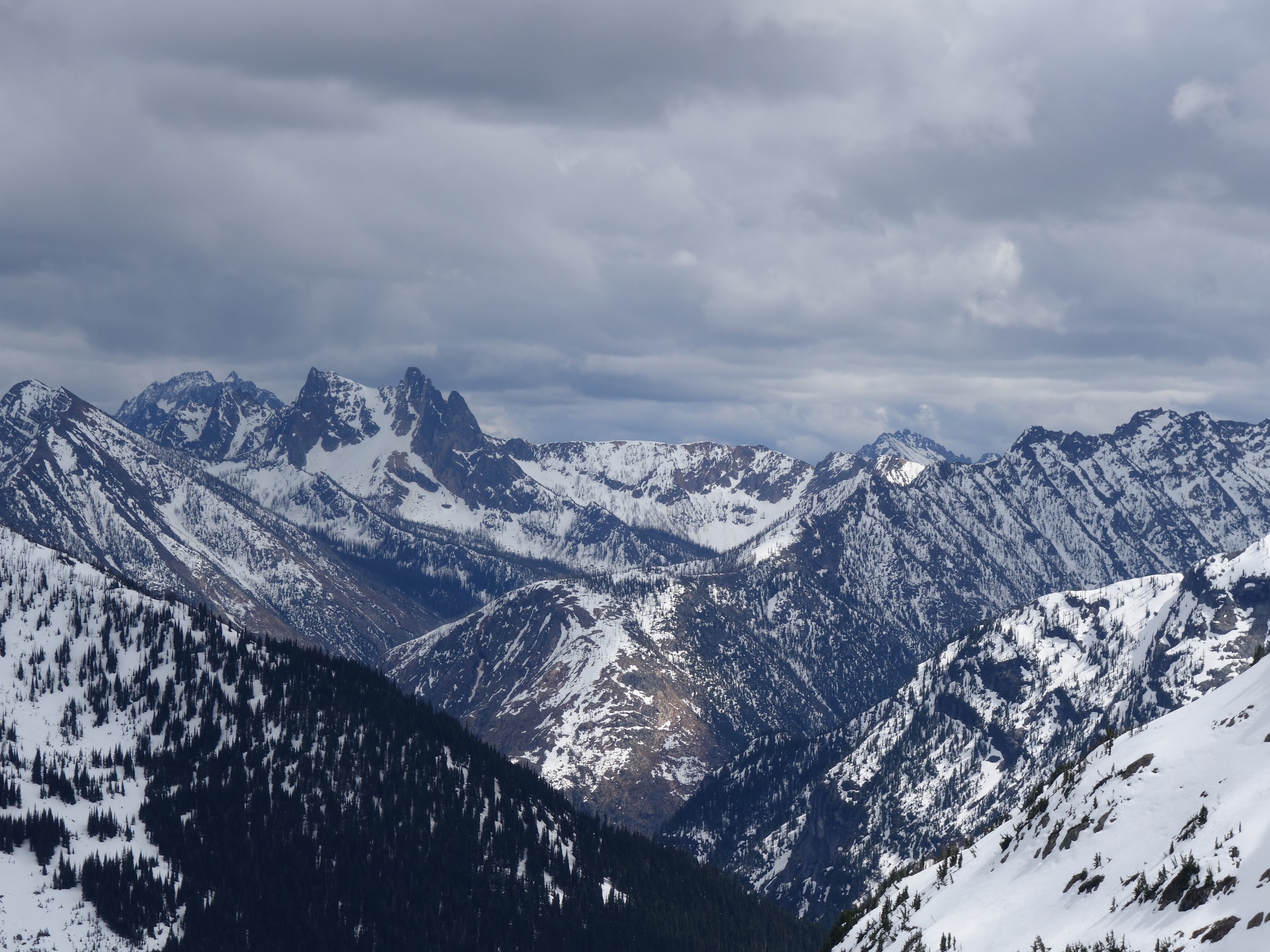 We drove over to Mazama, and found a spot to take a 1 hour nap in the car. By 7am we started driving up the Harts Pass Road. We were able to drive up to an elevation of 5250 feet, stopping about 3 miles from Harts Pass due to a deeper snow patch covering the road in a low rider vehicle. High clearance 4WD vehicles were getting up another mile or so, to within 2 miles of the pass. We saddled up with skis and started walking shortly before 8am, hoping to be able to ski down the road on the opposite side of the pass a bunch. We made quick work walking the first 3 miles to Harts Pass, which we were able to find mostly bare ground along the edge of the road. Once at the pass at 6200 feet, there was 2 feet of snow on the ground, contrary to ranger reports stating there would be 4-5 feet. We switched into our ski boots and put the skis on, and after a quick snack we started skiing down the road heading down into the Slate Creek Valley on the west side of the pass.