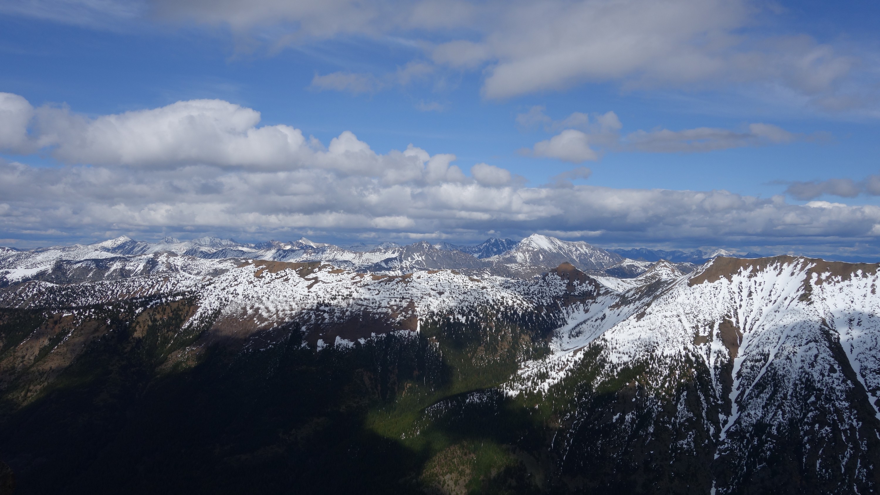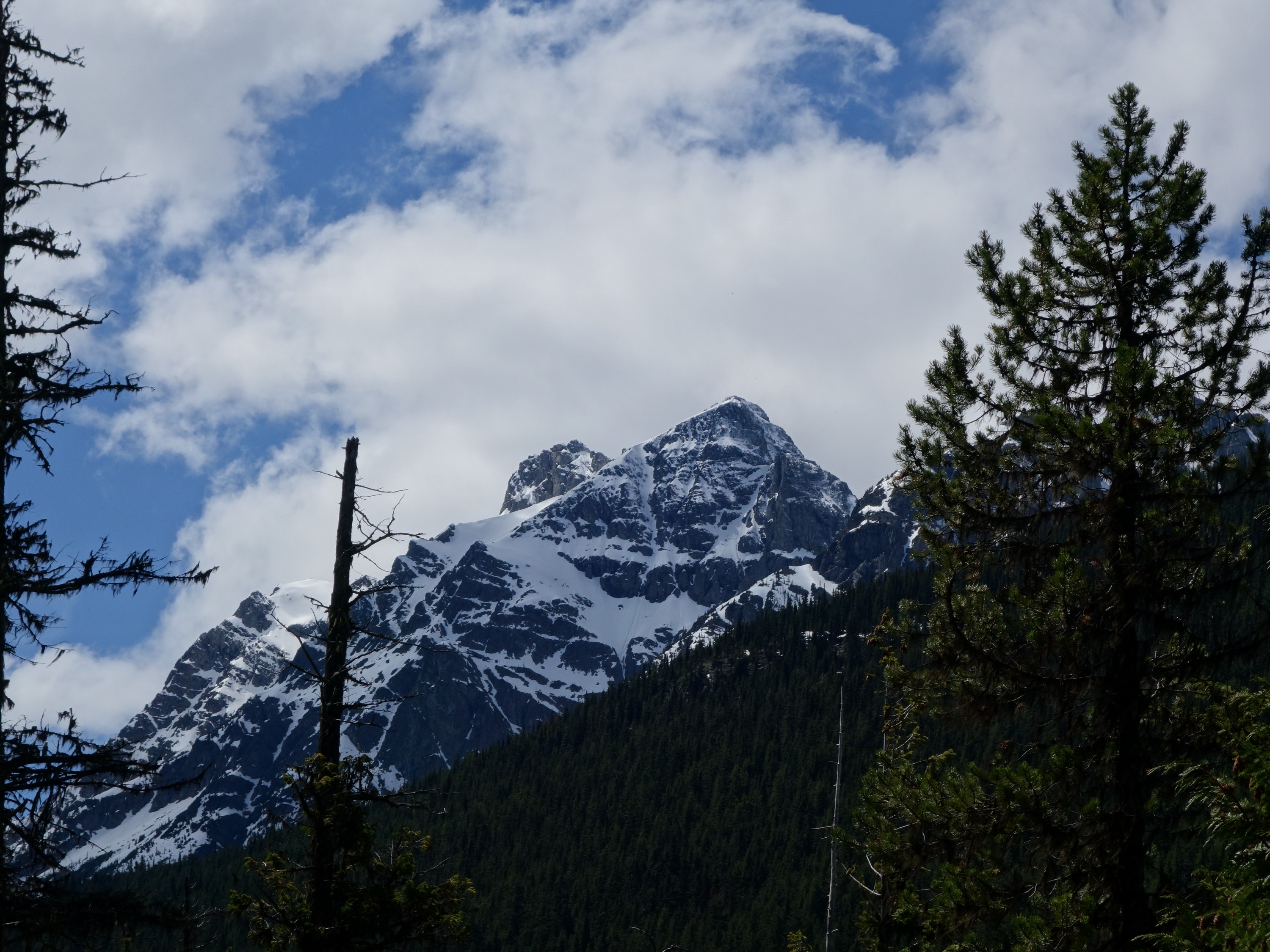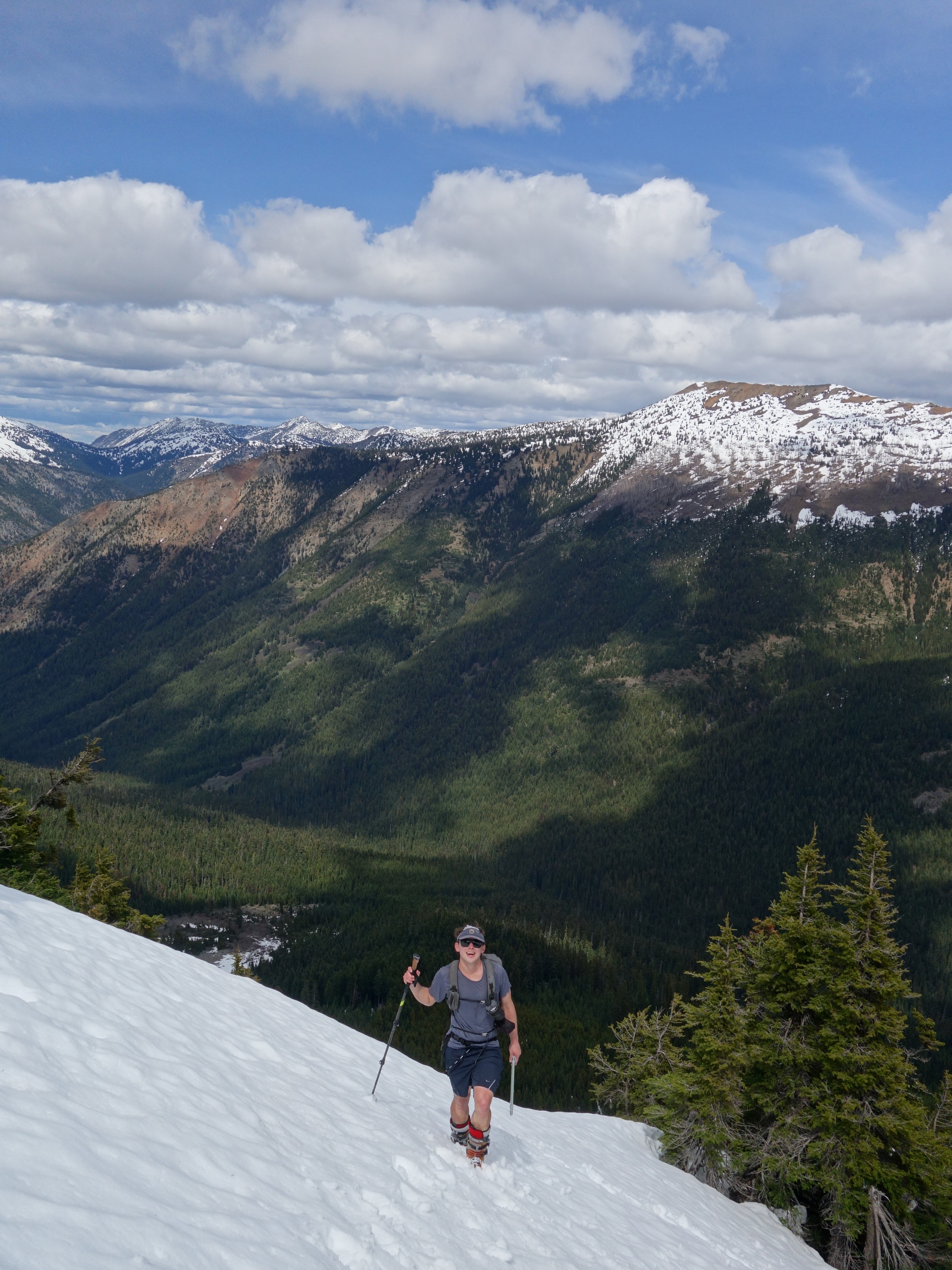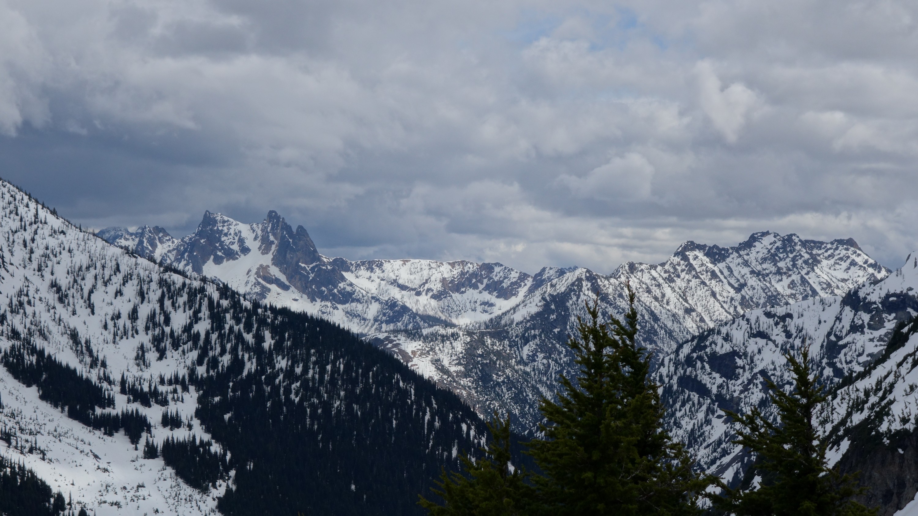 We drove over to Mazama, and found a spot to take a 1 hour nap in the car. By 7am we started driving up the Harts Pass Road. We were able to drive up to an elevation of 5250 feet, stopping about 3 miles from Harts Pass due to a deeper snow patch covering the road in a low rider vehicle. High clearance 4WD vehicles were getting up another mile or so, to within 2 miles of the pass. We saddled up with skis and started walking shortly before 8am, hoping to be able to ski down the road on the opposite side of the pass a bunch. We made quick work walking the first 3 miles to Harts Pass, which we were able to find mostly bare ground along the edge of the road. Once at the pass at 6200 feet, there was 2 feet of snow on the ground, contrary to ranger reports stating there would be 4-5 feet. We switched into our ski boots and put the skis on, and after a quick snack we started skiing down the road heading down into the Slate Creek Valley on the west side of the pass.