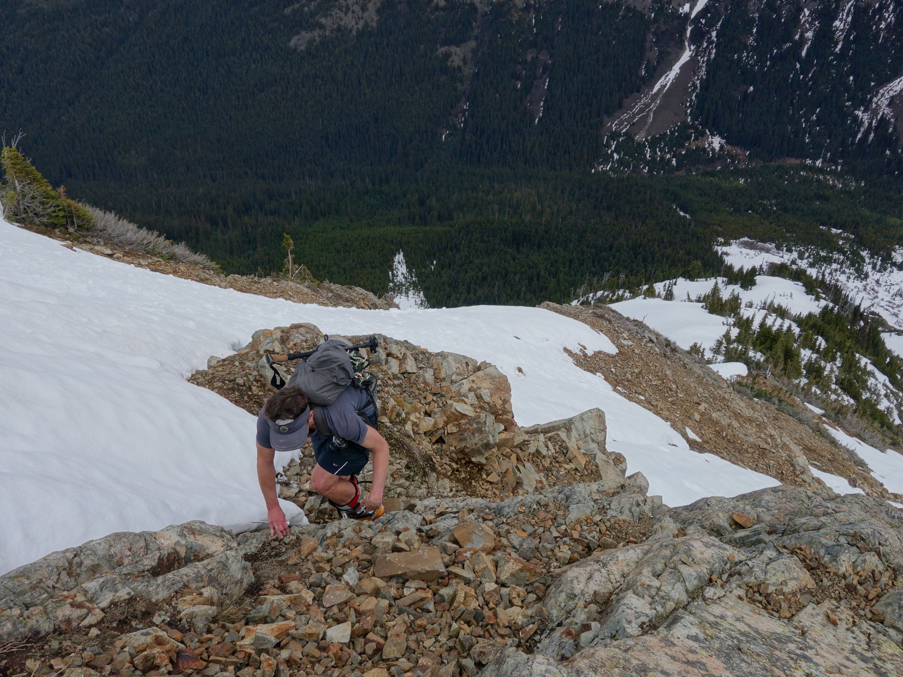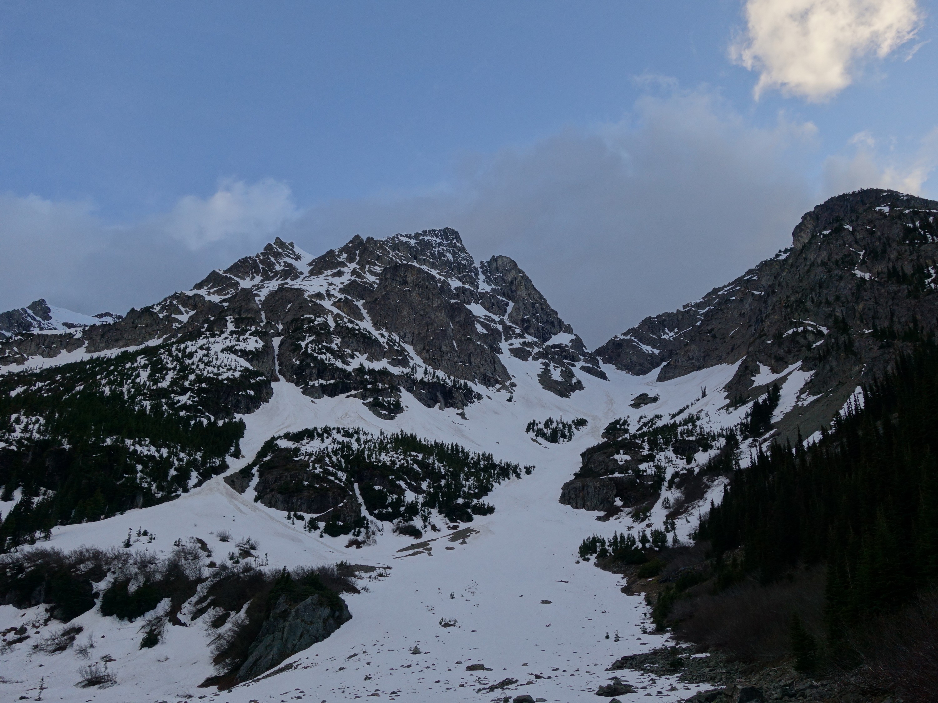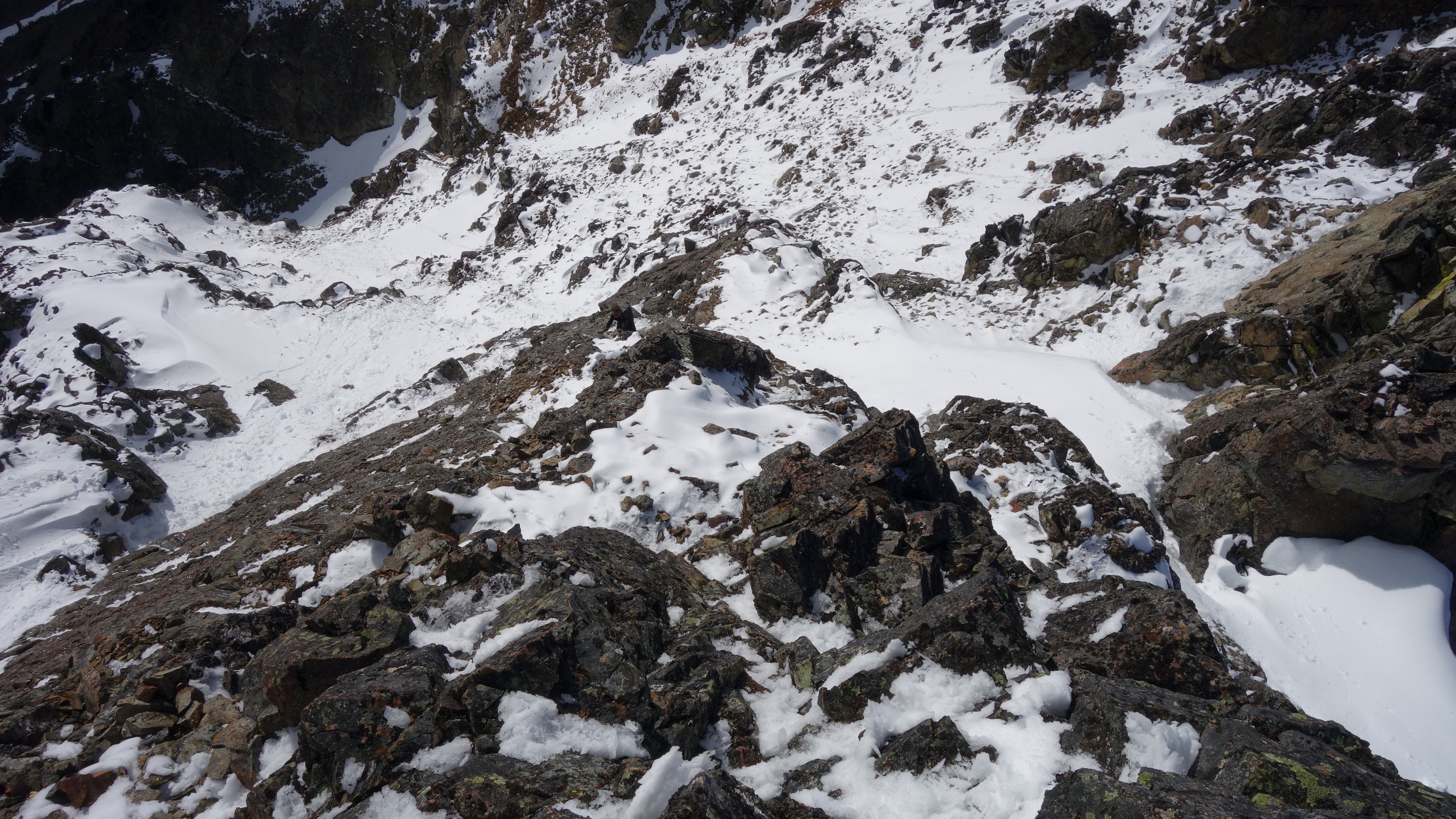 By 6pm, Josh and I started to make the descent back down, which we made very quick work descending the snow. We decided to plunge step down the snow more, and avoid the class 3-4 rock steps we scrambled on the way up. Still, rather than descend down a section of 50 degree wet snow I opted for a different rock rib. We met up with our ascent tracks and continued down. The snow improved and I was able to do my trademark flying leaps (running down with plunge stepping the steep snow slopes with ~10-12 feet between steps) just as fast as Josh was able to glissade! Literally, it took us about 10 minutes to descend back to the 4900 foot basin from the 6200 foot bench on the east ridge, a drop of about 1300 feet. I don't think I could have even skid it that fast!