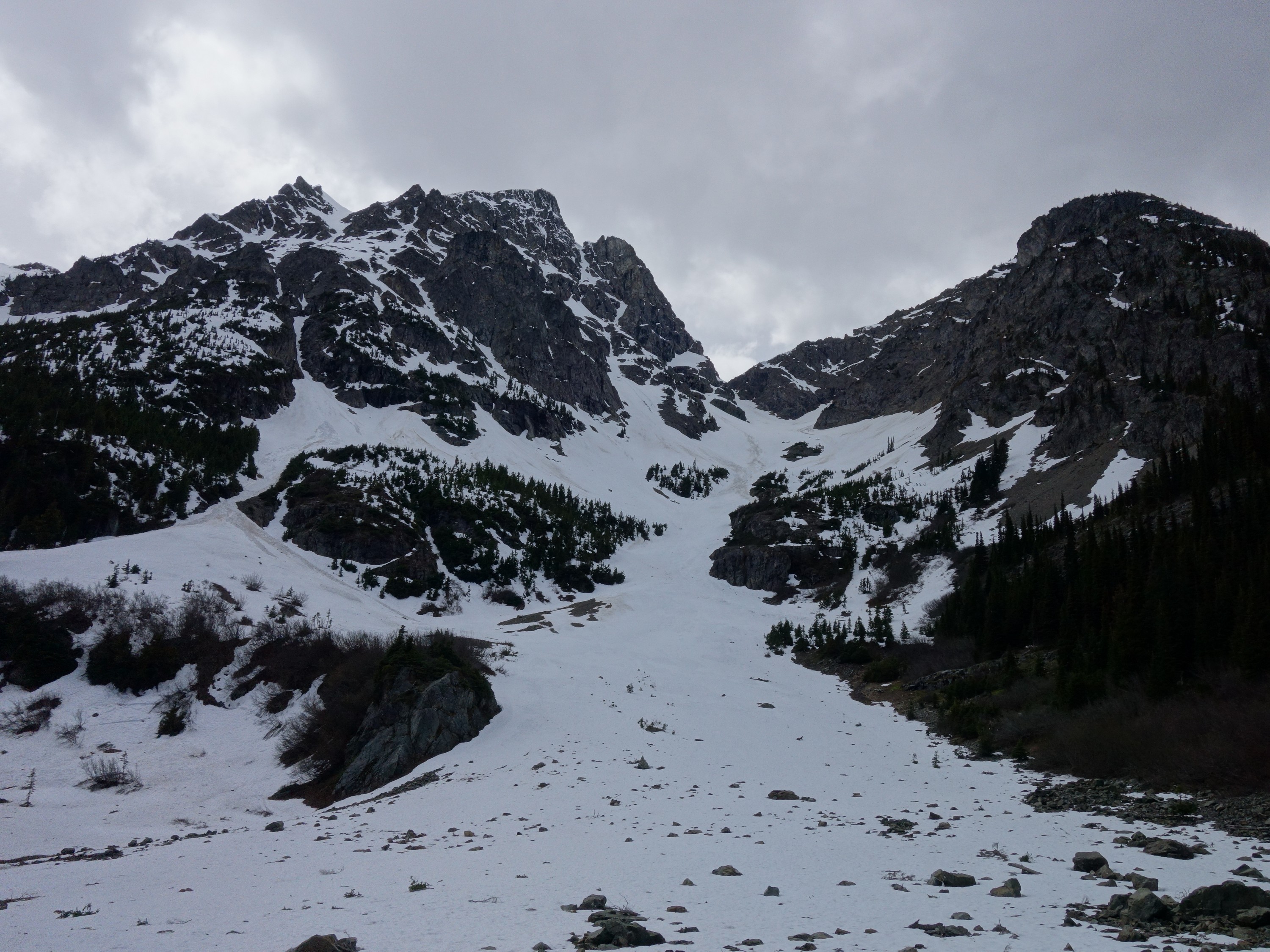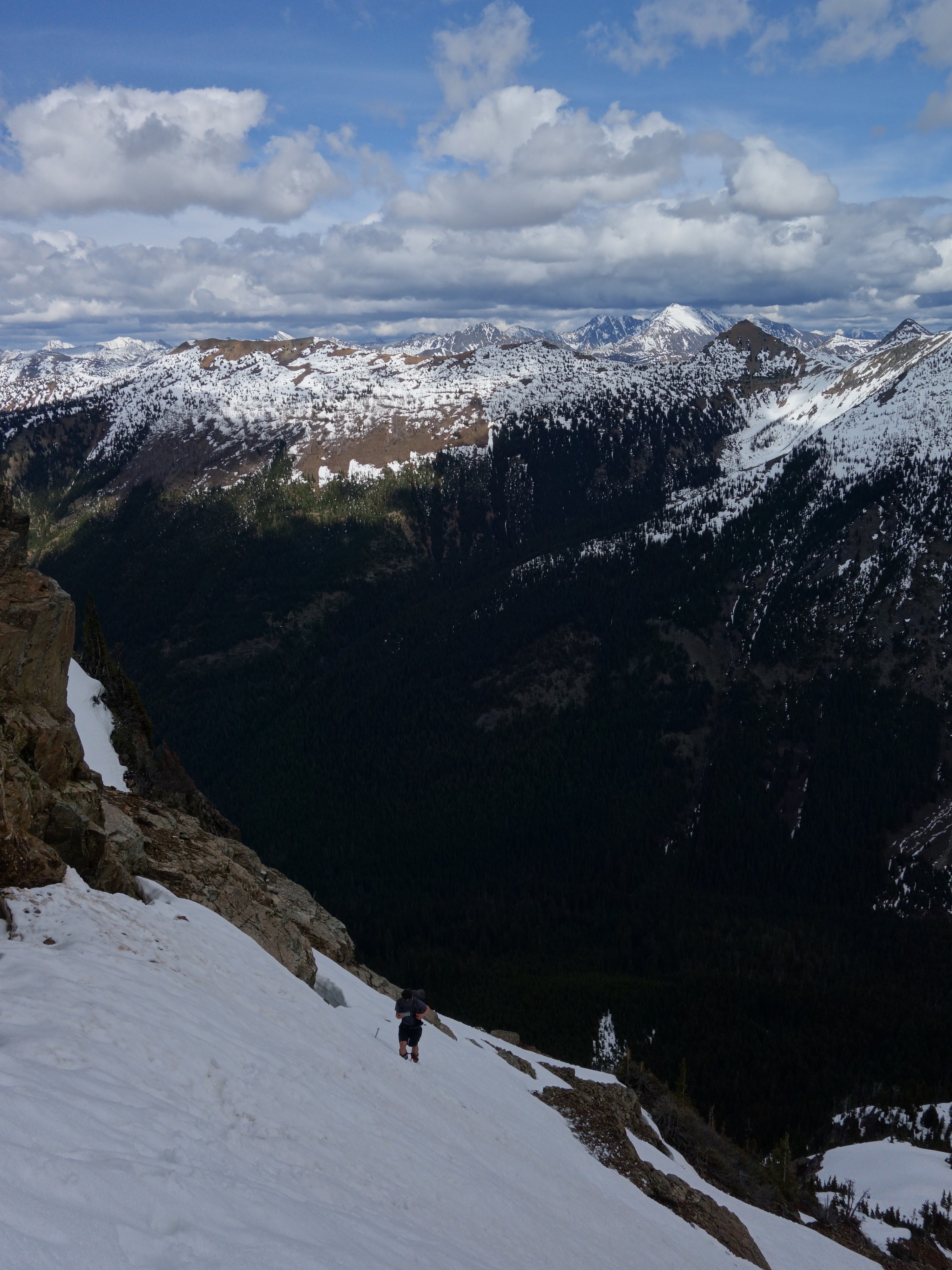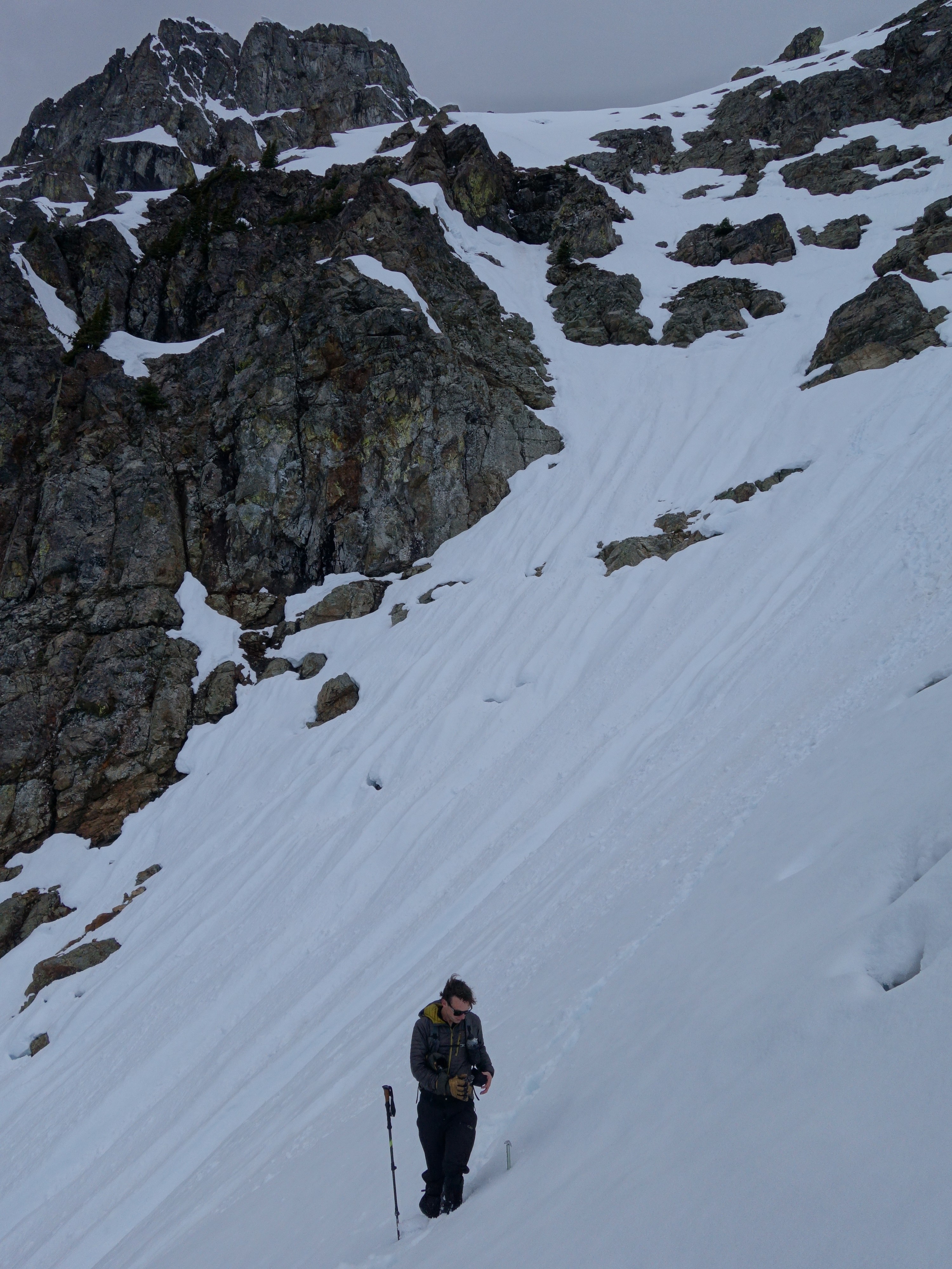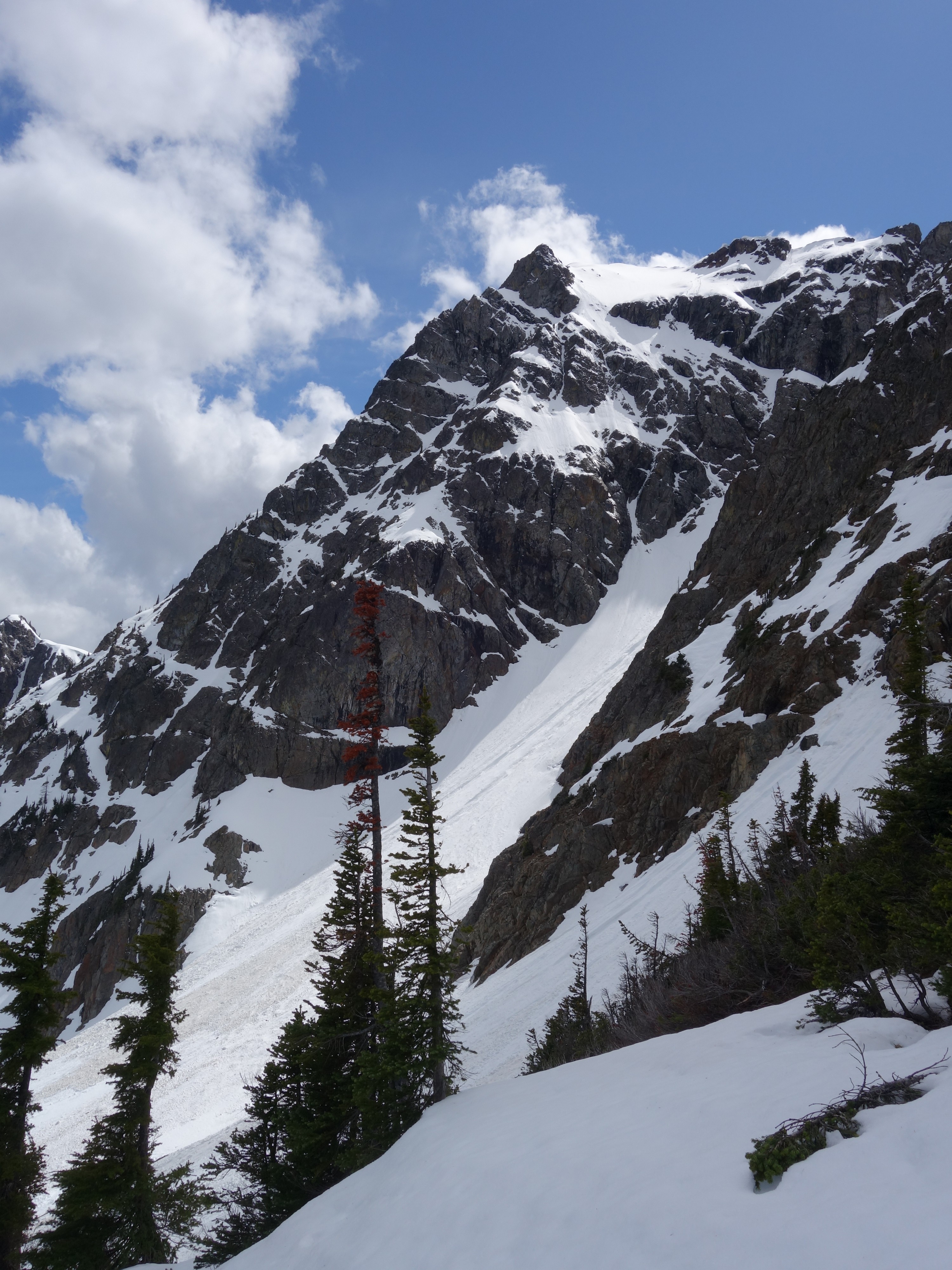 By 6pm, Josh and I started to make the descent back down, which we made very quick work descending the snow. We decided to plunge step down the snow more, and avoid the class 3-4 rock steps we scrambled on the way up. Still, rather than descend down a section of 50 degree wet snow I opted for a different rock rib. We met up with our ascent tracks and continued down. The snow improved and I was able to do my trademark flying leaps (running down with plunge stepping the steep snow slopes with ~10-12 feet between steps) just as fast as Josh was able to glissade! Literally, it took us about 10 minutes to descend back to the 4900 foot basin from the 6200 foot bench on the east ridge, a drop of about 1300 feet. I don't think I could have even skid it that fast!