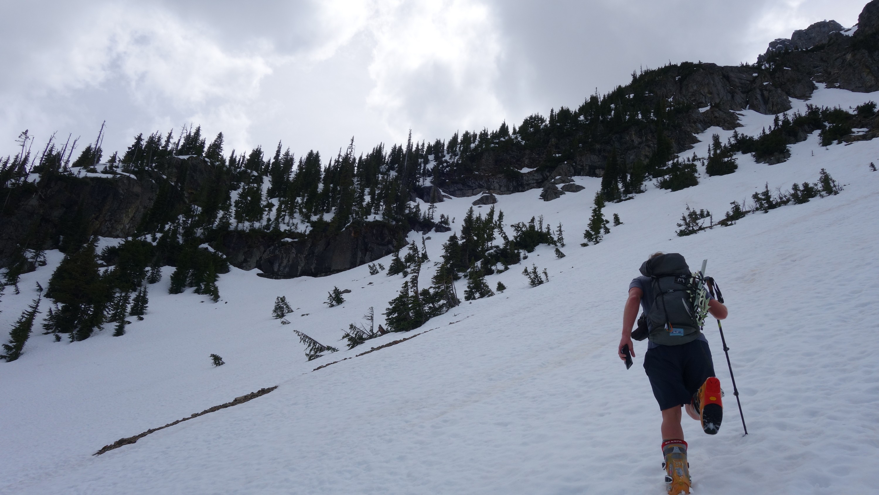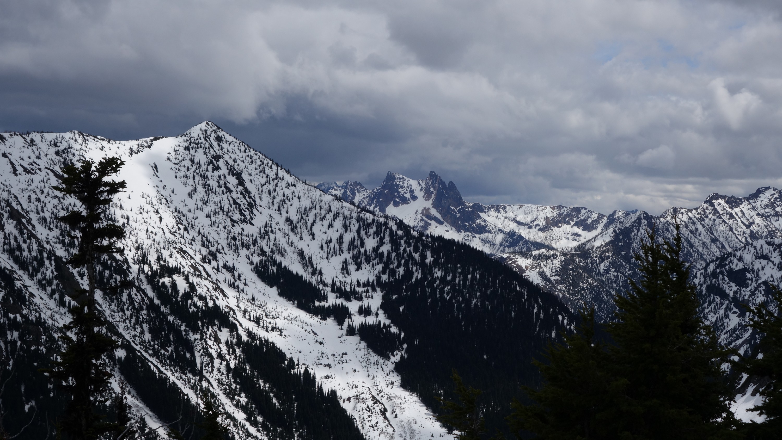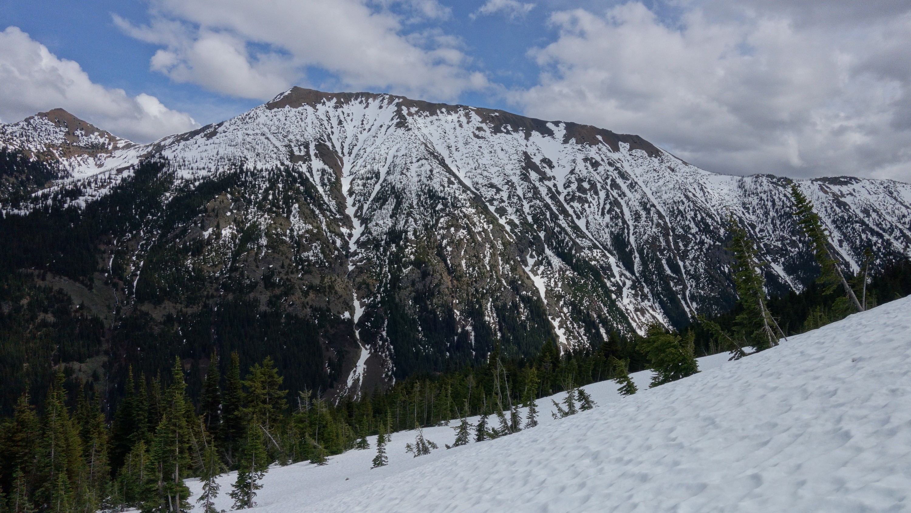 We crossed the bridge and left the old road, entering the open forest making an ascending traverse southward towards the large flat basin at 4900 feet at the base of the large gully dropping down from the col just north of the lower north peak of Ballard (which is the peak that's incorrectly labelled as Mount Ballard on the USGS maps). There were two streams in close proximity to one another we had to cross over slippery logs along this traverse through the forest at about the 4600 foot contour. At 4900 feet we emerged from the trees into the basin and scouted out the route ahead. Using Matt and Dicey's report we easily located the route up towards the small flat spot at 6200 feet on the east ridge of Ballard. We booted up really good snow through trees for 400 feet until reaching the open slopes on the east slopes of the mountain, and made an ascending traverse towards the 6200 foot bench. We were making great time, having reached this spot on the ridge at about 2pm. Views were getting better and better as we ascended up the ridge continuing on good snow until the terrain steepened at around 6900 feet.