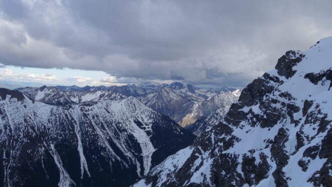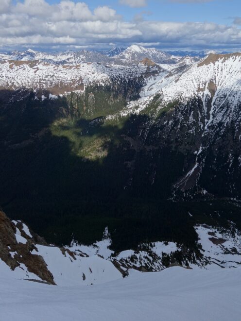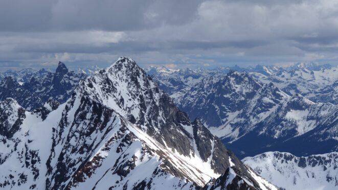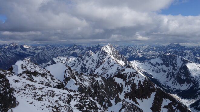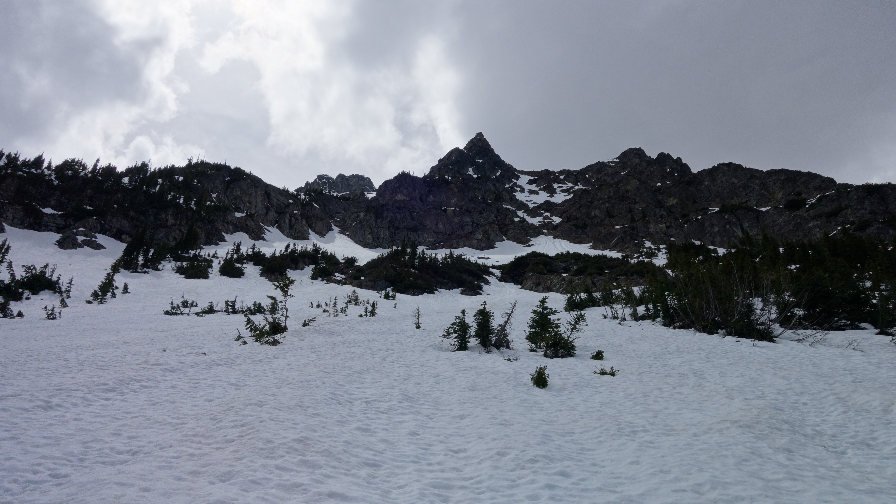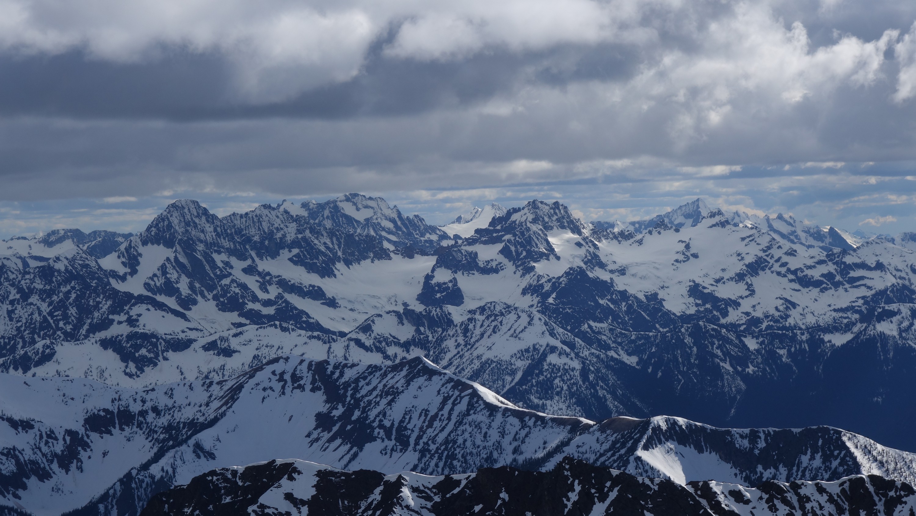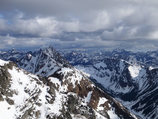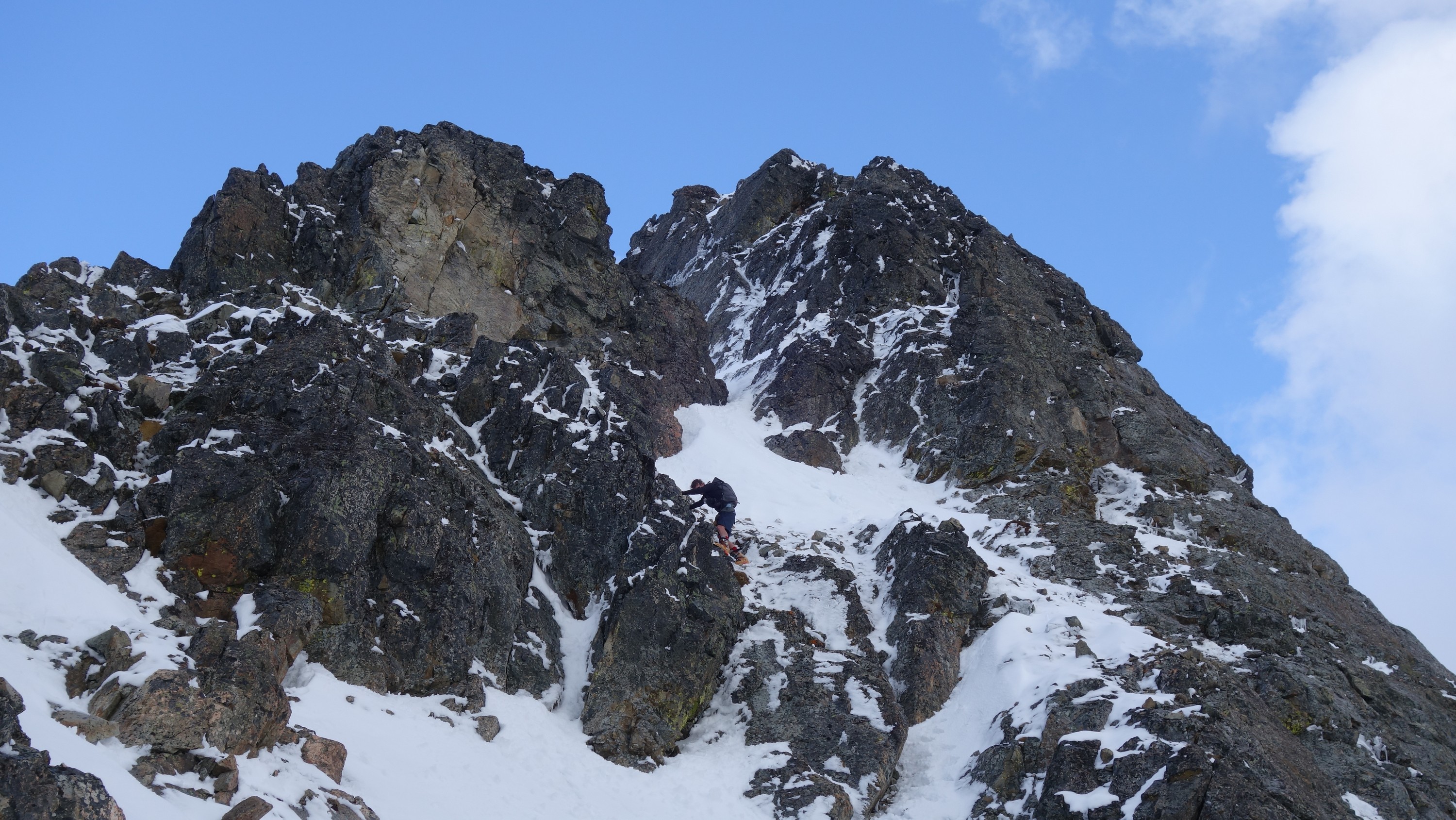Since the snow appeared very steep in the 7000s elevation range, we opted to climb class 3 and 4 dry rock on the ribs and blocks between the snowfields. This was possible up to an extent, however at around 7300 feet, we were forced onto a large 45 degree snowfield to weave through cliff bands and much steeper sections, zig zagging our way up, mostly angling leftward until we reached the upper part of the east ridge at about 7650 feet where the angle eased significantly down to the 20-25 degree range. However this lower angle section of the route for the next 400 feet to the 8150 foot col would prove to be the most taxing, as I was sinking to my knees or more post holing through deep snow. Since I was out ahead feeling fairly strong, I ended up breaking most of the trail on the upper route. We finally reached the col immediately below a small rock spire just north of the true summit of Ballard. Here we rested briefly, and was mesmerized by the view we had to the west. All of the North Cascades were visible, with peaks like Goode, Mesahchie, and Eldorado easily picked out. Even Baker and Shuksan were visible through the perfectly timed passing clouds.