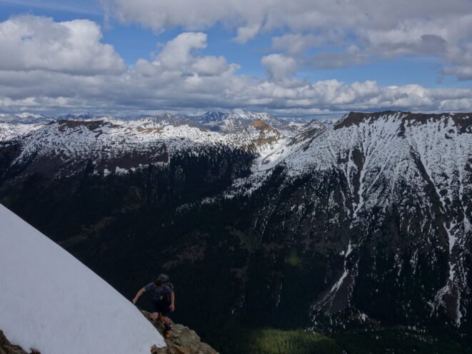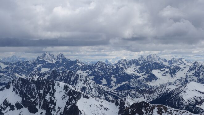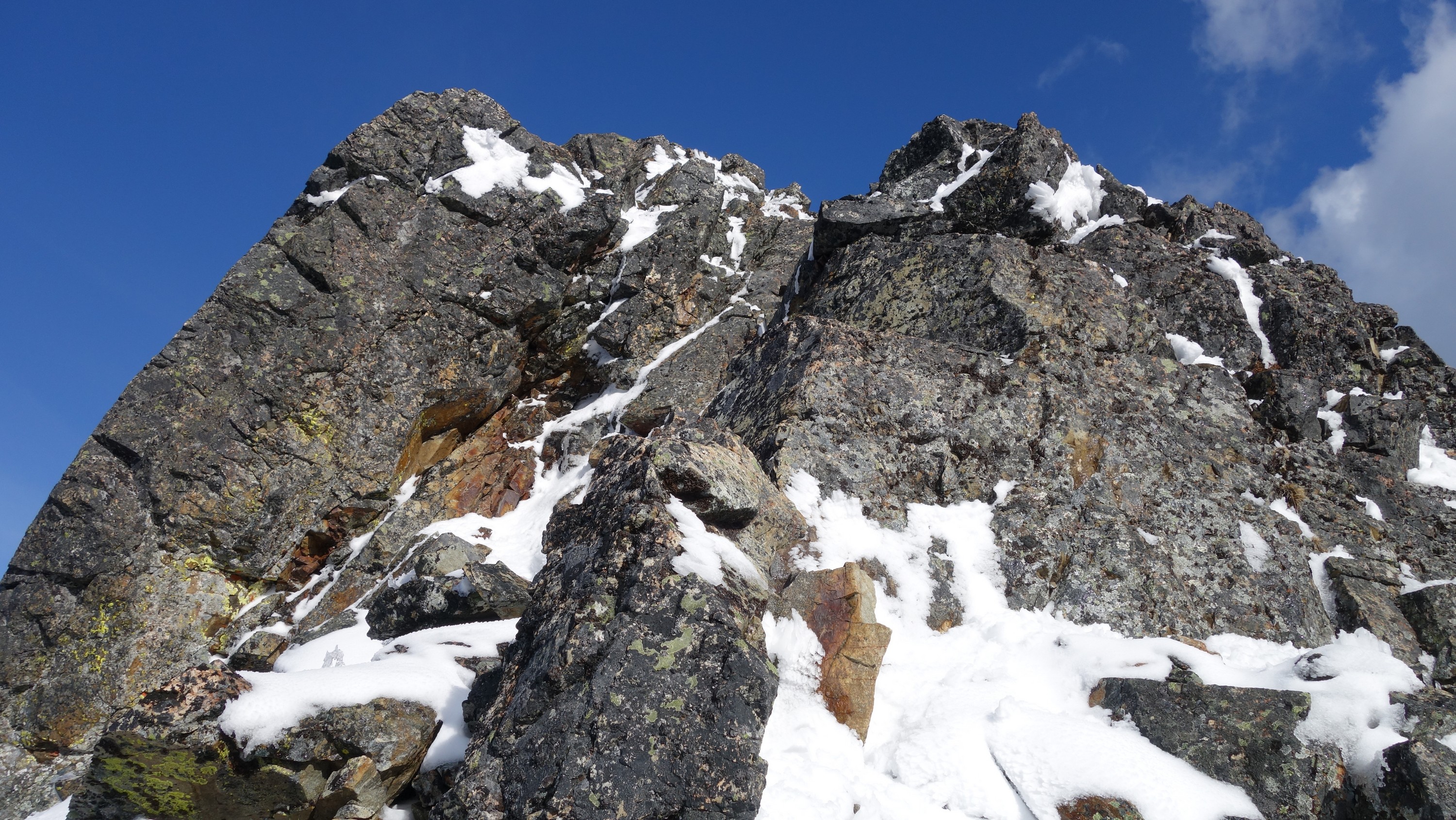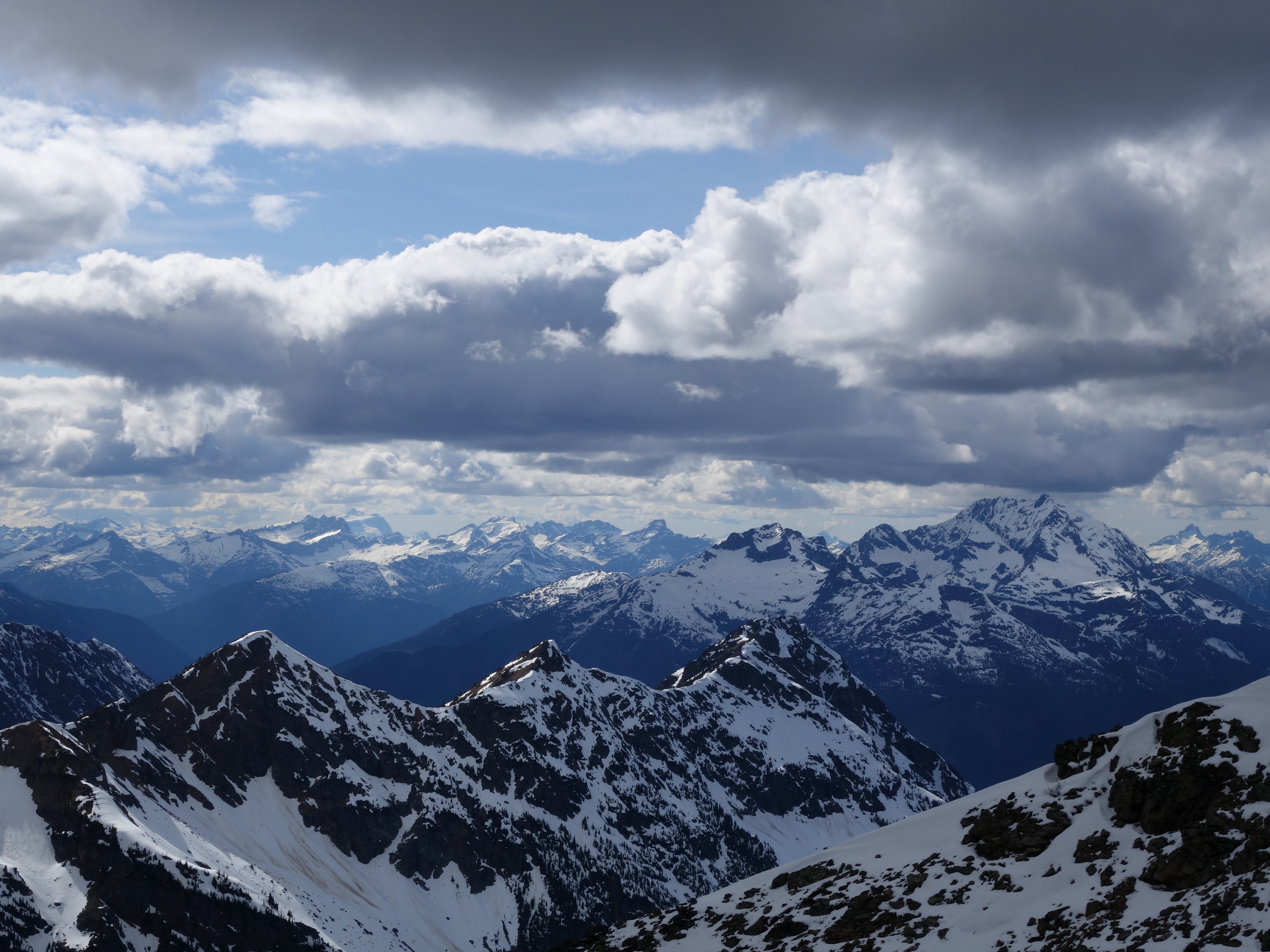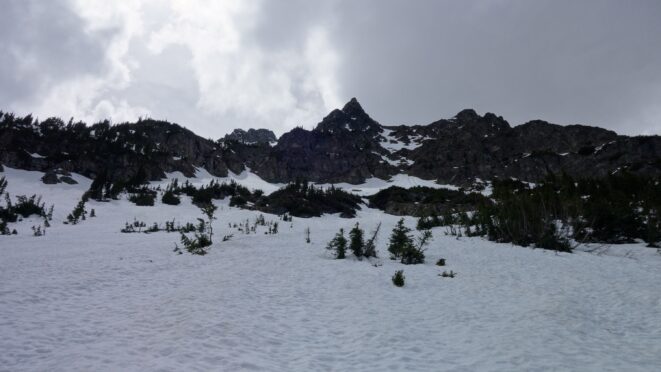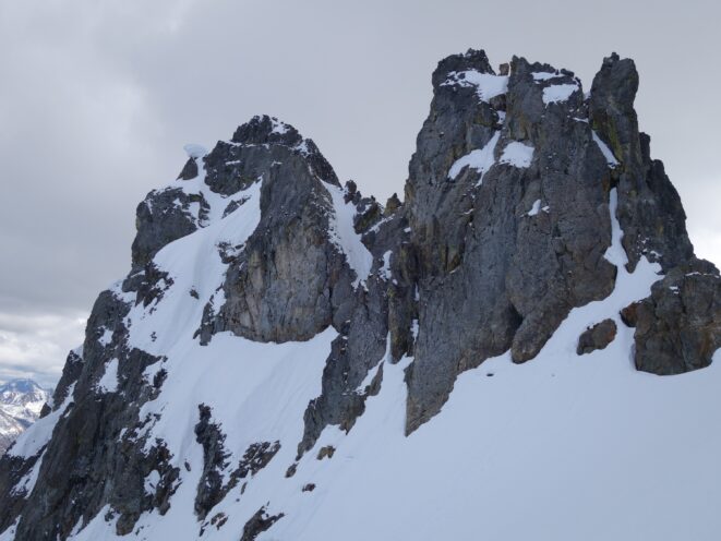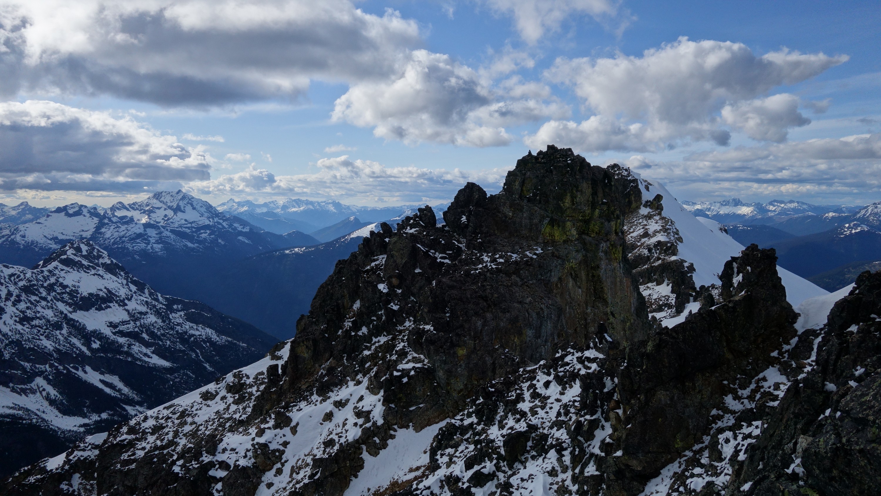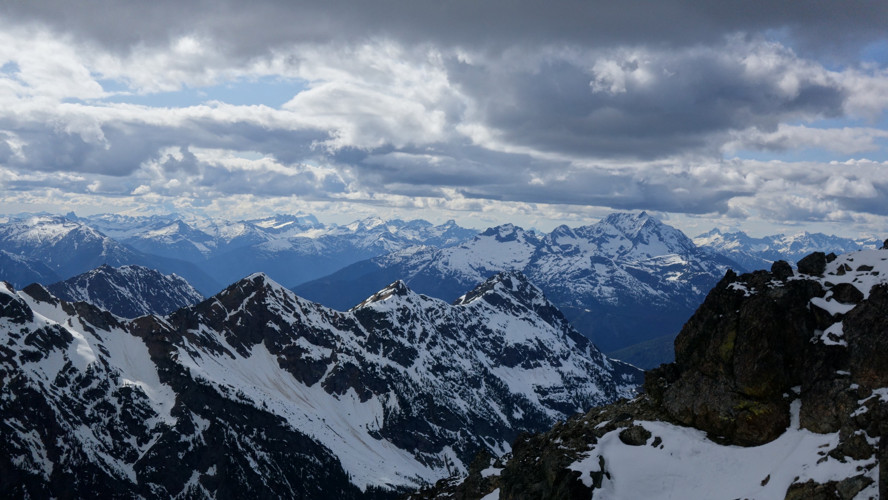 Since the snow appeared very steep in the 7000s elevation range, we opted to climb class 3 and 4 dry rock on the ribs and blocks between the snowfields. This was possible up to an extent, however at around 7300 feet, we were forced onto a large 45 degree snowfield to weave through cliff bands and much steeper sections, zig zagging our way up, mostly angling leftward until we reached the upper part of the east ridge at about 7650 feet where the angle eased significantly down to the 20-25 degree range. However this lower angle section of the route for the next 400 feet to the 8150 foot col would prove to be the most taxing, as I was sinking to my knees or more post holing through deep snow. Since I was out ahead feeling fairly strong, I ended up breaking most of the trail on the upper route. We finally reached the col immediately below a small rock spire just north of the true summit of Ballard. Here we rested briefly, and was mesmerized by the view we had to the west. All of the North Cascades were visible, with peaks like Goode, Mesahchie, and Eldorado easily picked out. Even Baker and Shuksan were visible through the perfectly timed passing clouds.
