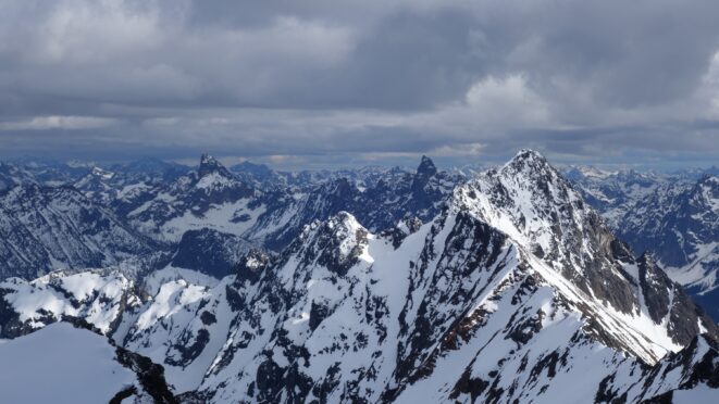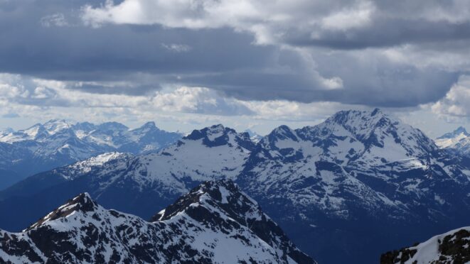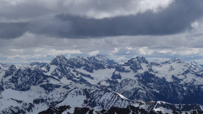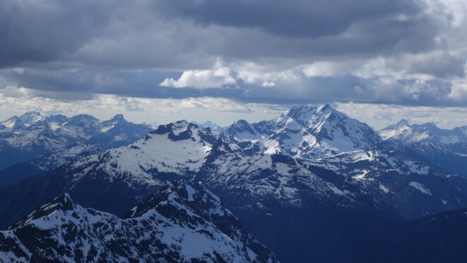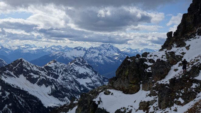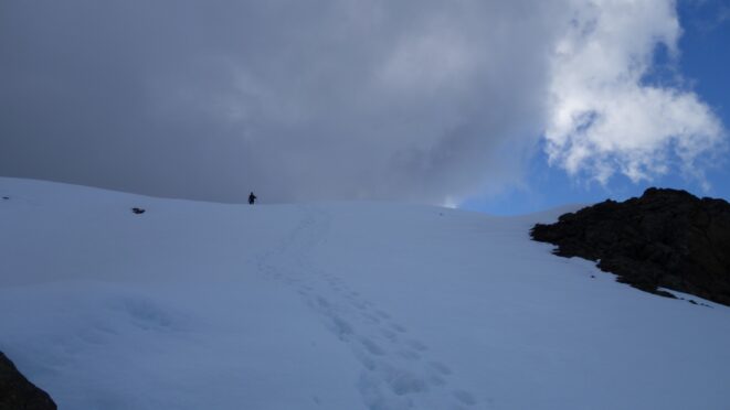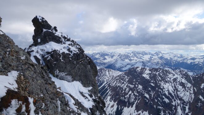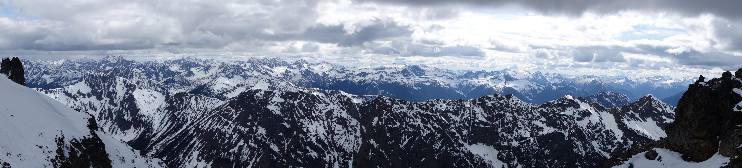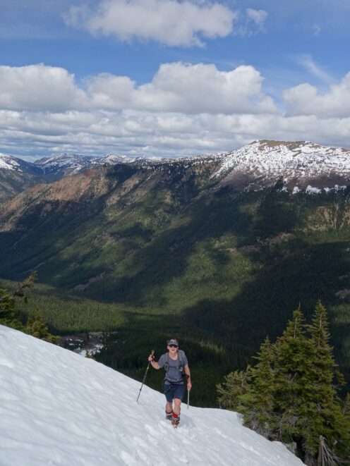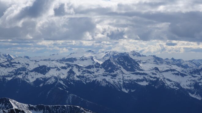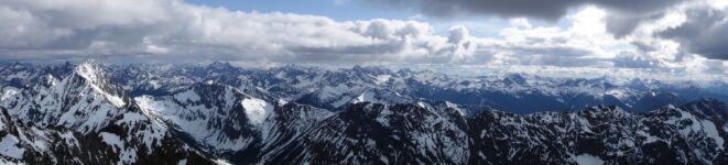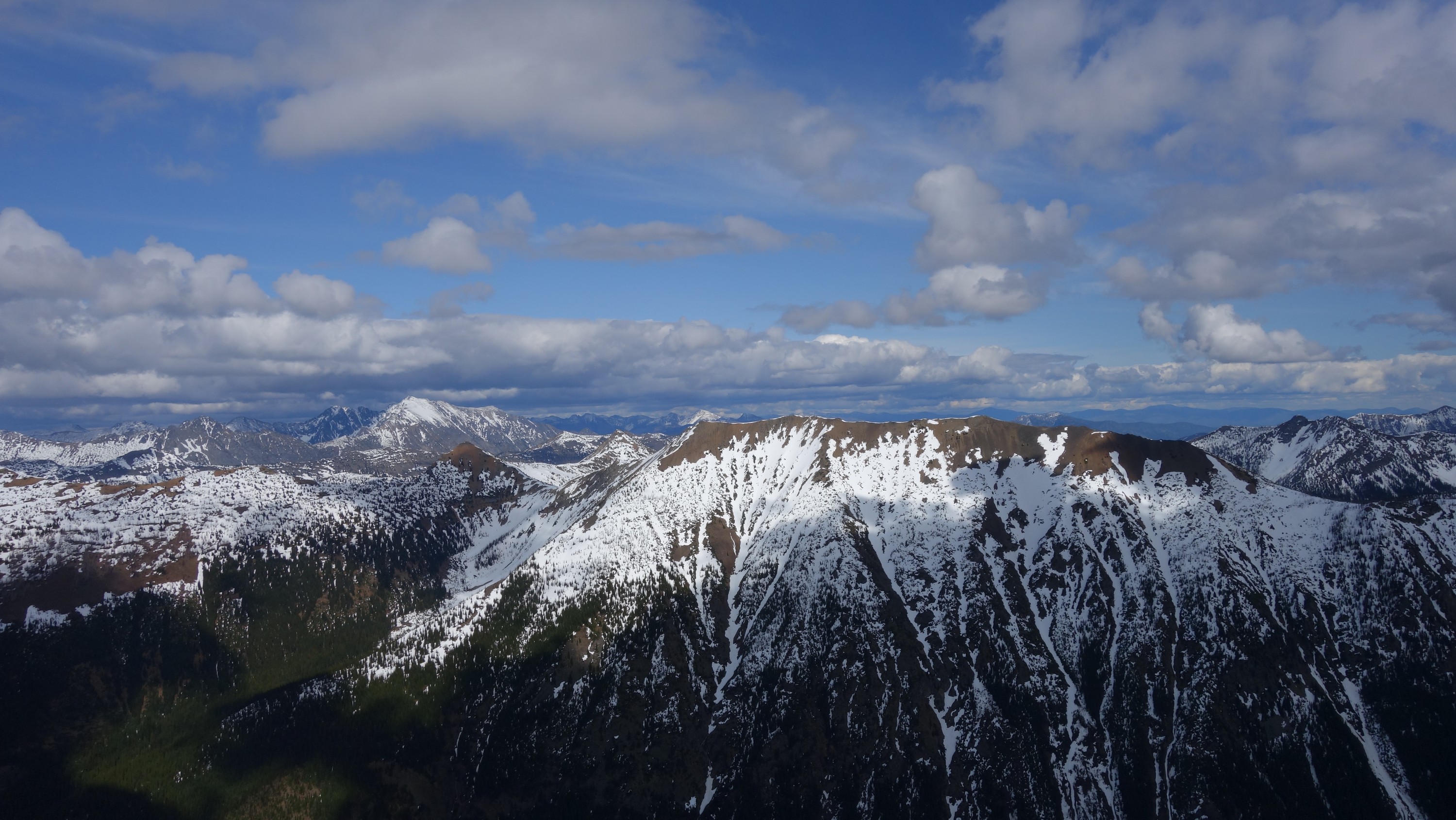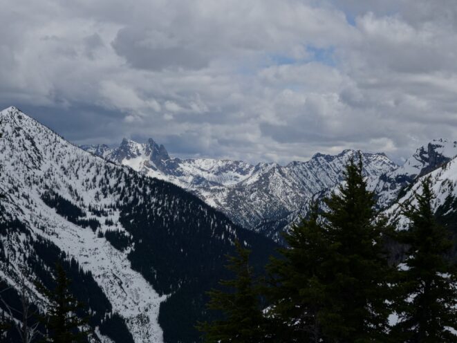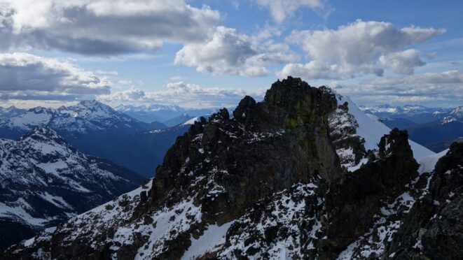 Since the snow appeared very steep in the 7000s elevation range, we opted to climb class 3 and 4 dry rock on the ribs and blocks between the snowfields. This was possible up to an extent, however at around 7300 feet, we were forced onto a large 45 degree snowfield to weave through cliff bands and much steeper sections, zig zagging our way up, mostly angling leftward until we reached the upper part of the east ridge at about 7650 feet where the angle eased significantly down to the 20-25 degree range. However this lower angle section of the route for the next 400 feet to the 8150 foot col would prove to be the most taxing, as I was sinking to my knees or more post holing through deep snow. Since I was out ahead feeling fairly strong, I ended up breaking most of the trail on the upper route. We finally reached the col immediately below a small rock spire just north of the true summit of Ballard. Here we rested briefly, and was mesmerized by the view we had to the west. All of the North Cascades were visible, with peaks like Goode, Mesahchie, and Eldorado easily picked out. Even Baker and Shuksan were visible through the perfectly timed passing clouds.