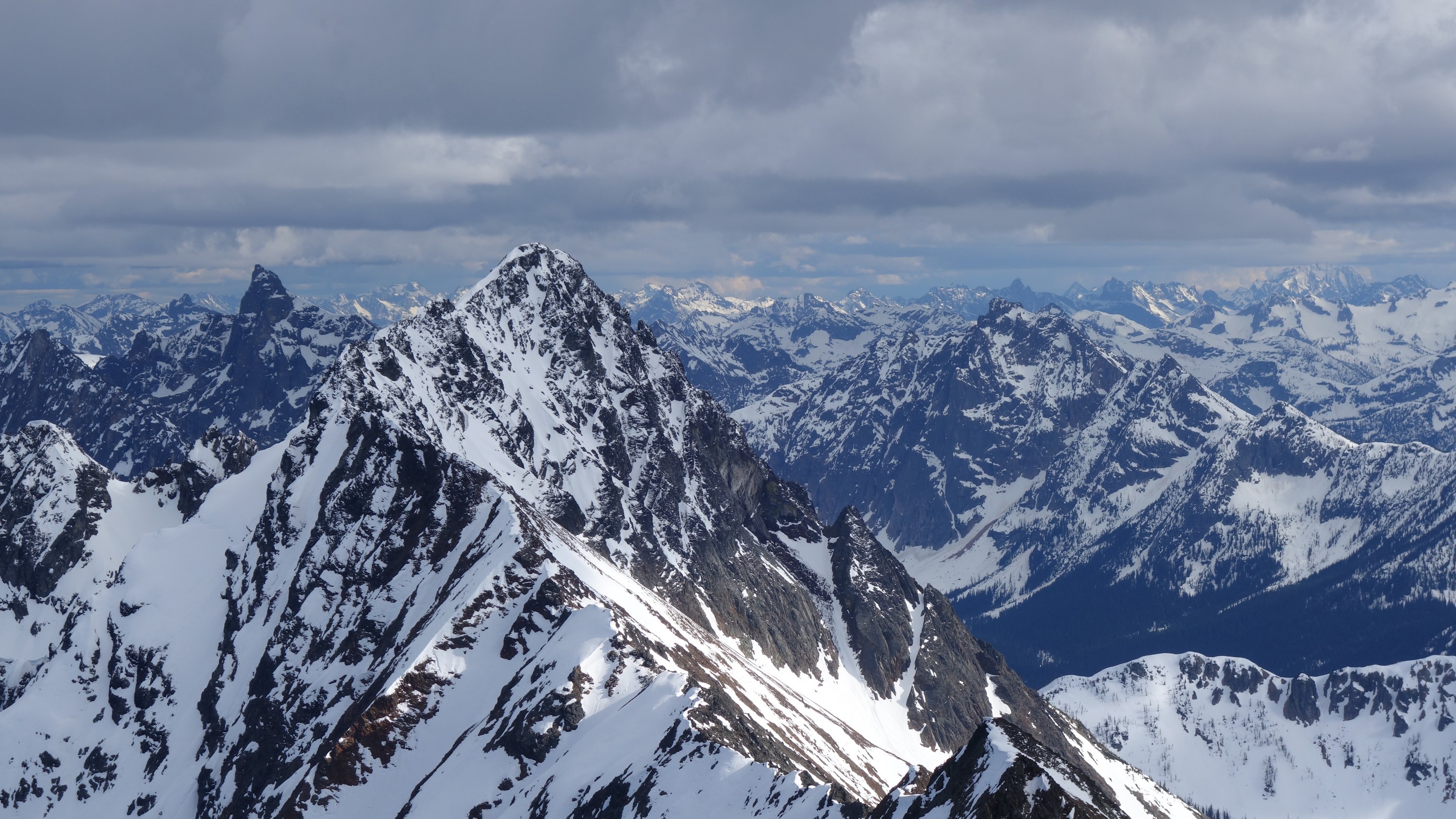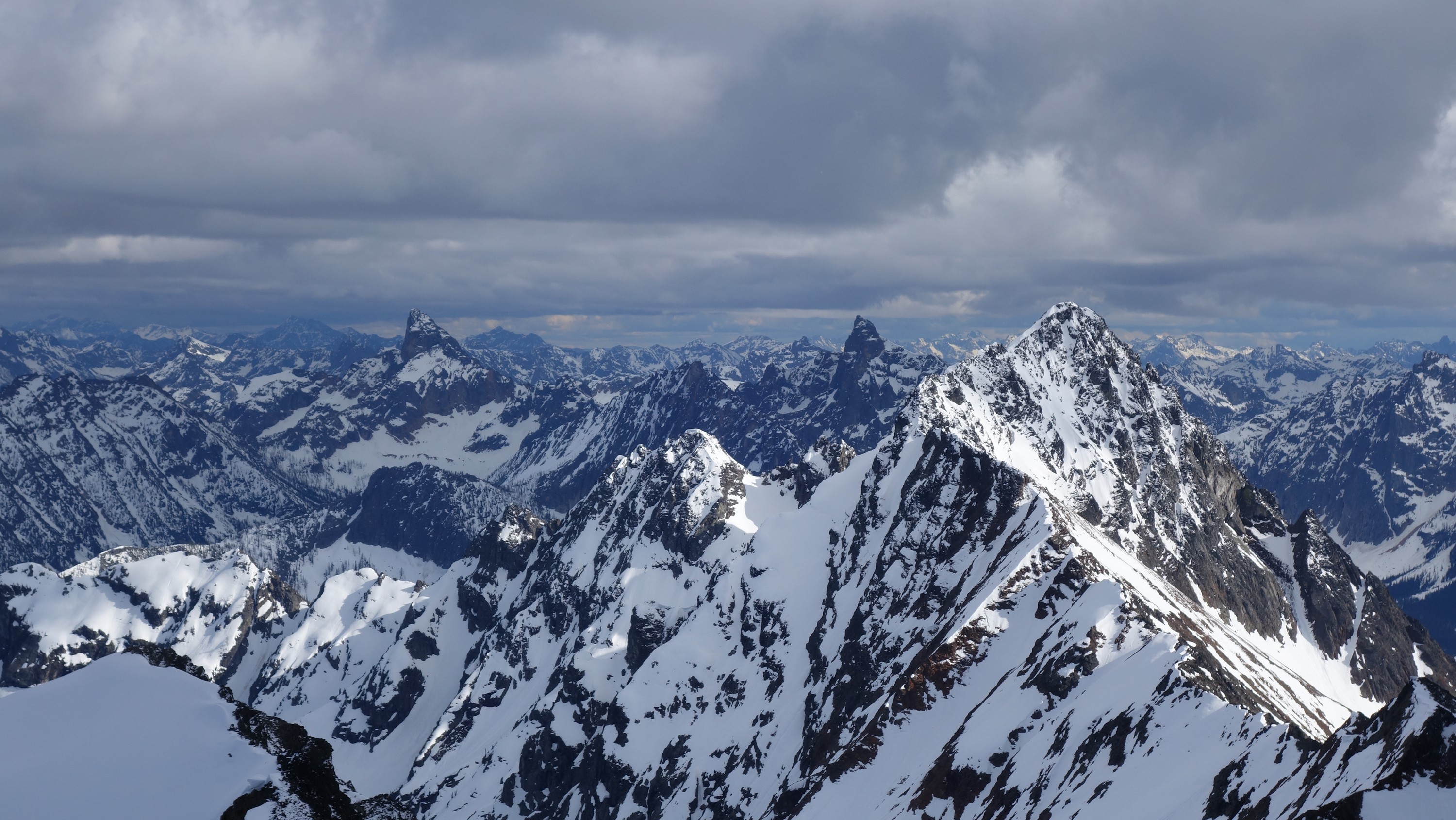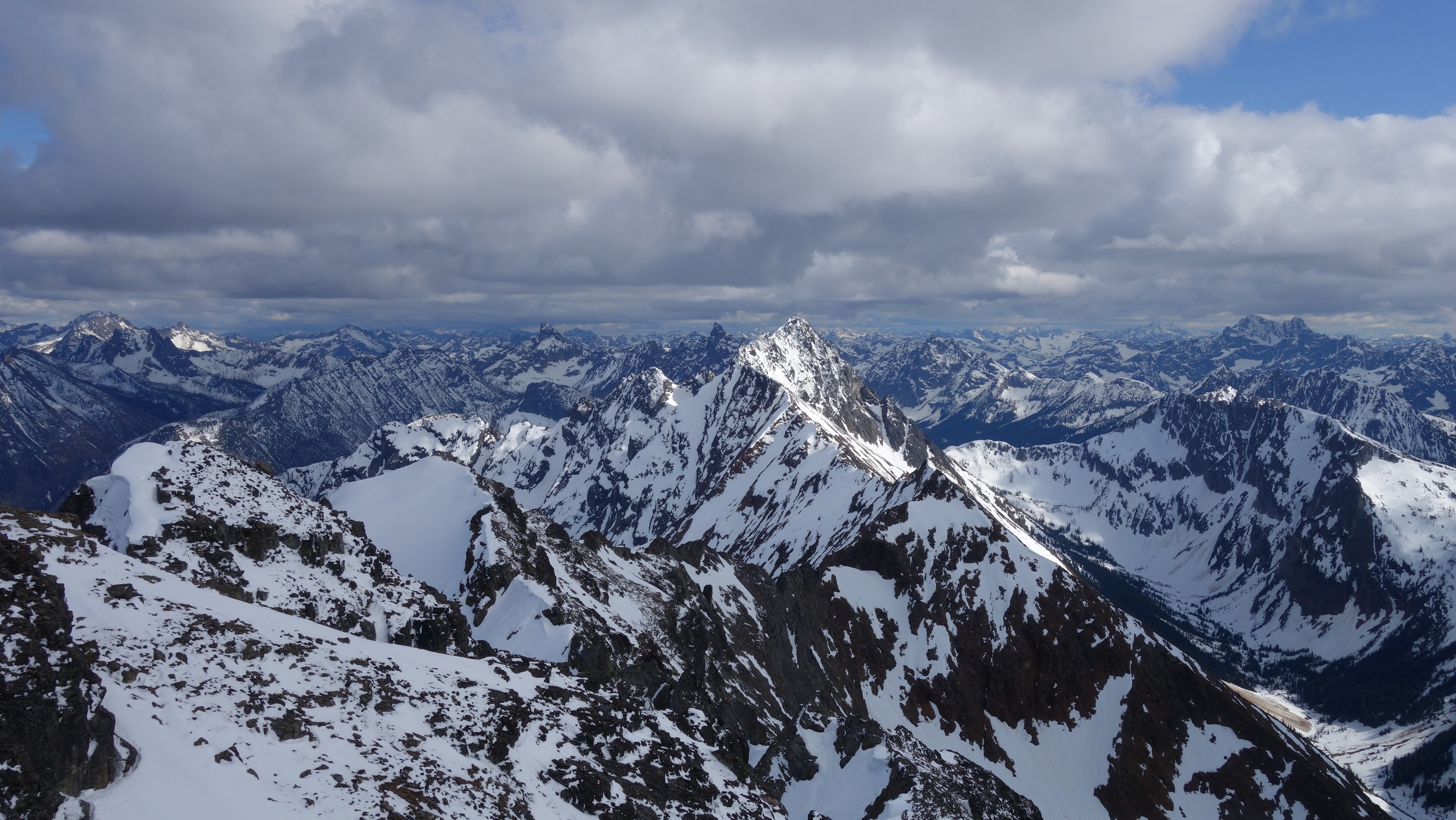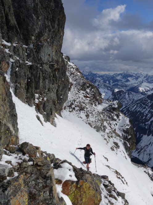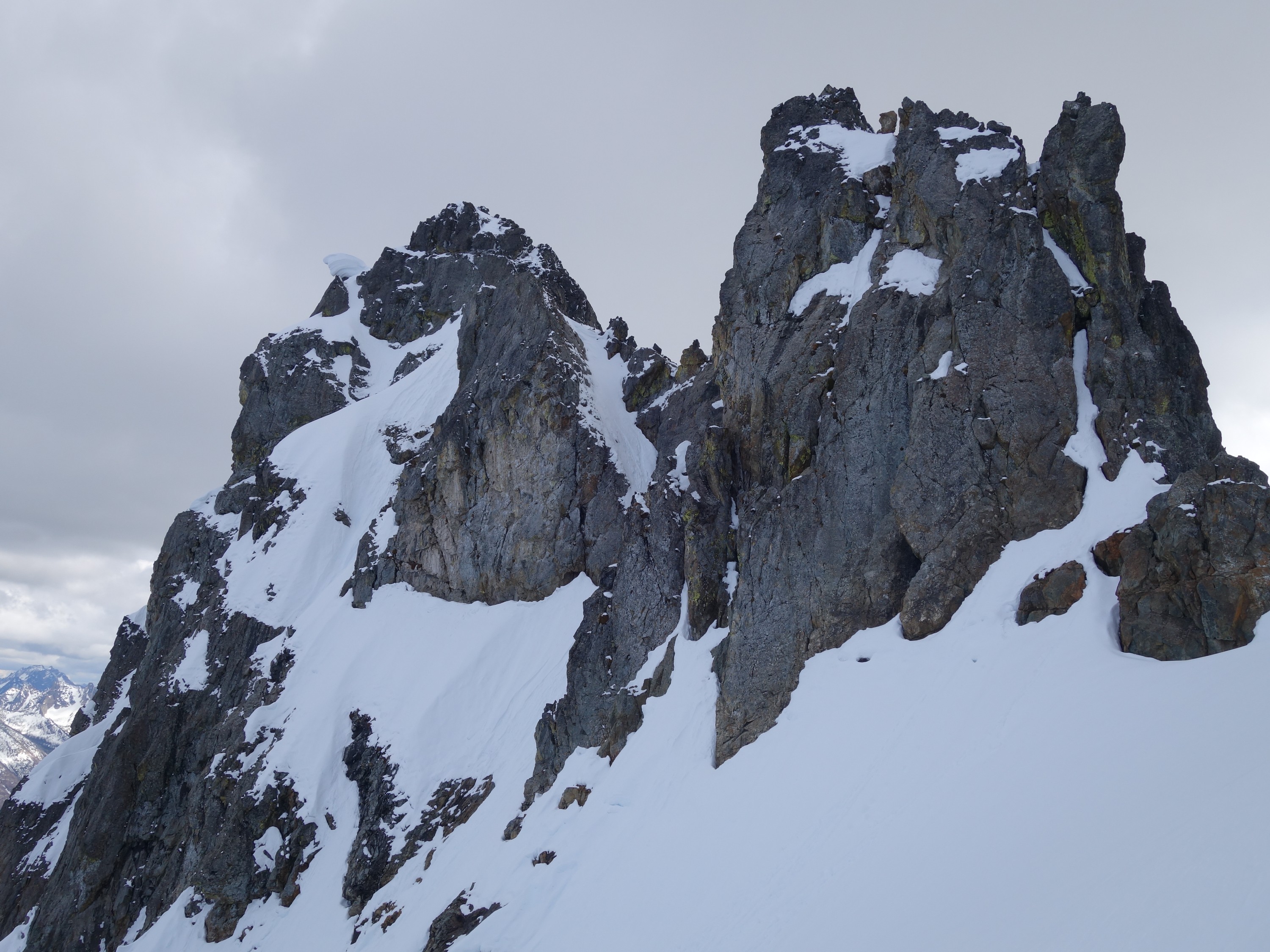 We crossed over to the west side of the col, and followed a beautiful ledge around the small tower, and continued right to the base of the summit pinnacle. Due to the recent storm, the scramble was covered in wet snow, making the difficulty significantly harder to climb. I initially continued traversing south until reaching a tiny notch, which blocked any further traversing, then scrambled directly up the west face for maybe 40 feet of class 3-4 until reaching a small ledge. Here, I traversed back north all the way to the north ridge and climbed a low 5th class step requiring me to stem out wide on small ledges. Above that it was another bit of 4th class to the summit. Every little ledge was wet or partially covered in melting snow requiring extra caution, but nonetheless, I found the scrambling fun. Unfortunately though, with Josh being in his ski boots (I had leather hiker boots) he wasn't comfortable making the exposed scramble with stiff plastic boots. I had to enjoy the summit alone. This summit was easily one of the best summit views I have seen in the Cascades, but that is partially owed to the amazing photographic lighting we experienced. Shortly before 5pm, I stood on top of one of my final P400 top 100 peaks, on a trip back to WA that was truly last minute (I leave for Indonesia tomorrow!).