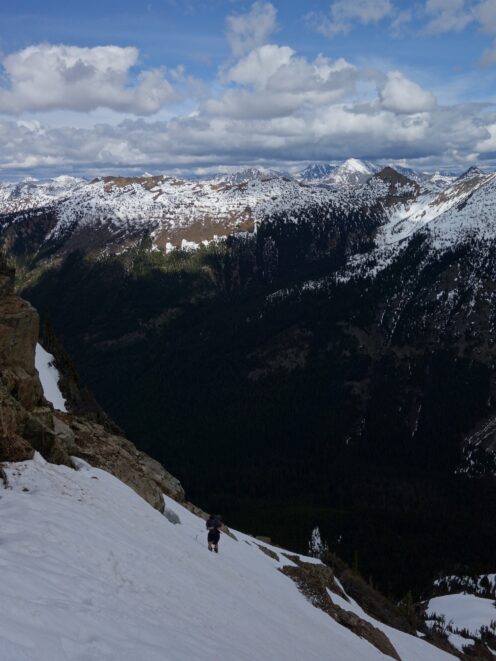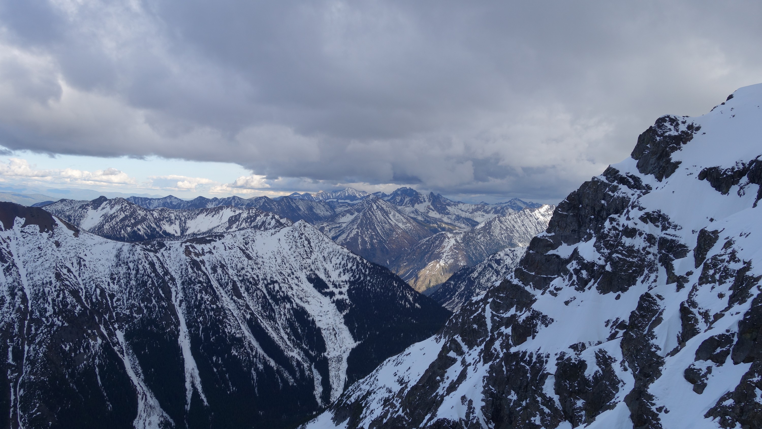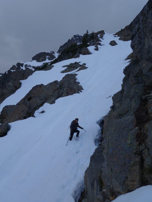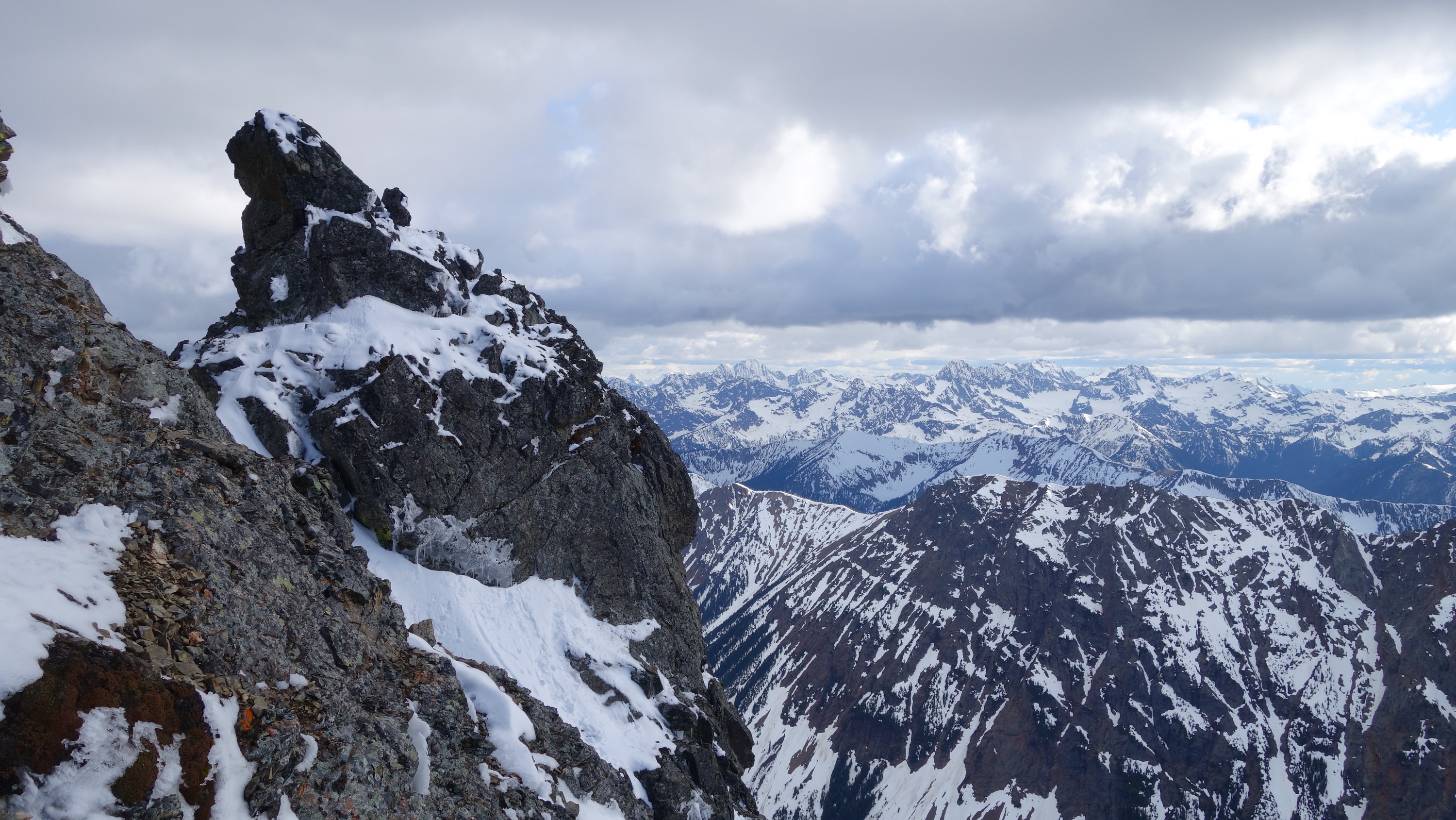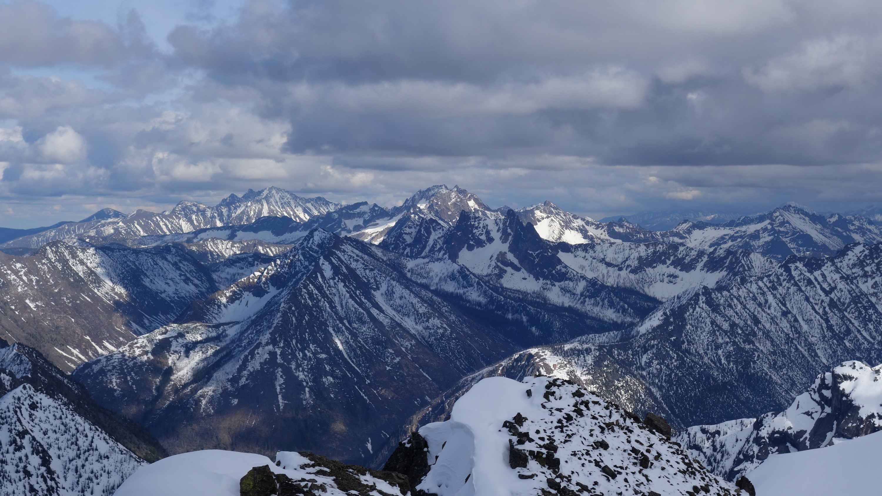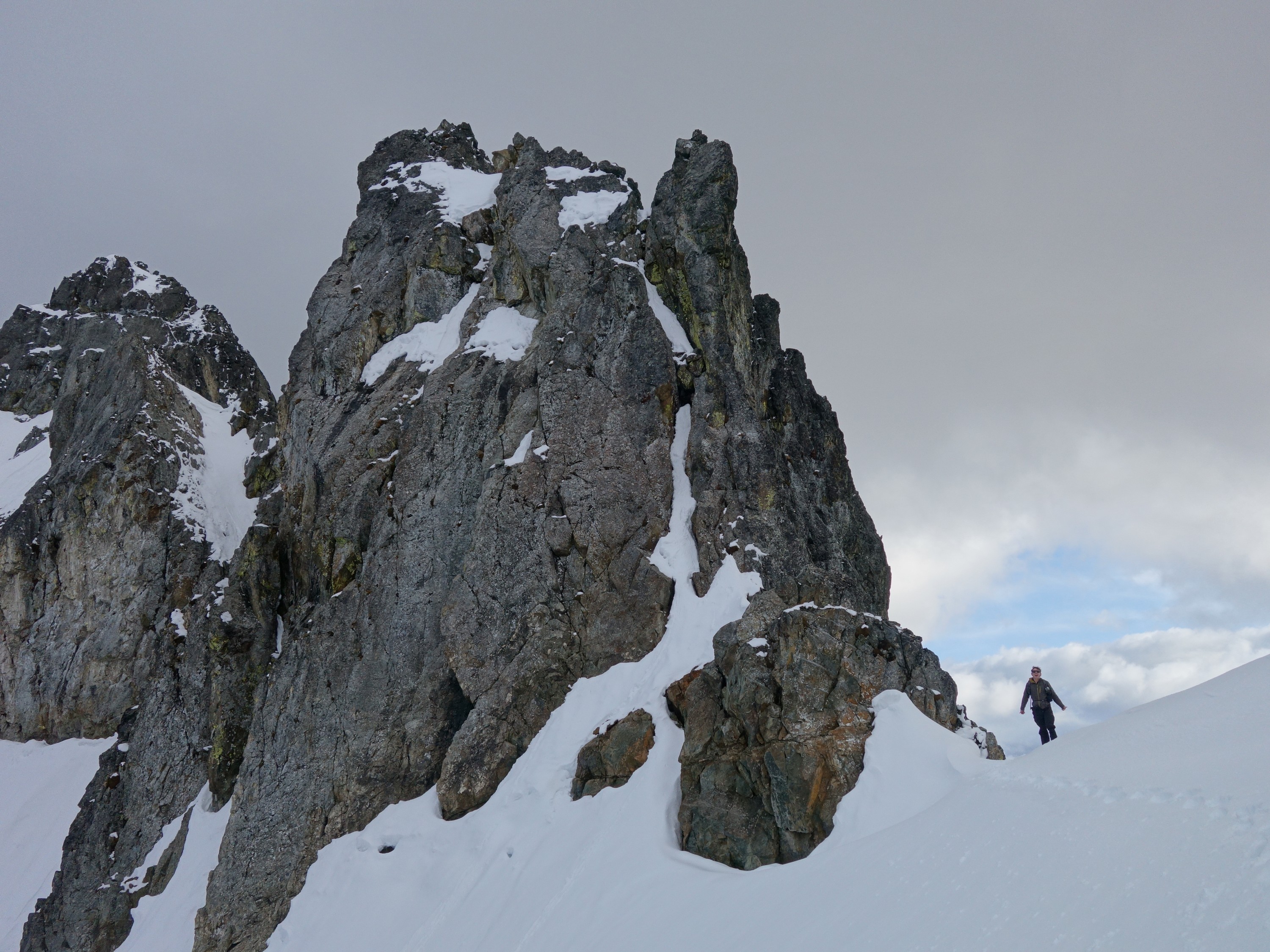 We crossed over to the west side of the col, and followed a beautiful ledge around the small tower, and continued right to the base of the summit pinnacle. Due to the recent storm, the scramble was covered in wet snow, making the difficulty significantly harder to climb. I initially continued traversing south until reaching a tiny notch, which blocked any further traversing, then scrambled directly up the west face for maybe 40 feet of class 3-4 until reaching a small ledge. Here, I traversed back north all the way to the north ridge and climbed a low 5th class step requiring me to stem out wide on small ledges. Above that it was another bit of 4th class to the summit. Every little ledge was wet or partially covered in melting snow requiring extra caution, but nonetheless, I found the scrambling fun. Unfortunately though, with Josh being in his ski boots (I had leather hiker boots) he wasn't comfortable making the exposed scramble with stiff plastic boots. I had to enjoy the summit alone. This summit was easily one of the best summit views I have seen in the Cascades, but that is partially owed to the amazing photographic lighting we experienced. Shortly before 5pm, I stood on top of one of my final P400 top 100 peaks, on a trip back to WA that was truly last minute (I leave for Indonesia tomorrow!).