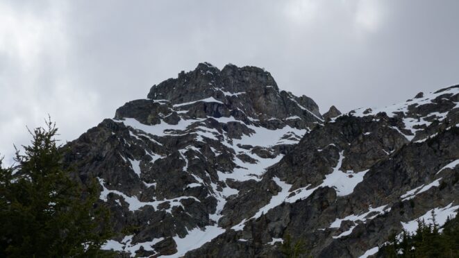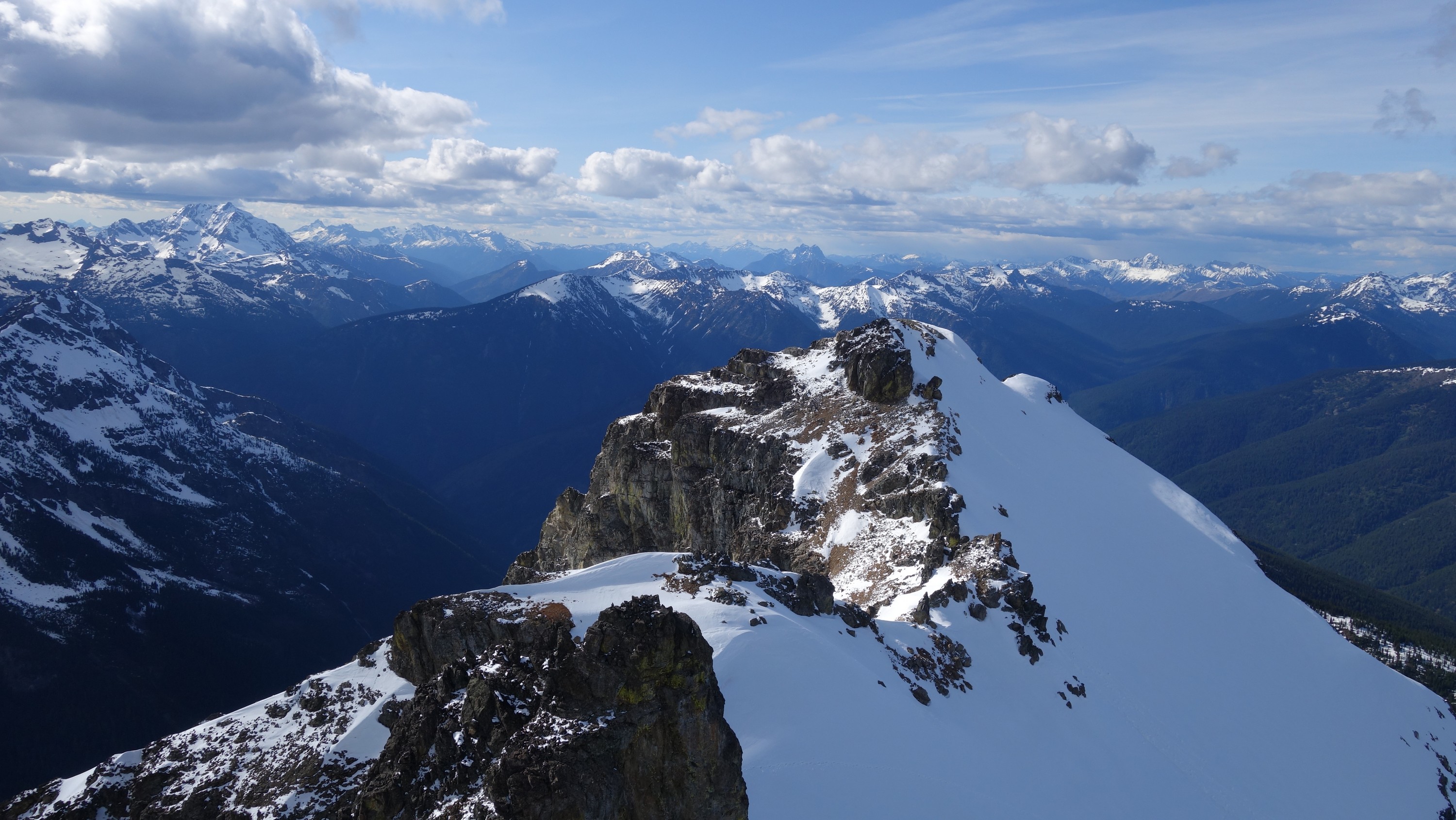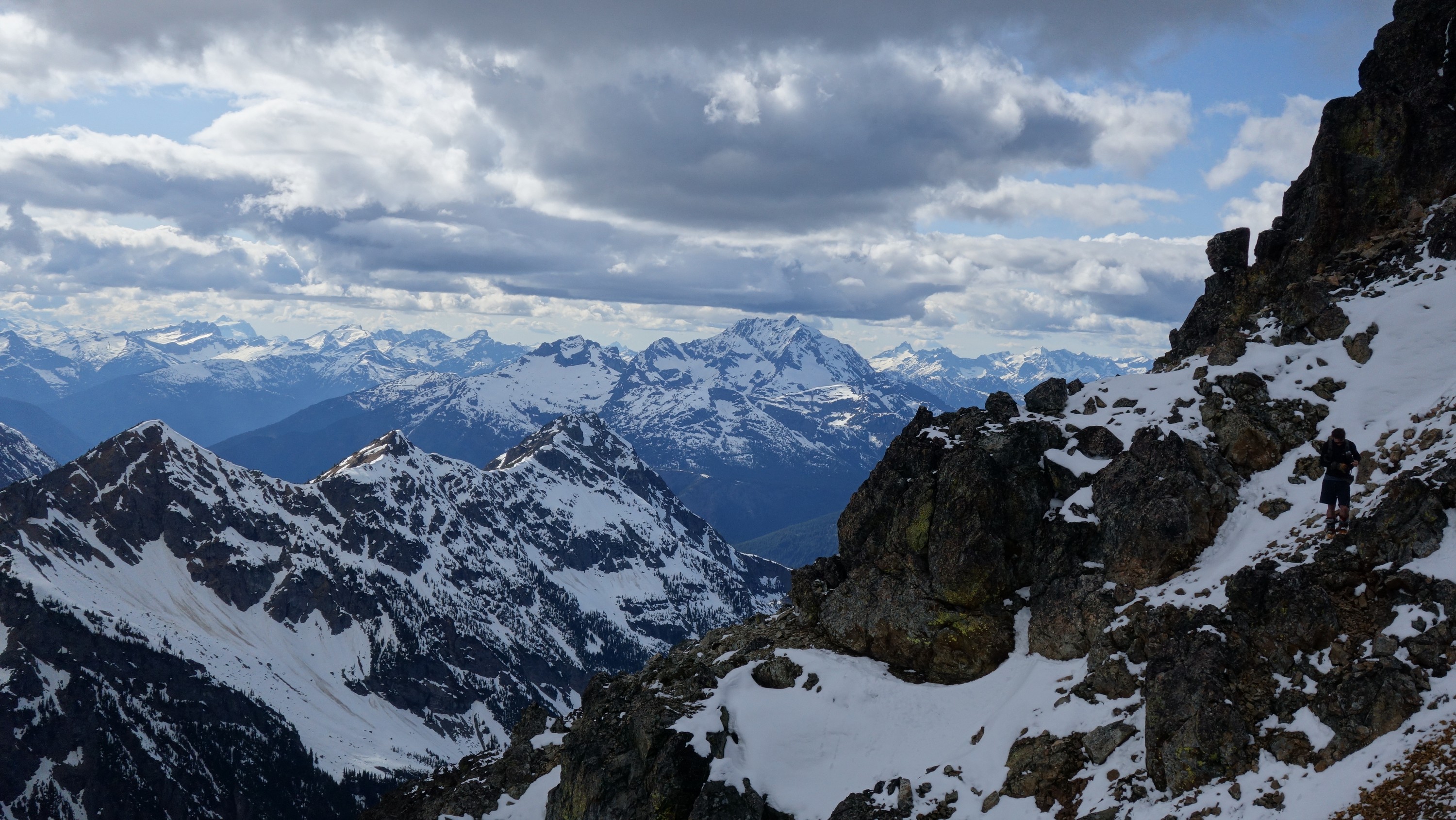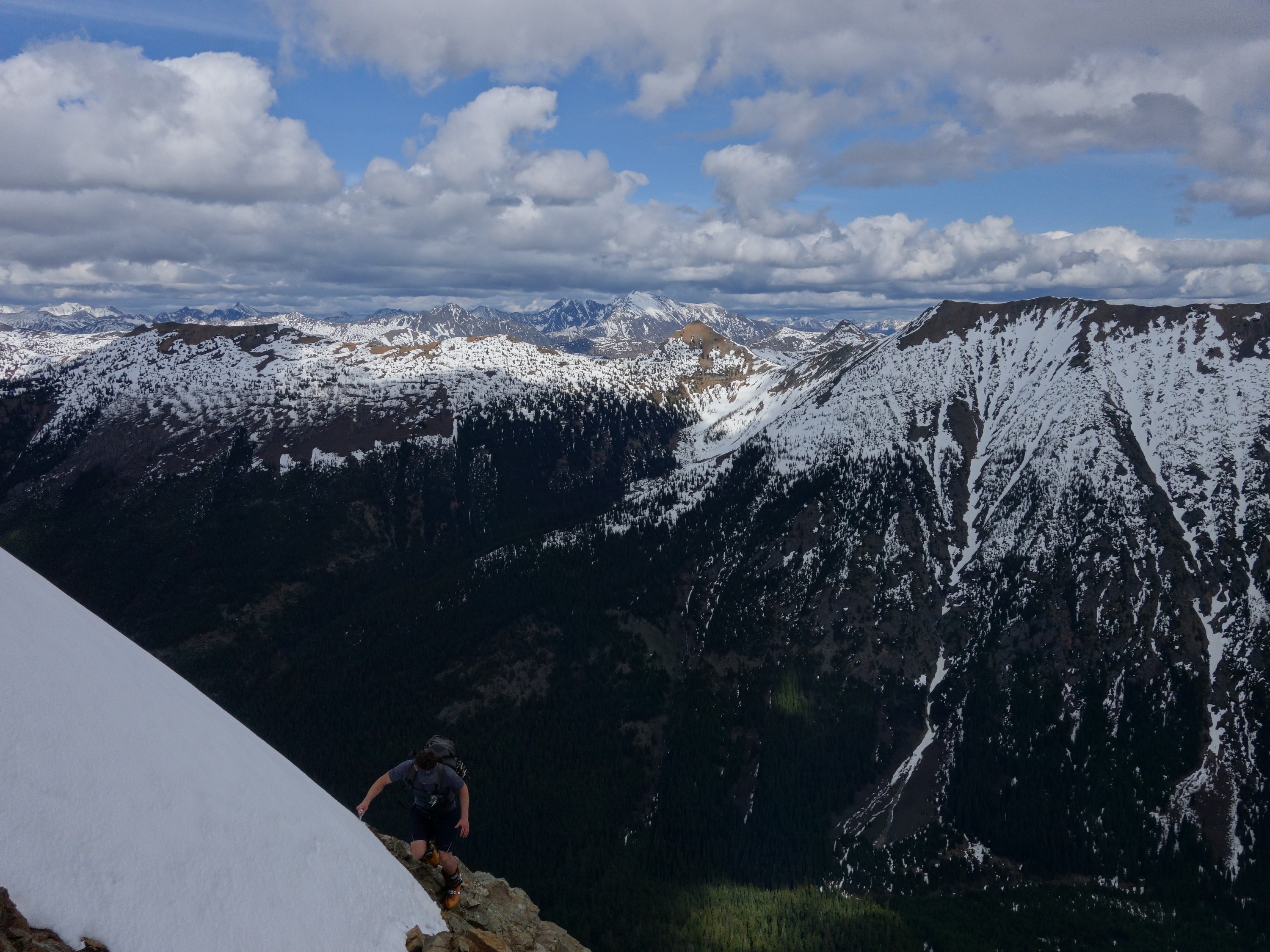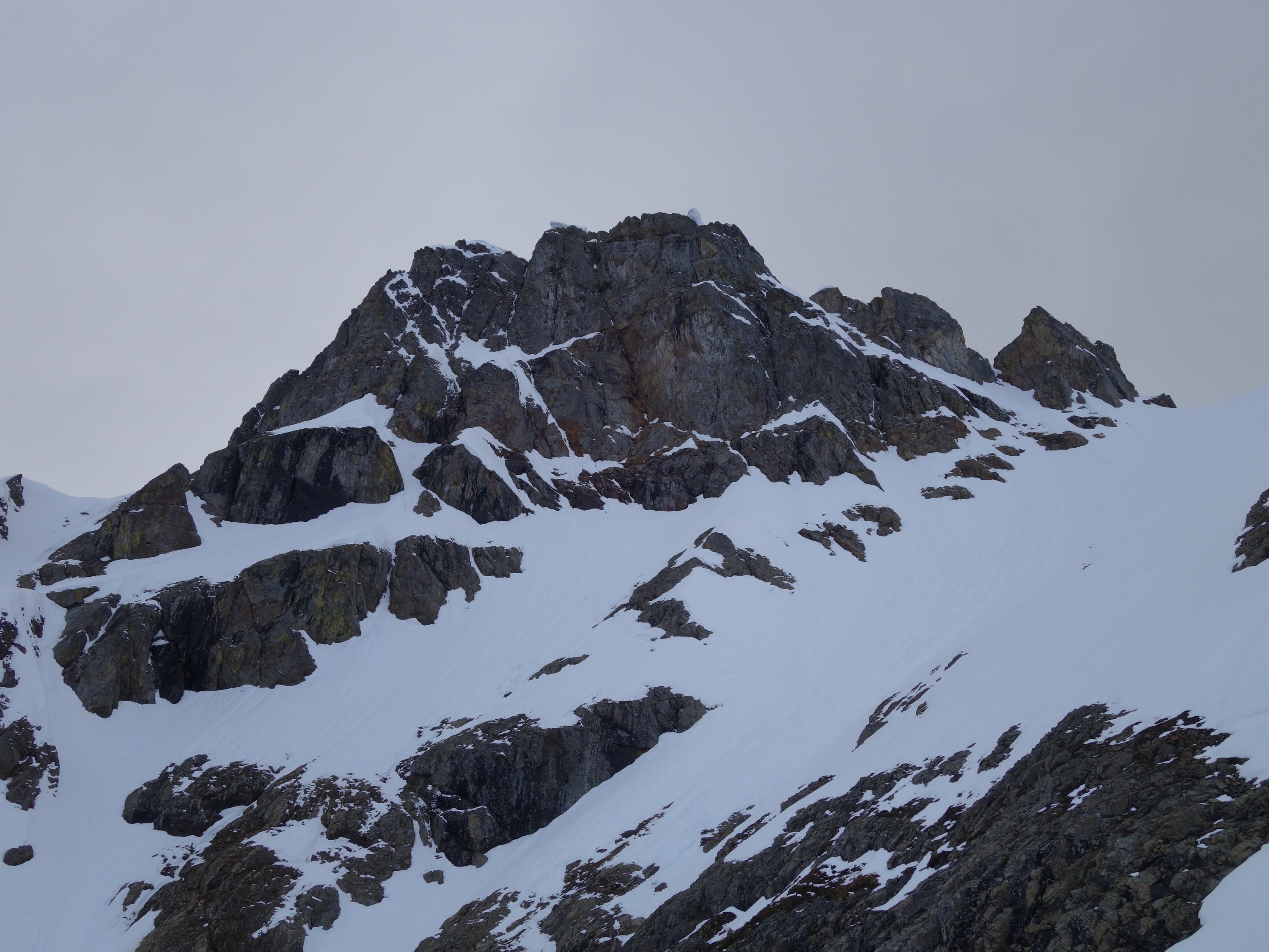 We crossed over to the west side of the col, and followed a beautiful ledge around the small tower, and continued right to the base of the summit pinnacle. Due to the recent storm, the scramble was covered in wet snow, making the difficulty significantly harder to climb. I initially continued traversing south until reaching a tiny notch, which blocked any further traversing, then scrambled directly up the west face for maybe 40 feet of class 3-4 until reaching a small ledge. Here, I traversed back north all the way to the north ridge and climbed a low 5th class step requiring me to stem out wide on small ledges. Above that it was another bit of 4th class to the summit. Every little ledge was wet or partially covered in melting snow requiring extra caution, but nonetheless, I found the scrambling fun. Unfortunately though, with Josh being in his ski boots (I had leather hiker boots) he wasn't comfortable making the exposed scramble with stiff plastic boots. I had to enjoy the summit alone. This summit was easily one of the best summit views I have seen in the Cascades, but that is partially owed to the amazing photographic lighting we experienced. Shortly before 5pm, I stood on top of one of my final P400 top 100 peaks, on a trip back to WA that was truly last minute (I leave for Indonesia tomorrow!).
