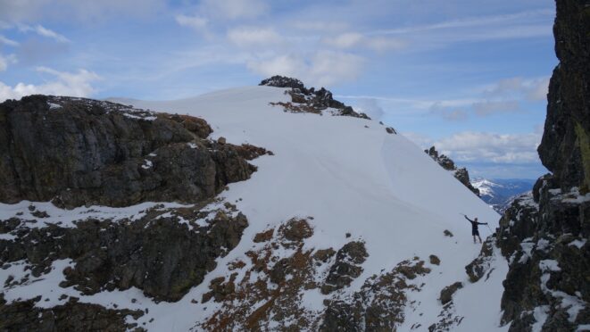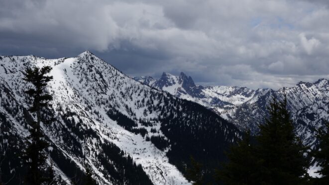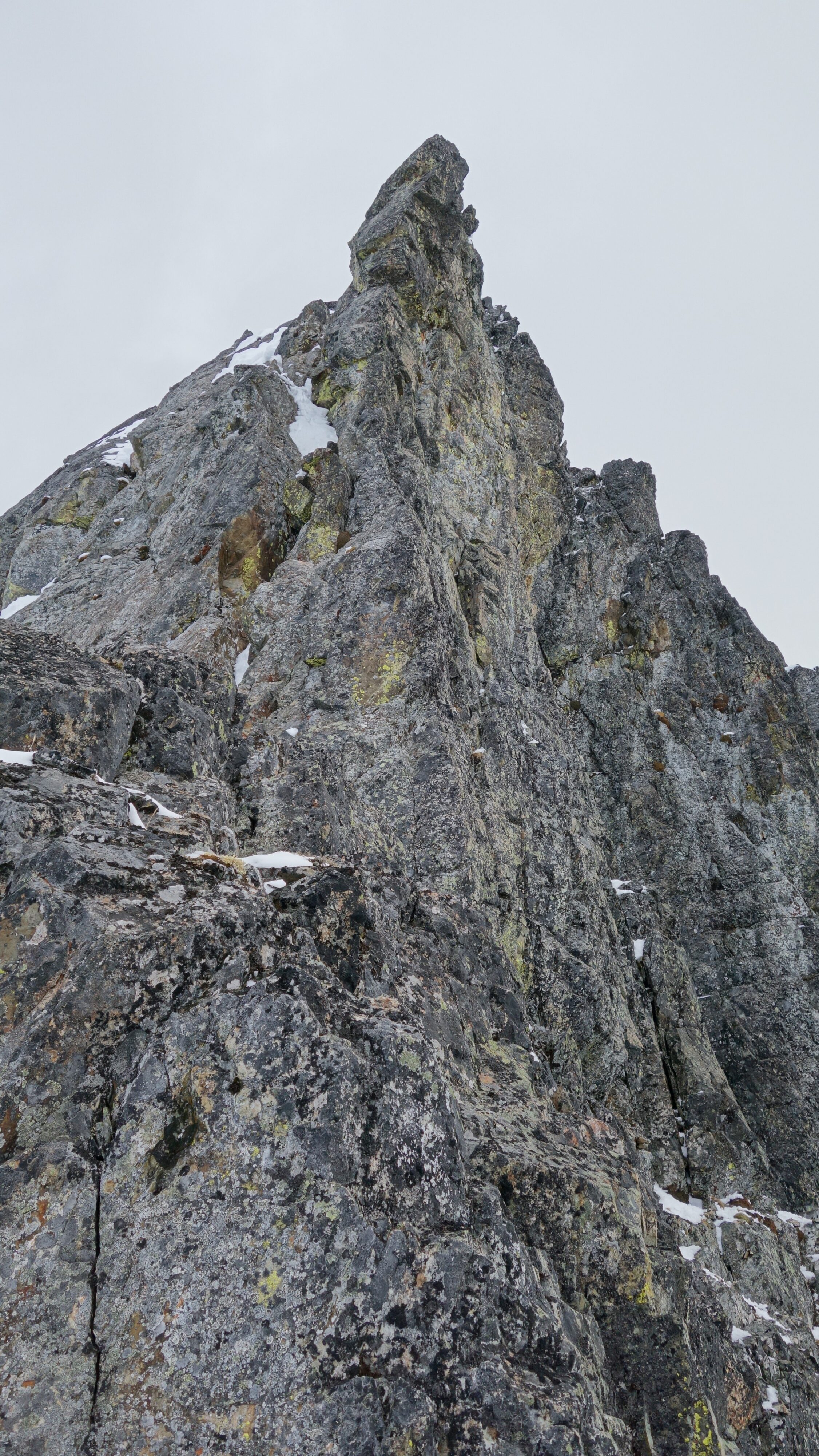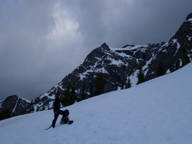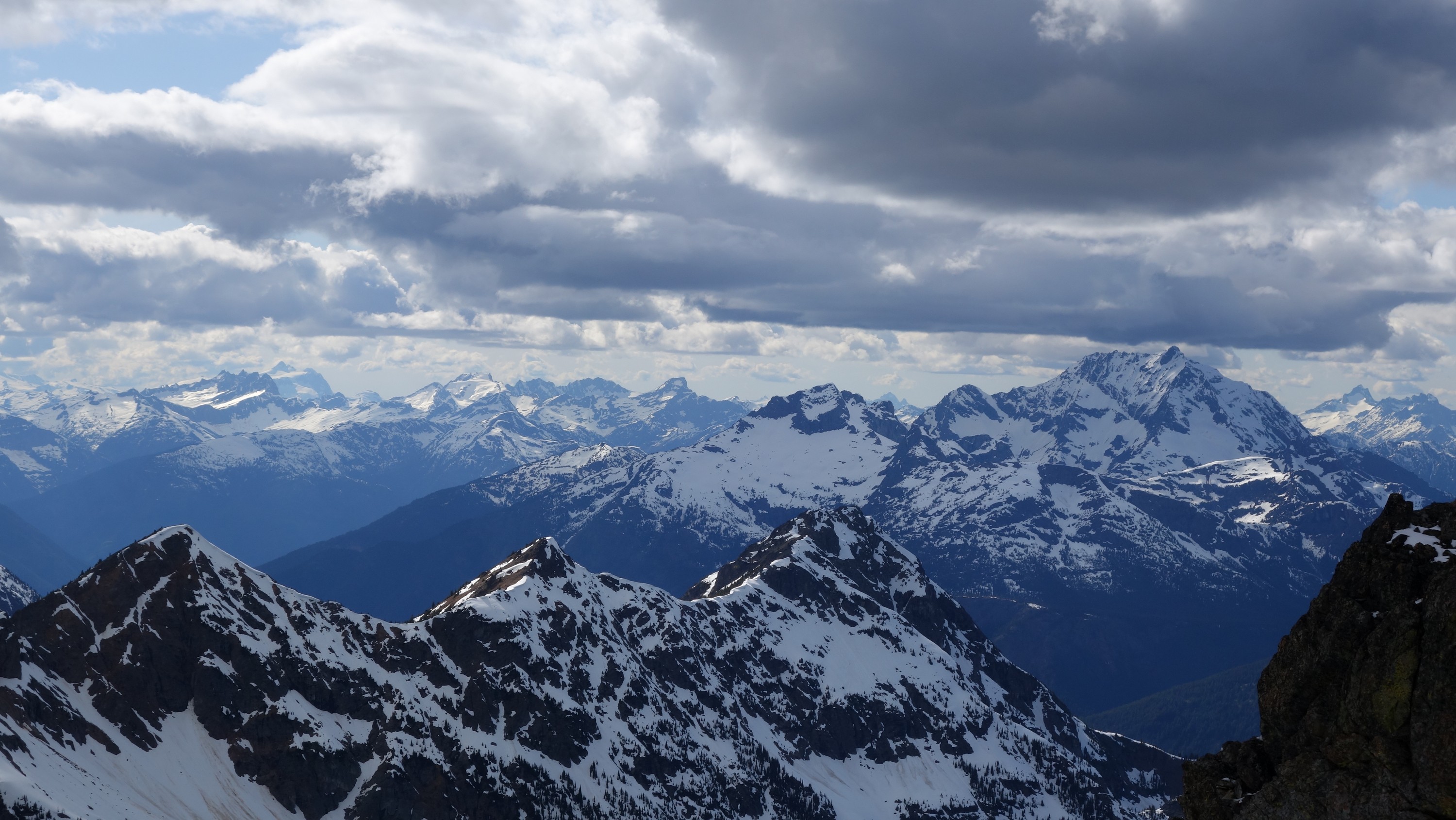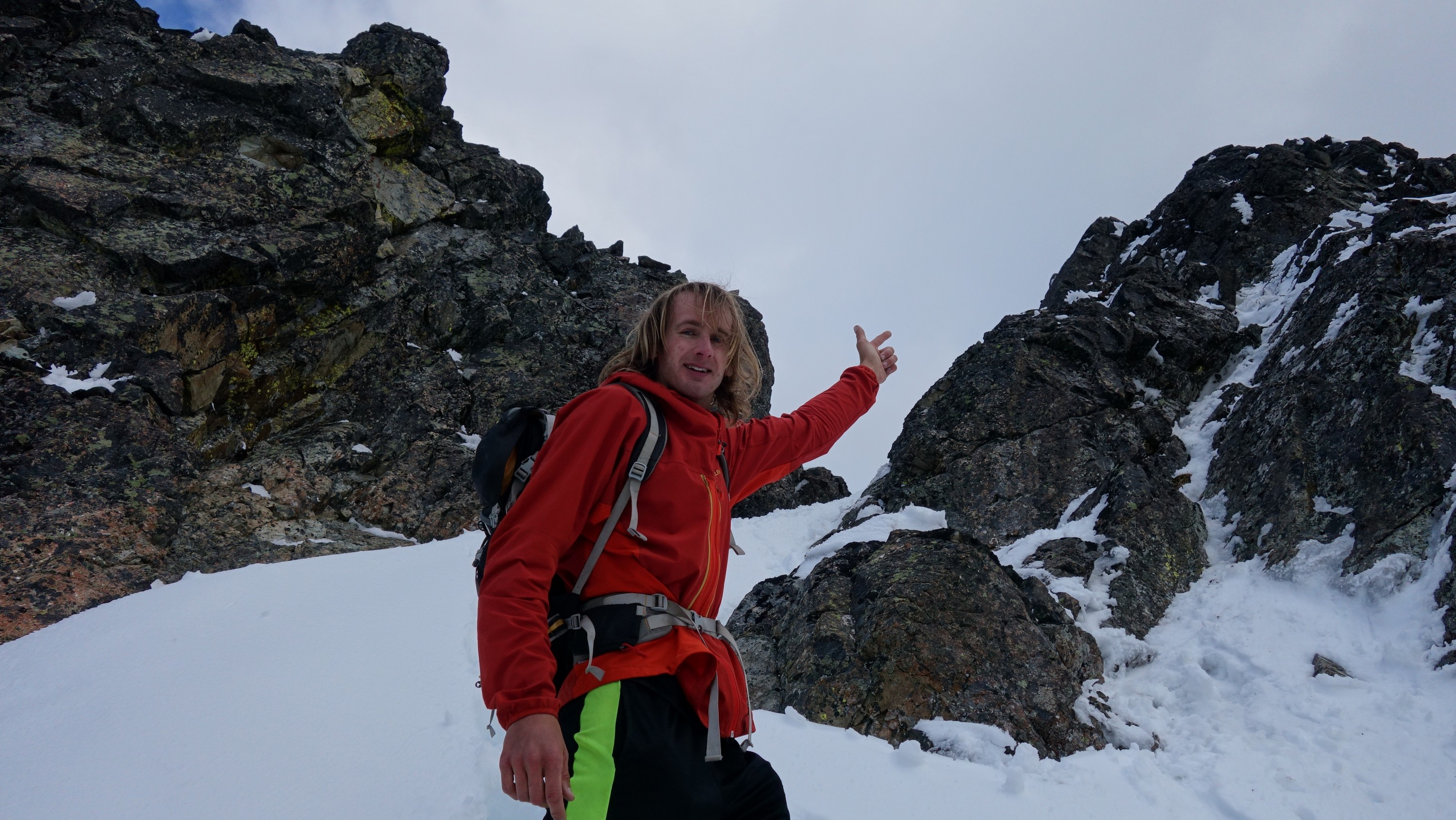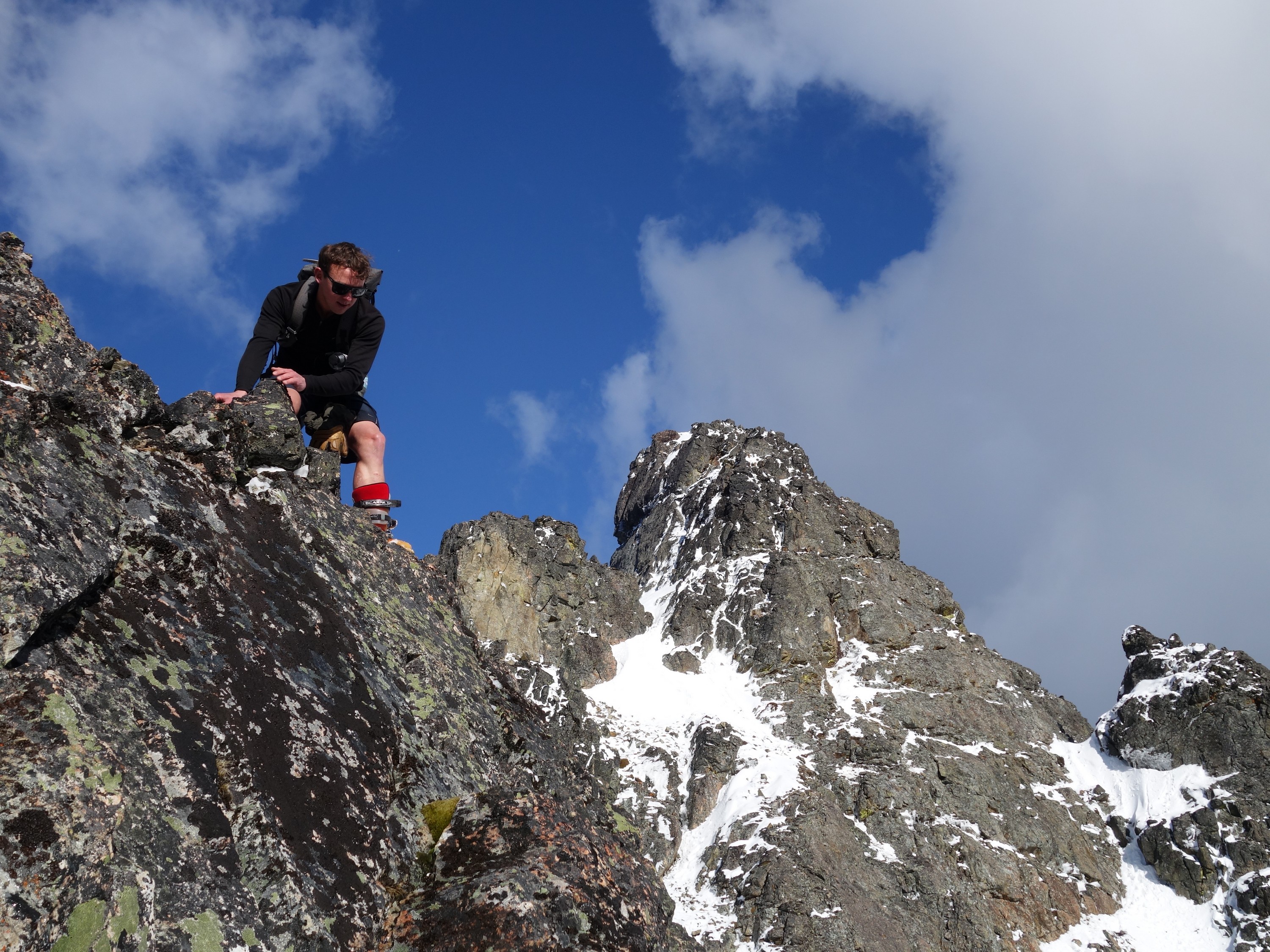 We crossed over to the west side of the col, and followed a beautiful ledge around the small tower, and continued right to the base of the summit pinnacle. Due to the recent storm, the scramble was covered in wet snow, making the difficulty significantly harder to climb. I initially continued traversing south until reaching a tiny notch, which blocked any further traversing, then scrambled directly up the west face for maybe 40 feet of class 3-4 until reaching a small ledge. Here, I traversed back north all the way to the north ridge and climbed a low 5th class step requiring me to stem out wide on small ledges. Above that it was another bit of 4th class to the summit. Every little ledge was wet or partially covered in melting snow requiring extra caution, but nonetheless, I found the scrambling fun. Unfortunately though, with Josh being in his ski boots (I had leather hiker boots) he wasn't comfortable making the exposed scramble with stiff plastic boots. I had to enjoy the summit alone. This summit was easily one of the best summit views I have seen in the Cascades, but that is partially owed to the amazing photographic lighting we experienced. Shortly before 5pm, I stood on top of one of my final P400 top 100 peaks, on a trip back to WA that was truly last minute (I leave for Indonesia tomorrow!).