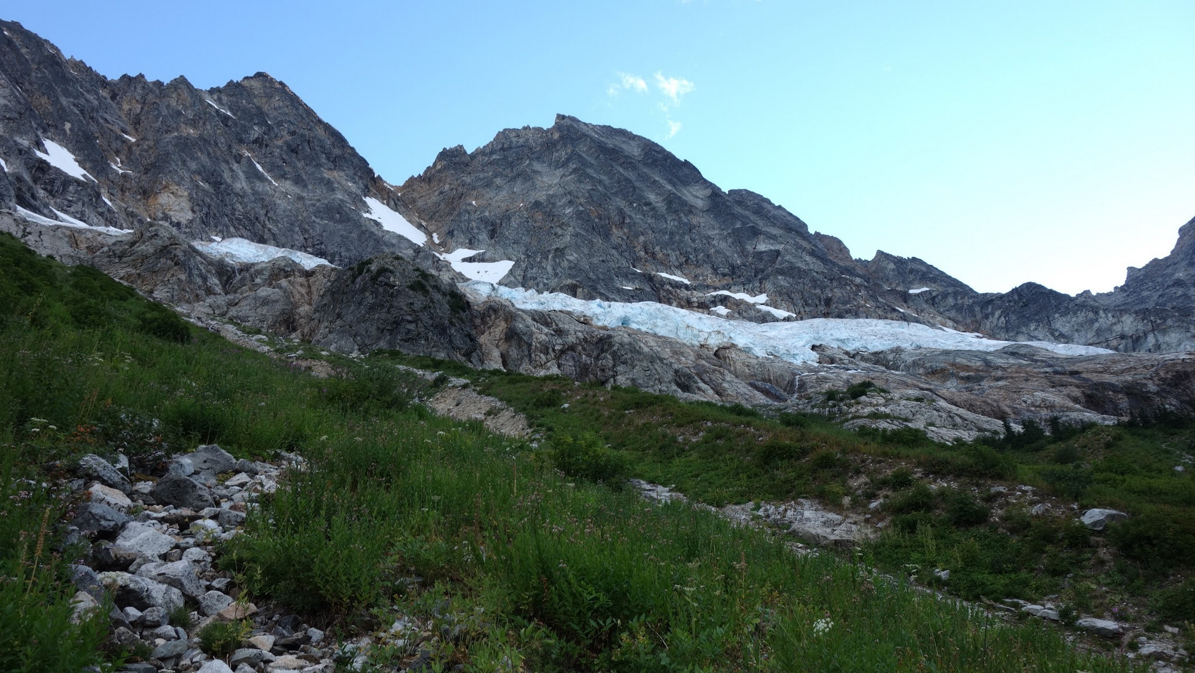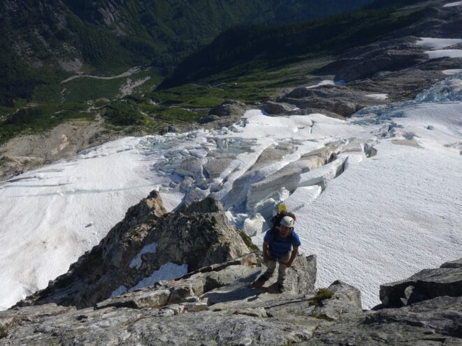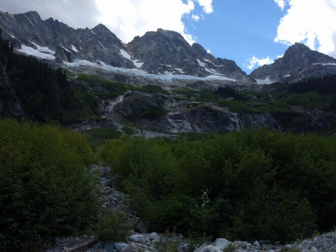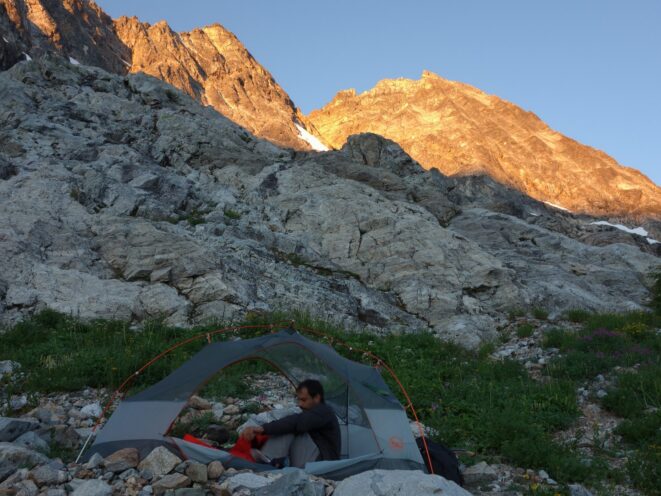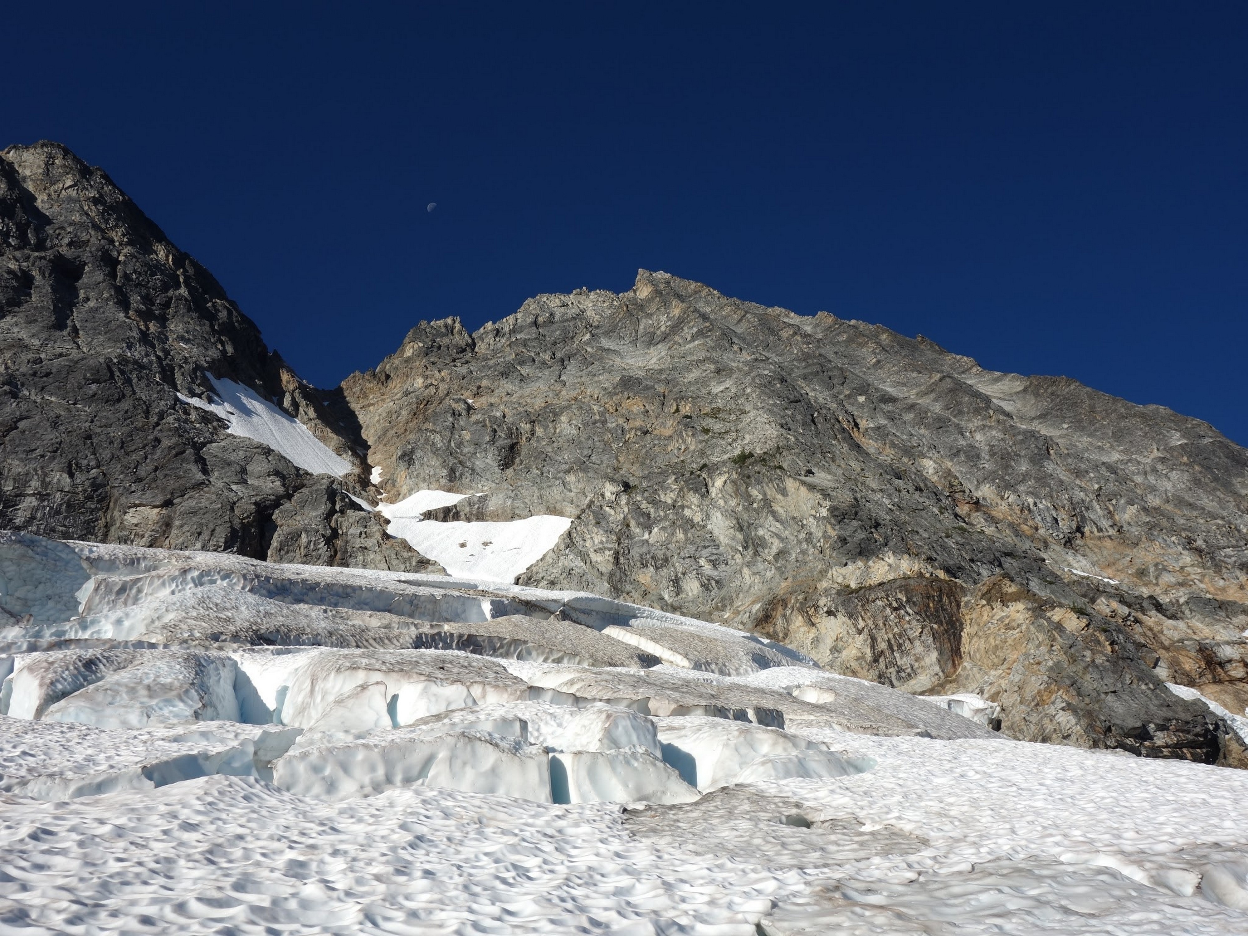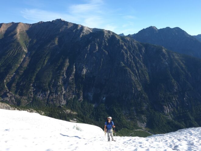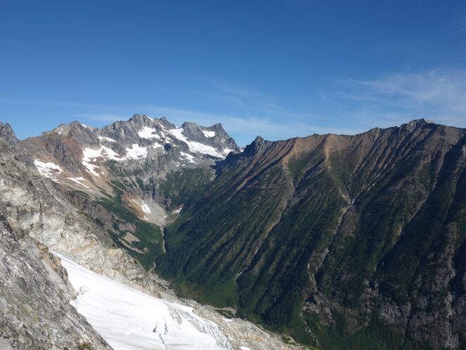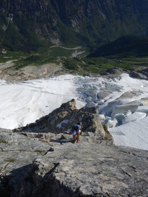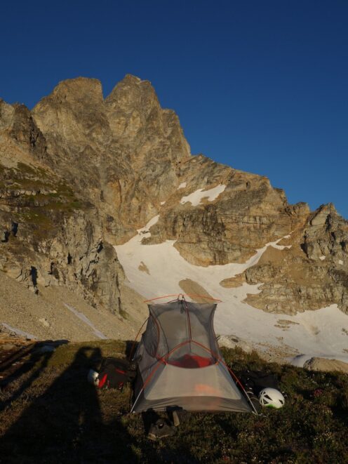 We then scrambled up the slabs to the right of the waterfall and followed a decently beaten path through two short bushy sections. Once we emerged it was another 600 feet or so to the 5,500 foot bivy site right at the base of the cliffs just below the remaining glacier. We reached this awesome camp spot 30 minutes before sunset and there was just enough room to pitch my tent, while Josh slept under the stars in the smaller platform. Sunset over Mount Logan and Black Peak was a real treat and I probably took 50 pictures trying to get the perfect one while trying to eat dinner at the same time. By dark we were sleeping with a 6am alarm set.