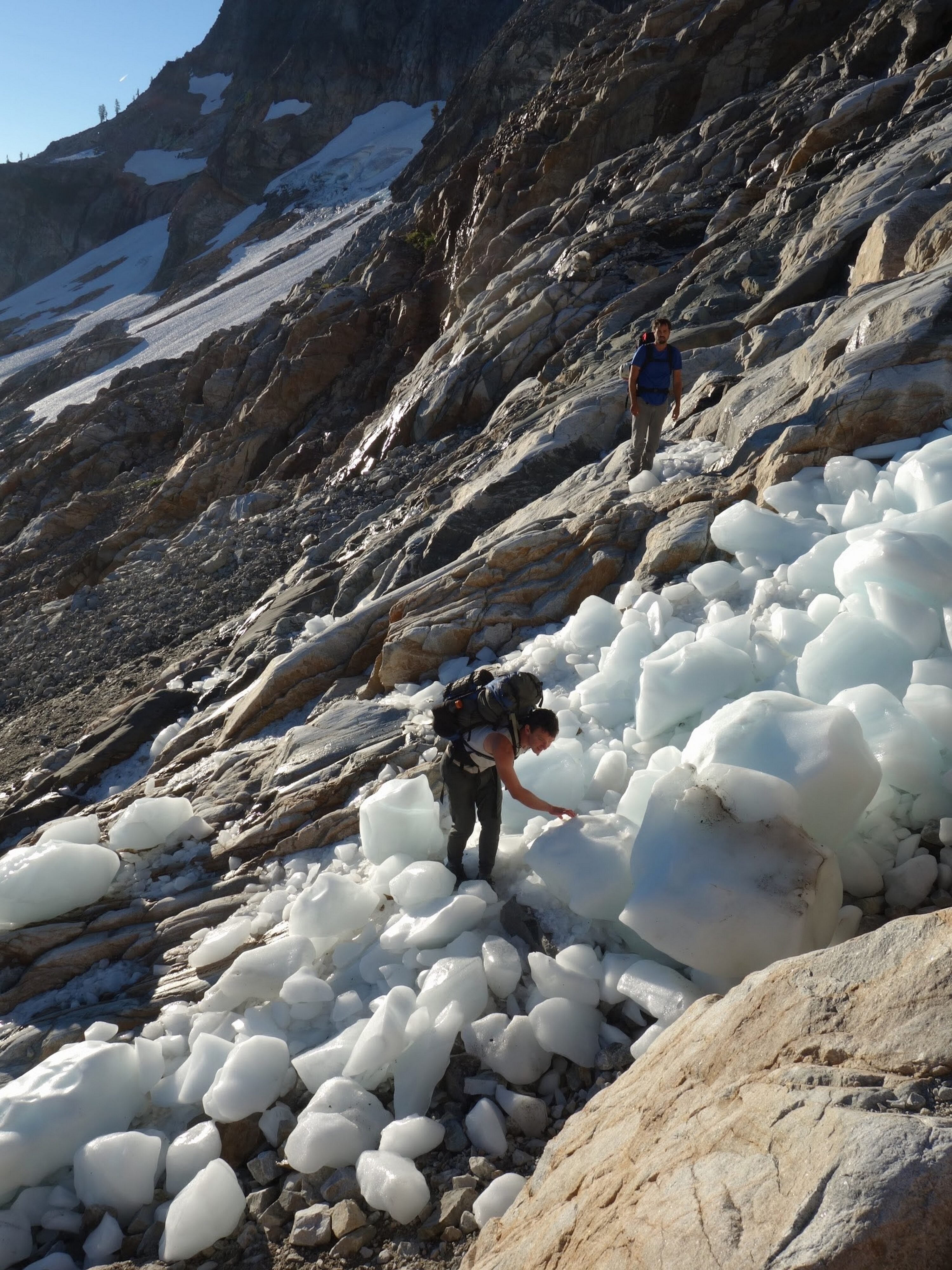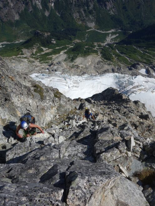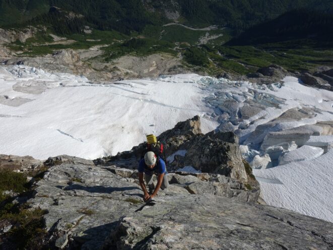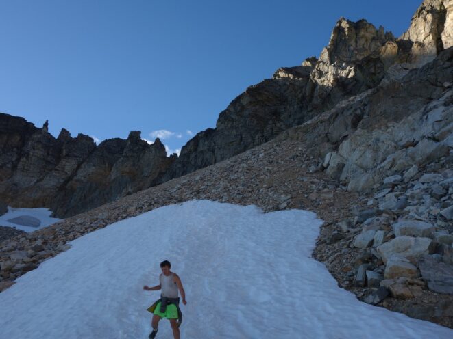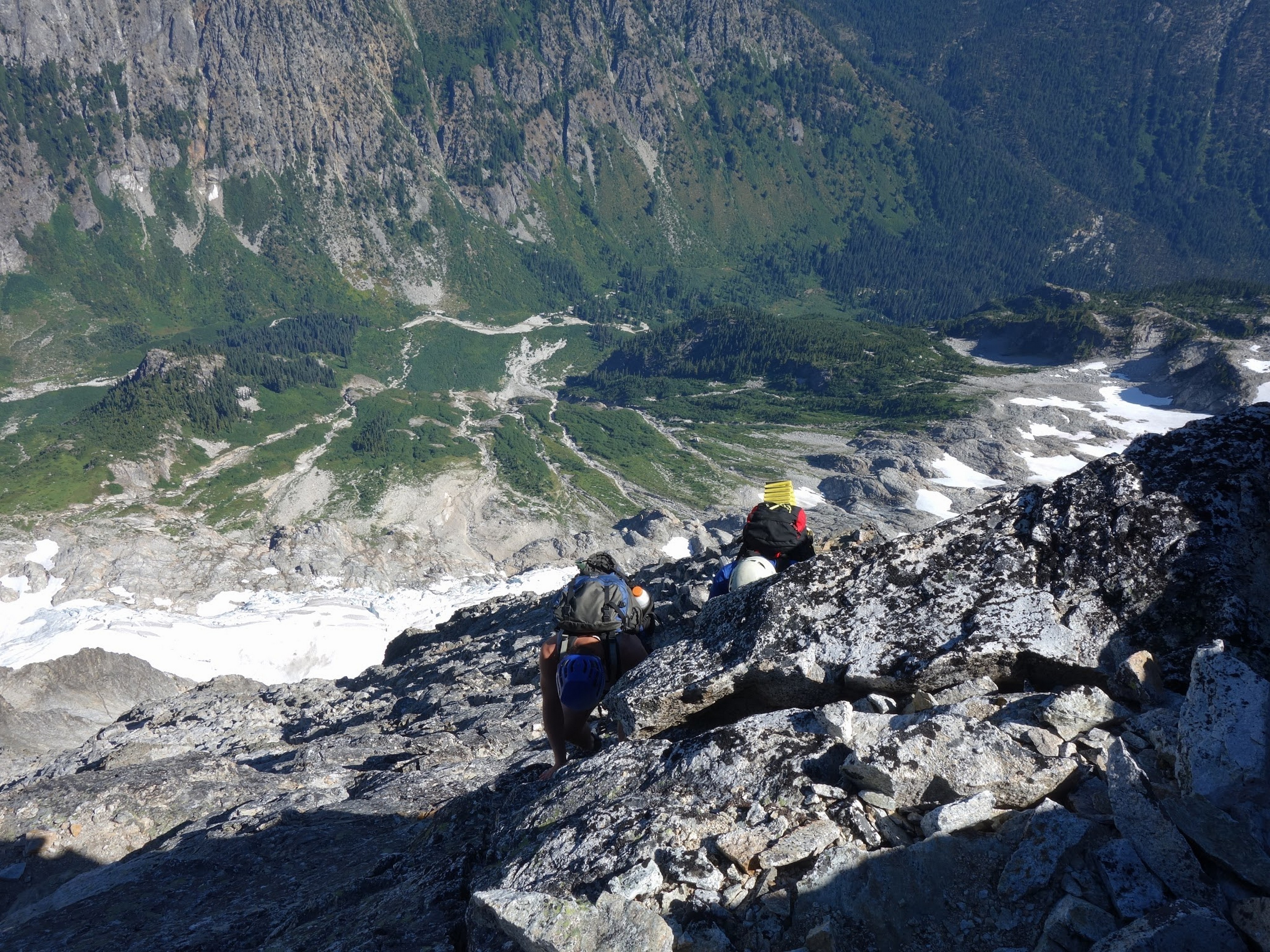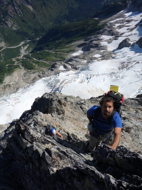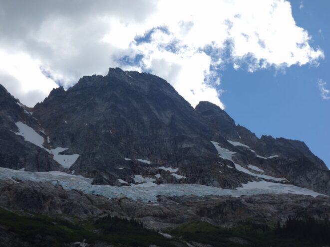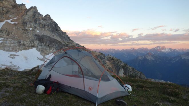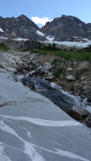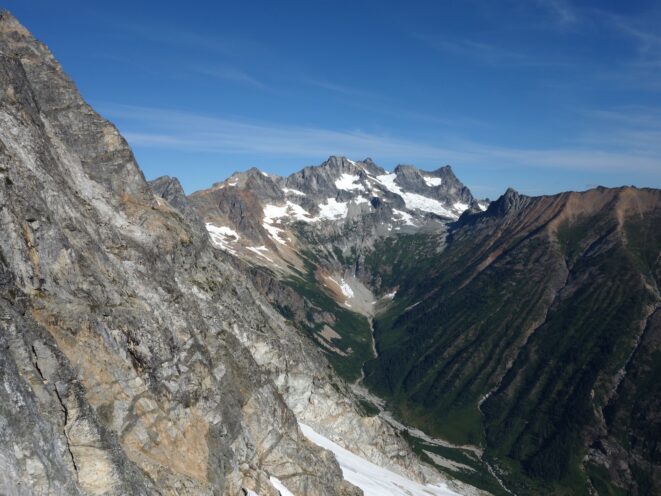We then scrambled up the slabs to the right of the waterfall and followed a decently beaten path through two short bushy sections. Once we emerged it was another 600 feet or so to the 5,500 foot bivy site right at the base of the cliffs just below the remaining glacier. We reached this awesome camp spot 30 minutes before sunset and there was just enough room to pitch my tent, while Josh slept under the stars in the smaller platform. Sunset over Mount Logan and Black Peak was a real treat and I probably took 50 pictures trying to get the perfect one while trying to eat dinner at the same time. By dark we were sleeping with a 6am alarm set.