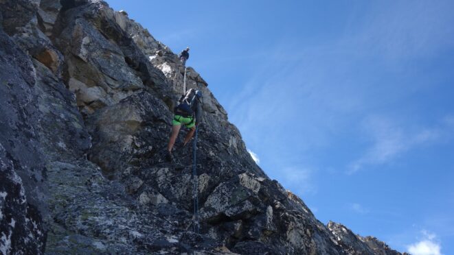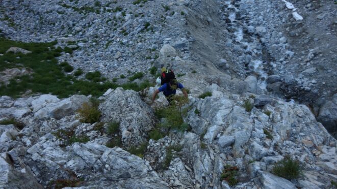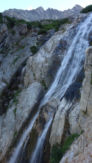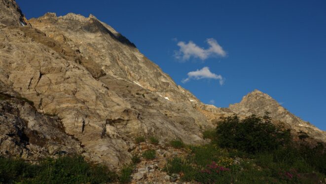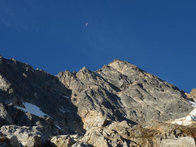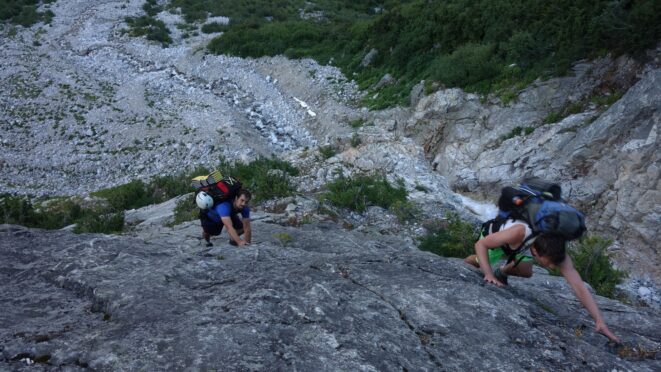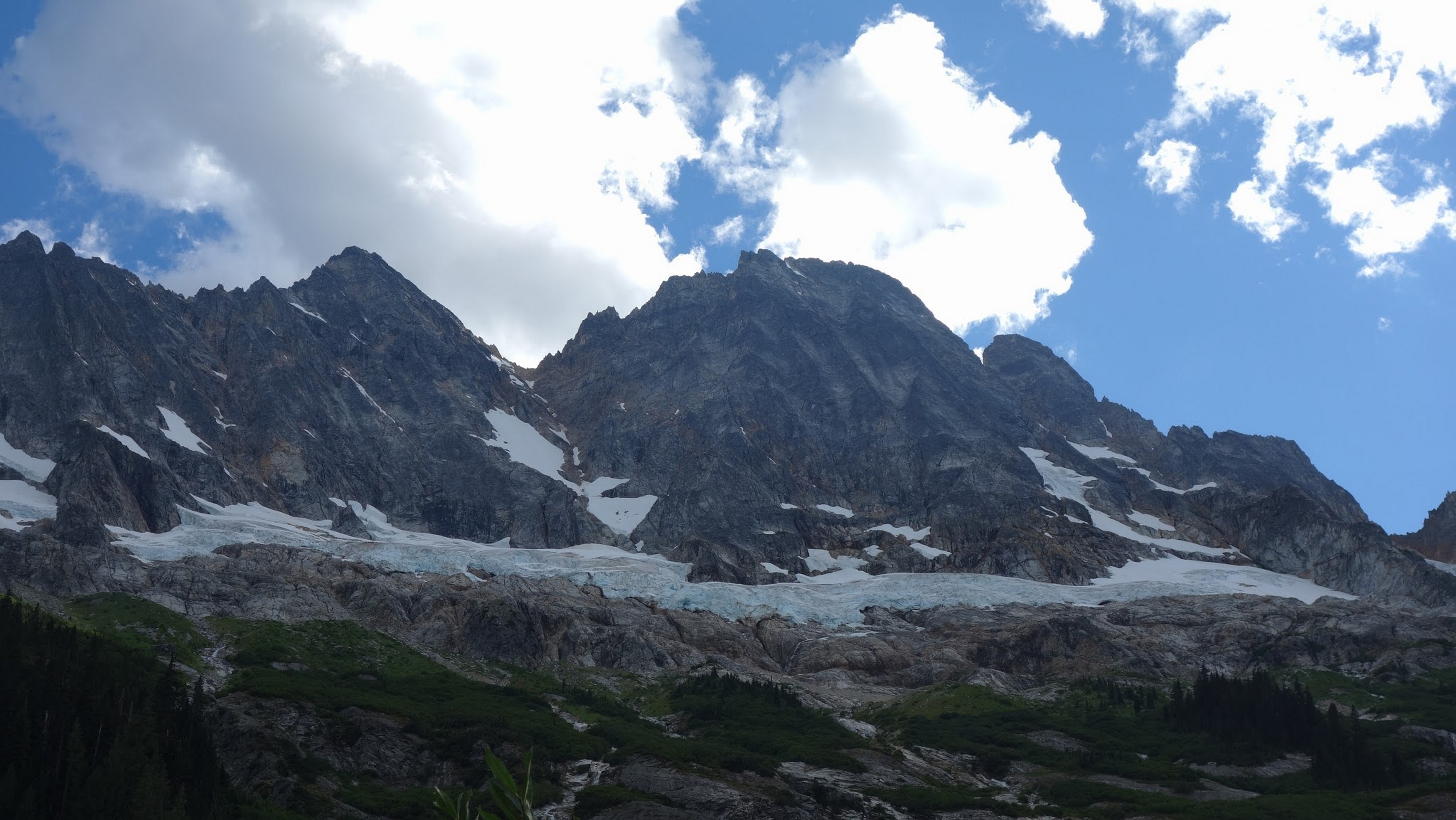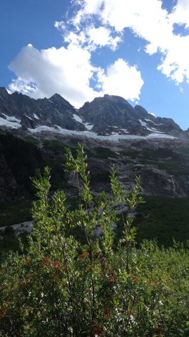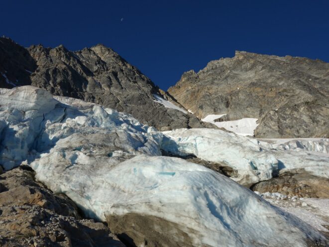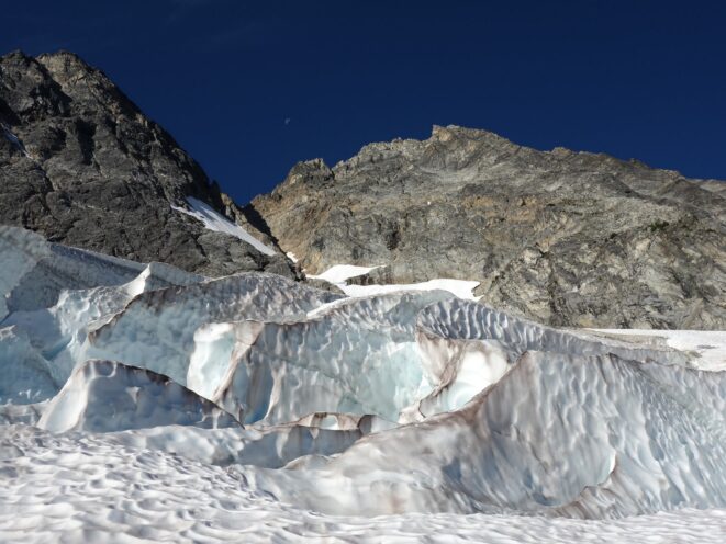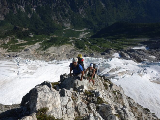 We then scrambled up the slabs to the right of the waterfall and followed a decently beaten path through two short bushy sections. Once we emerged it was another 600 feet or so to the 5,500 foot bivy site right at the base of the cliffs just below the remaining glacier. We reached this awesome camp spot 30 minutes before sunset and there was just enough room to pitch my tent, while Josh slept under the stars in the smaller platform. Sunset over Mount Logan and Black Peak was a real treat and I probably took 50 pictures trying to get the perfect one while trying to eat dinner at the same time. By dark we were sleeping with a 6am alarm set.