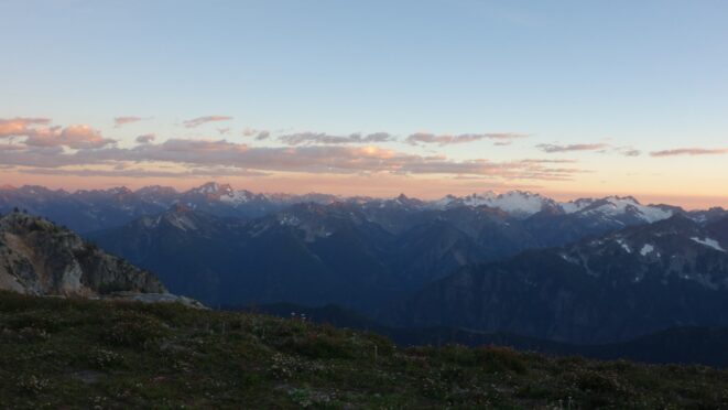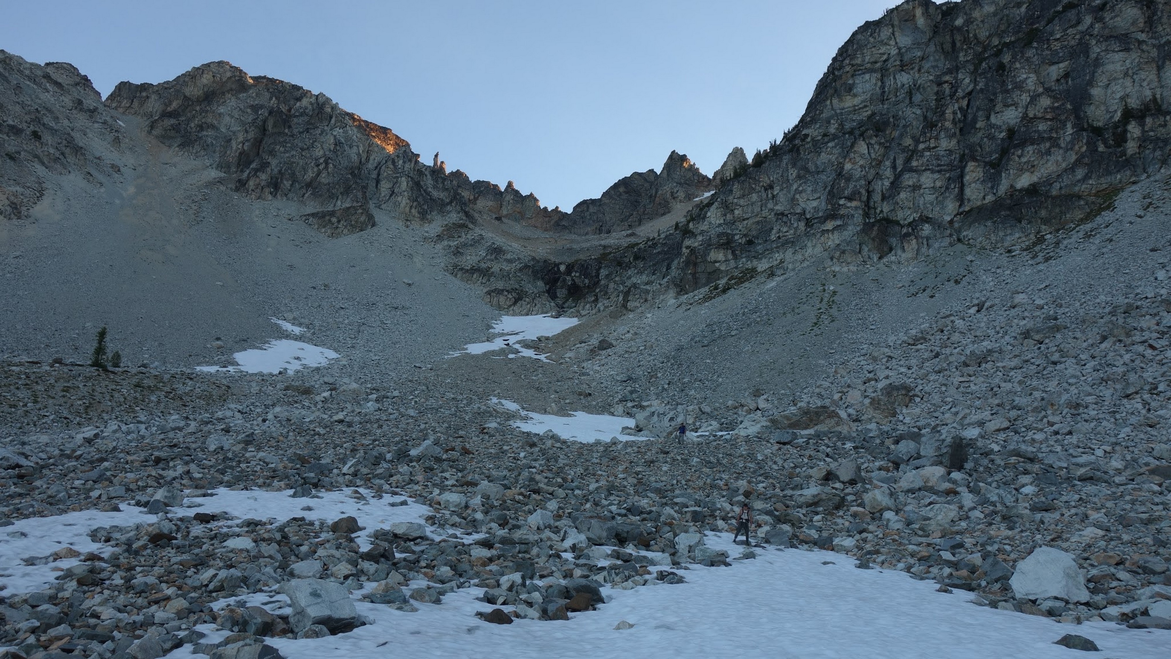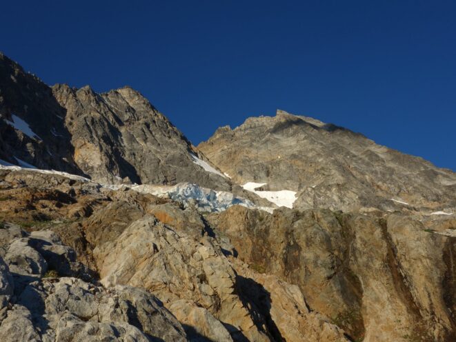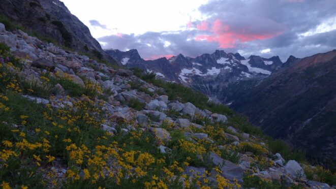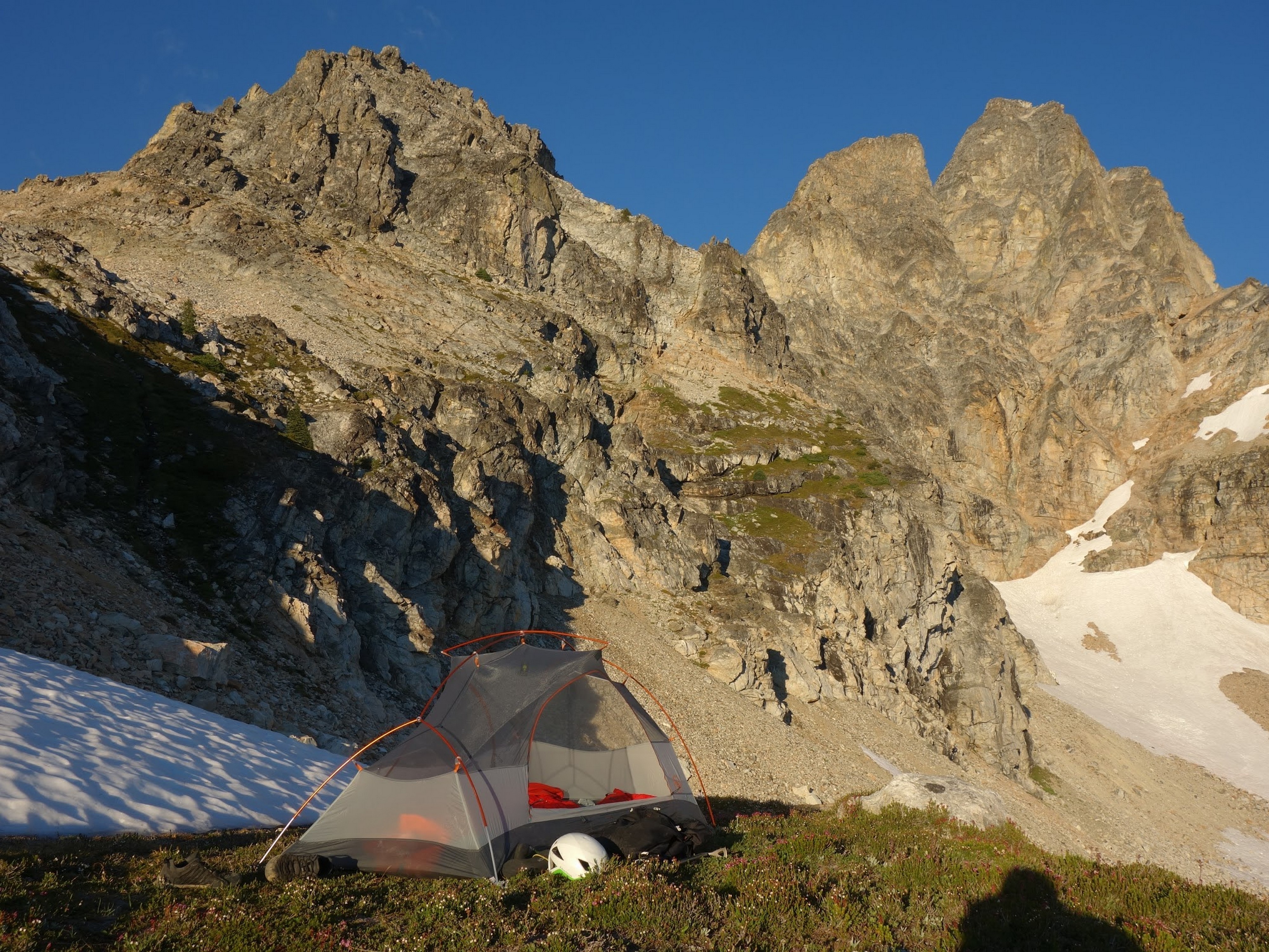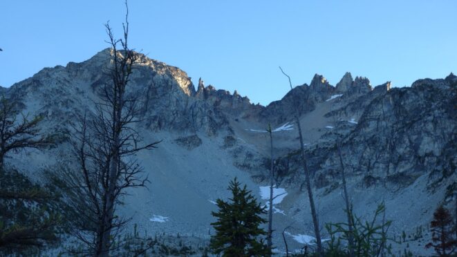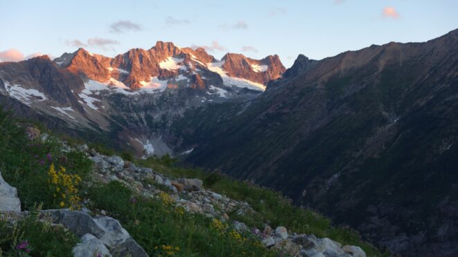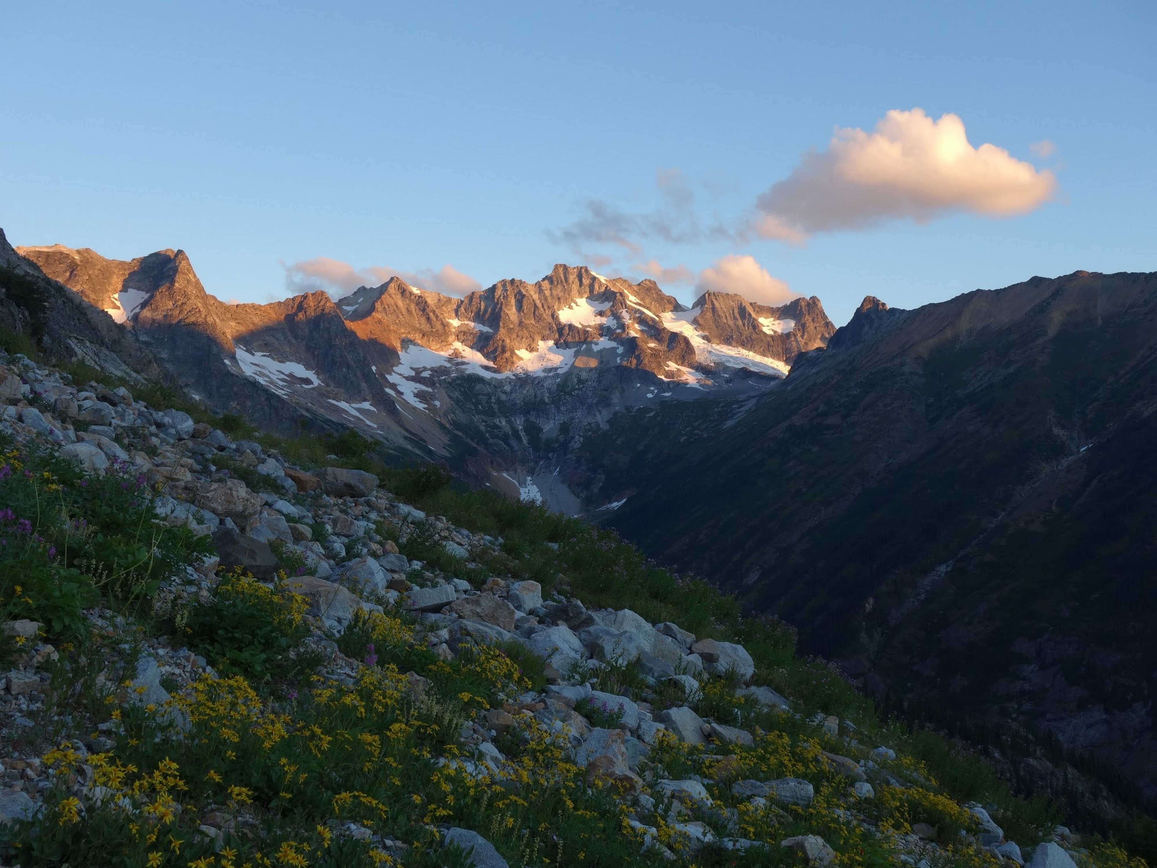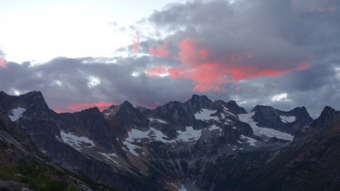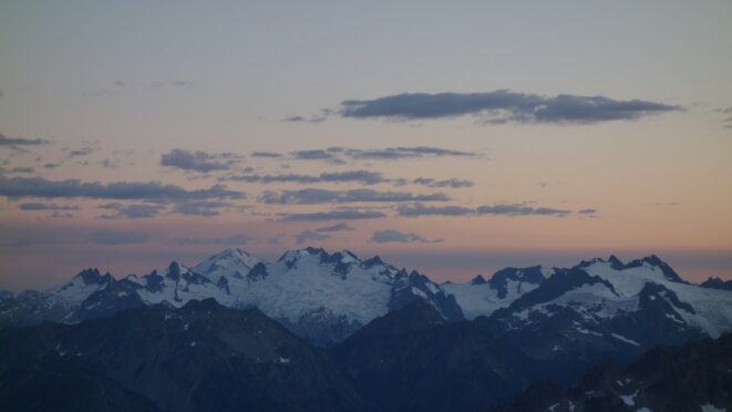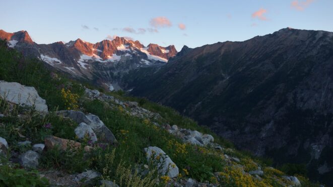 By around 6pm we started heading down and reached camp an hour later. Descending that talus wasn't fun so I took a route to skiers left onto some more solid rock and slabs. Again, we ate dinner to a beautiful sunset over Buckner, and the entire Glacier Peak Wilderness area. The last rays of light hitting Mount Goode directly above us was a real treat to witness!