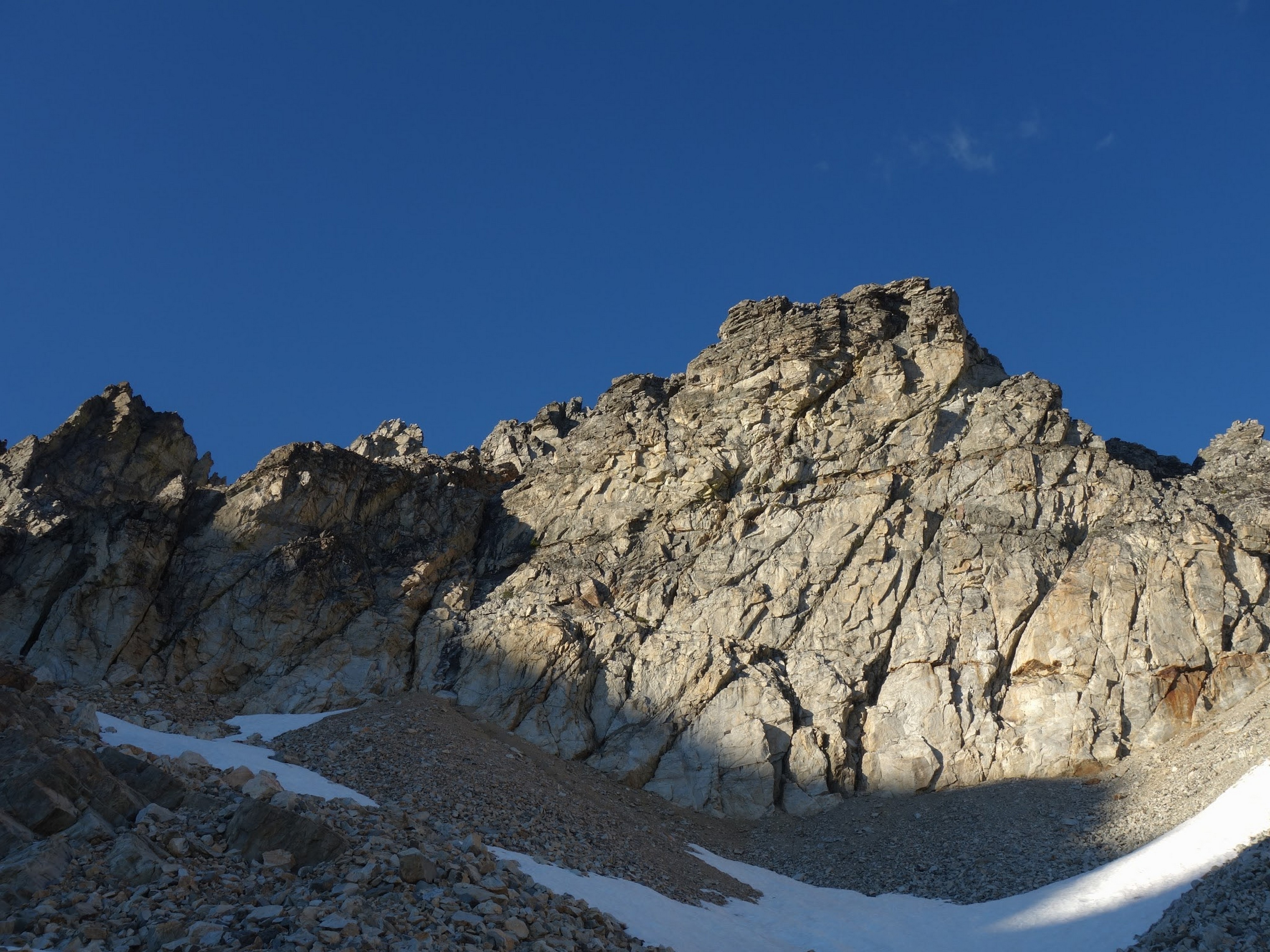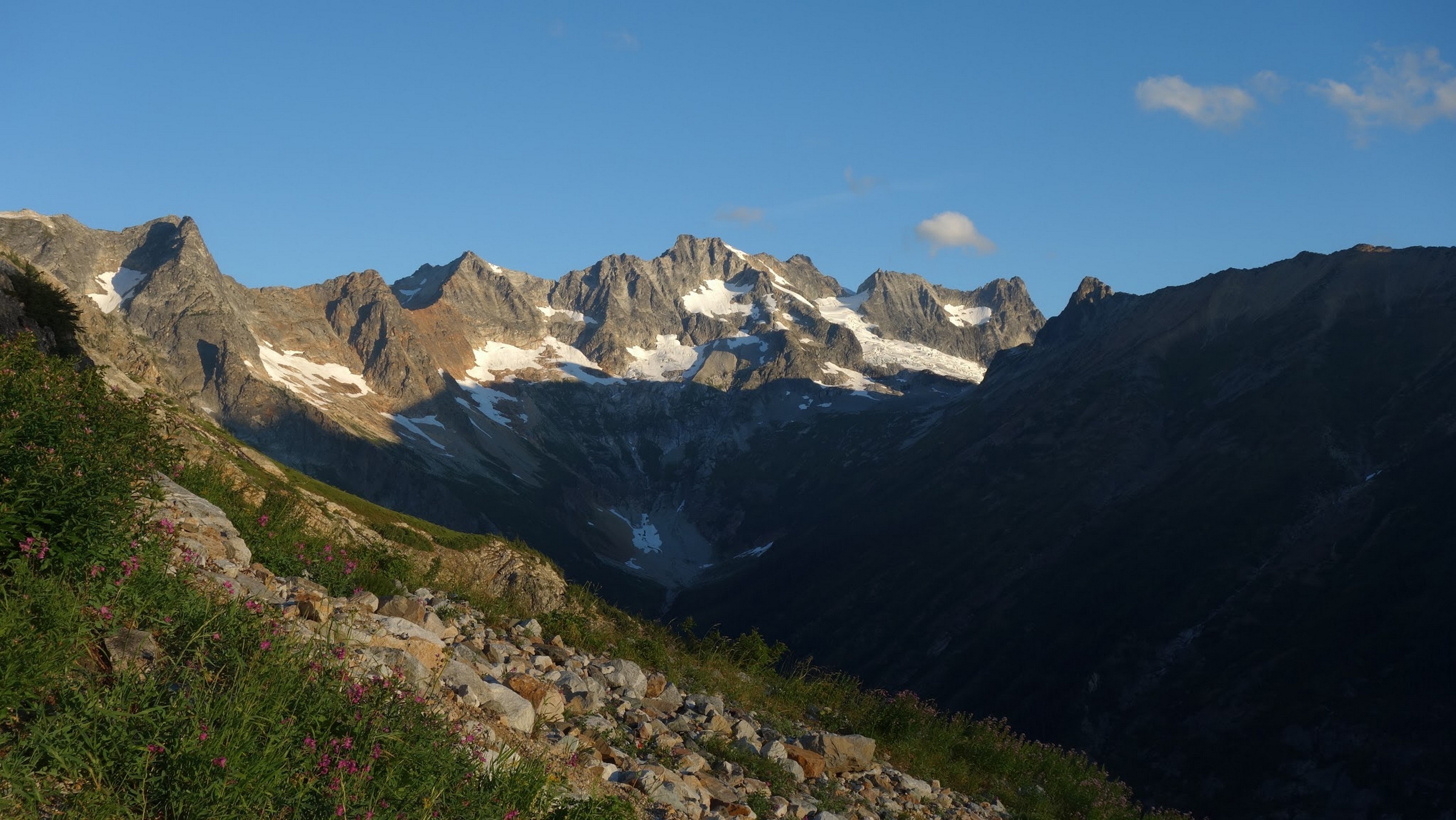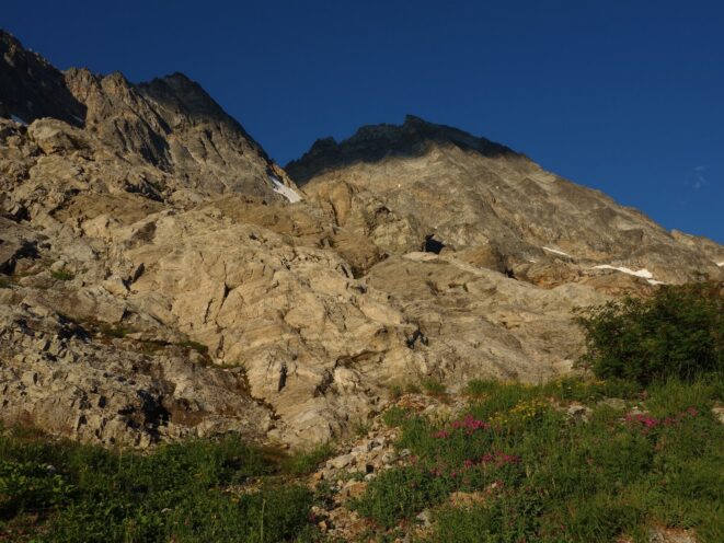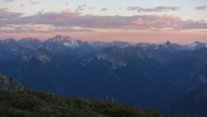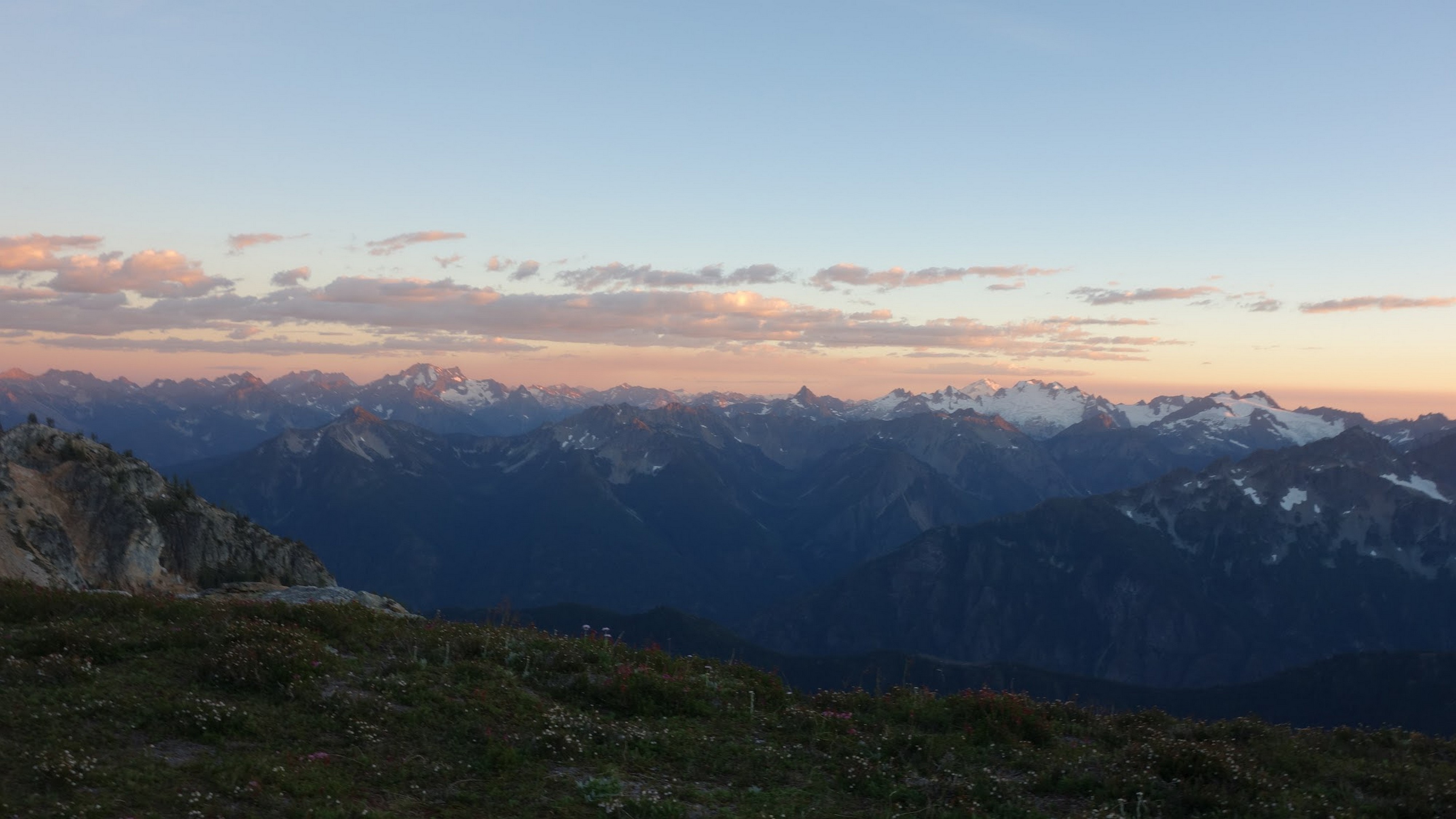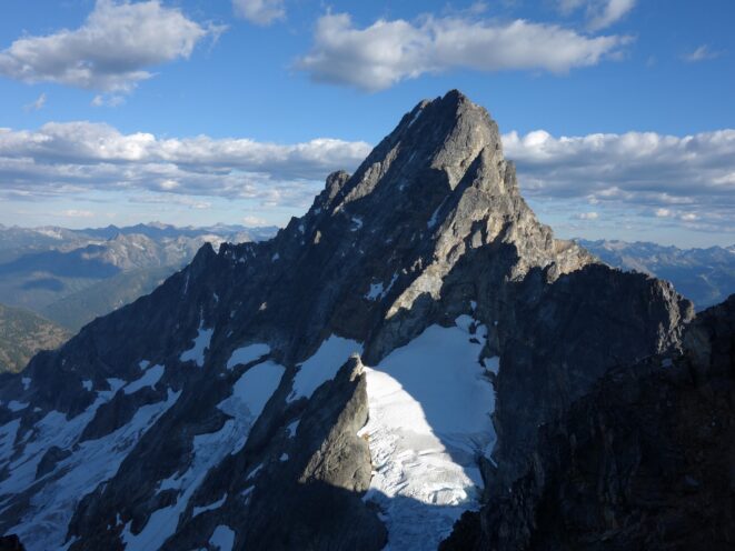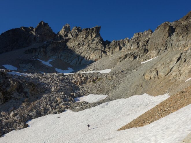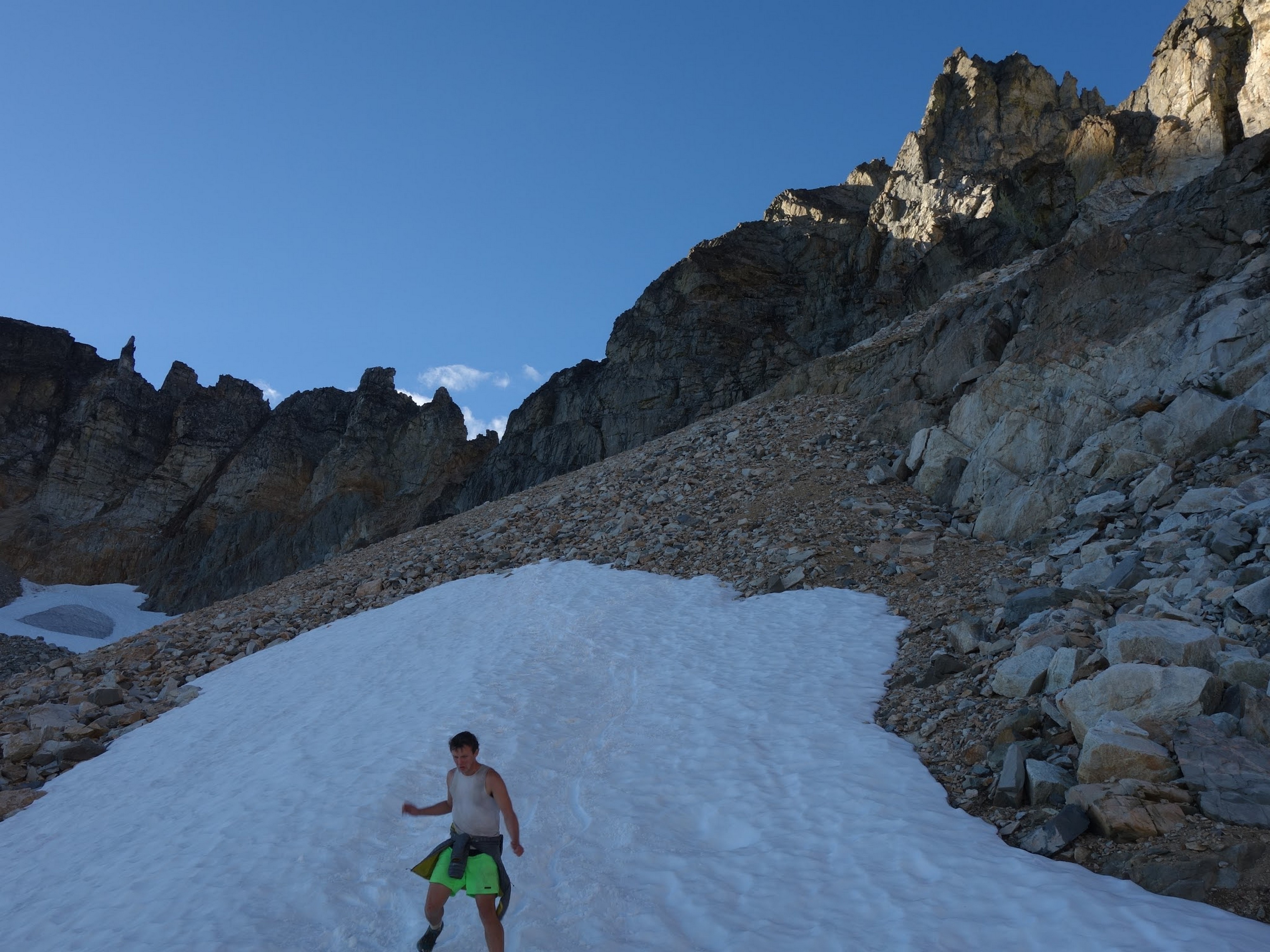 By around 6pm we started heading down and reached camp an hour later. Descending that talus wasn't fun so I took a route to skiers left onto some more solid rock and slabs. Again, we ate dinner to a beautiful sunset over Buckner, and the entire Glacier Peak Wilderness area. The last rays of light hitting Mount Goode directly above us was a real treat to witness!