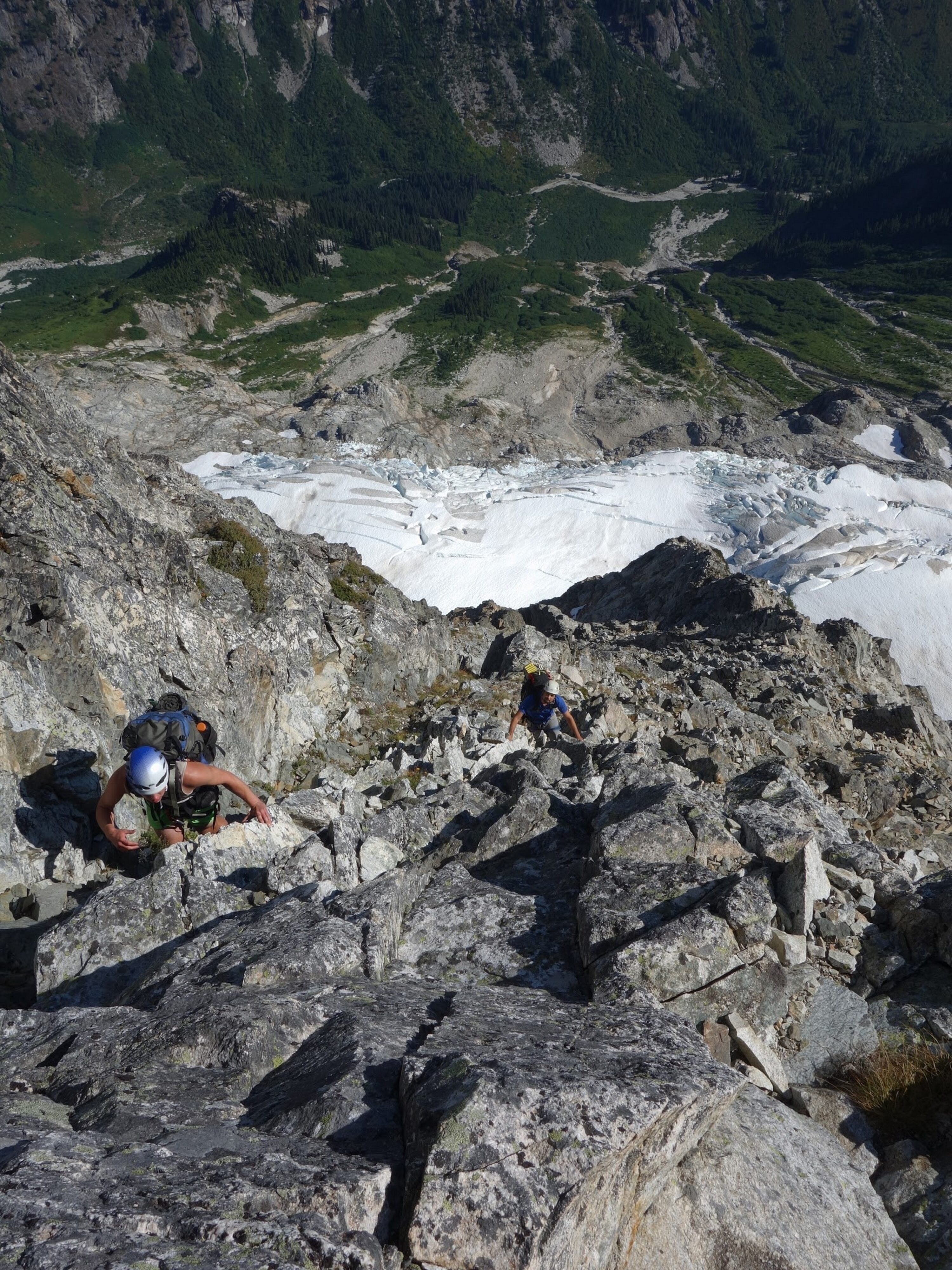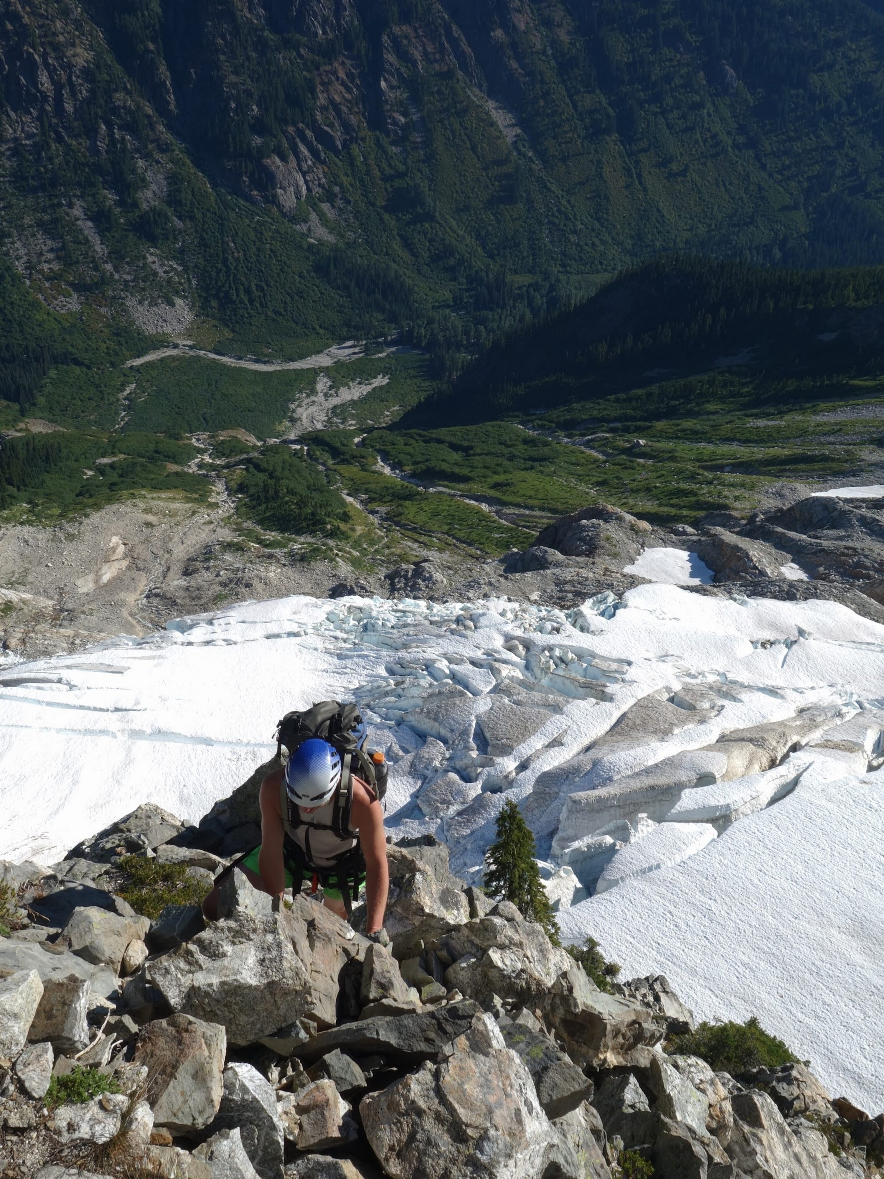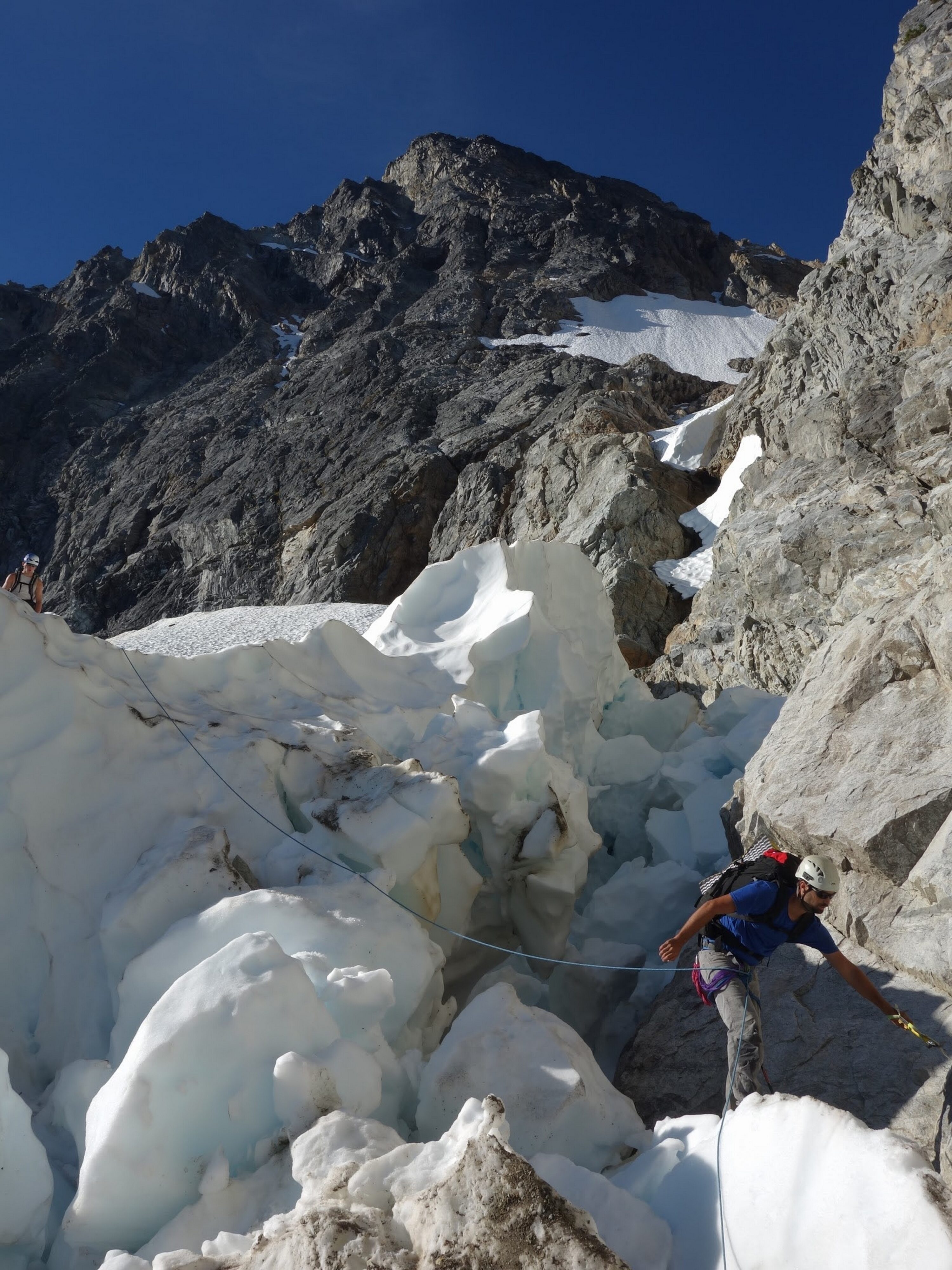 Just as the sun rose we sprang up and I woofed down 3 oatmeal packets. It didn't take long for us to start scrambling up the rocky slabs and reach the foot of the glacier. Utilizing a route topo from one of Stephs trip reports, I found the best way up the glacier which involved gaining the snow just to the right of the steep ice cliff and weaving left, then back right to pass around the large crevasses. It took bout 2 hours to reach he far right edge of the glacier from our camp and by 9am we were crossing the moat. This involved a delicate walk on large ice boulders that had fallen from the glacier and made a narrow bridge to the rock. With only microspikes on, we all carefully crossed one at a time utilizing our ice axes as support. When we all were safely on the rock, we put the rope away and began scrambling up a rightward traversing ledge, then a 50 foot low 5th class section to gain the NE buttress proper. We ended up soloing the entire route and reached the summit of Goode in 3 hours from when we crossed the moat, which included several large breaks to eat and enjoy the views! For the crux, which came about two-thirds the way up, I put my rock shoes on so i could continue soloing, otherwise I was comfortable climbing most of the route in my tennis shoes. Very solid and enjoyable rock. Just below the summit we passed by the bivy site that has been used by other parties in the past. Once on top, the views were astounding and the summit camp was probably one of the best spots to camp I have ever seen. Too bad it was only 1pm so we planned to continue on to Storm King the same day.