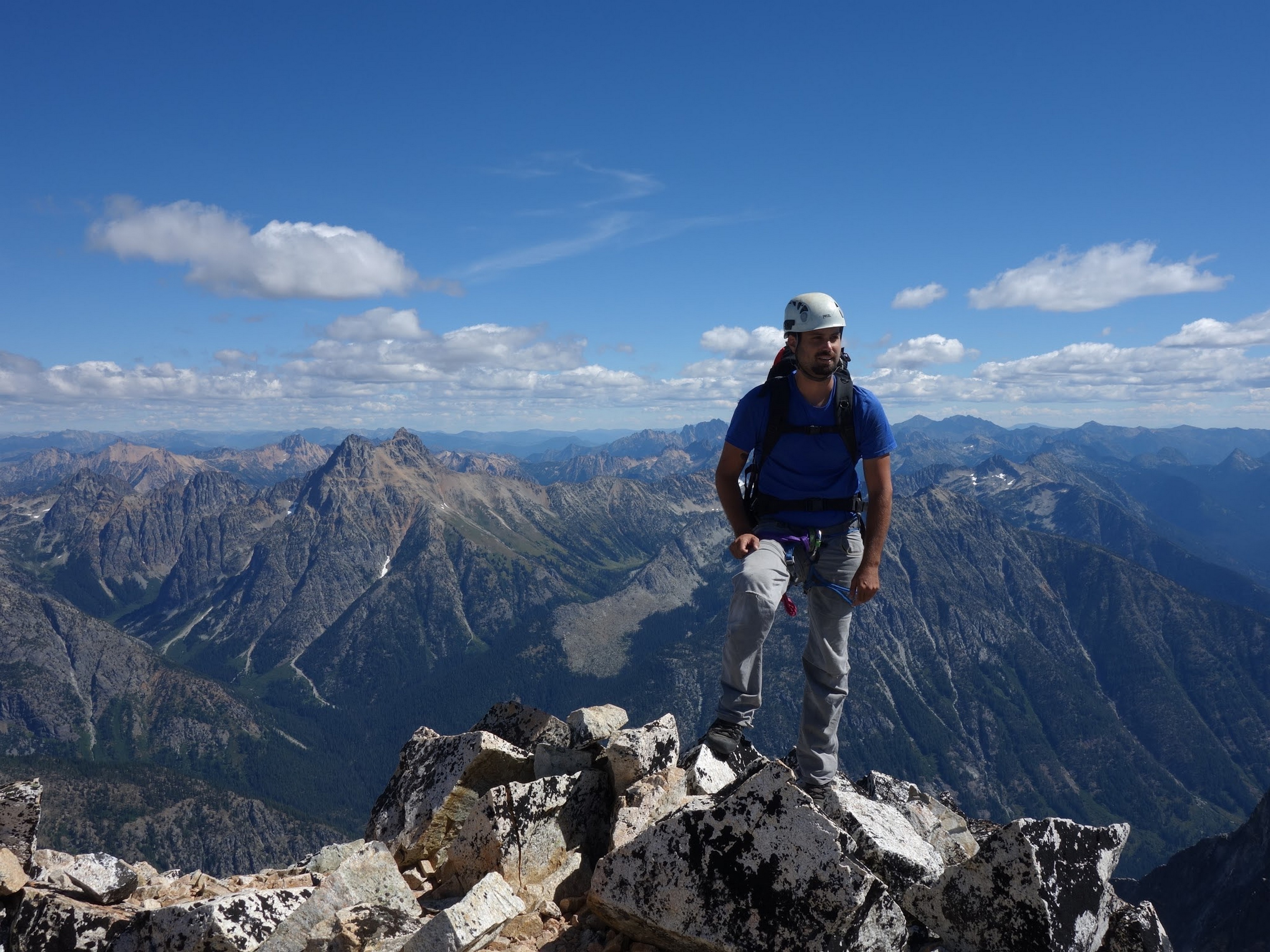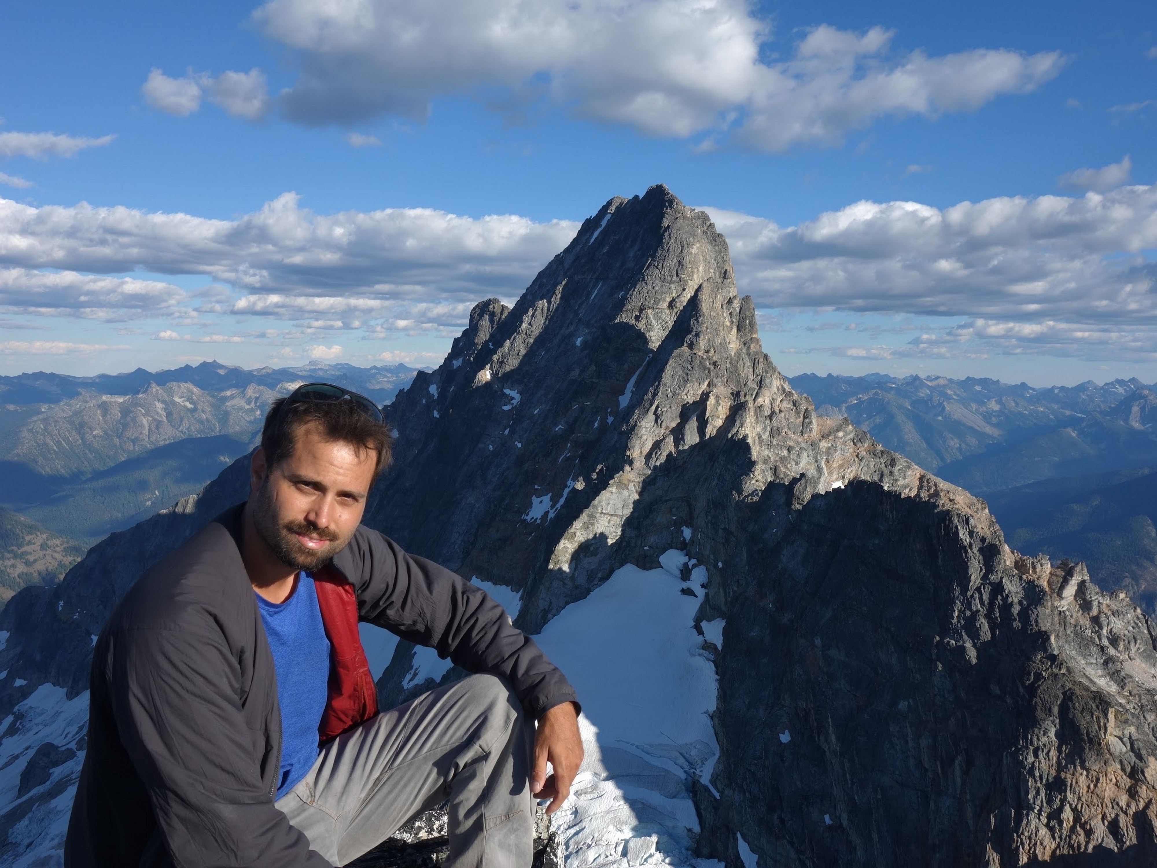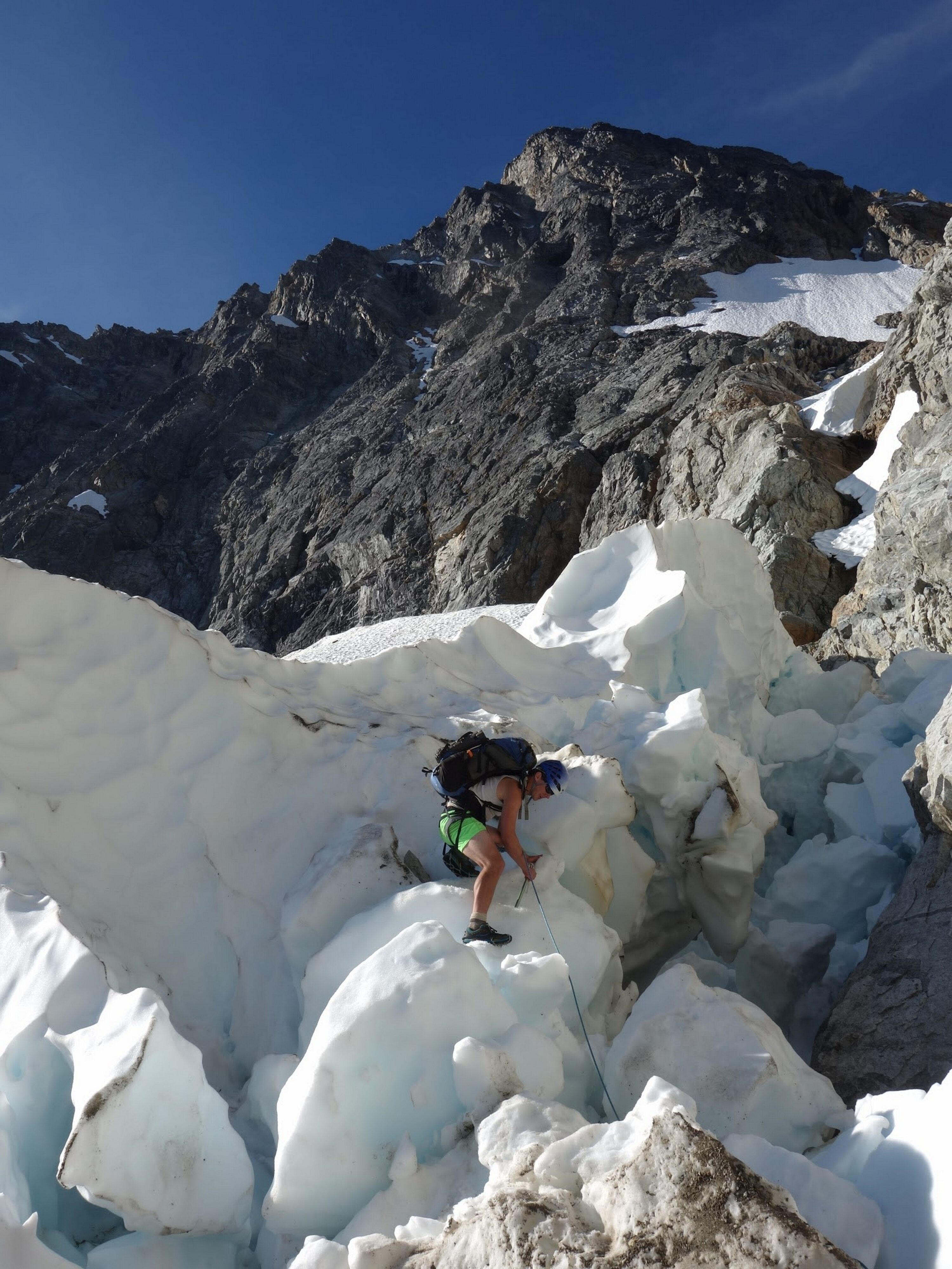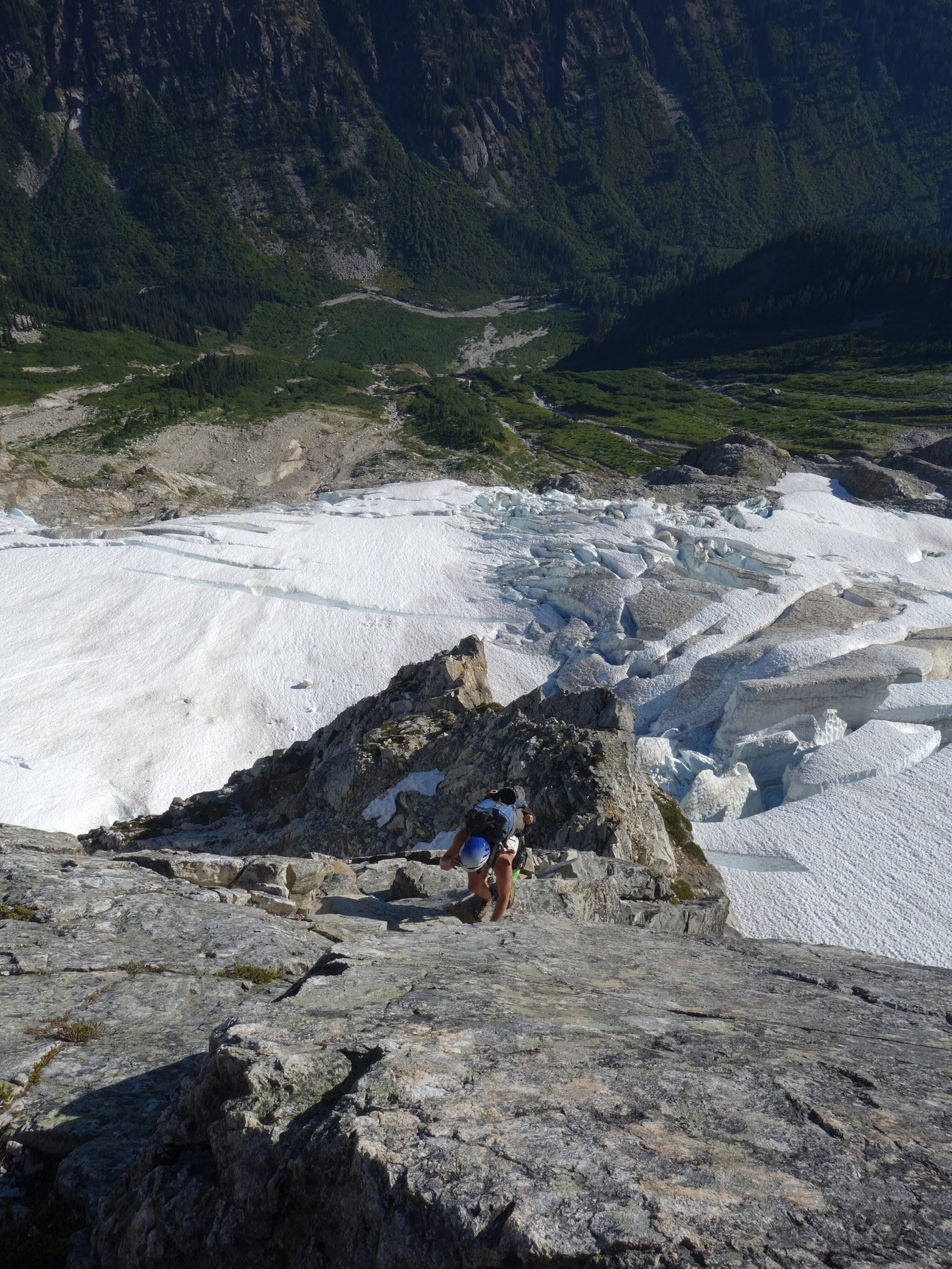 Just as the sun rose we sprang up and I woofed down 3 oatmeal packets. It didn't take long for us to start scrambling up the rocky slabs and reach the foot of the glacier. Utilizing a route topo from one of Stephs trip reports, I found the best way up the glacier which involved gaining the snow just to the right of the steep ice cliff and weaving left, then back right to pass around the large crevasses. It took bout 2 hours to reach he far right edge of the glacier from our camp and by 9am we were crossing the moat. This involved a delicate walk on large ice boulders that had fallen from the glacier and made a narrow bridge to the rock. With only microspikes on, we all carefully crossed one at a time utilizing our ice axes as support. When we all were safely on the rock, we put the rope away and began scrambling up a rightward traversing ledge, then a 50 foot low 5th class section to gain the NE buttress proper. We ended up soloing the entire route and reached the summit of Goode in 3 hours from when we crossed the moat, which included several large breaks to eat and enjoy the views! For the crux, which came about two-thirds the way up, I put my rock shoes on so i could continue soloing, otherwise I was comfortable climbing most of the route in my tennis shoes. Very solid and enjoyable rock. Just below the summit we passed by the bivy site that has been used by other parties in the past. Once on top, the views were astounding and the summit camp was probably one of the best spots to camp I have ever seen. Too bad it was only 1pm so we planned to continue on to Storm King the same day.