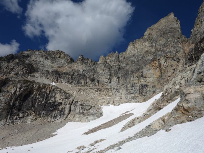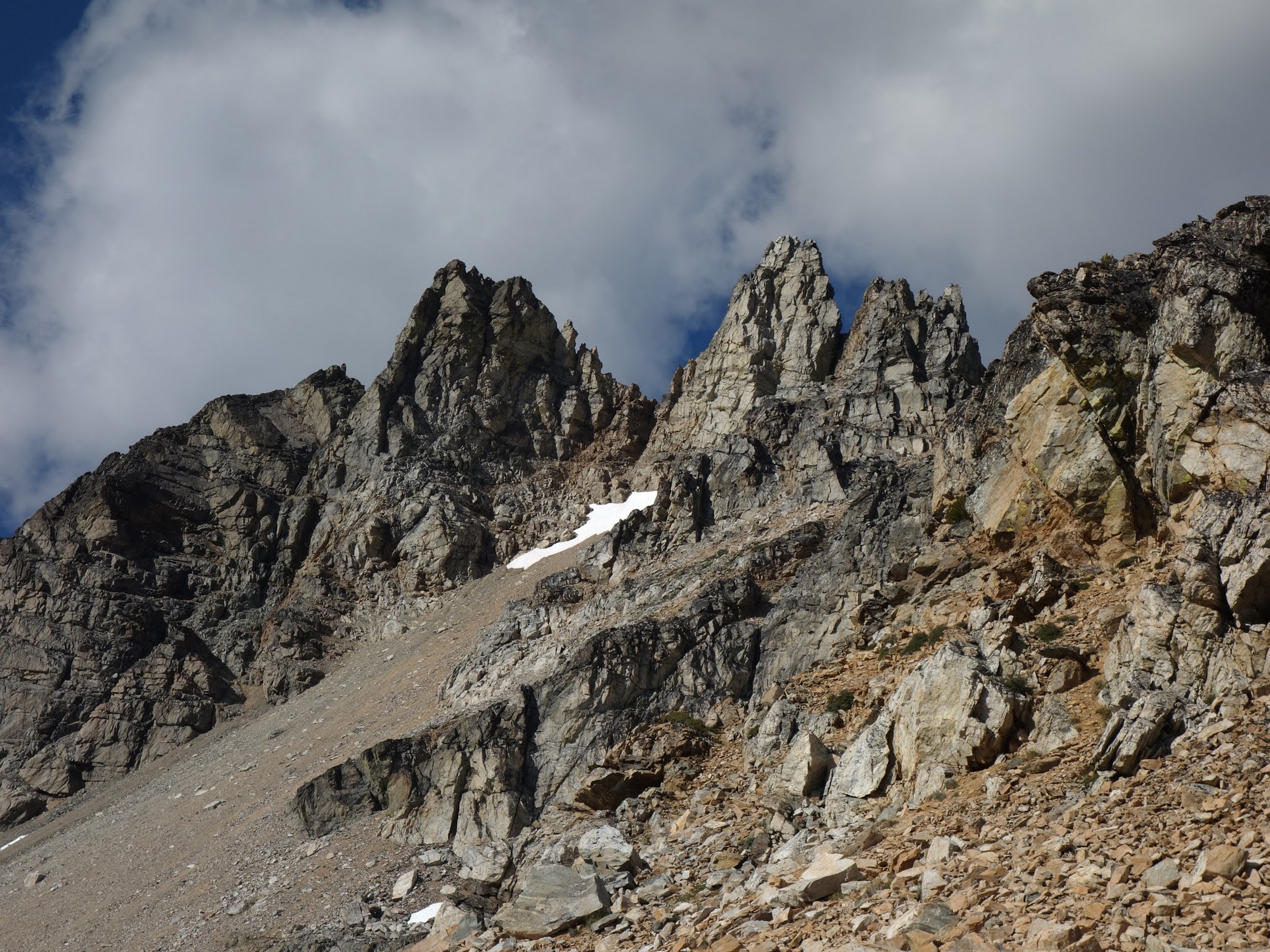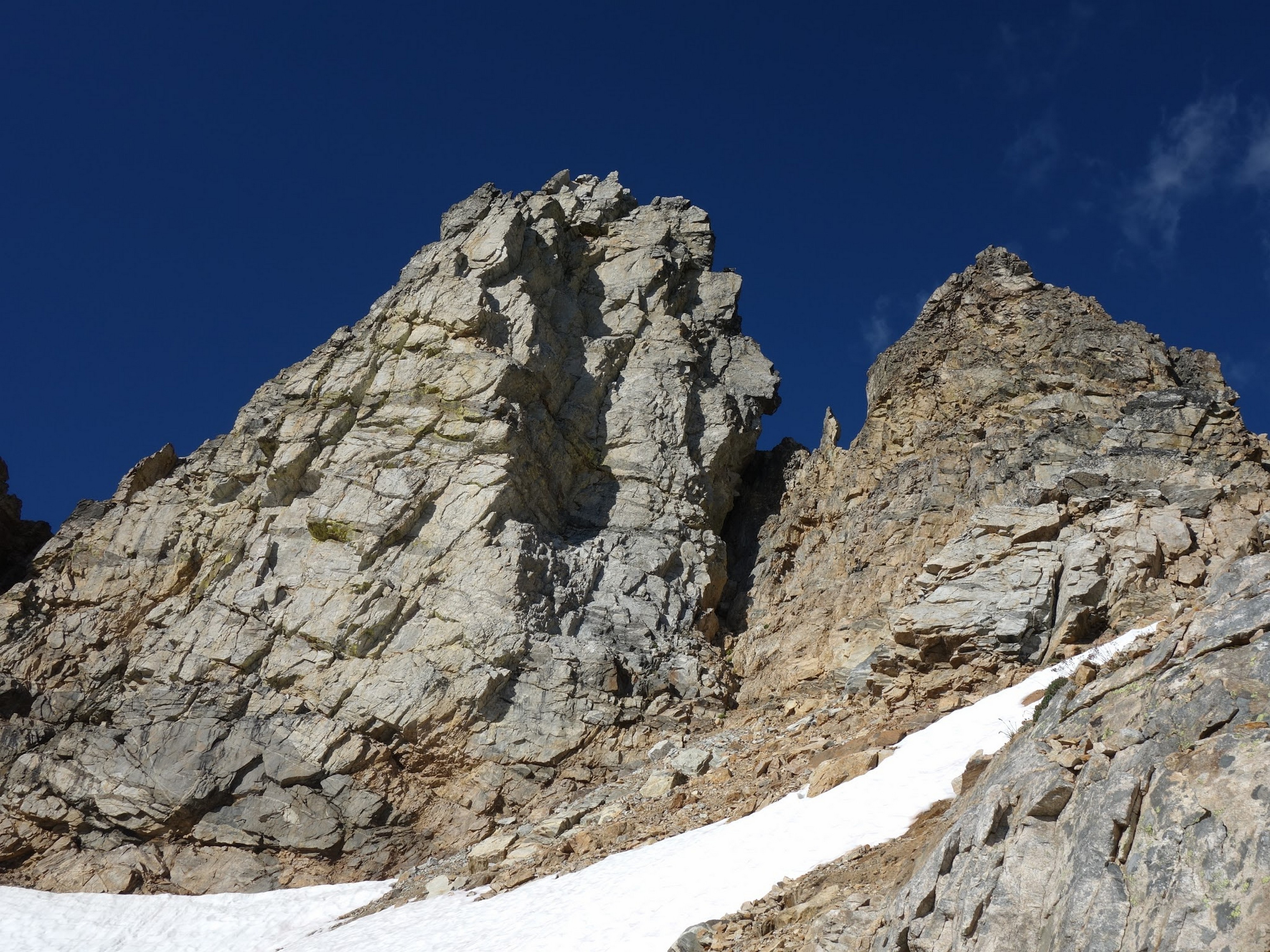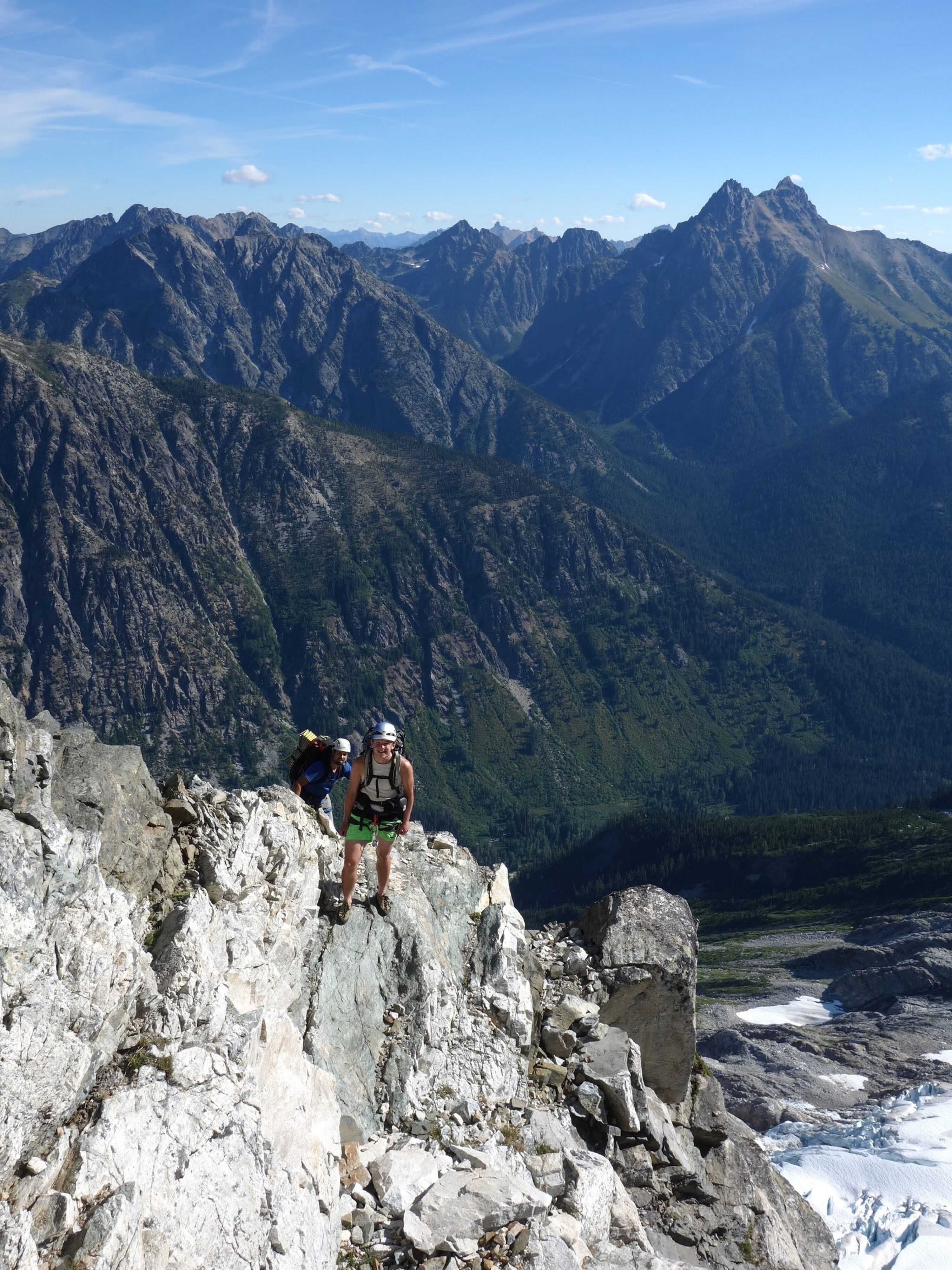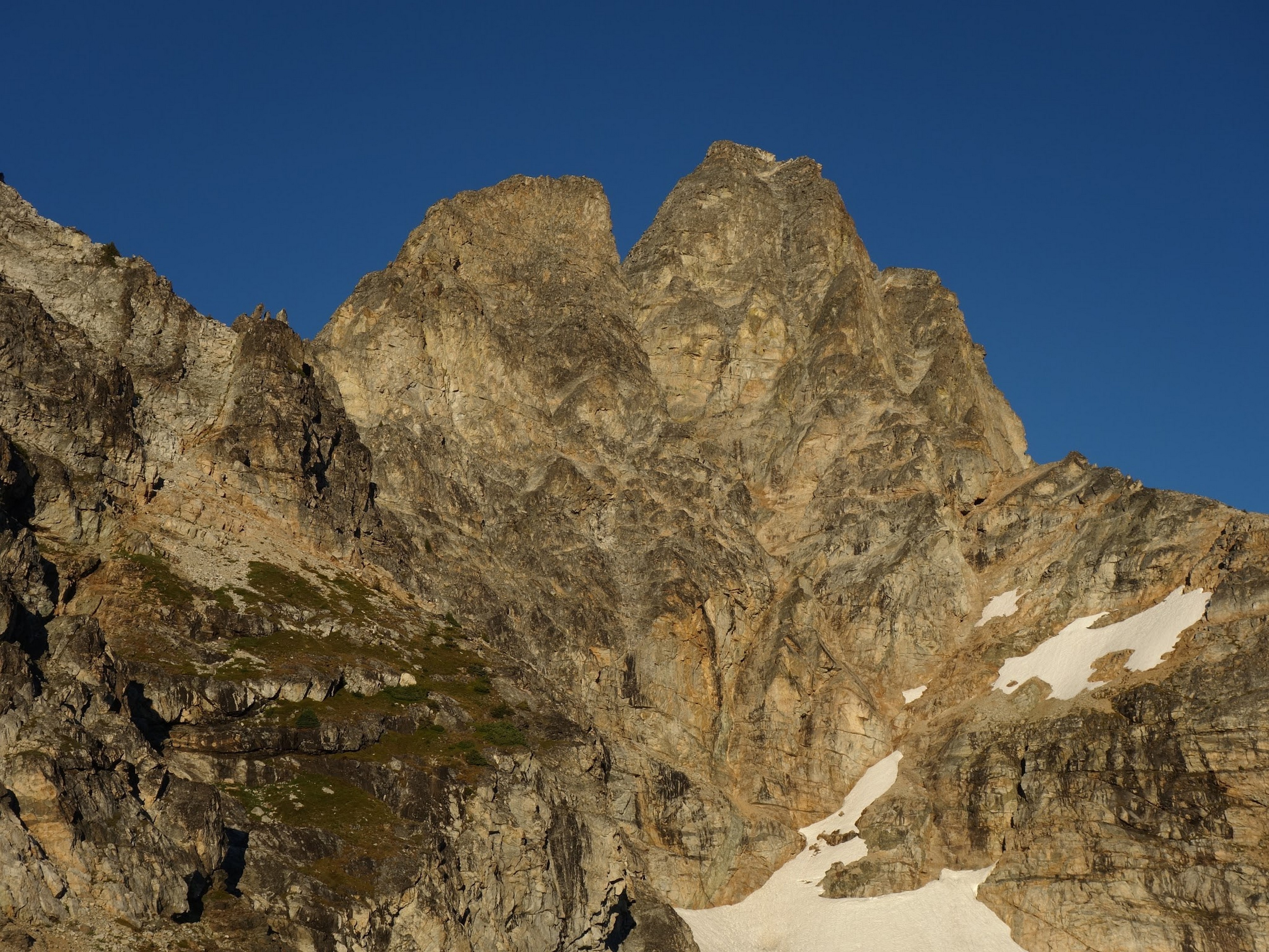 Once we had our fill of views and summit snacks (I had a dozen cookies or so!), we rappelled three times down the NE side (what we just climbed) and reached the ledge that leads to the Black Tooth Notch. We traversed this easy but exposed ledge to the notch and made two more rappels at which point the SW couloir gully opened up and we could scramble down the remainder of the way to the open basin at 7,600 feet. Here we crossed an easy snowfield providing quicker passage, and found some running water to fill our bottles (we were thirsty, as we didn't carry much up the route). We started making a mostly level traverse to the northwest crossing a small basin and found an excellent camp spot on the small NE/SW trending rib just south of Storm King, complete with flat grass, water, and incredible views at 7,500 feet! So we dropped the packs here and started the short 1000 foot ascent to Storm King. Most of the route up to the right-most notch was on crappy scree and talus, but once we crossed over to the north side there was a fun ledge traverse, followed by some 4th class scrambling up the north side of the highest tower to the summit. By far the best part of this peak is the view you get of Mount Goode.