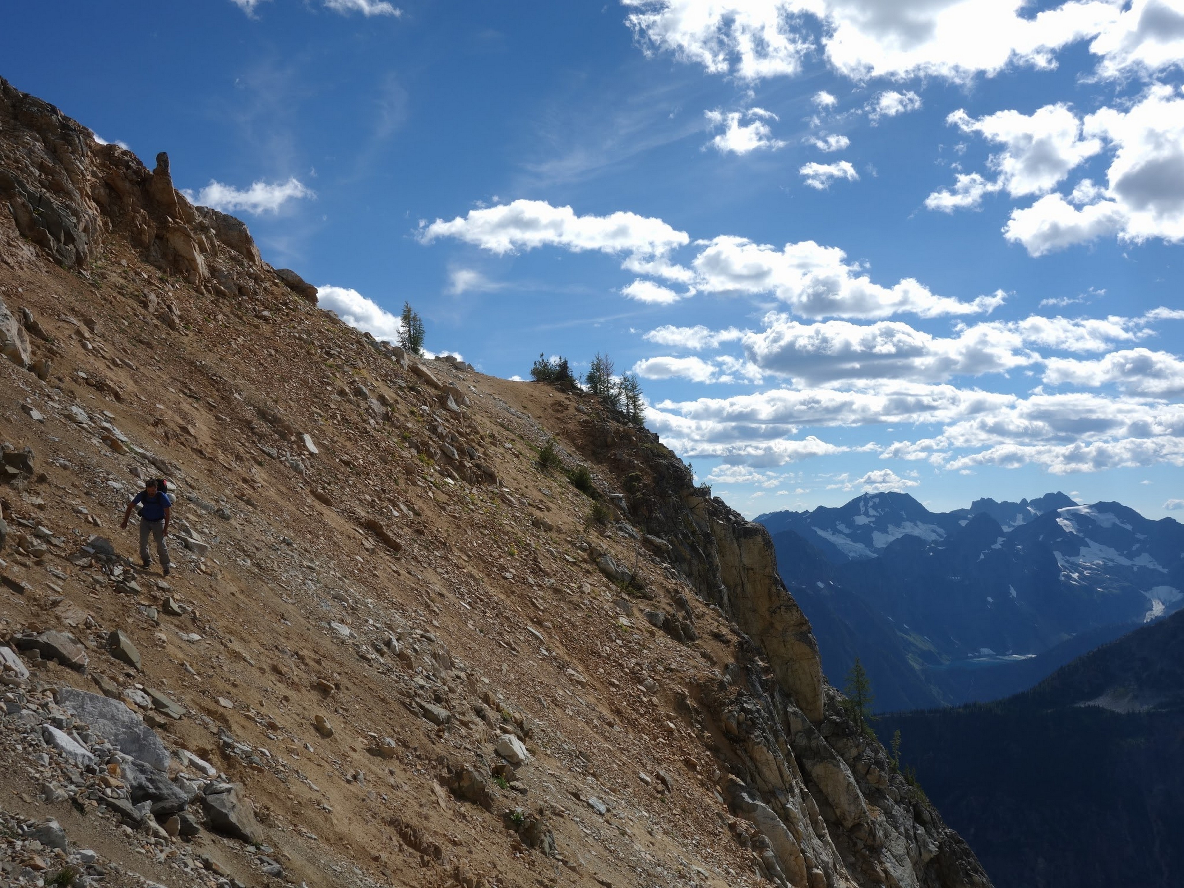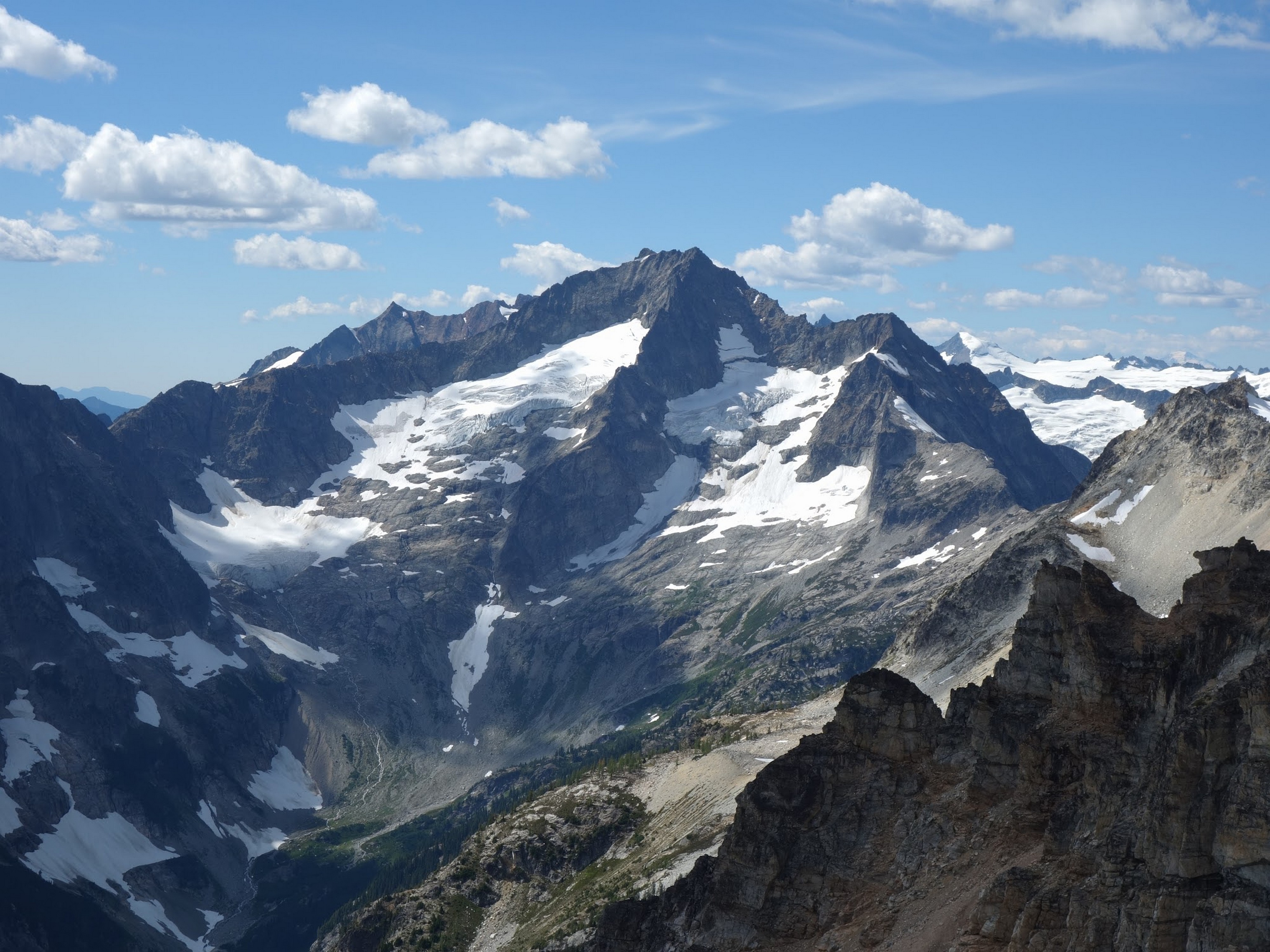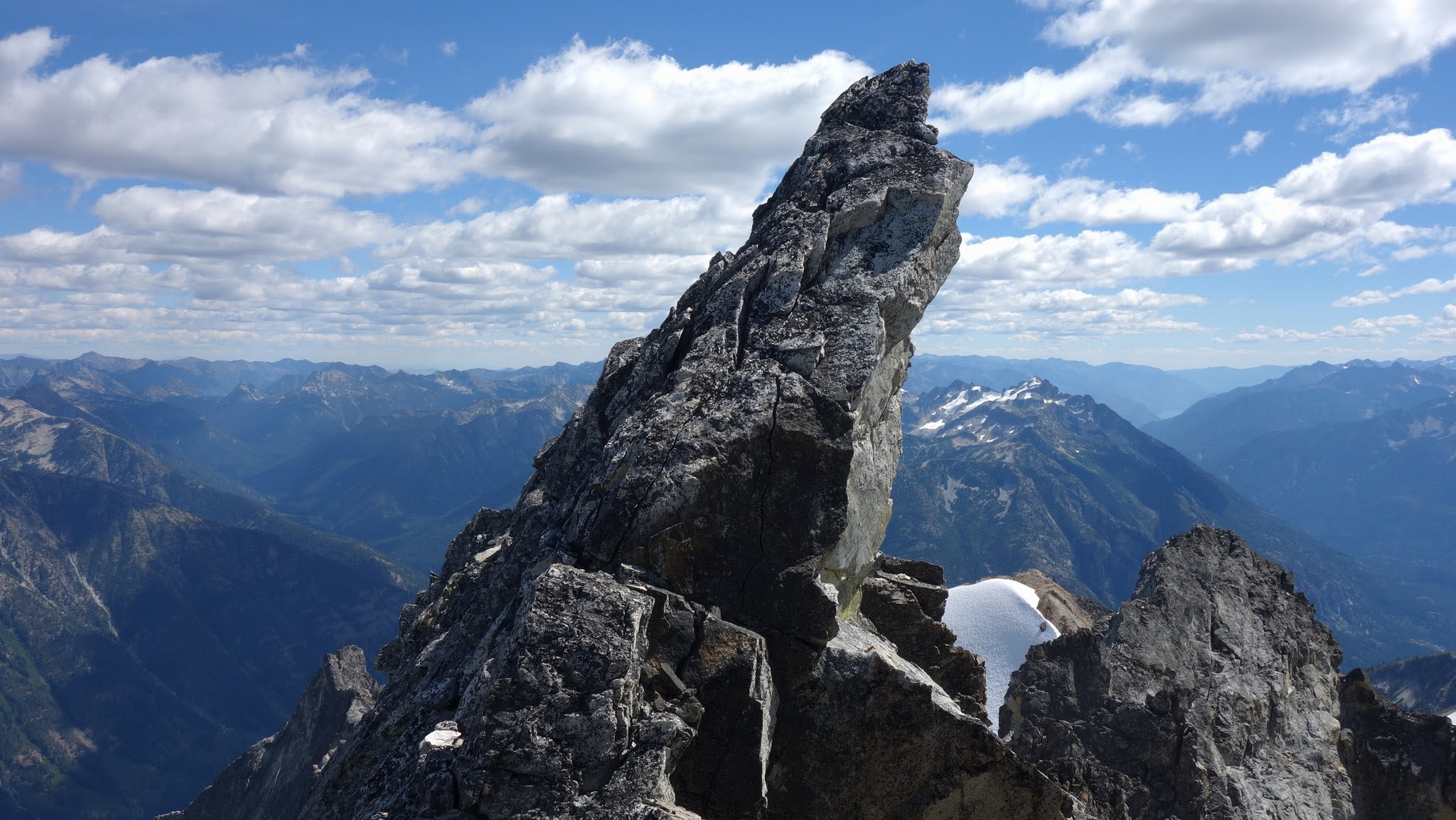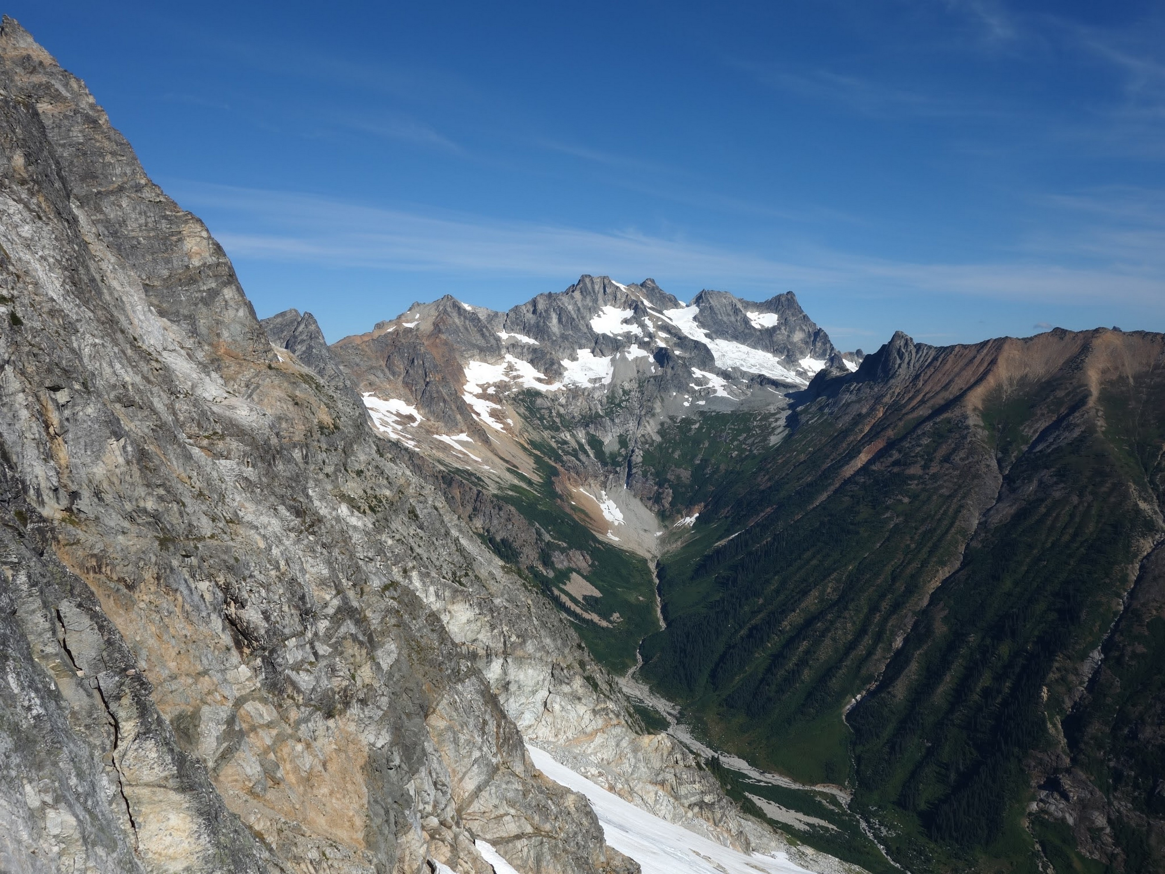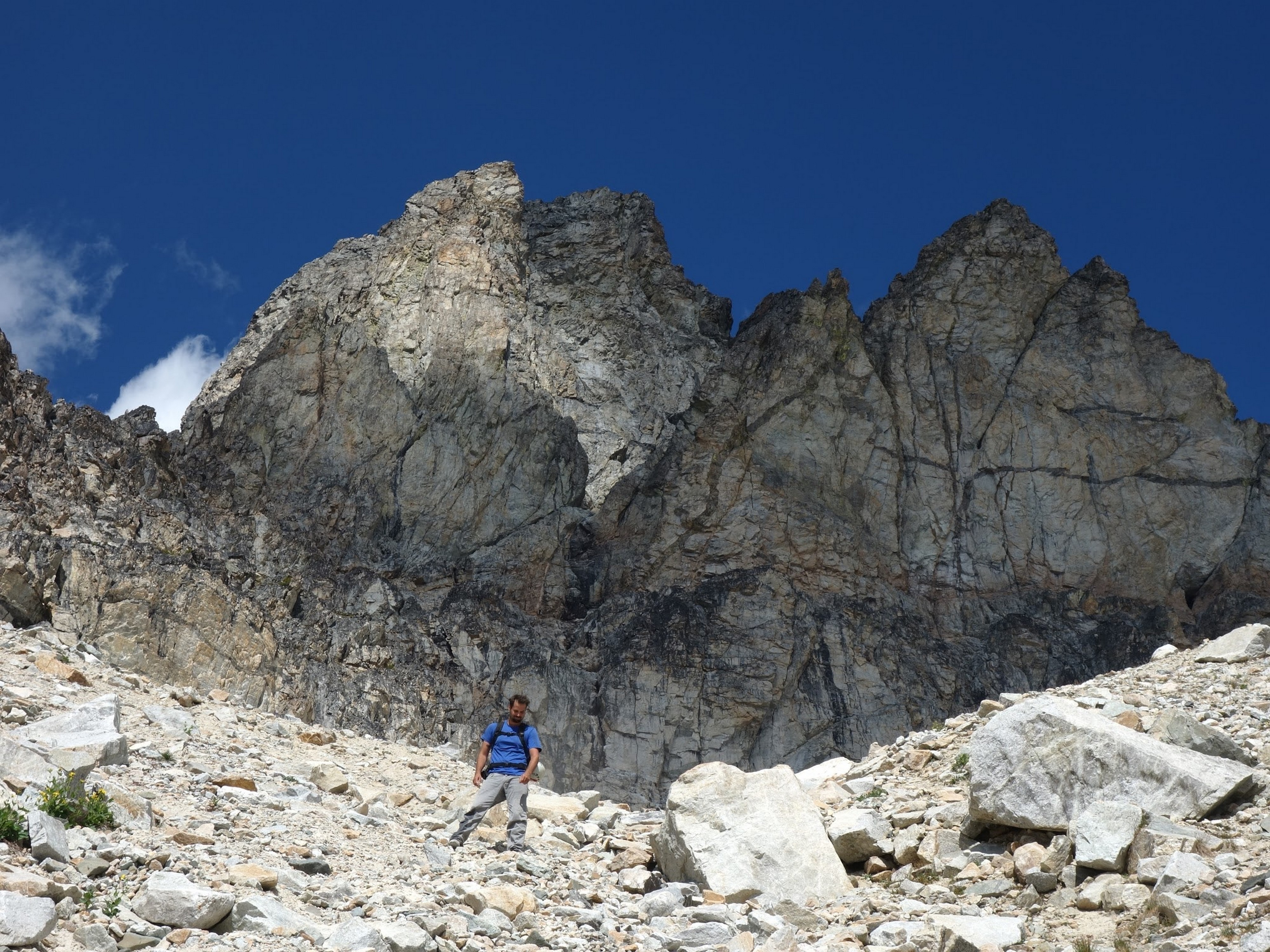 Once we had our fill of views and summit snacks (I had a dozen cookies or so!), we rappelled three times down the NE side (what we just climbed) and reached the ledge that leads to the Black Tooth Notch. We traversed this easy but exposed ledge to the notch and made two more rappels at which point the SW couloir gully opened up and we could scramble down the remainder of the way to the open basin at 7,600 feet. Here we crossed an easy snowfield providing quicker passage, and found some running water to fill our bottles (we were thirsty, as we didn't carry much up the route). We started making a mostly level traverse to the northwest crossing a small basin and found an excellent camp spot on the small NE/SW trending rib just south of Storm King, complete with flat grass, water, and incredible views at 7,500 feet! So we dropped the packs here and started the short 1000 foot ascent to Storm King. Most of the route up to the right-most notch was on crappy scree and talus, but once we crossed over to the north side there was a fun ledge traverse, followed by some 4th class scrambling up the north side of the highest tower to the summit. By far the best part of this peak is the view you get of Mount Goode.