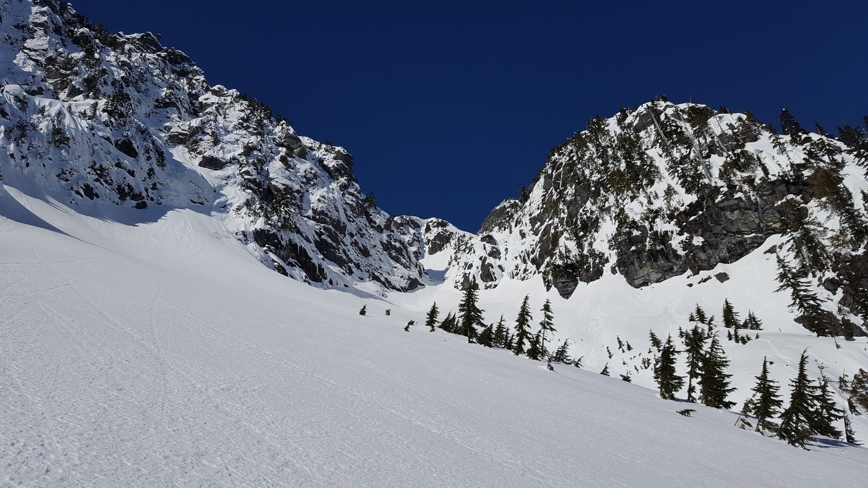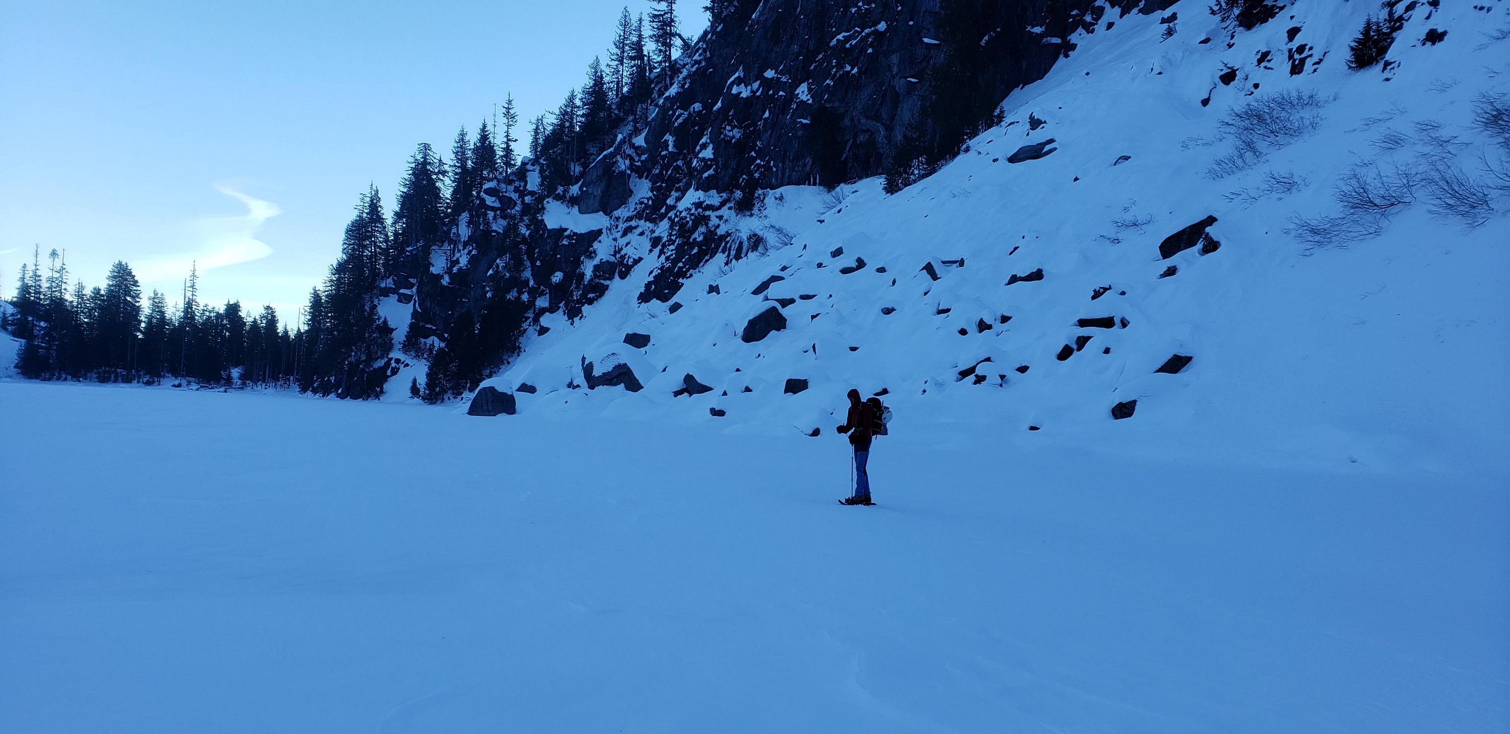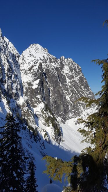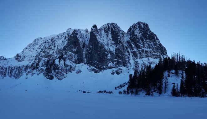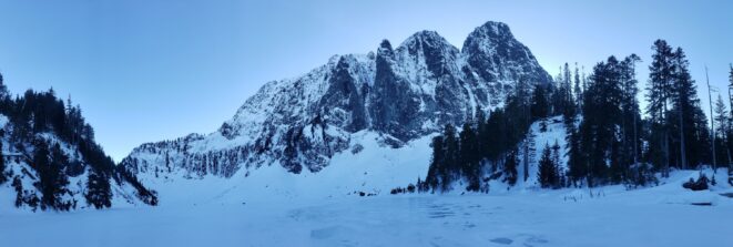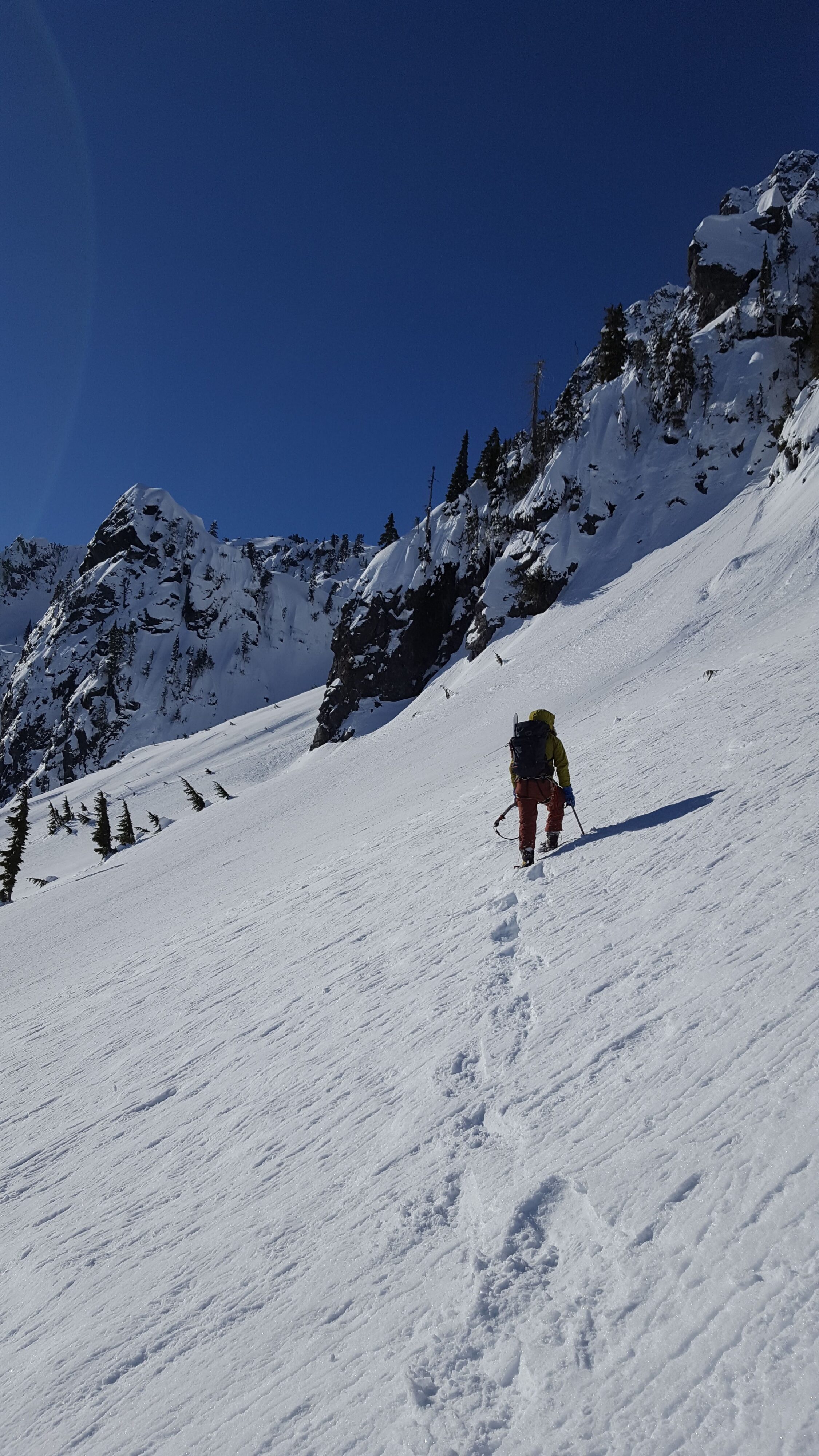 Chris and I were throwing around a bunch of ideas of what to climb for the beautiful weather weekend we were about to have on Friday; ideas including the triple couloirs on Dragontail, Gibralter Ledges on Rainier, and Mount Index. With the weather looking best around Mount Index, and since I already have an attempt on Index in winter back in 2013 giving me familiarity with the route, we decided to give Index an attempt. We had been climbing ice at Banks Lake and Vantage the previous few days and wanted a big alpine objective to finish off the trip. On Saturday morning we got all our gear together in my van and packed up our packs and around 1pm started up the Lake Serene Trail, which was quite packed down due to the many hikers that were walking the trail this weekend. Complete with what felt like 40 pound packs (winter camping gear mostly) we made our way to the lake. We ran into at least a few dozen people hiking down and were amazed at the amount of people going winter hiking!