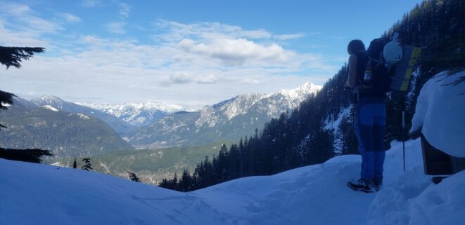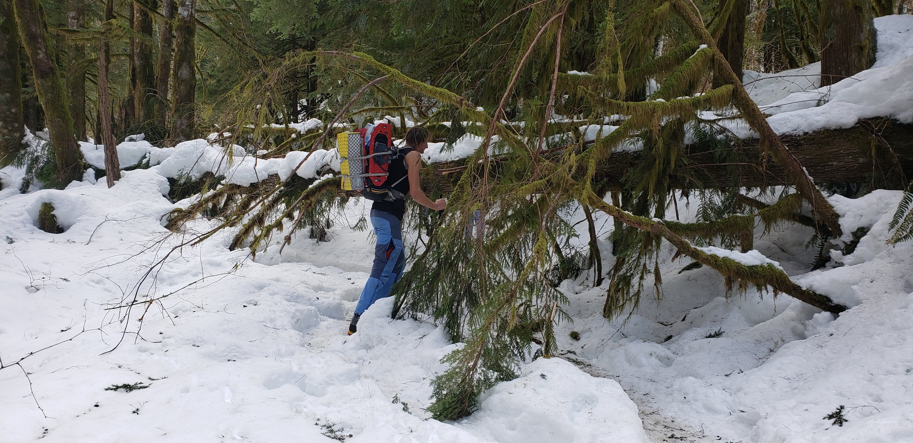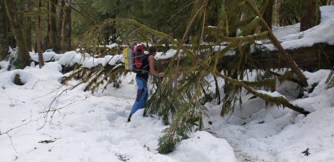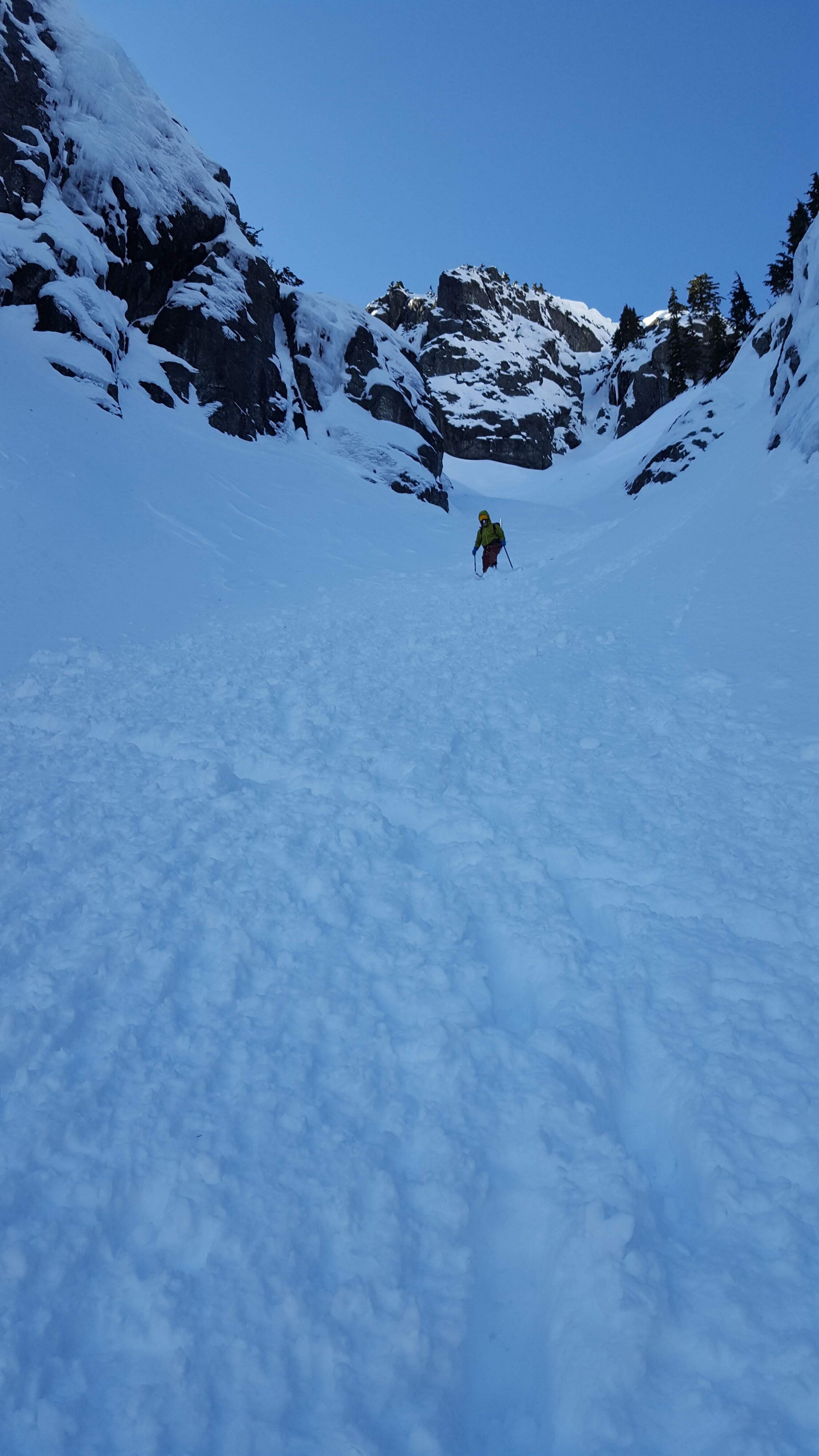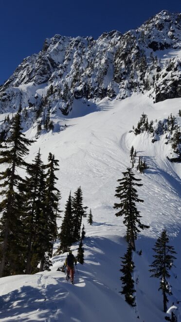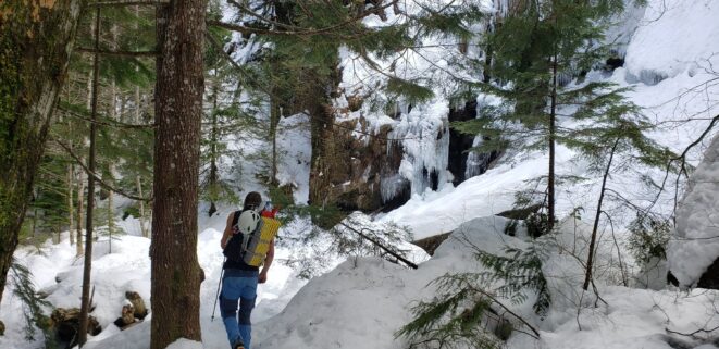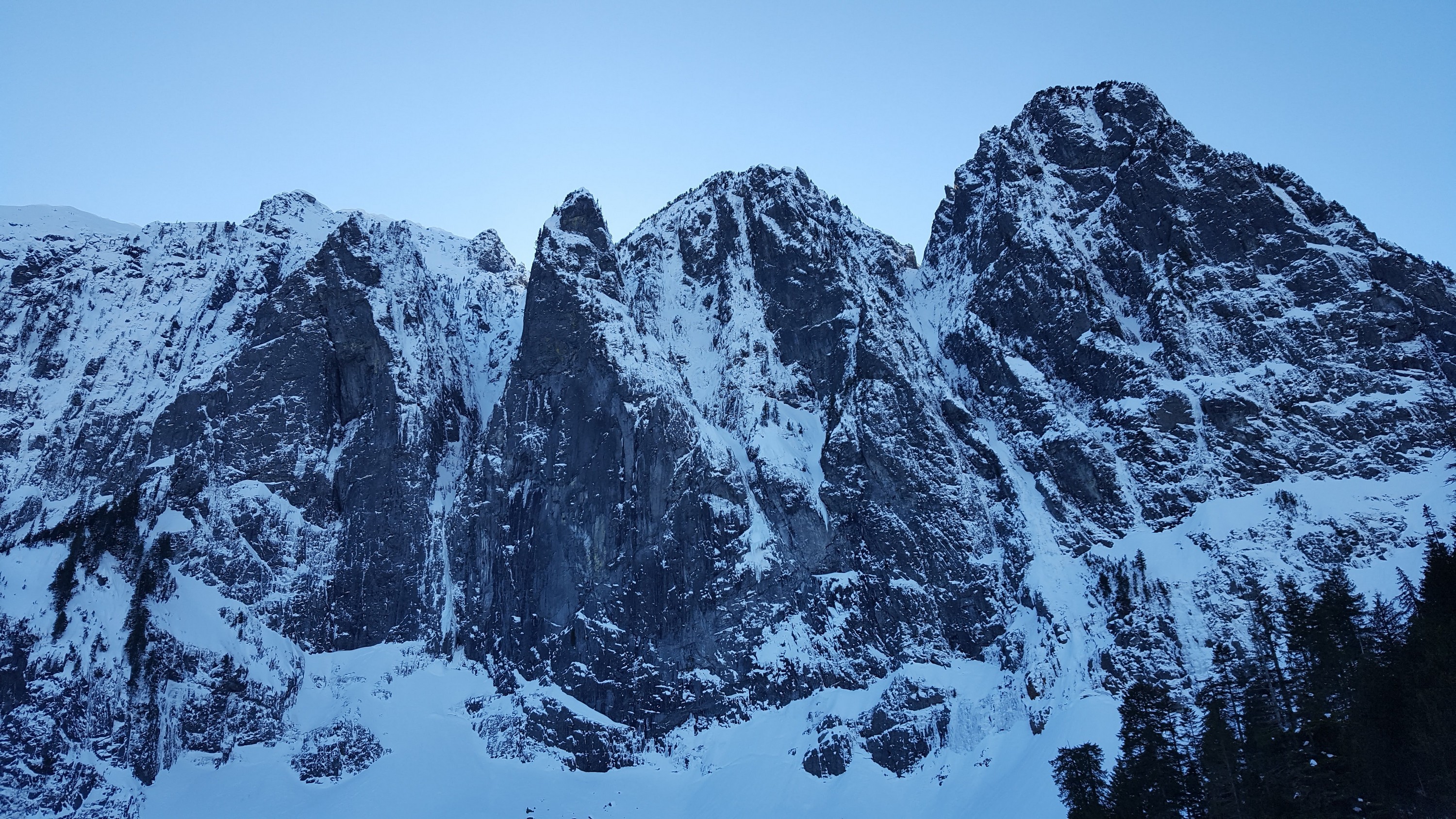 Chris and I were throwing around a bunch of ideas of what to climb for the beautiful weather weekend we were about to have on Friday; ideas including the triple couloirs on Dragontail, Gibralter Ledges on Rainier, and Mount Index. With the weather looking best around Mount Index, and since I already have an attempt on Index in winter back in 2013 giving me familiarity with the route, we decided to give Index an attempt. We had been climbing ice at Banks Lake and Vantage the previous few days and wanted a big alpine objective to finish off the trip. On Saturday morning we got all our gear together in my van and packed up our packs and around 1pm started up the Lake Serene Trail, which was quite packed down due to the many hikers that were walking the trail this weekend. Complete with what felt like 40 pound packs (winter camping gear mostly) we made our way to the lake. We ran into at least a few dozen people hiking down and were amazed at the amount of people going winter hiking!