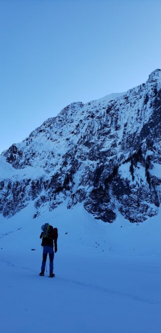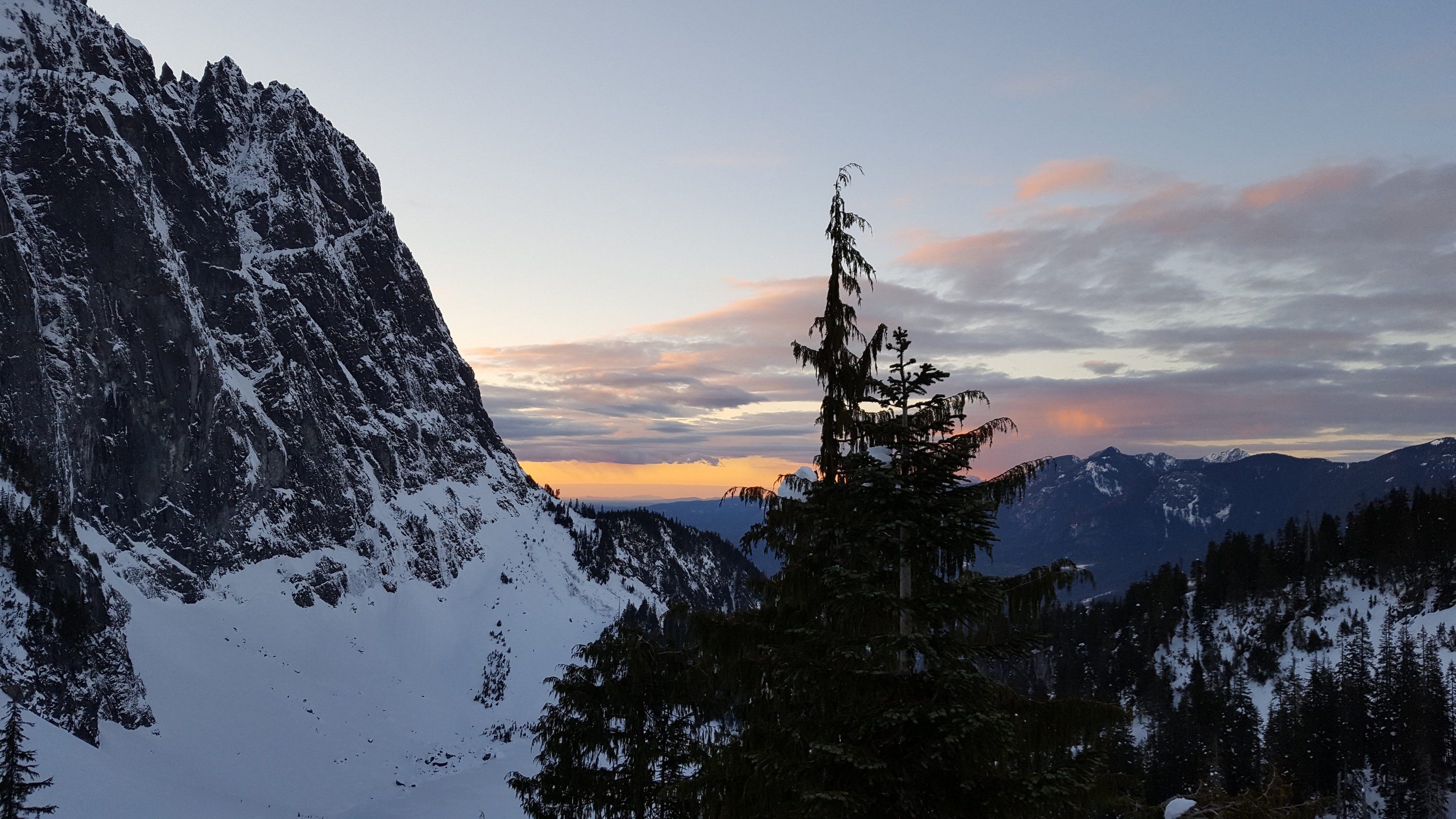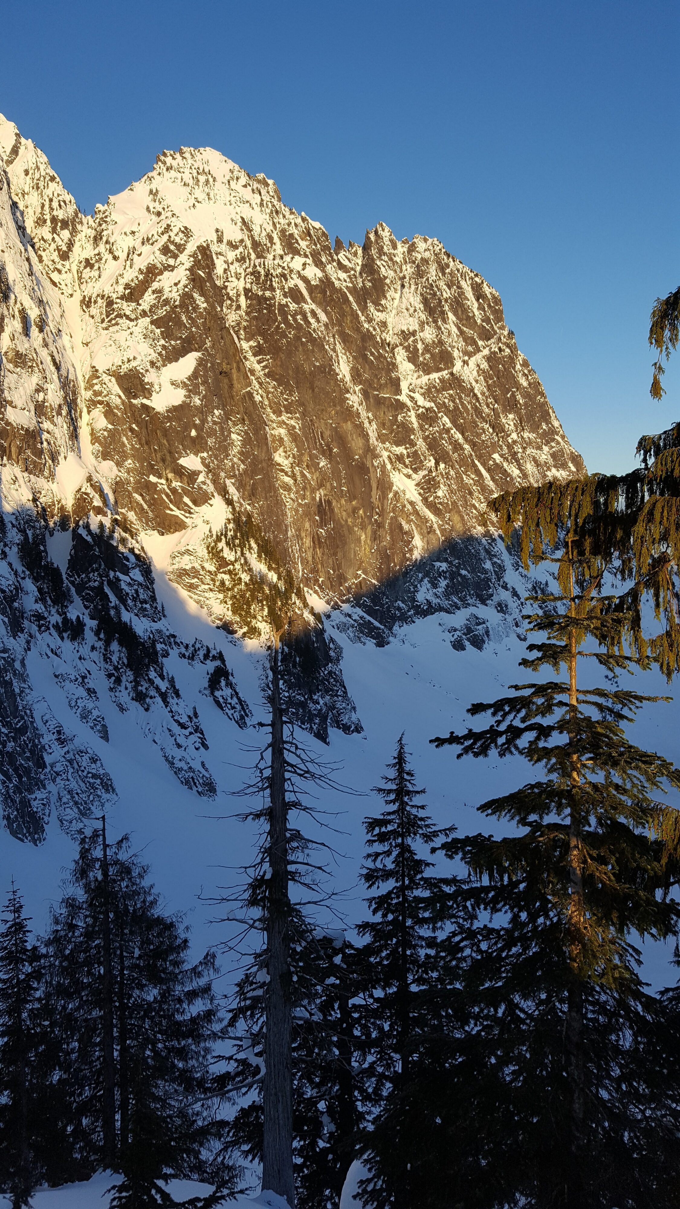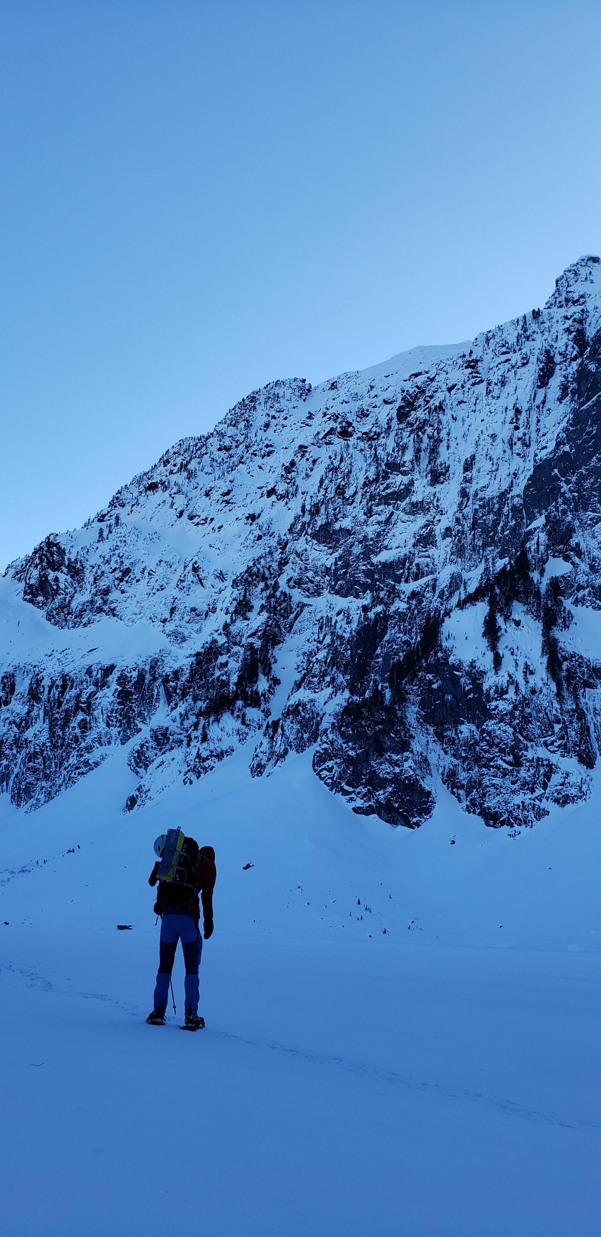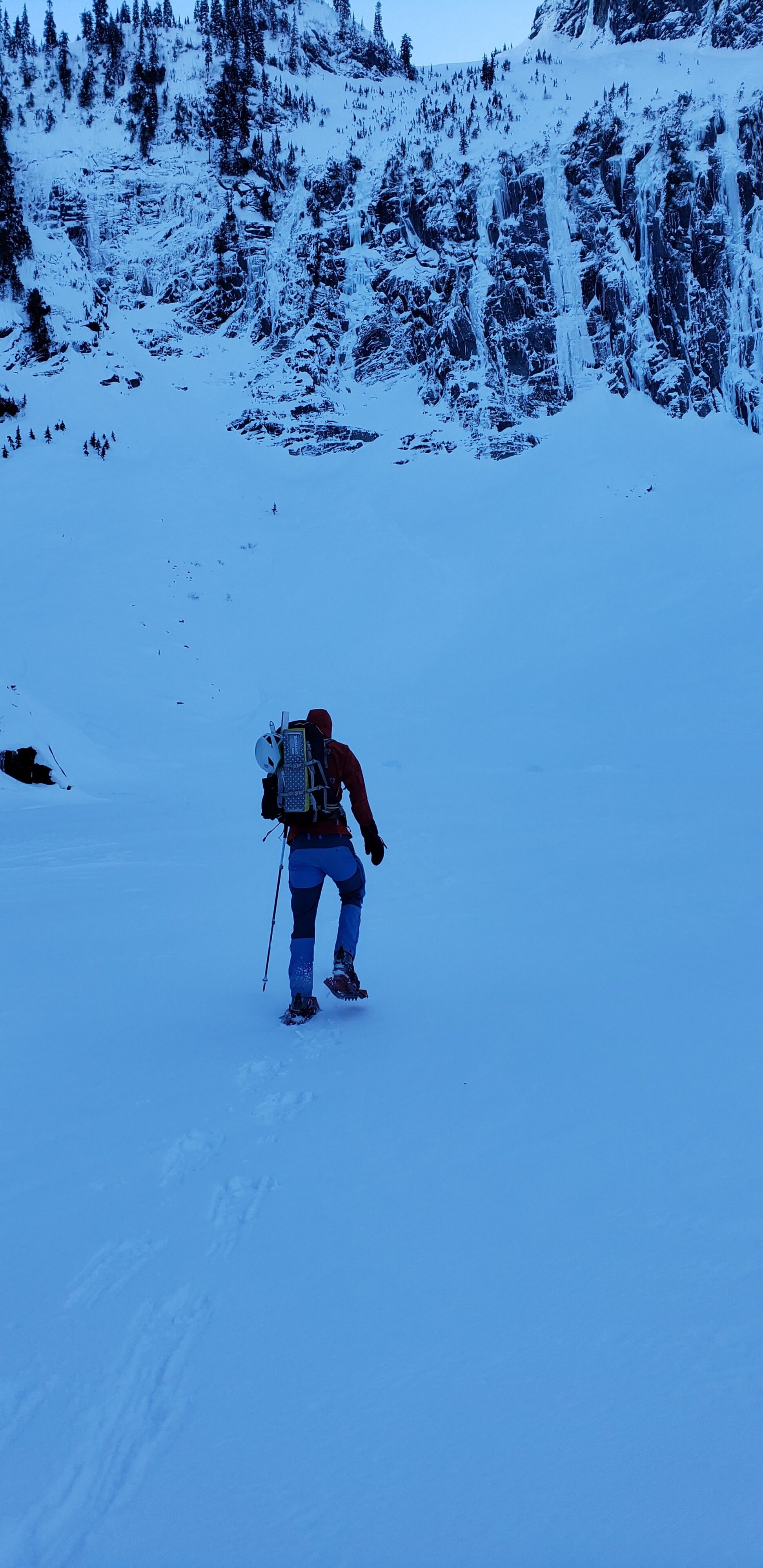 After a couple hours we made the lake and threw the snowshoes on to make our way across the frozen surface, and started our way up towards the 3,080 foot saddle just SE of the lake. The snow was initially not too bad, and with snowshoes we only sunk down a few inches on occasion. We started up the lower east ridge that encircles around the south side of the lake, in a SW direction as the evening went on, hoping to make it to the 3,950 foot flat spot where the ridge terminates into the steep east face of Index. Due to worsening snow conditions, our progress slowed substantially as we began postholing at times to our waist up steep terrain, we located a small flat perch partway up the steep ridge that we could dig out a platform to pitch the tent. We had an incredible view of the north and south Norwegian buttress from this vantage as the sun set. There was ice literally everywhere, and was wishing I had brought more screws. However, we were there to climb index, not put up some first ascents on ice that looked amazing haha. I dug us out a platform, put the tent up and went to sleep.