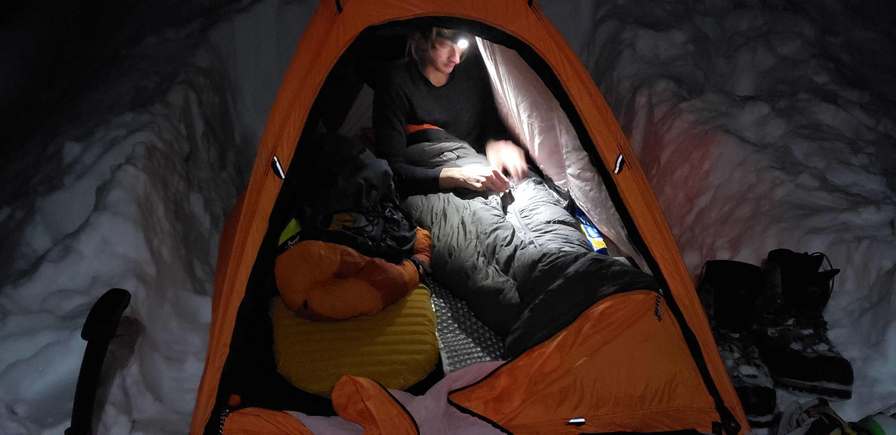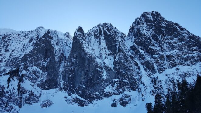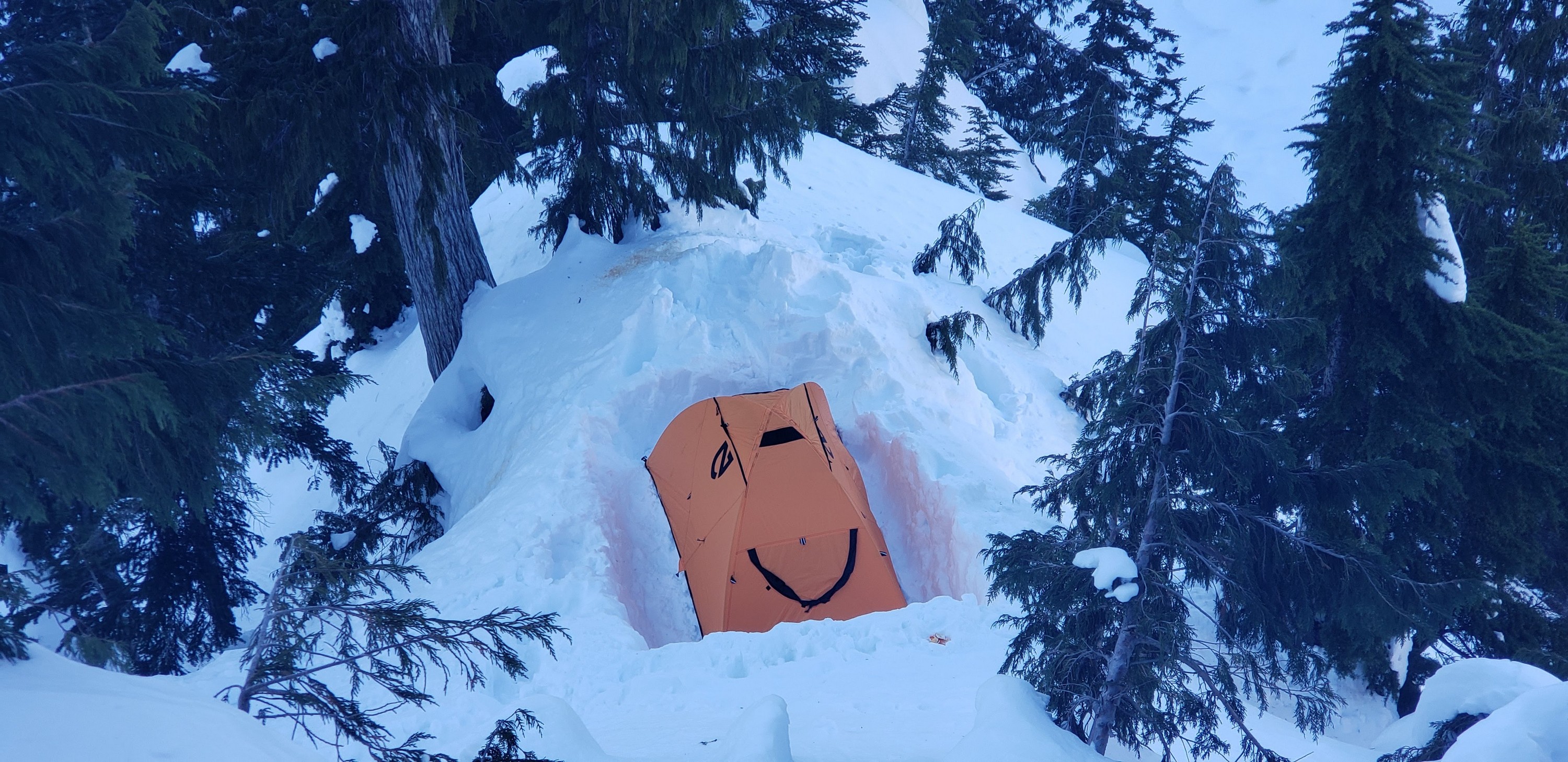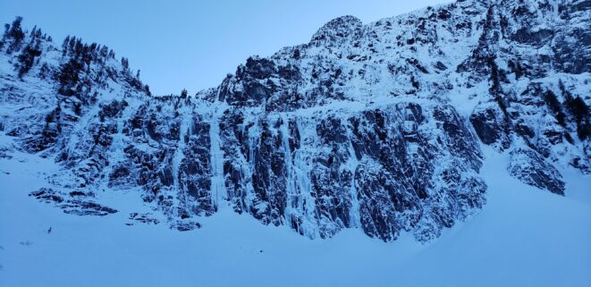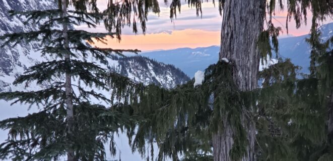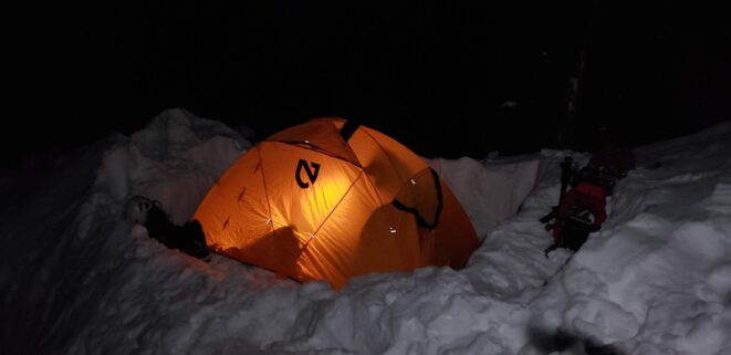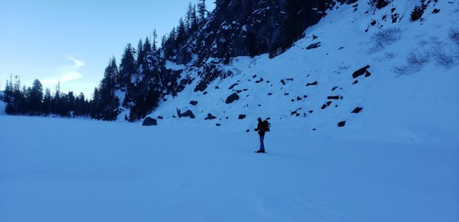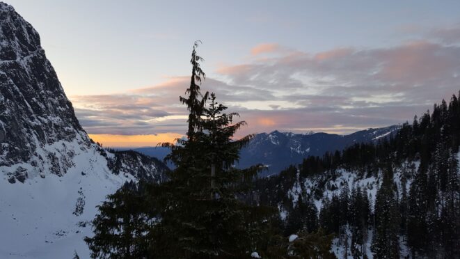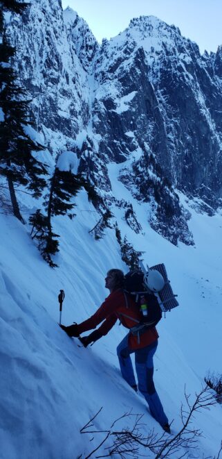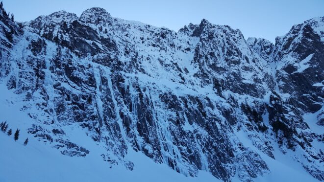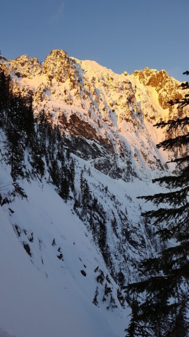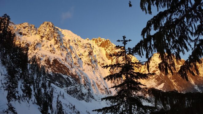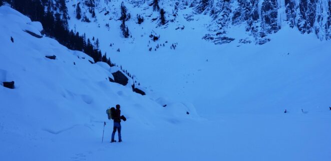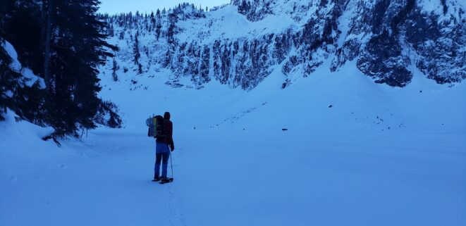 After a couple hours we made the lake and threw the snowshoes on to make our way across the frozen surface, and started our way up towards the 3,080 foot saddle just SE of the lake. The snow was initially not too bad, and with snowshoes we only sunk down a few inches on occasion. We started up the lower east ridge that encircles around the south side of the lake, in a SW direction as the evening went on, hoping to make it to the 3,950 foot flat spot where the ridge terminates into the steep east face of Index. Due to worsening snow conditions, our progress slowed substantially as we began postholing at times to our waist up steep terrain, we located a small flat perch partway up the steep ridge that we could dig out a platform to pitch the tent. We had an incredible view of the north and south Norwegian buttress from this vantage as the sun set. There was ice literally everywhere, and was wishing I had brought more screws. However, we were there to climb index, not put up some first ascents on ice that looked amazing haha. I dug us out a platform, put the tent up and went to sleep.