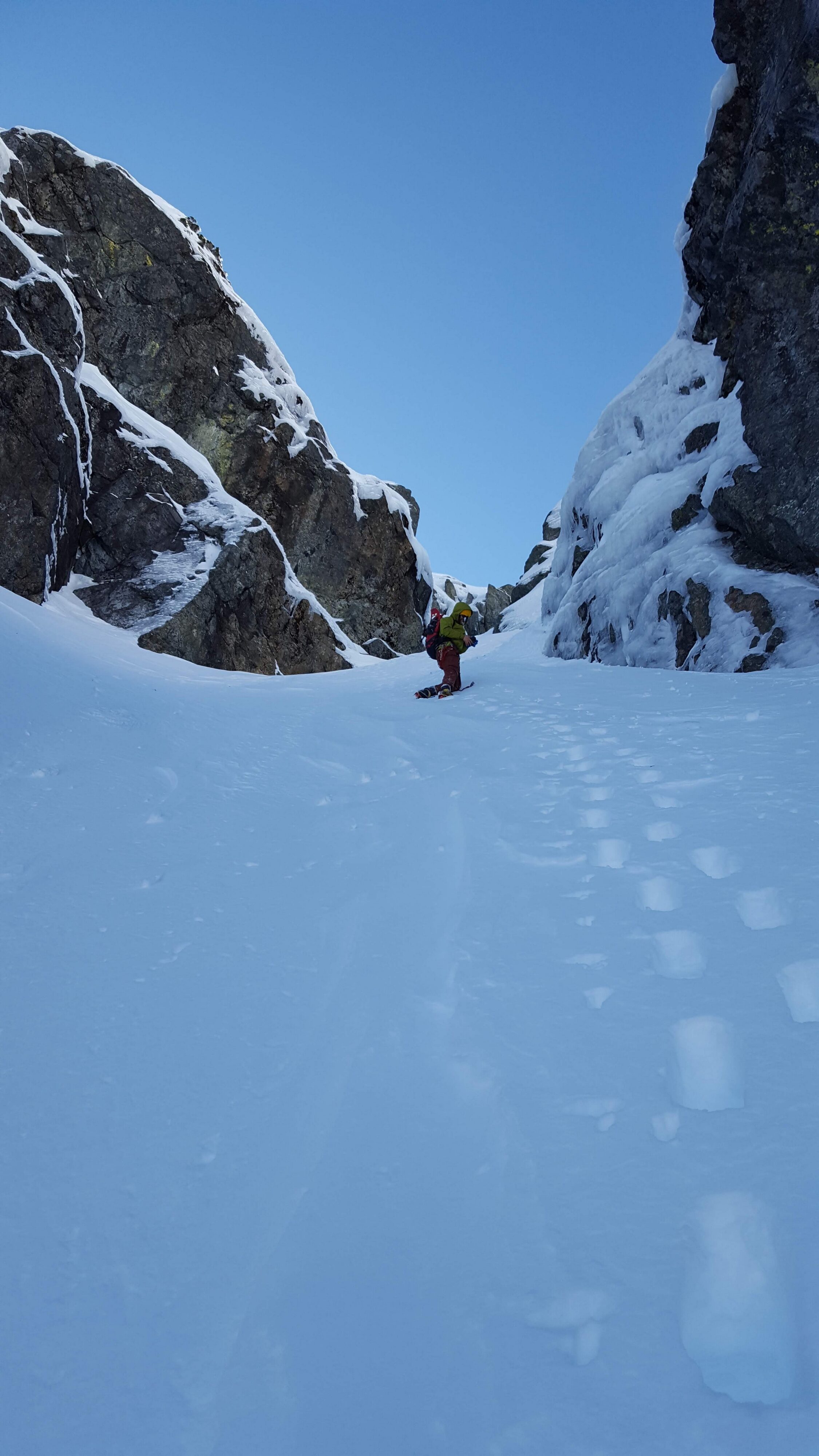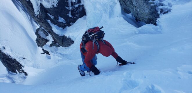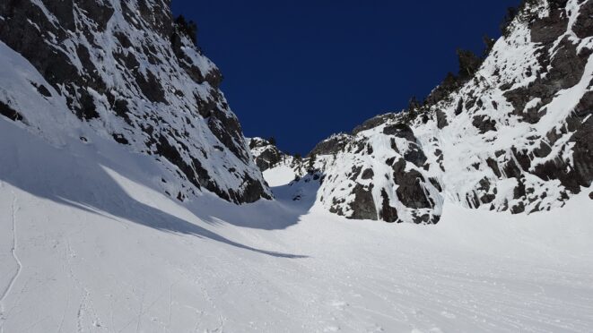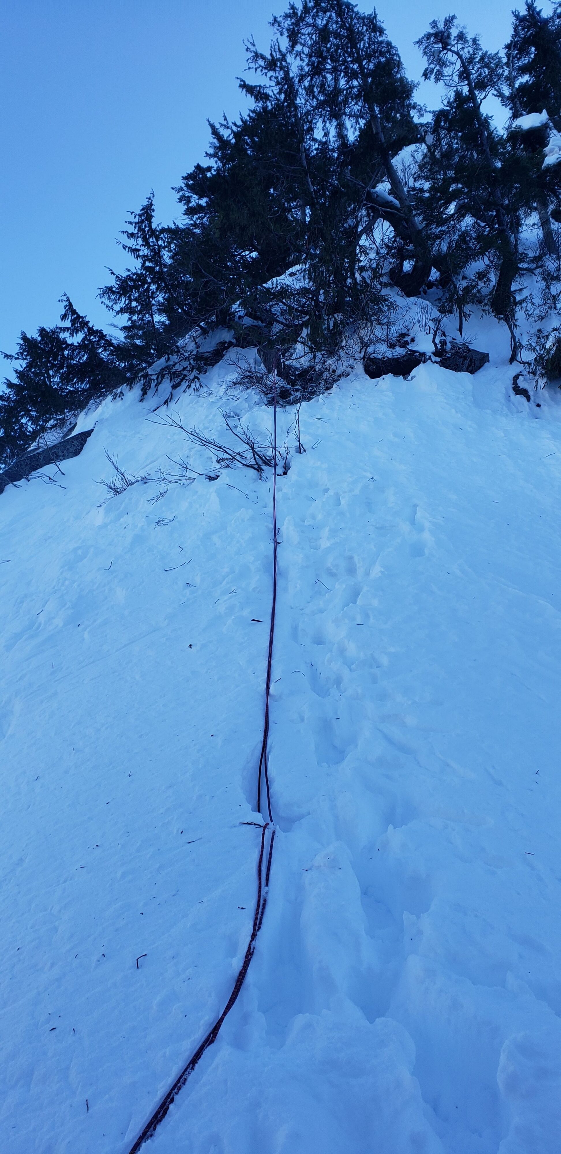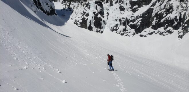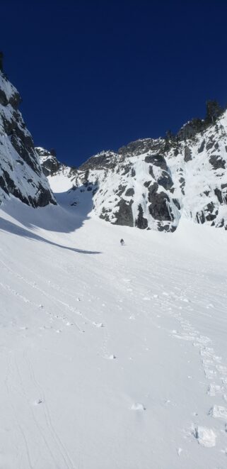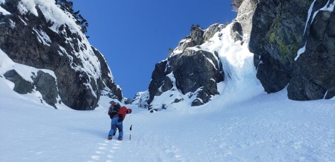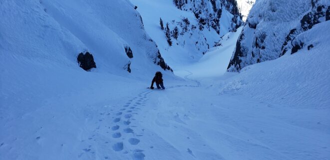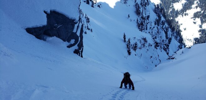 When the sun rose the next morning, we slowly emerged into the cold, breezy morning and ate a small breakfast that consisted simply of Oreos for myself and started to continue slogging up the now steeper ridge. The worst part of the climb was the next 100 feet above the tent, which took us over an hour to ascend. Chris did a great job of breaking trail up the 60 degree powder covered tree covered rock slabs that required us to excavate, and climb trees to ascend. I was ready to turn back but the hope the snow would improve higher up kept us pushing on. Eventually, we reached the upper part of the ridge where the steepness mellowed out and we could put the snowshoes back on and continue slogging up. At 4000 feet, we started traversing to the left across the open snow slopes, and to our surprise the snow was pretty stable! We rounded a small buttress, then started switchbacking up the open slopes with the snowshoes, eventually aiming for the small constriction midway up the hourglass gully. Chris had been breaking trail much of the way from the tent, so I started breaking trail when we entered the gully, and once we entered the shade where the gully narrowed, we switched our snowshoes for crampons and I finally got out my ice axe. The snow became icier and we made great time up the rest of the gully, which had us climbing some 45 degree neve. It was amazing!