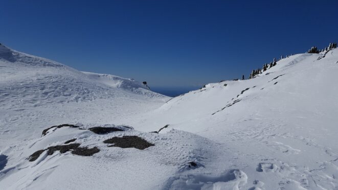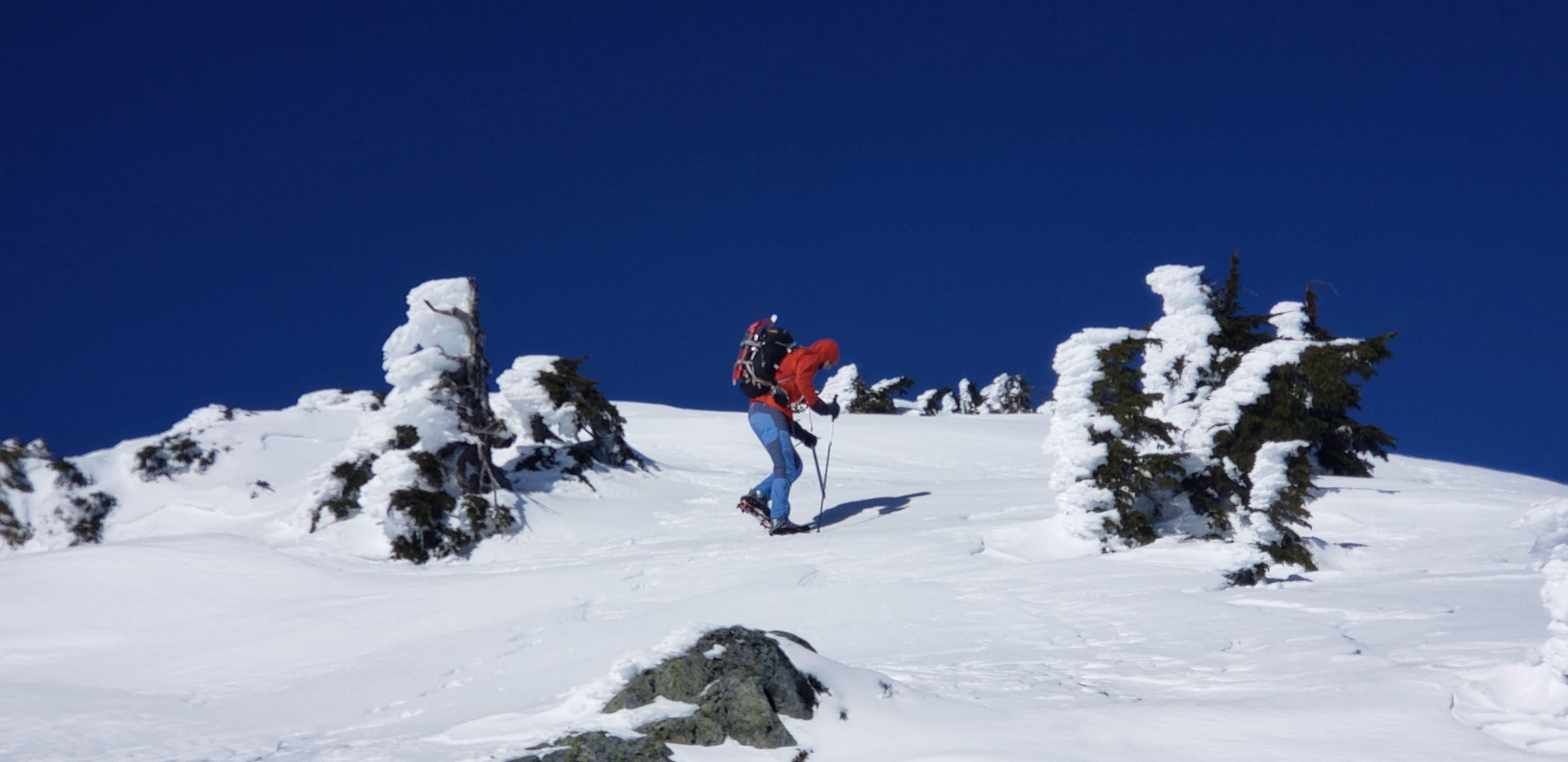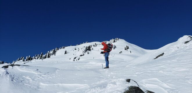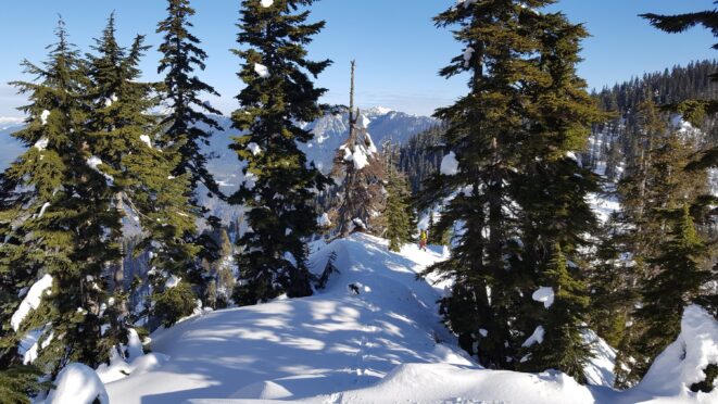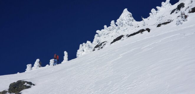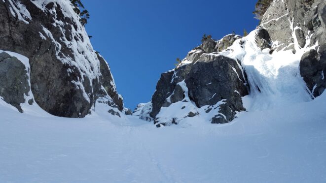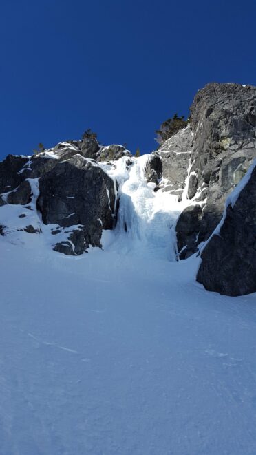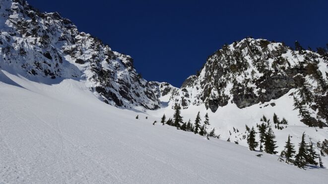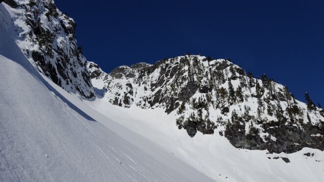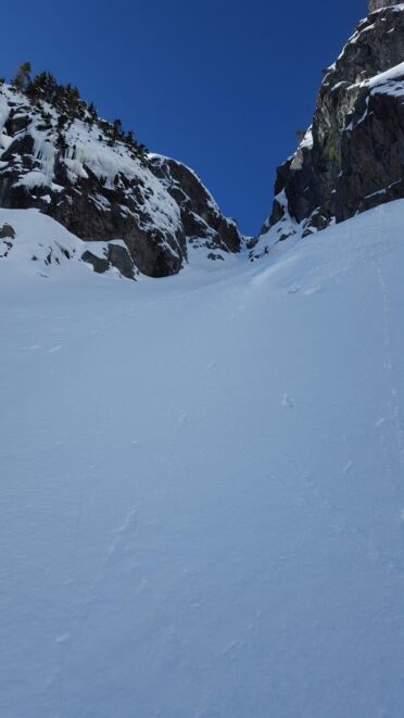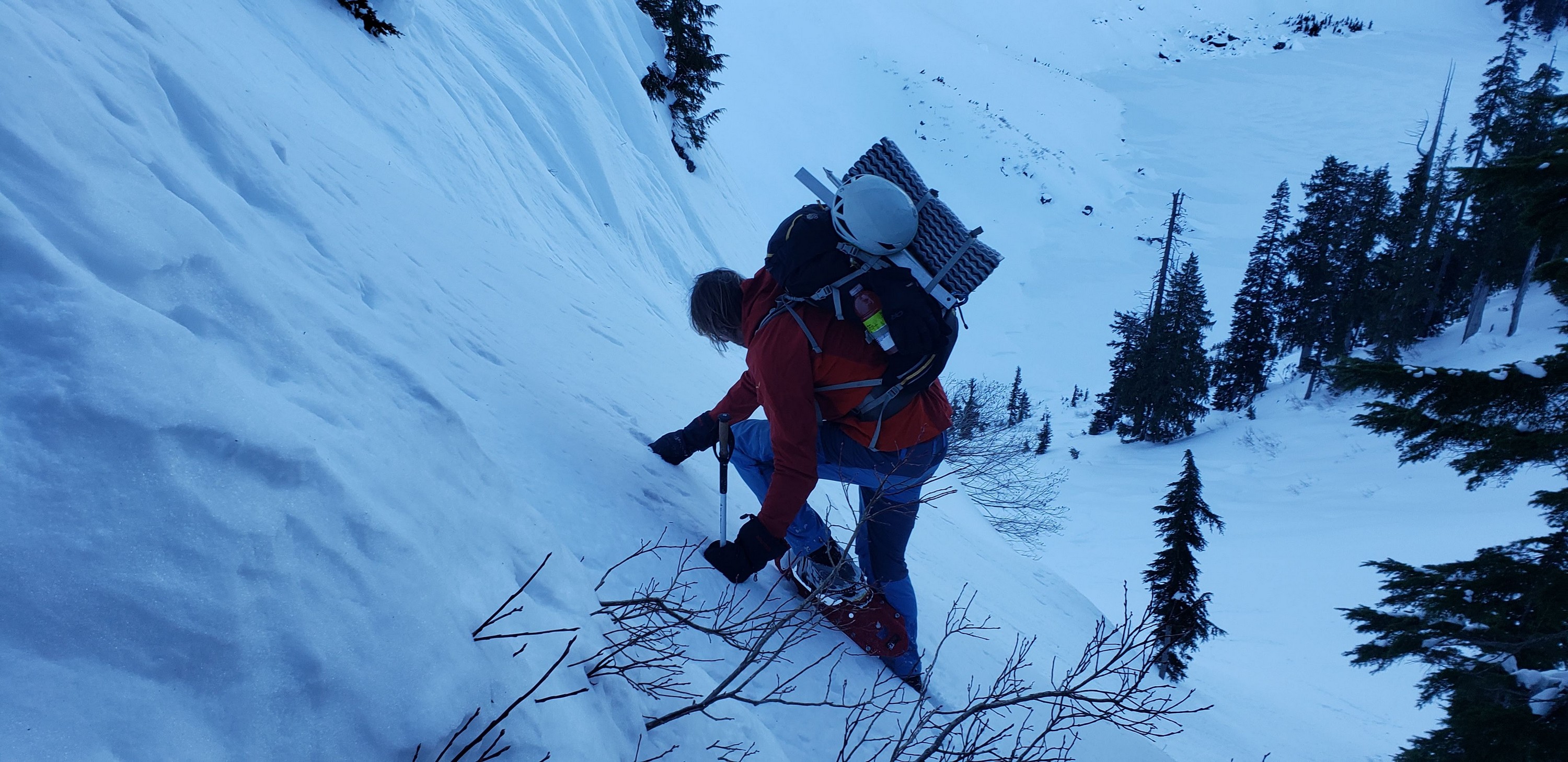 When the sun rose the next morning, we slowly emerged into the cold, breezy morning and ate a small breakfast that consisted simply of Oreos for myself and started to continue slogging up the now steeper ridge. The worst part of the climb was the next 100 feet above the tent, which took us over an hour to ascend. Chris did a great job of breaking trail up the 60 degree powder covered tree covered rock slabs that required us to excavate, and climb trees to ascend. I was ready to turn back but the hope the snow would improve higher up kept us pushing on. Eventually, we reached the upper part of the ridge where the steepness mellowed out and we could put the snowshoes back on and continue slogging up. At 4000 feet, we started traversing to the left across the open snow slopes, and to our surprise the snow was pretty stable! We rounded a small buttress, then started switchbacking up the open slopes with the snowshoes, eventually aiming for the small constriction midway up the hourglass gully. Chris had been breaking trail much of the way from the tent, so I started breaking trail when we entered the gully, and once we entered the shade where the gully narrowed, we switched our snowshoes for crampons and I finally got out my ice axe. The snow became icier and we made great time up the rest of the gully, which had us climbing some 45 degree neve. It was amazing!