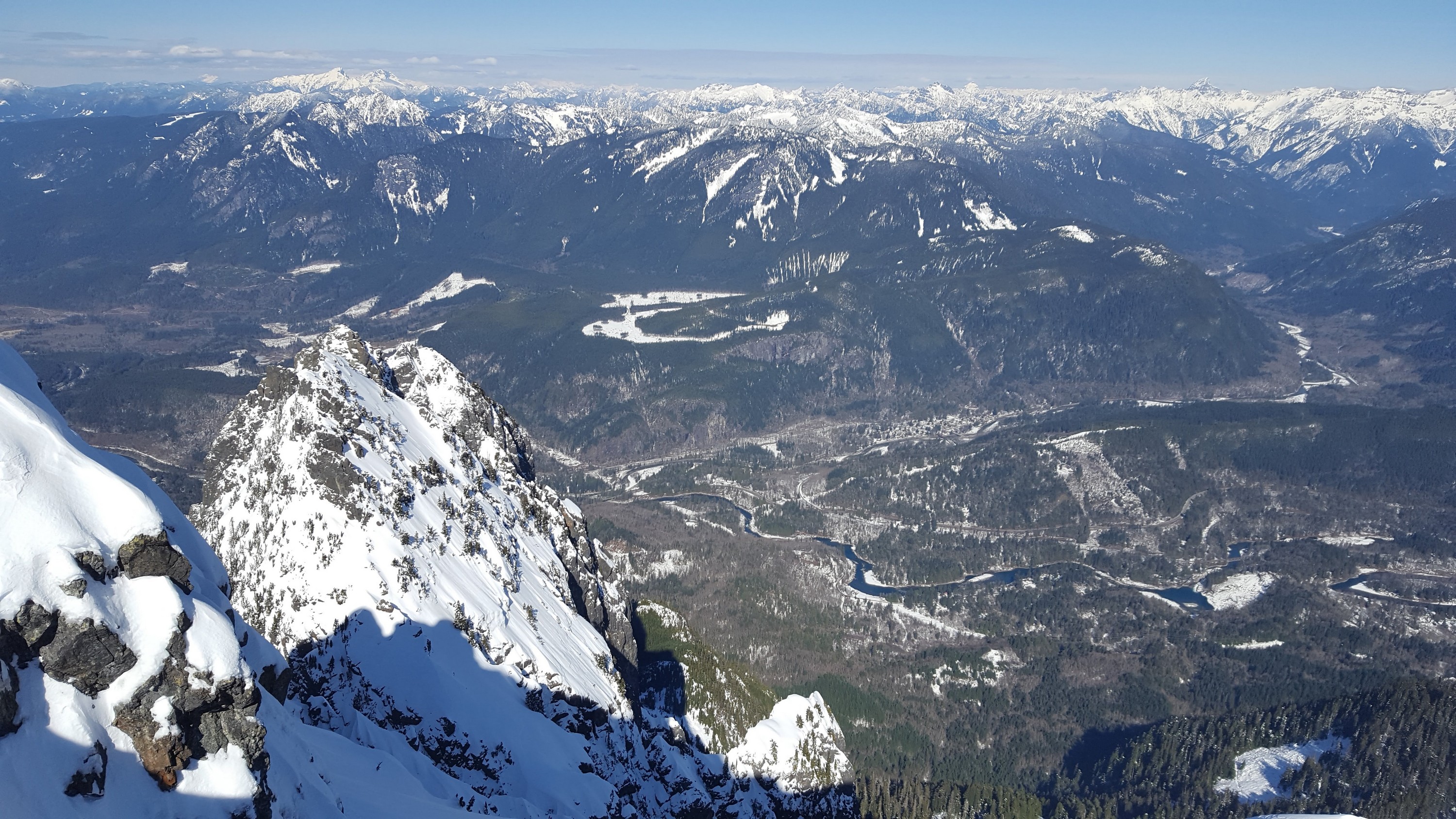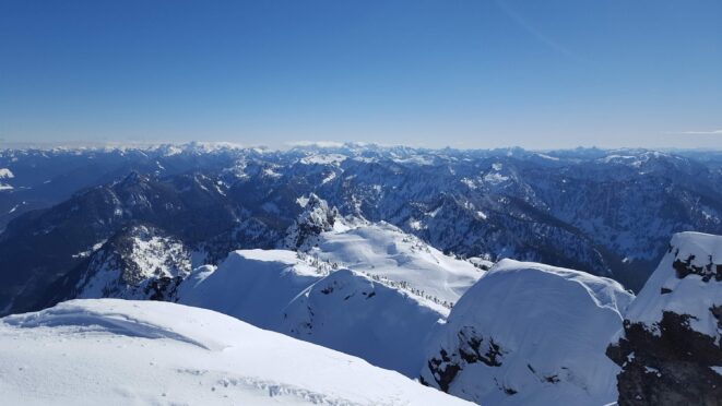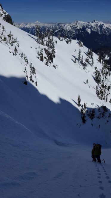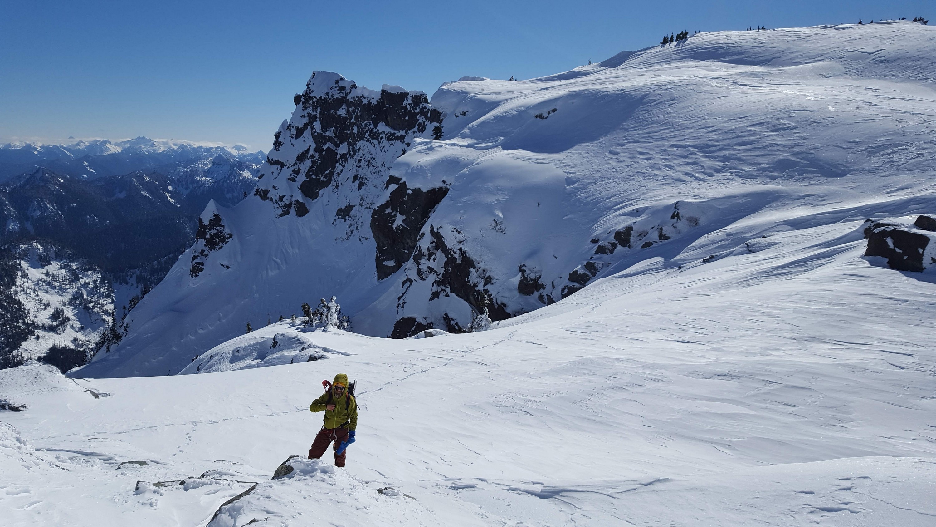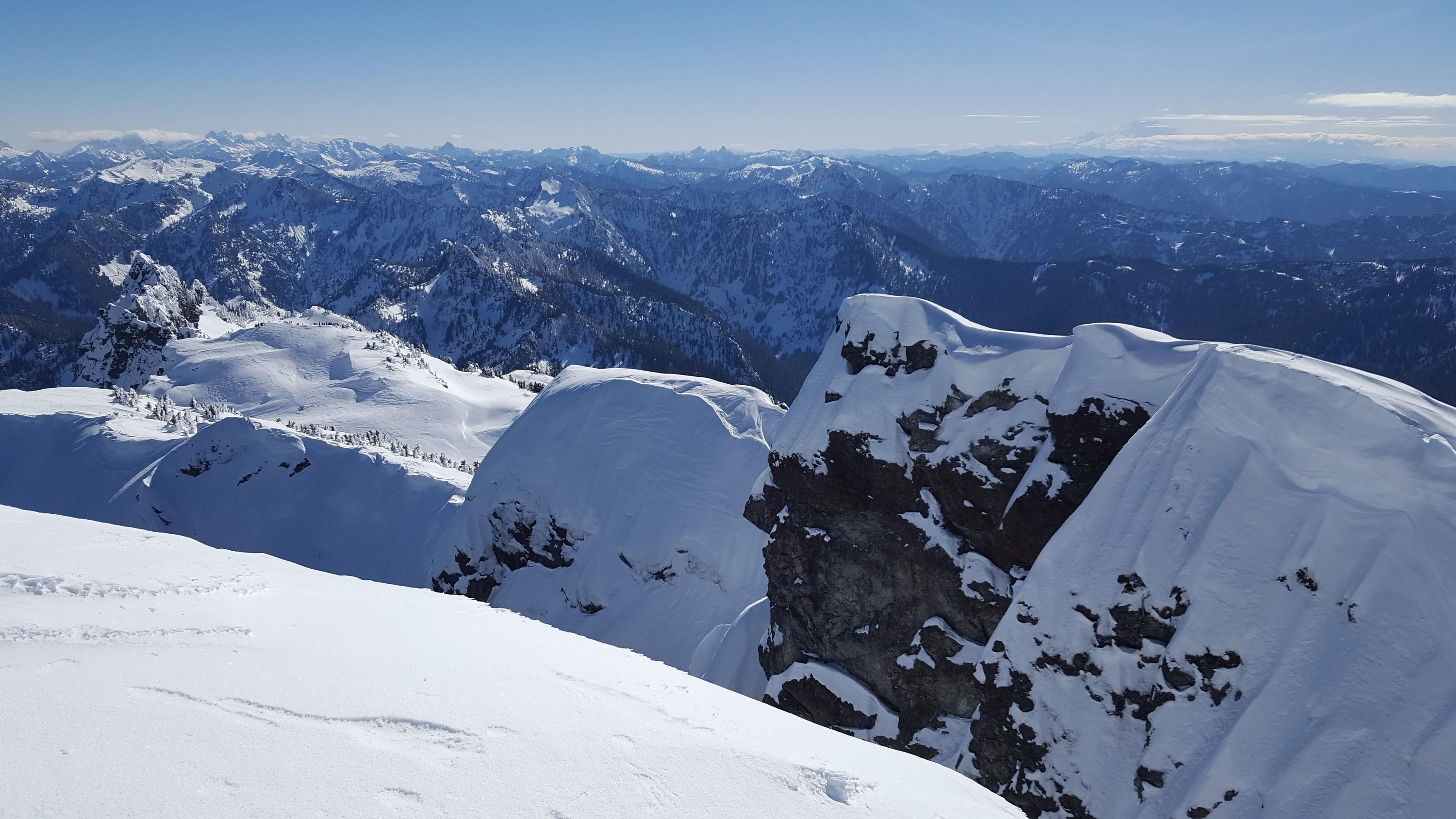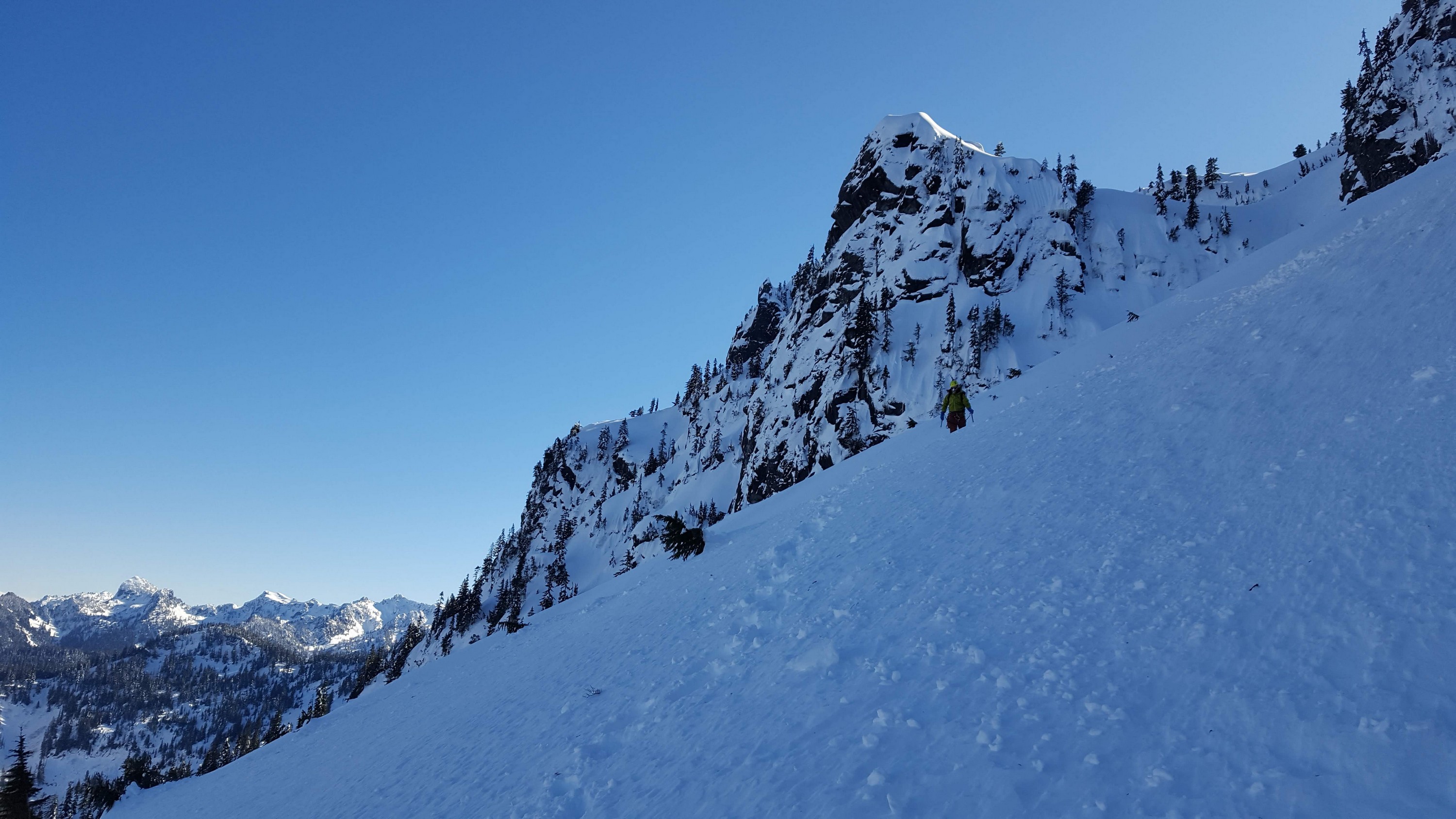 It was a glorious scene when we topped out of the couloir, and we started the now easy walk on firm wind blown snow back to the west on the broad ridge. The air was so clear we could see Seattle, and all of Puget sound to the west, and the Olympics beyond. The final push to the summit involved a sidehill traverse on the south side of the summit rocks and straight up the last 100 feet on 35 degree snow. I honestly couldn't believe we had made it…I do not succeed on winter summits in the Cascades very often, and Index was definitely the biggest winter Cascade peak I have actually topped out on. The weather could not have been any better, and nearly every peak was visible with crystal clear clarity. Rainier, Baker and Glacier Peak were all standing proud, and Stuart was poking above a few clouds off to the east. Definitely worth the effort!