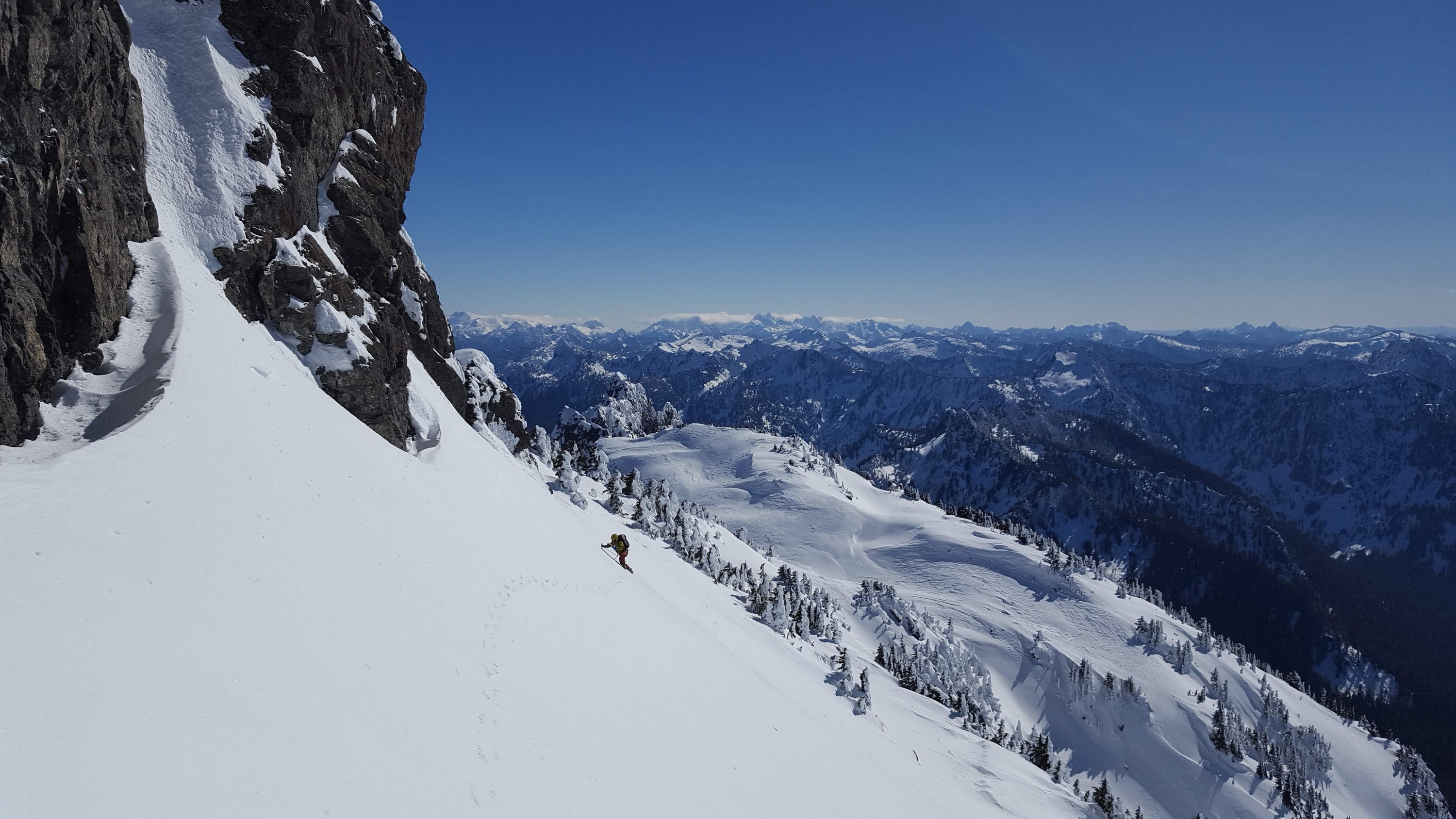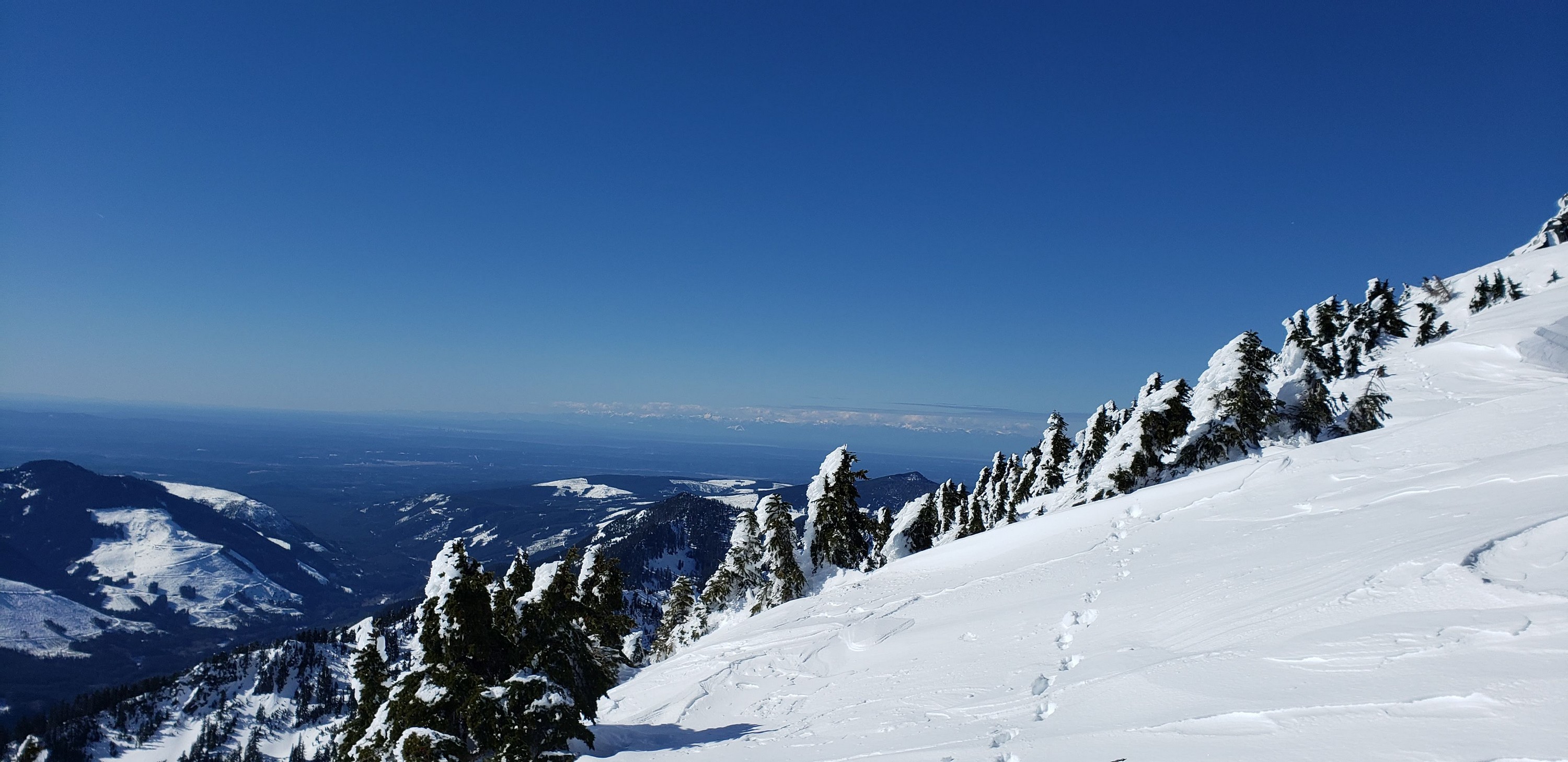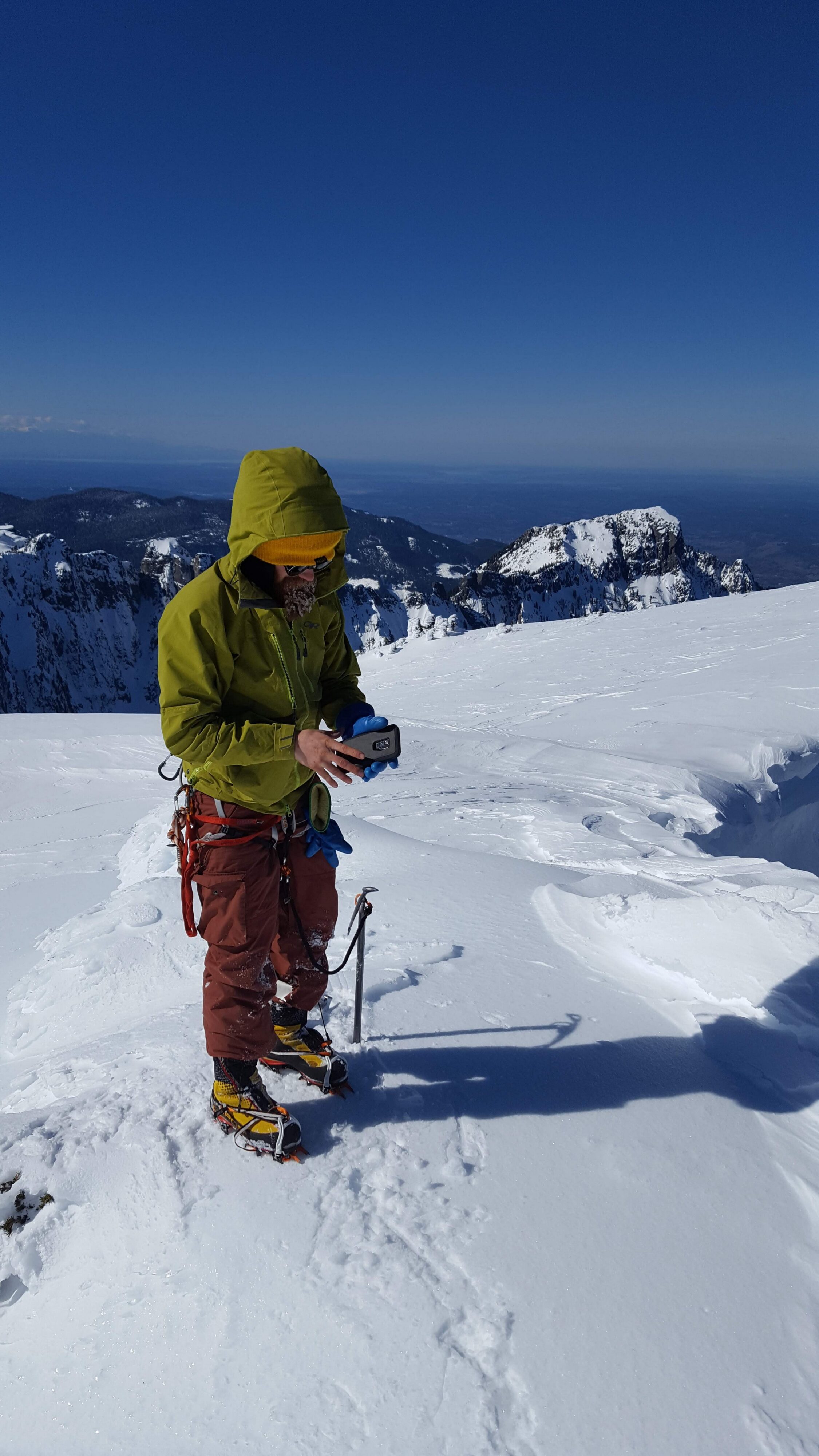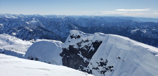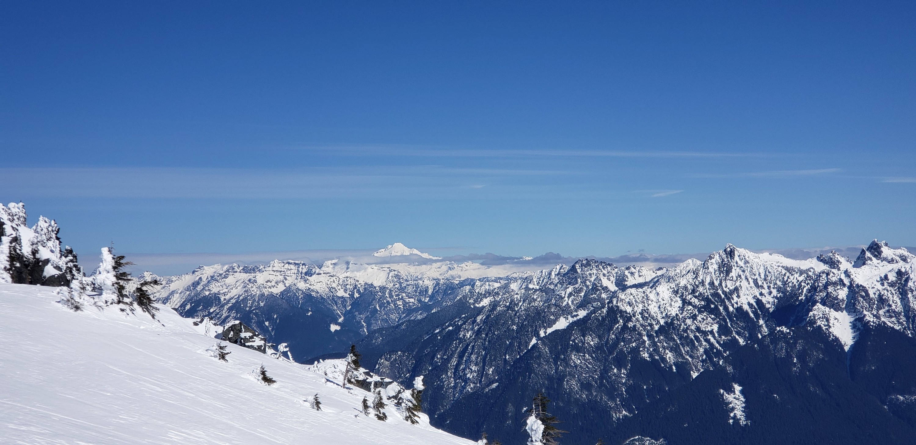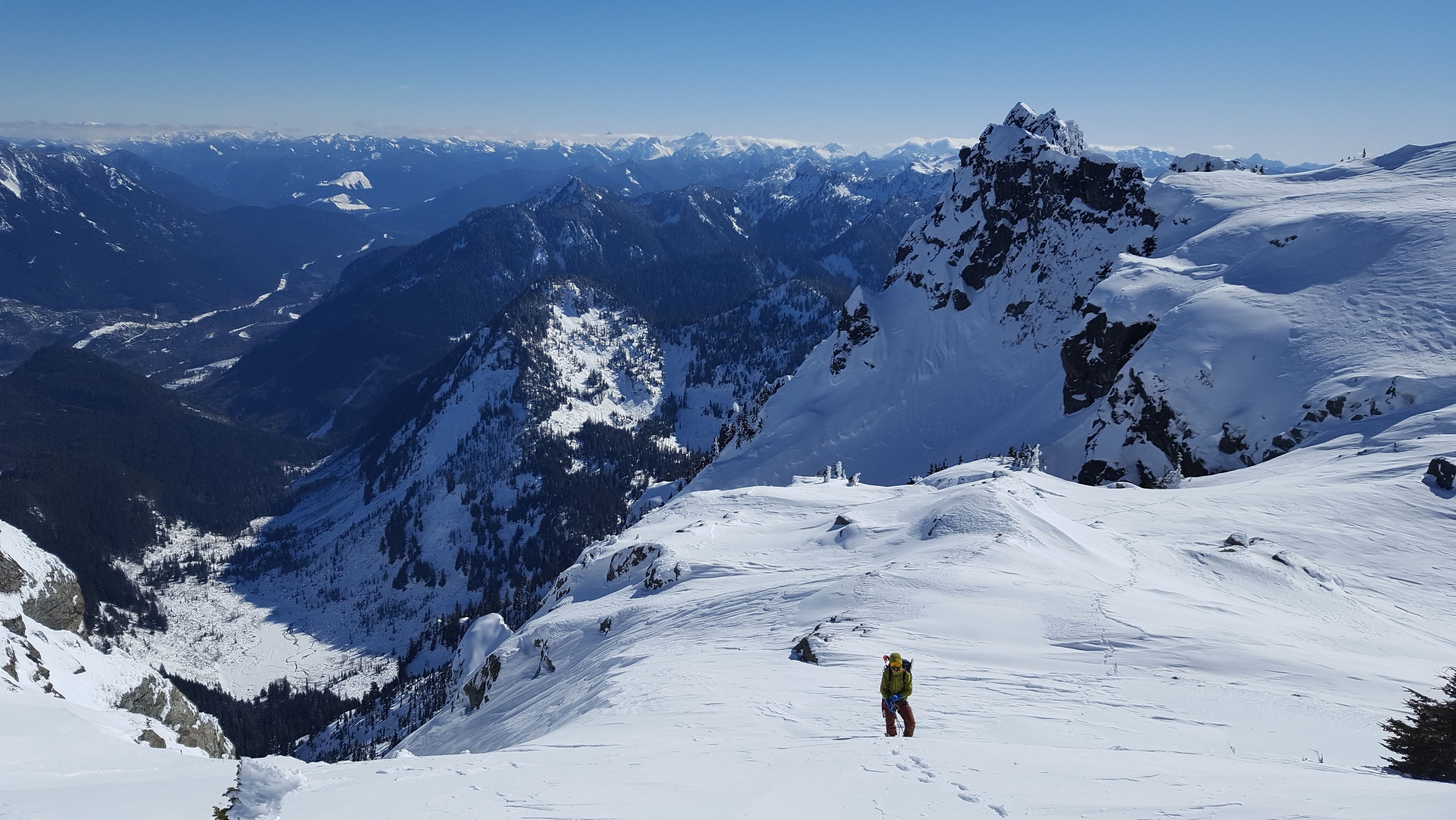 It was a glorious scene when we topped out of the couloir, and we started the now easy walk on firm wind blown snow back to the west on the broad ridge. The air was so clear we could see Seattle, and all of Puget sound to the west, and the Olympics beyond. The final push to the summit involved a sidehill traverse on the south side of the summit rocks and straight up the last 100 feet on 35 degree snow. I honestly couldn't believe we had made it…I do not succeed on winter summits in the Cascades very often, and Index was definitely the biggest winter Cascade peak I have actually topped out on. The weather could not have been any better, and nearly every peak was visible with crystal clear clarity. Rainier, Baker and Glacier Peak were all standing proud, and Stuart was poking above a few clouds off to the east. Definitely worth the effort!