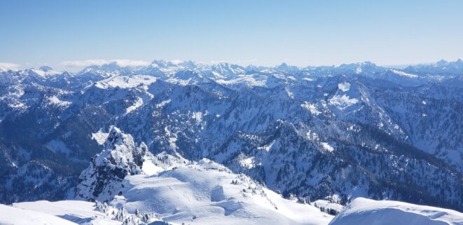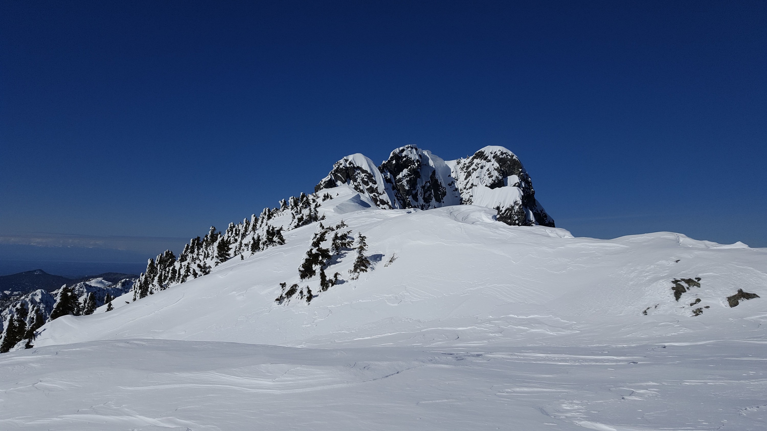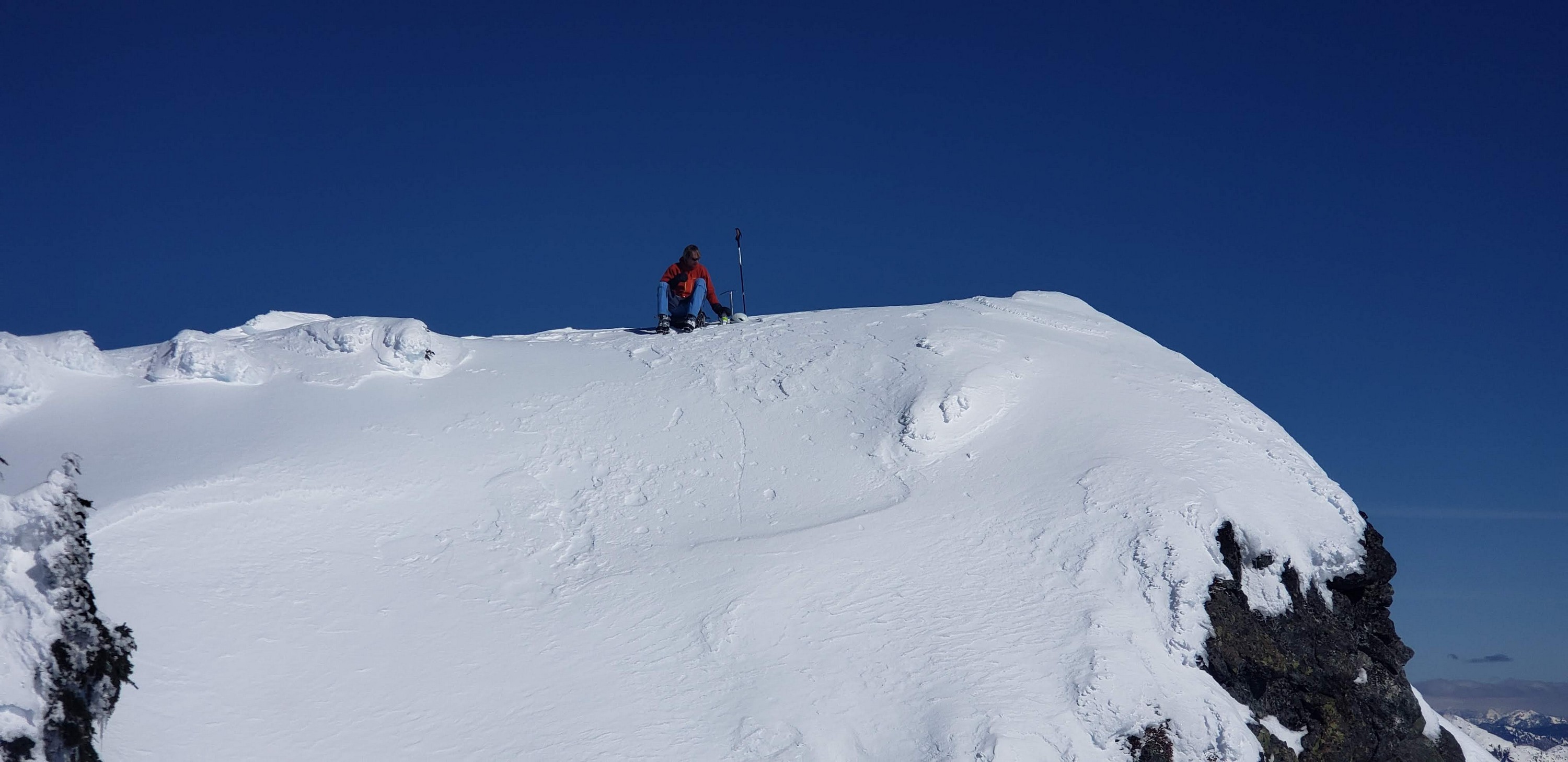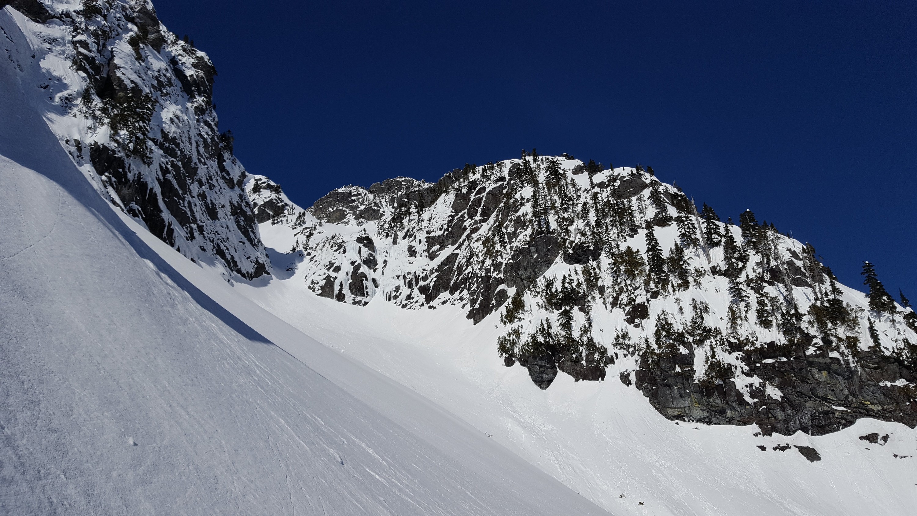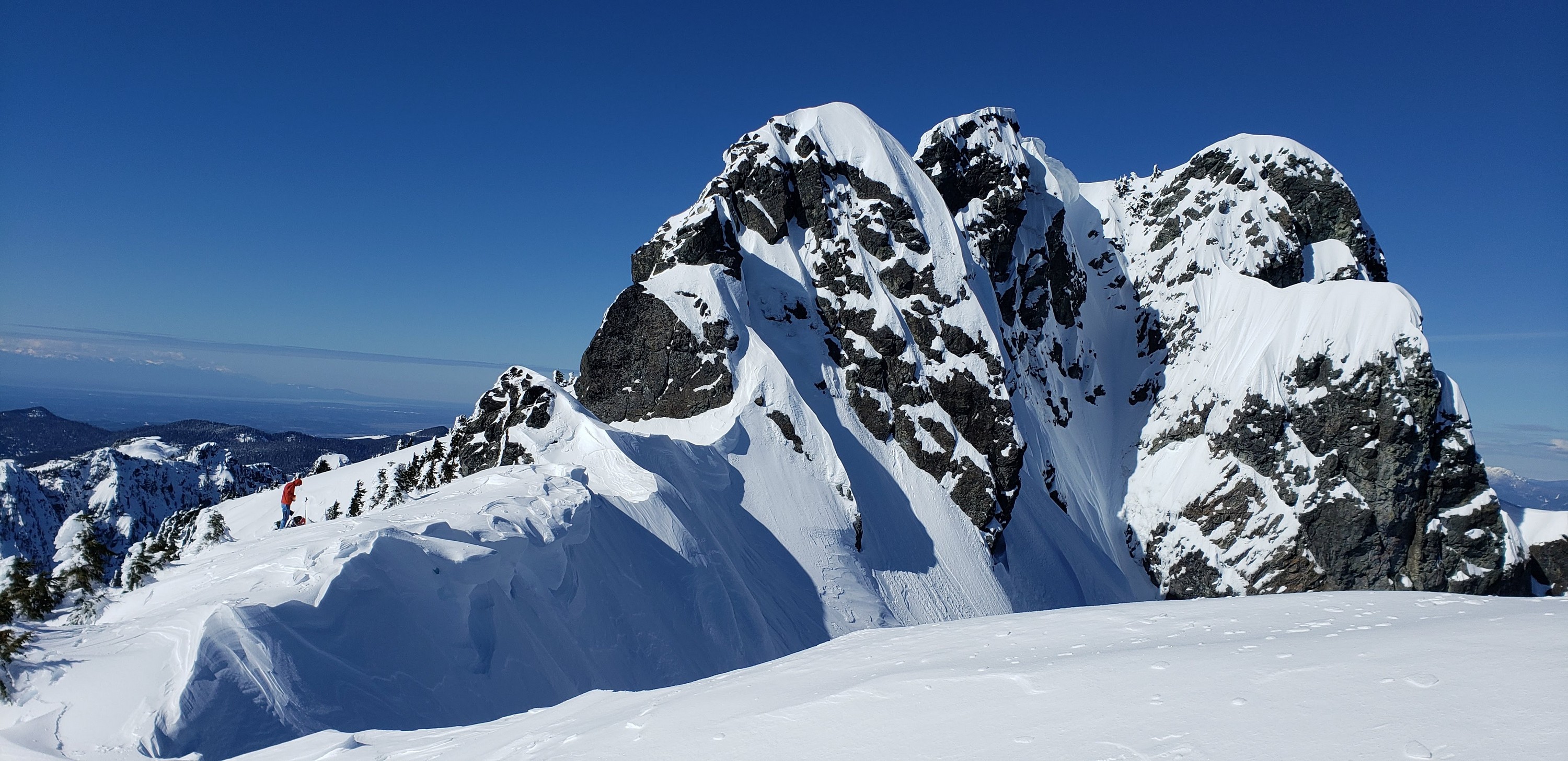 It was a glorious scene when we topped out of the couloir, and we started the now easy walk on firm wind blown snow back to the west on the broad ridge. The air was so clear we could see Seattle, and all of Puget sound to the west, and the Olympics beyond. The final push to the summit involved a sidehill traverse on the south side of the summit rocks and straight up the last 100 feet on 35 degree snow. I honestly couldn't believe we had made it…I do not succeed on winter summits in the Cascades very often, and Index was definitely the biggest winter Cascade peak I have actually topped out on. The weather could not have been any better, and nearly every peak was visible with crystal clear clarity. Rainier, Baker and Glacier Peak were all standing proud, and Stuart was poking above a few clouds off to the east. Definitely worth the effort!