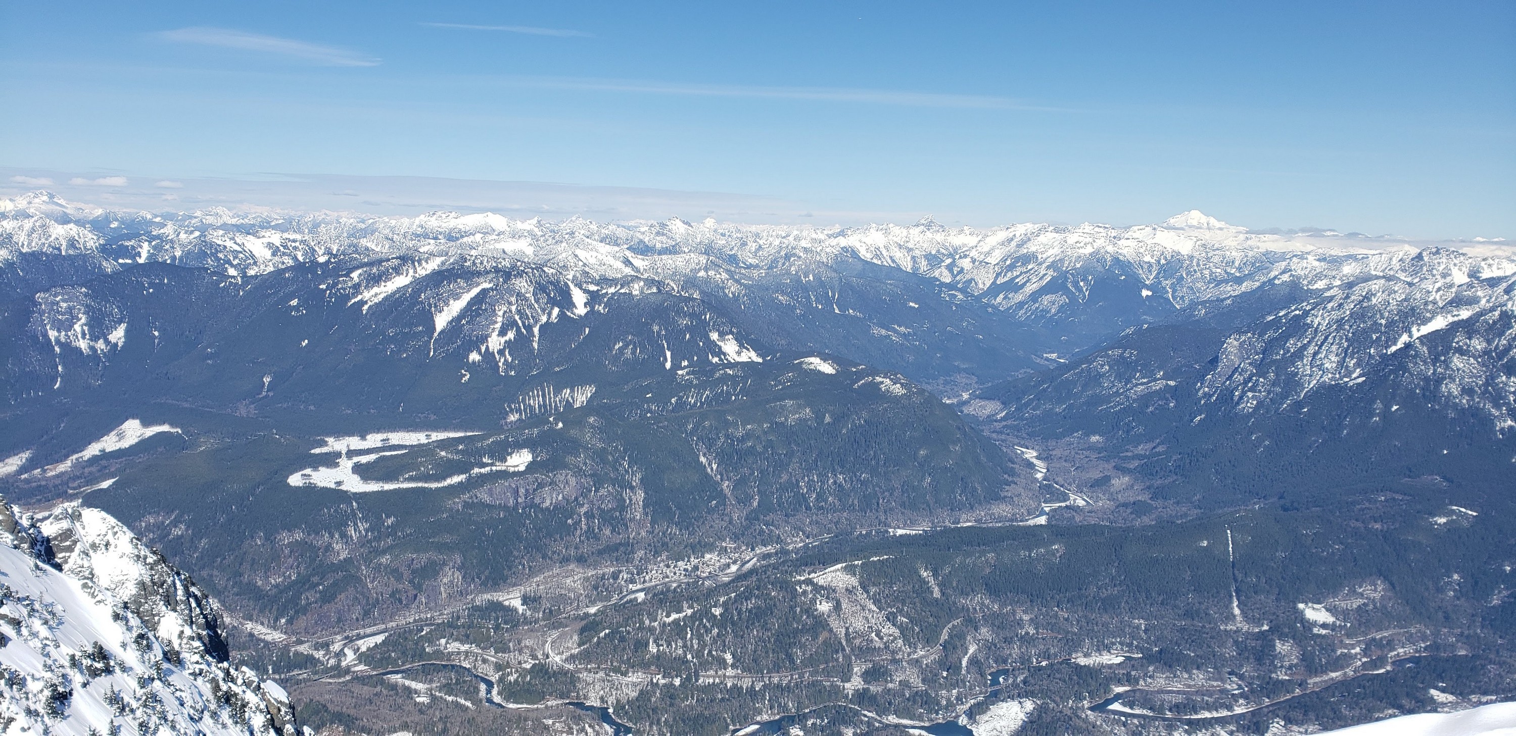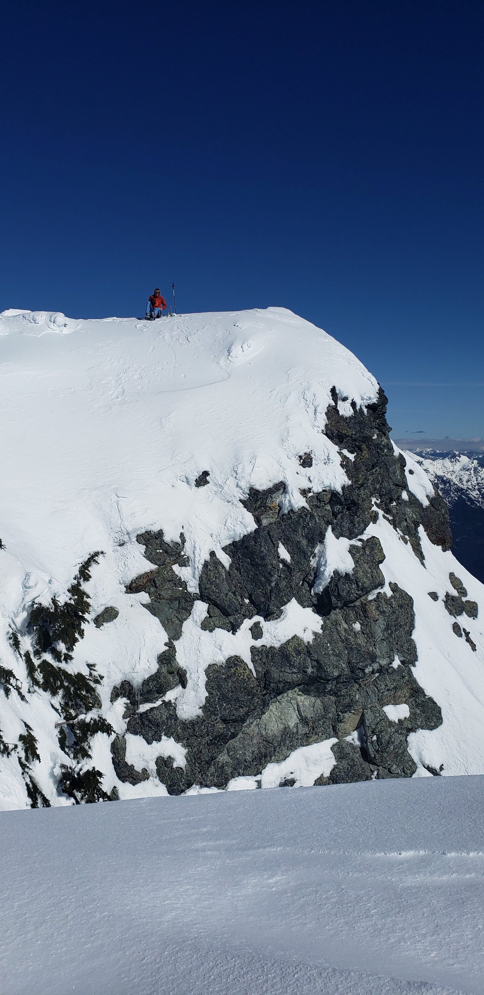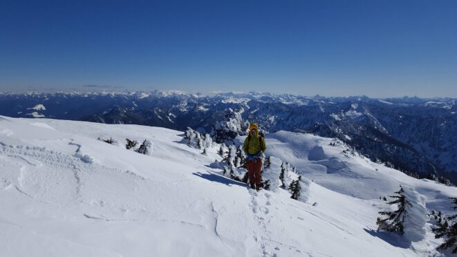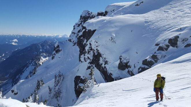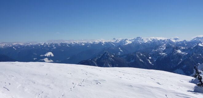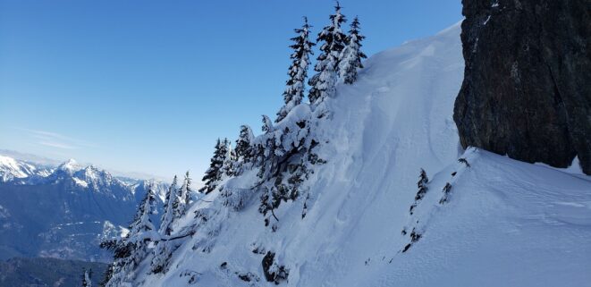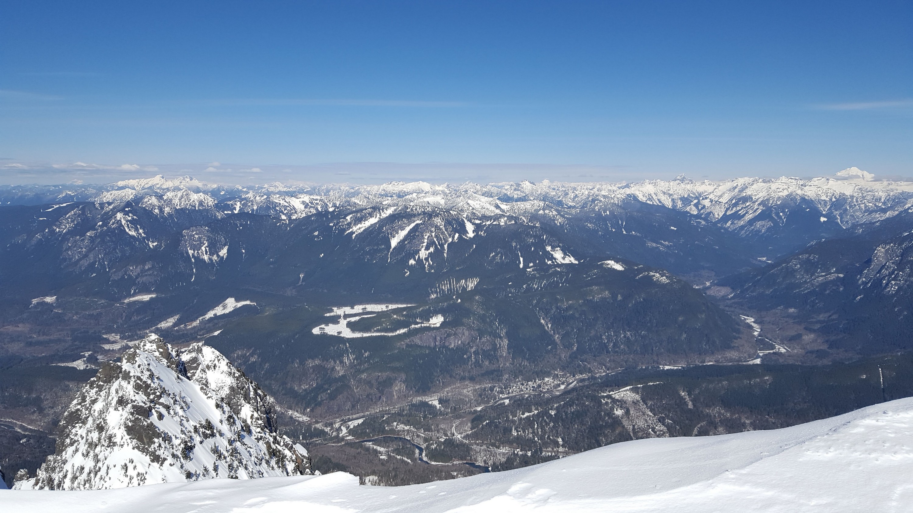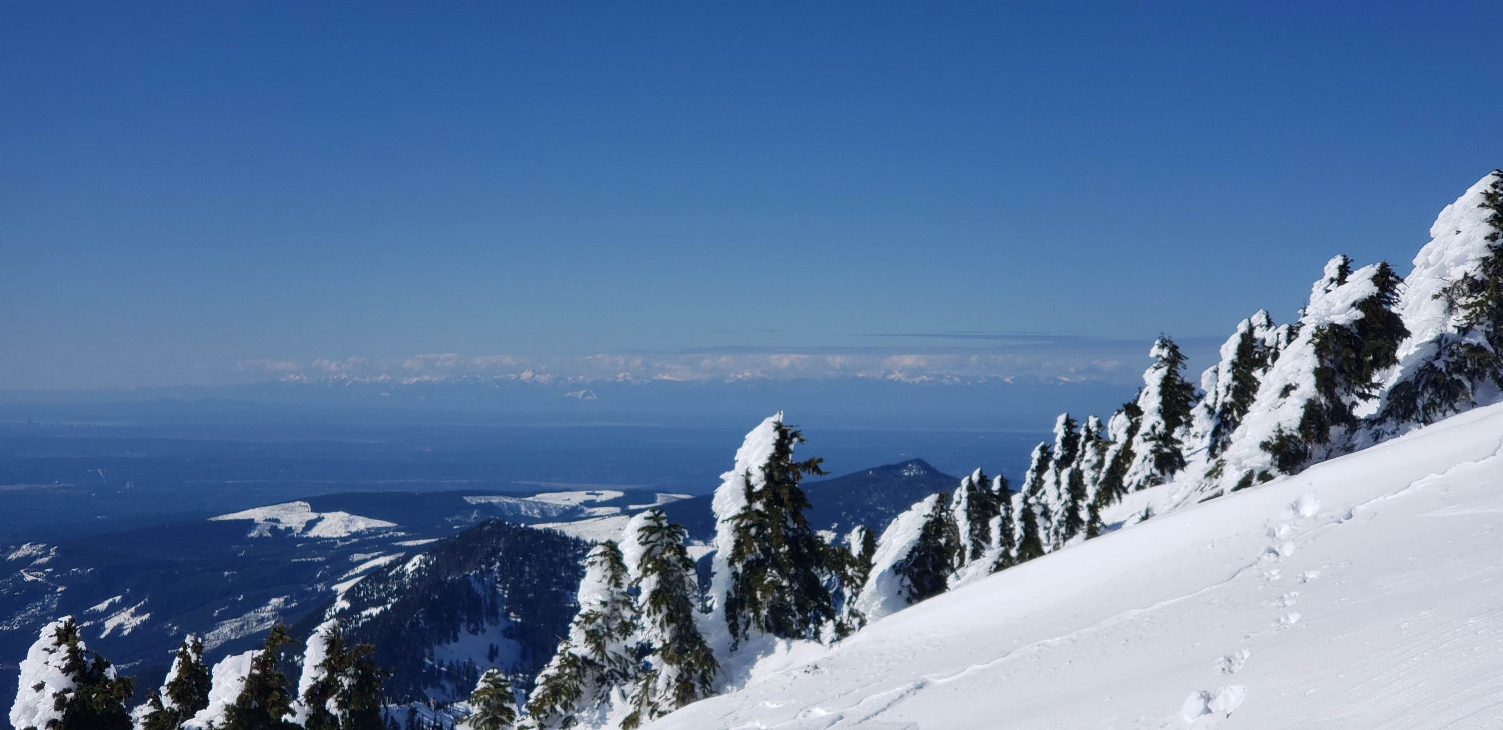 It was a glorious scene when we topped out of the couloir, and we started the now easy walk on firm wind blown snow back to the west on the broad ridge. The air was so clear we could see Seattle, and all of Puget sound to the west, and the Olympics beyond. The final push to the summit involved a sidehill traverse on the south side of the summit rocks and straight up the last 100 feet on 35 degree snow. I honestly couldn't believe we had made it…I do not succeed on winter summits in the Cascades very often, and Index was definitely the biggest winter Cascade peak I have actually topped out on. The weather could not have been any better, and nearly every peak was visible with crystal clear clarity. Rainier, Baker and Glacier Peak were all standing proud, and Stuart was poking above a few clouds off to the east. Definitely worth the effort!