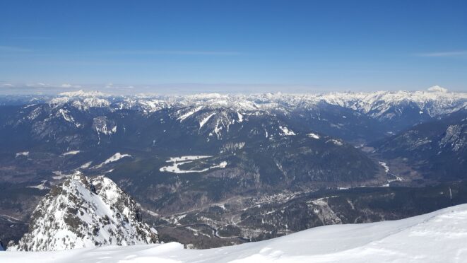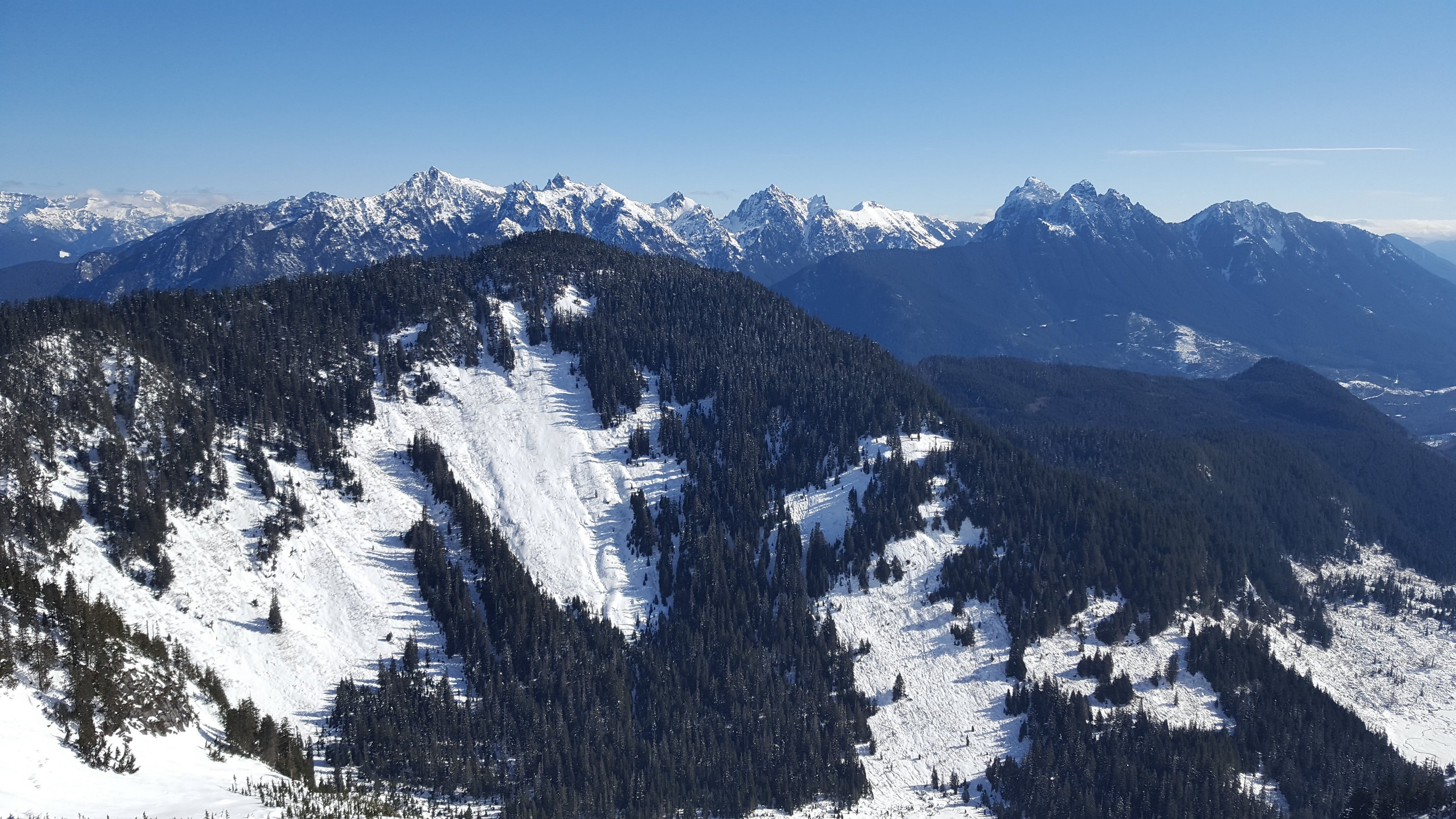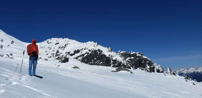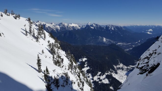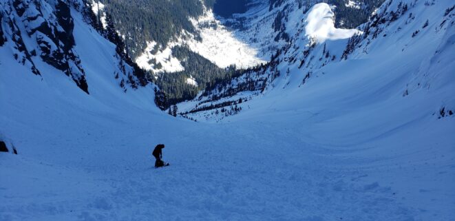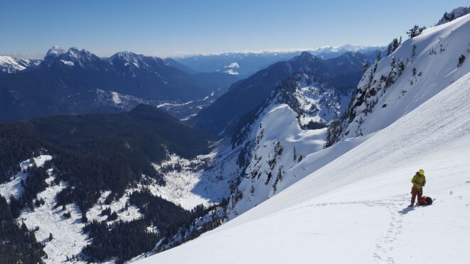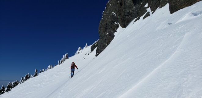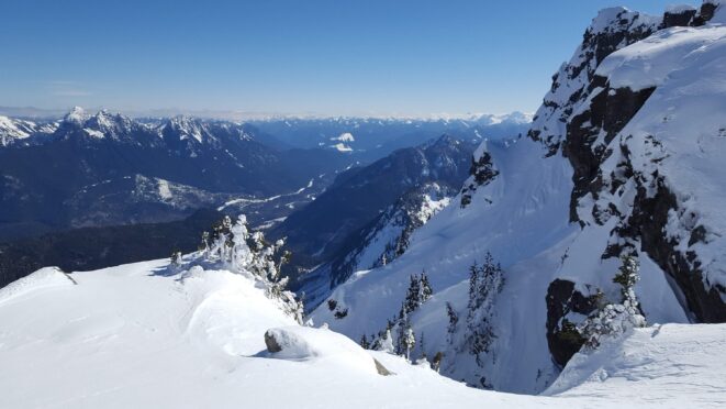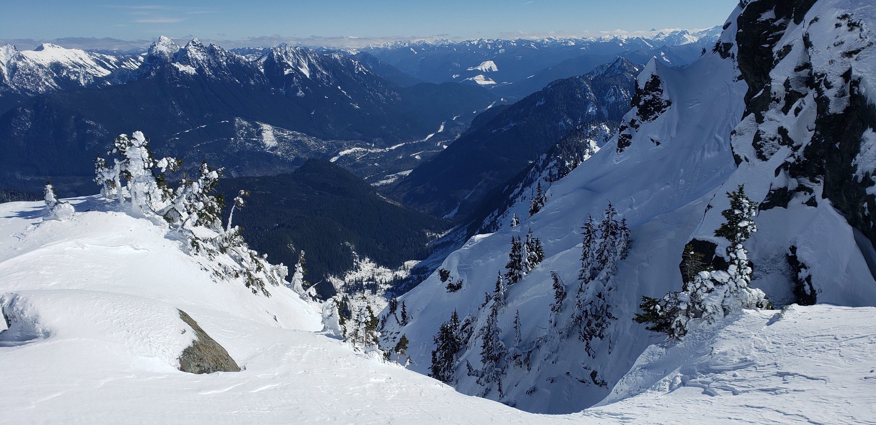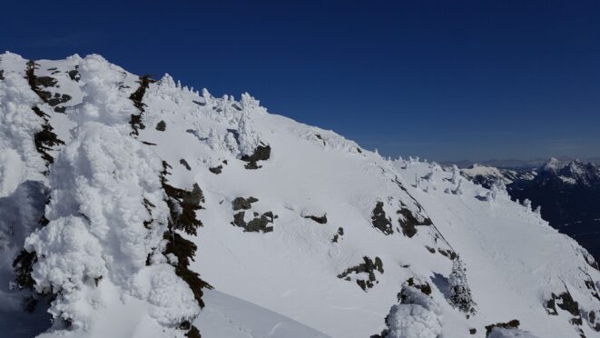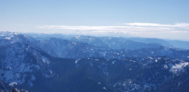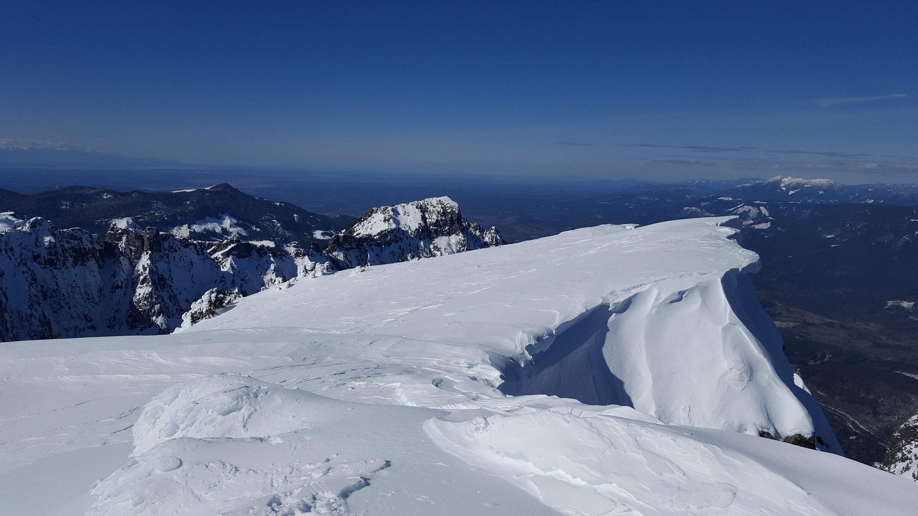 It was a glorious scene when we topped out of the couloir, and we started the now easy walk on firm wind blown snow back to the west on the broad ridge. The air was so clear we could see Seattle, and all of Puget sound to the west, and the Olympics beyond. The final push to the summit involved a sidehill traverse on the south side of the summit rocks and straight up the last 100 feet on 35 degree snow. I honestly couldn't believe we had made it…I do not succeed on winter summits in the Cascades very often, and Index was definitely the biggest winter Cascade peak I have actually topped out on. The weather could not have been any better, and nearly every peak was visible with crystal clear clarity. Rainier, Baker and Glacier Peak were all standing proud, and Stuart was poking above a few clouds off to the east. Definitely worth the effort!