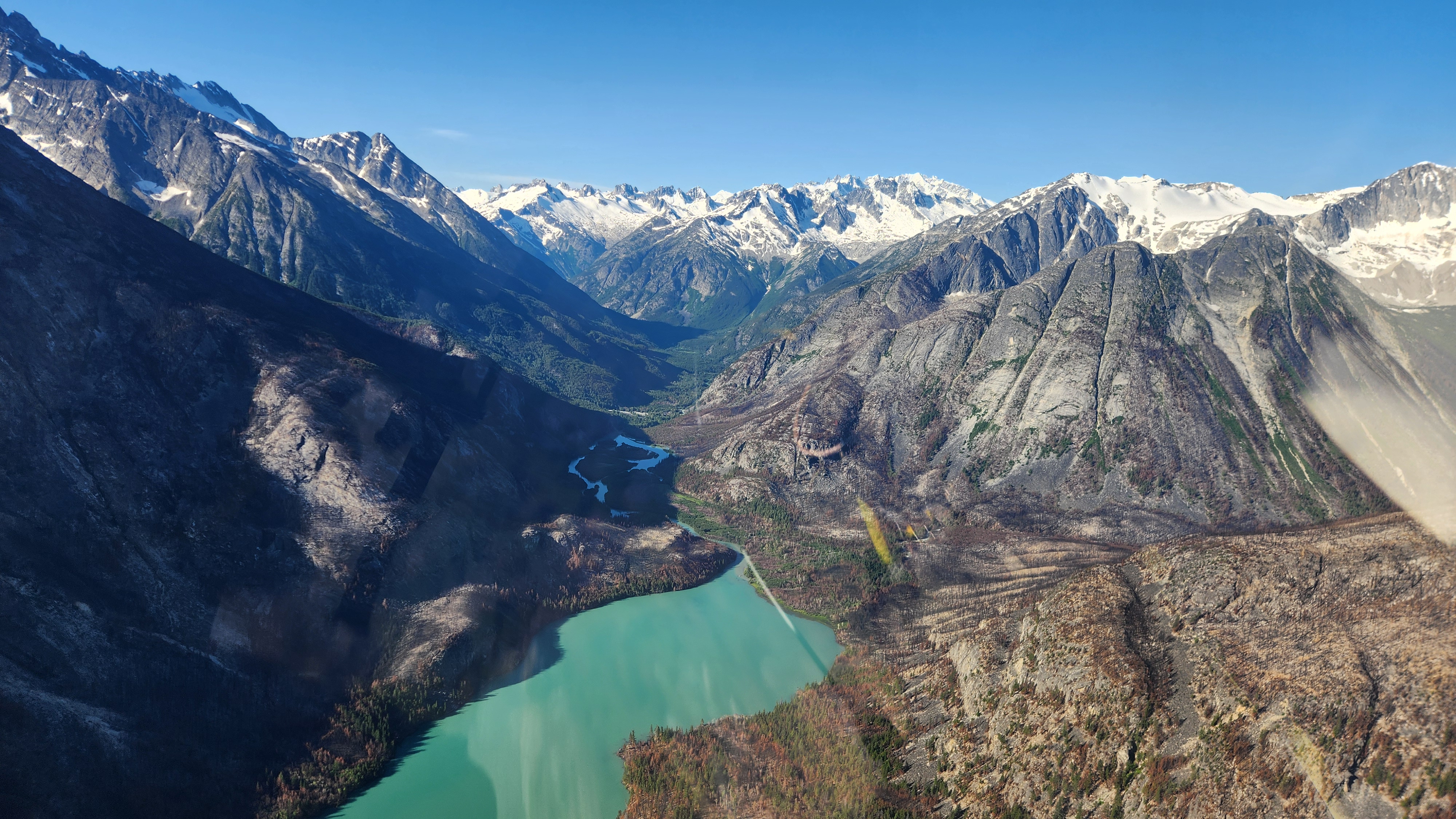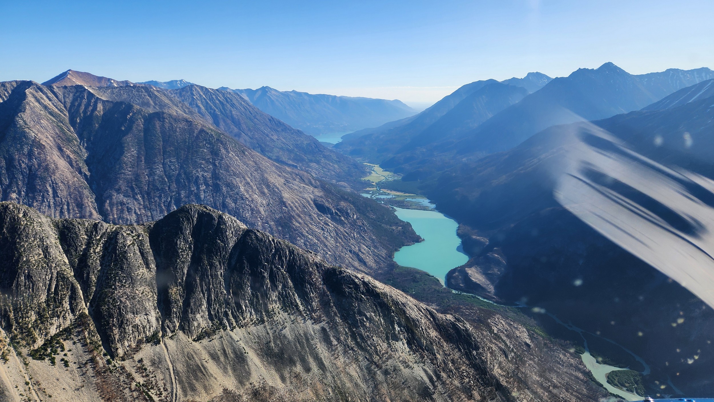 At 7am on the 12th, we loaded the car and finished the final 30 minute drive to Bluff Lake and thankfully saw the helicopter parked at the White Saddle hangar. Mike was there getting things ready and a sigh of relief came upon us. It was at this time we finally felt the summit was in the bag, and Sarah would be able to knock out her 40th 50 classic route...literally, the crux was over. We loaded up and Mike briefed us, and two young guys working on his new hangar also joined us for the flight into the Dais Glacier since they had never rode a chopper before. That is one cool thing Mike seems to do is let others get a free heli ride when it's already paid for. In early July 2019 myself and two friends camped out on the shore of Bluff Lake for week on Mike's property. We made plans to try the south face then, but the weather was such garbage that whole season we didn't bother flying in and eventually just left. Made that whole drive for nothing, but just before we left, Mike offered us a free ride as he was going in to resupply a NOLS group. Super cool. Looking back on it after completing the climb though it's for the best we didn't try the SW face with a team of 3 people.