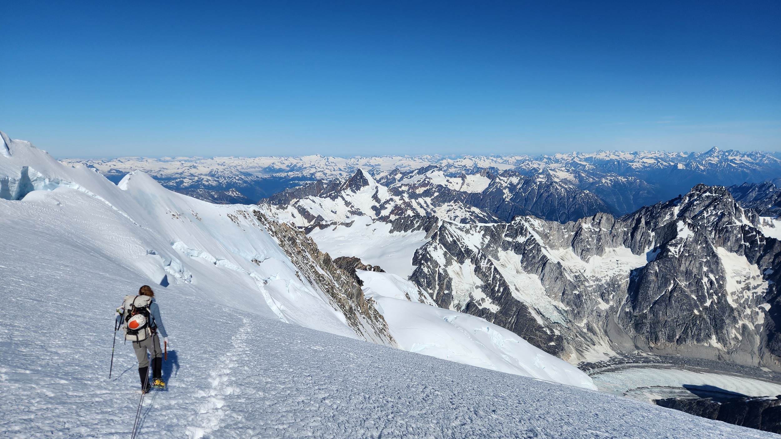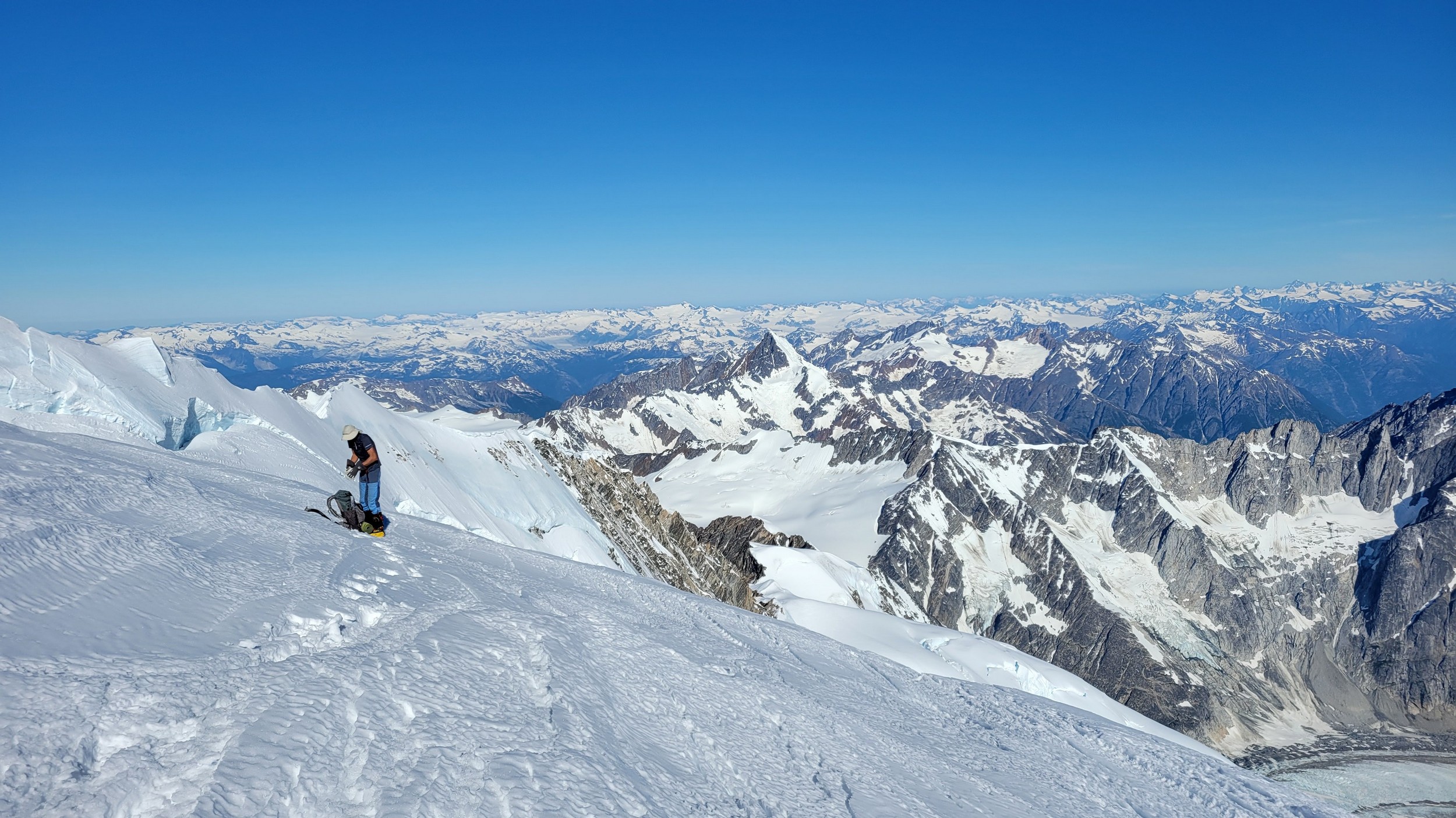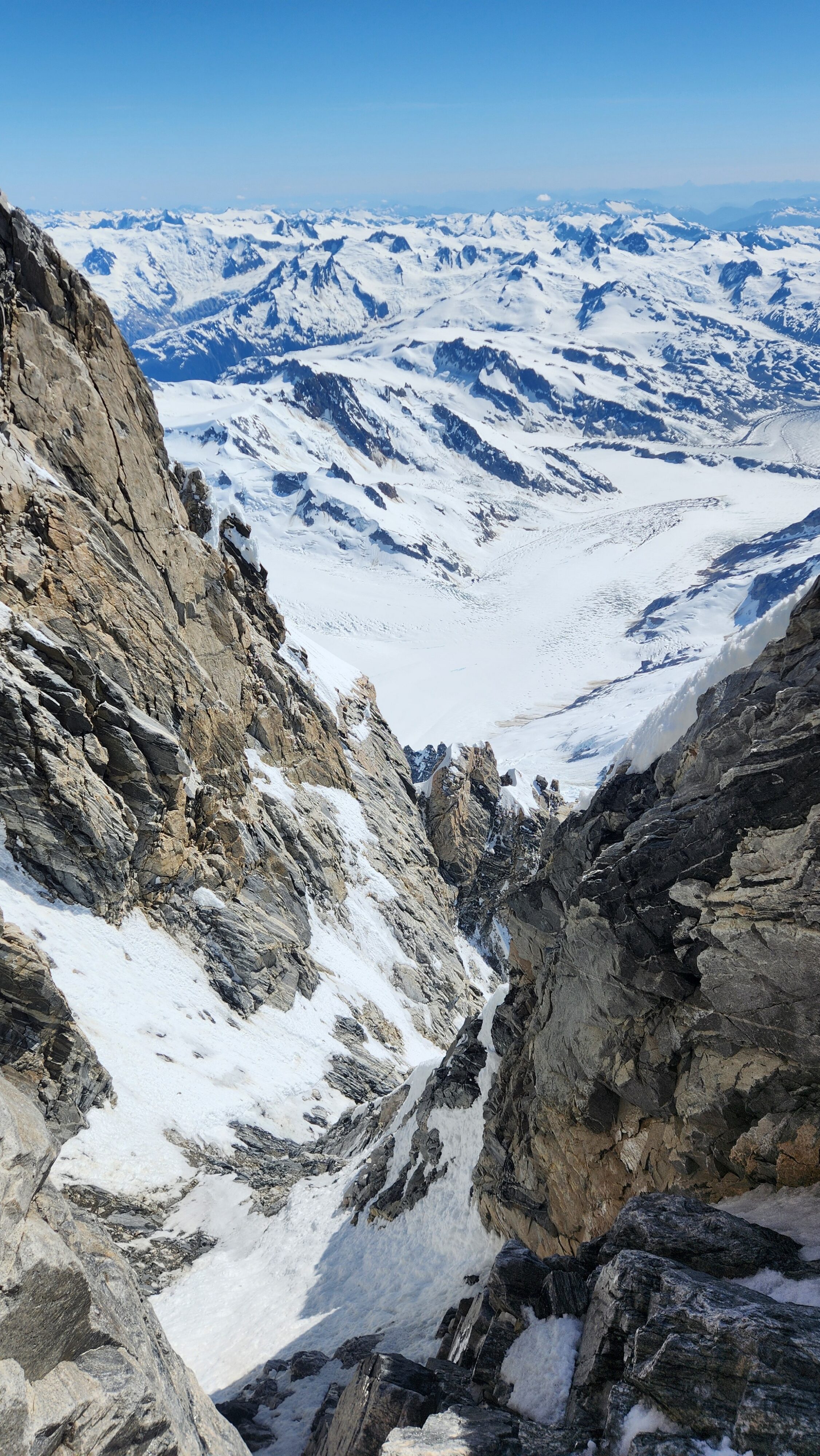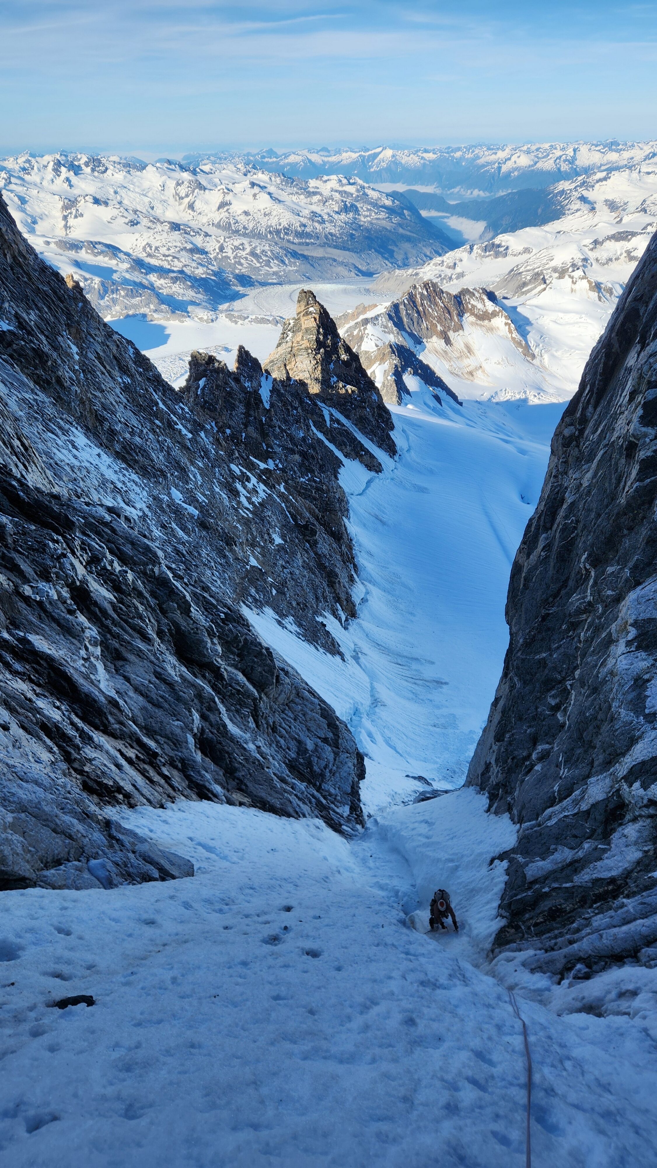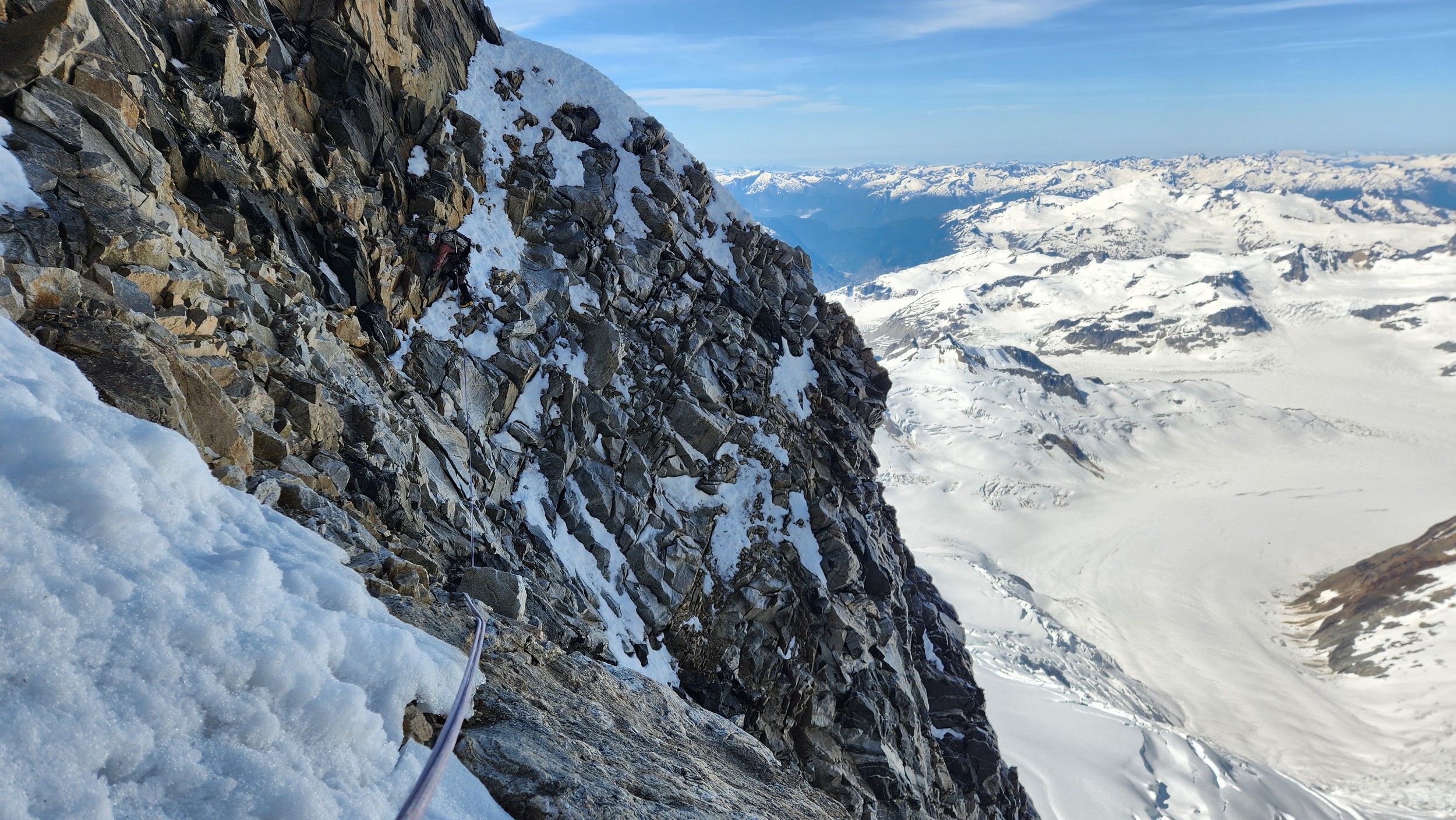 The thought that kept running through our minds was this was literally going to be the best time in our lives to climb this thing, and we might get skunked again due to fires and no available heli access. Seriously, I cannot think of a single other time at least since I have been actively climbing mountains that 3 weeks of stable weather hit the Waddington Range. I had often recalled a quote I heard Fred Beckey make in one of his talks I watched early in my mountaineering career that he believed Mount Waddington was the most important peak in North Amercia. Whether that had some bias on his end or not (if you have not read the Climbing magazine article about his monumental effort to get the second ascent of the mountain, definitely check it out), I can certainly understand where he came from with that statement. No other peak on the continent with such major prominence is more difficult to reach the summit. With 10,758 feet of prominence, Mount Waddington is one of only 17 peaks on the continent with over 3000 meters of prominence, but is without a doubt the most technical, and certainly has a feeling that you really are on a big scary mountain. Comparing to Fairweather, where we were for certain the only souls for dozens of miles in all directions, the feeling of vulnerability on the SW face of Waddington far surpassed anything I felt on Fairweather even though I heard another party on the summit just a few hours before we reached the top. There were other people merely a handful of meters away as we were high on the mountain, but it did not do much to curb the feeling we were totally alone.