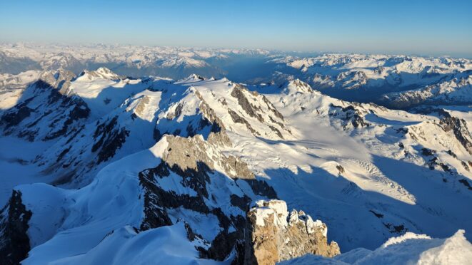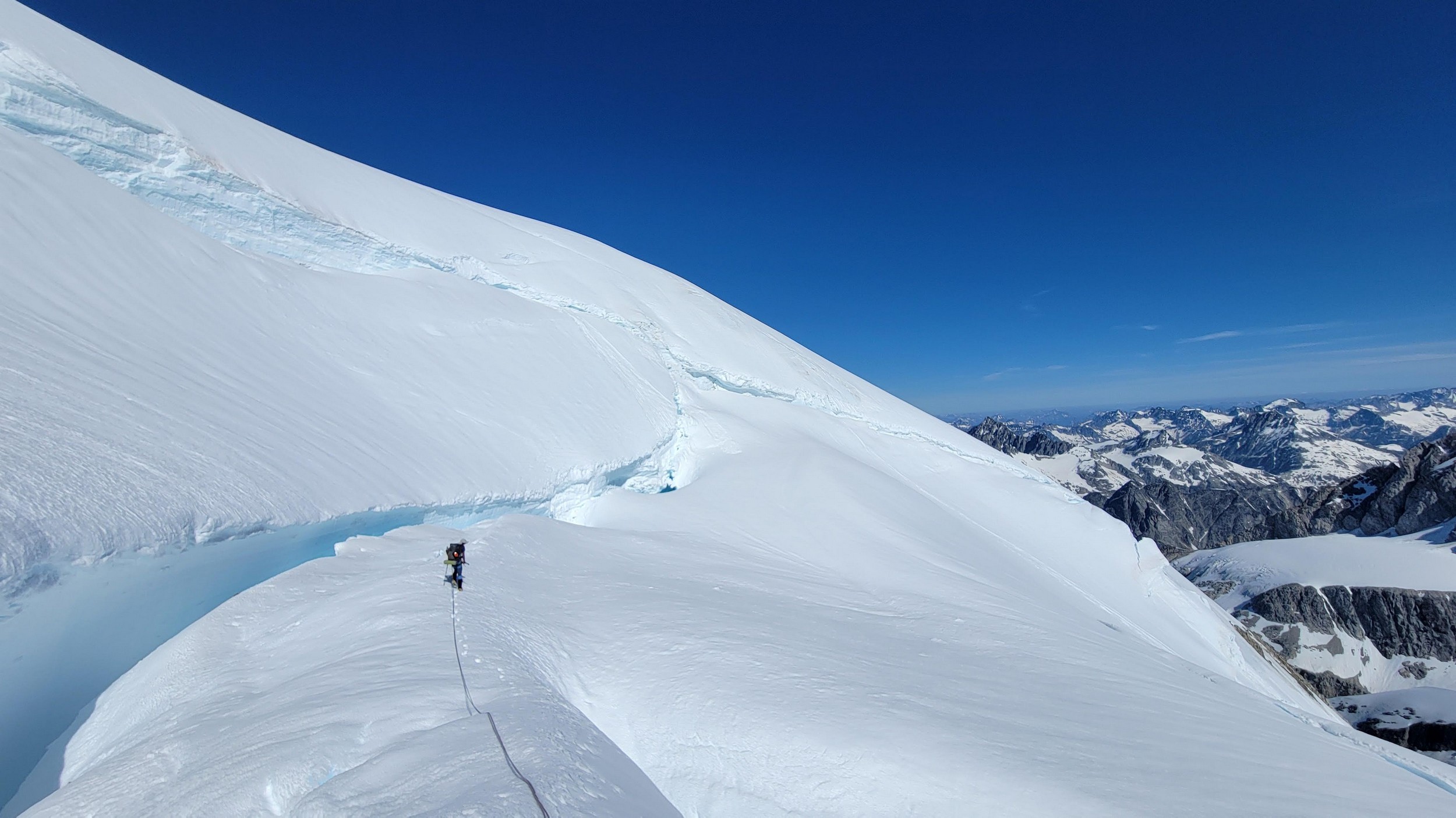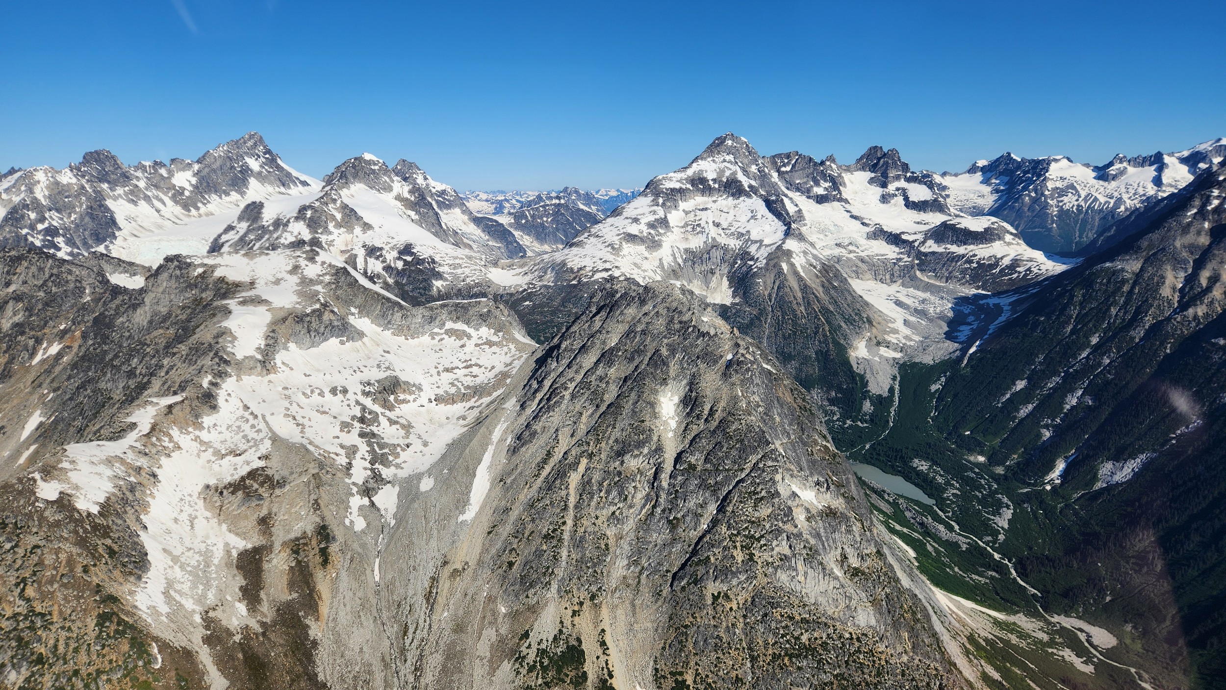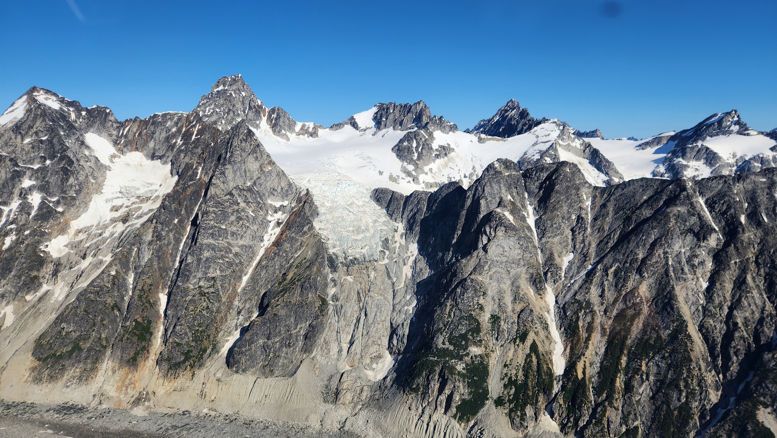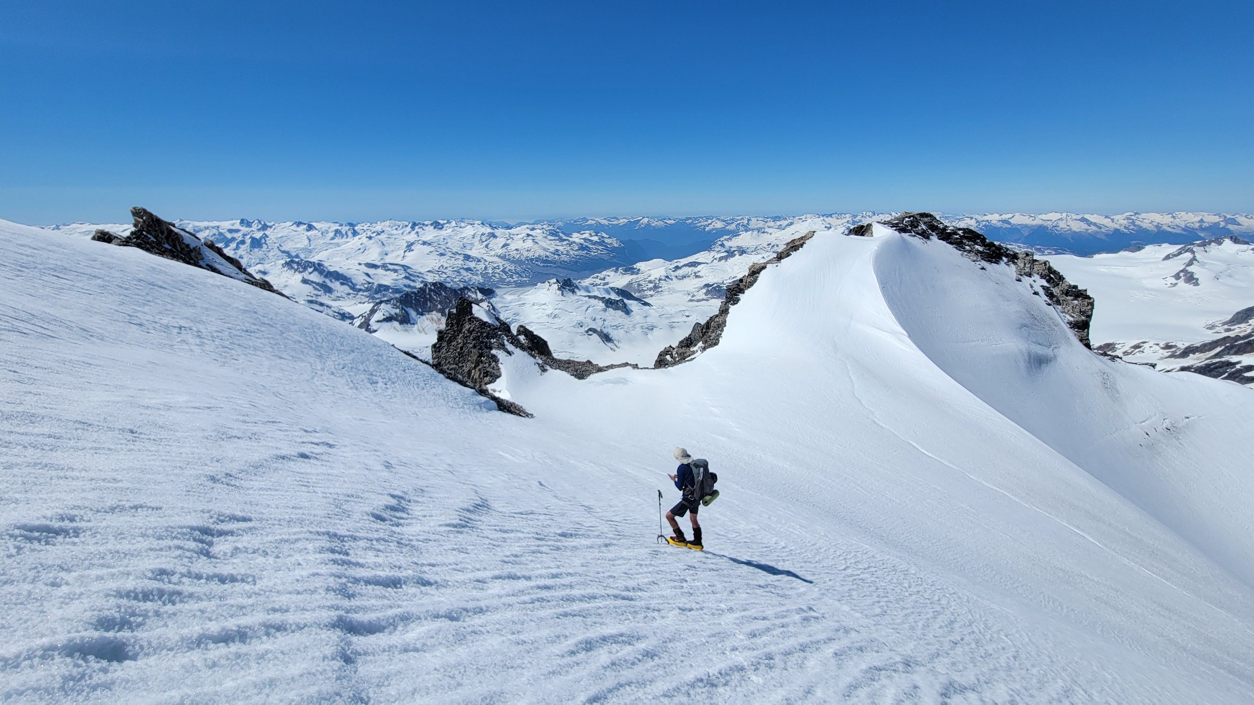 The thought that kept running through our minds was this was literally going to be the best time in our lives to climb this thing, and we might get skunked again due to fires and no available heli access. Seriously, I cannot think of a single other time at least since I have been actively climbing mountains that 3 weeks of stable weather hit the Waddington Range. I had often recalled a quote I heard Fred Beckey make in one of his talks I watched early in my mountaineering career that he believed Mount Waddington was the most important peak in North Amercia. Whether that had some bias on his end or not (if you have not read the Climbing magazine article about his monumental effort to get the second ascent of the mountain, definitely check it out), I can certainly understand where he came from with that statement. No other peak on the continent with such major prominence is more difficult to reach the summit. With 10,758 feet of prominence, Mount Waddington is one of only 17 peaks on the continent with over 3000 meters of prominence, but is without a doubt the most technical, and certainly has a feeling that you really are on a big scary mountain. Comparing to Fairweather, where we were for certain the only souls for dozens of miles in all directions, the feeling of vulnerability on the SW face of Waddington far surpassed anything I felt on Fairweather even though I heard another party on the summit just a few hours before we reached the top. There were other people merely a handful of meters away as we were high on the mountain, but it did not do much to curb the feeling we were totally alone.