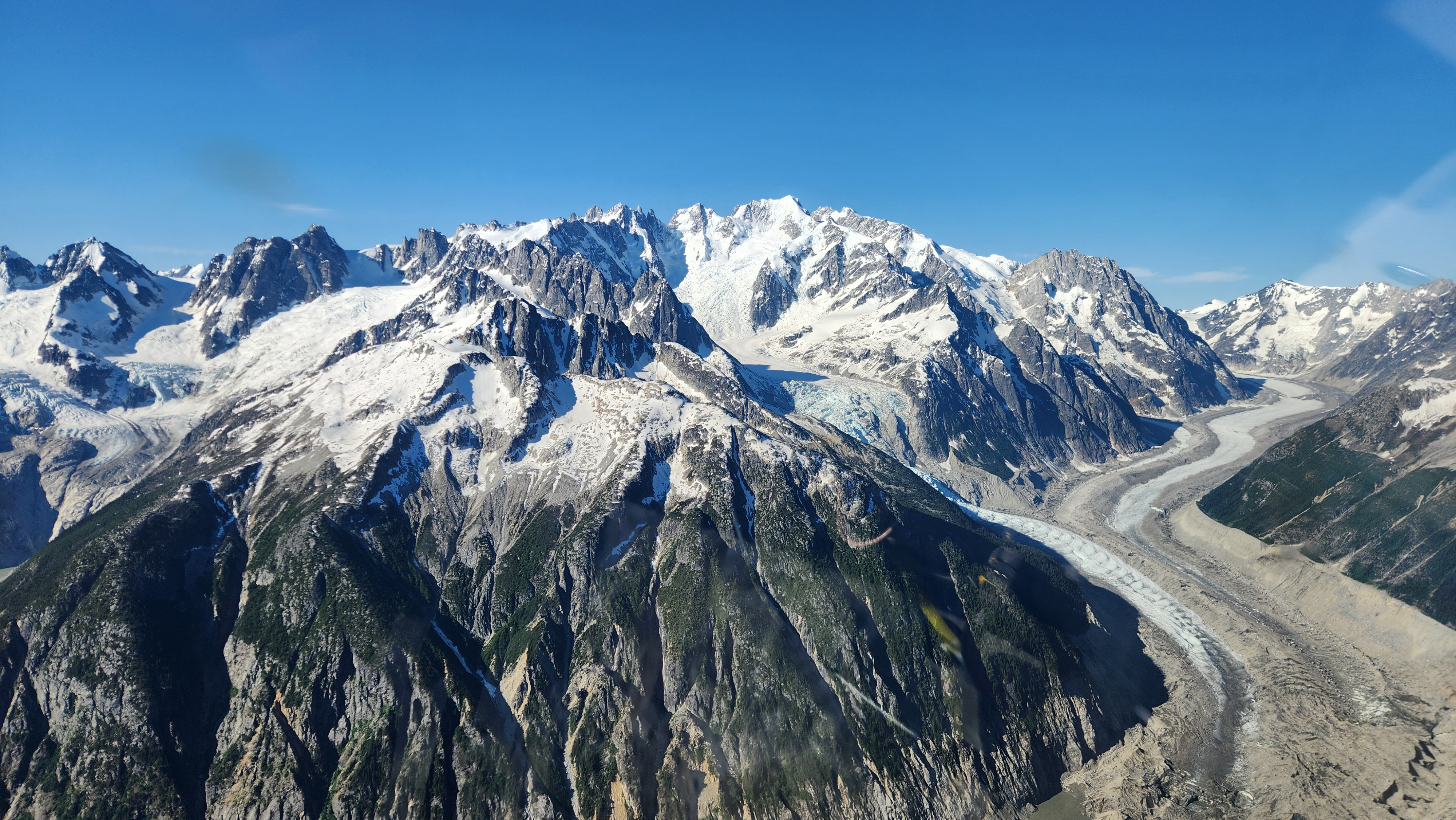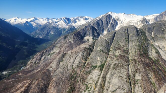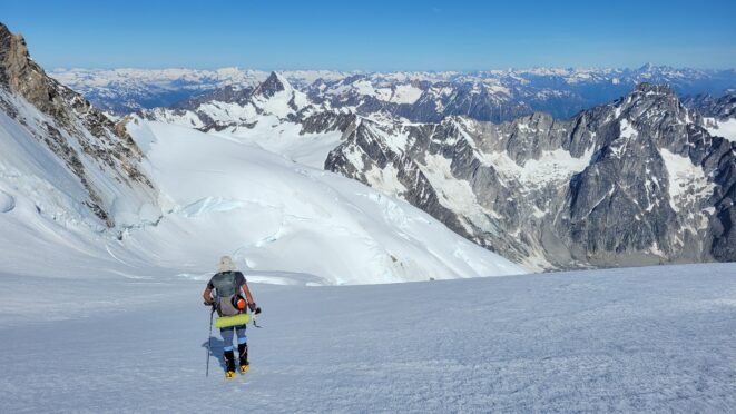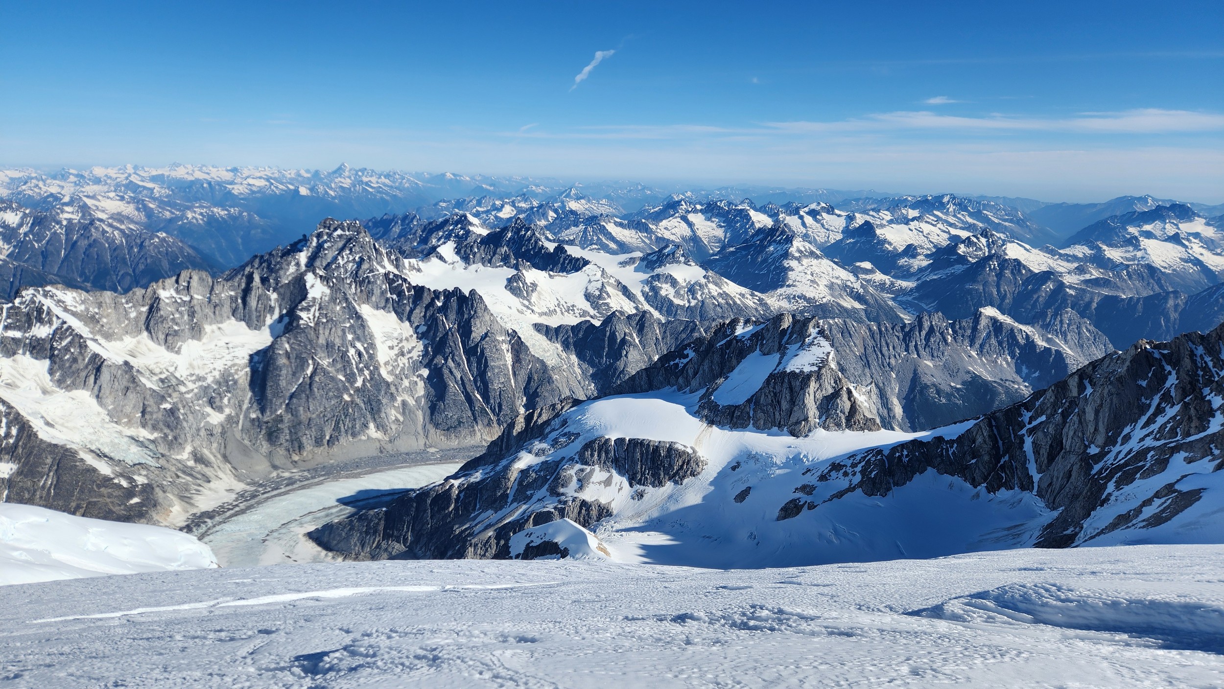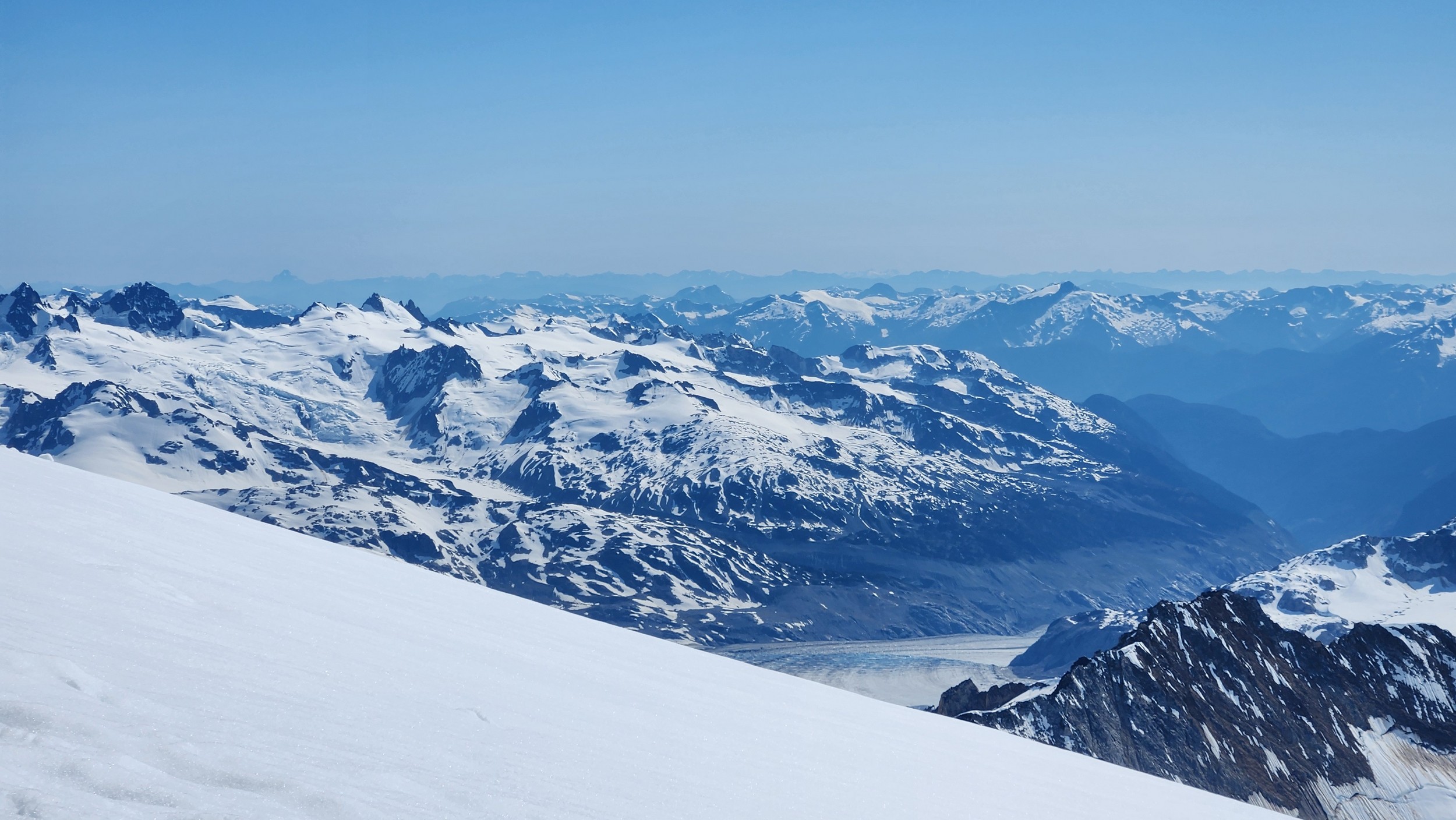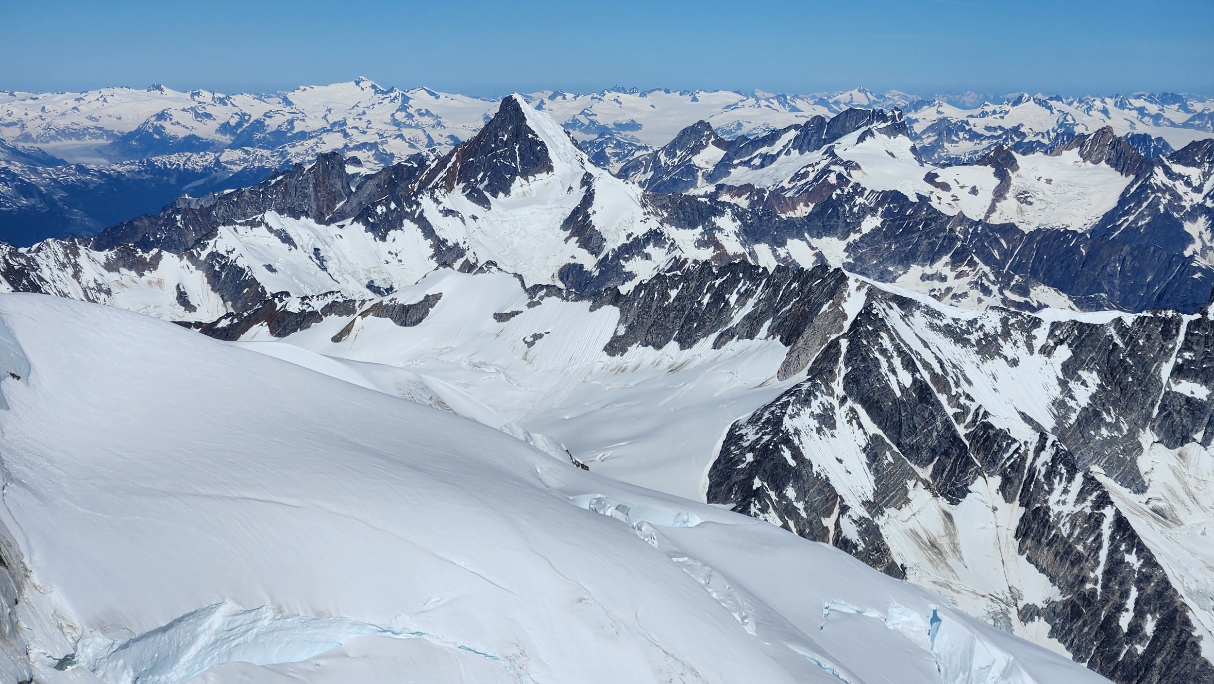 The thought that kept running through our minds was this was literally going to be the best time in our lives to climb this thing, and we might get skunked again due to fires and no available heli access. Seriously, I cannot think of a single other time at least since I have been actively climbing mountains that 3 weeks of stable weather hit the Waddington Range. I had often recalled a quote I heard Fred Beckey make in one of his talks I watched early in my mountaineering career that he believed Mount Waddington was the most important peak in North Amercia. Whether that had some bias on his end or not (if you have not read the Climbing magazine article about his monumental effort to get the second ascent of the mountain, definitely check it out), I can certainly understand where he came from with that statement. No other peak on the continent with such major prominence is more difficult to reach the summit. With 10,758 feet of prominence, Mount Waddington is one of only 17 peaks on the continent with over 3000 meters of prominence, but is without a doubt the most technical, and certainly has a feeling that you really are on a big scary mountain. Comparing to Fairweather, where we were for certain the only souls for dozens of miles in all directions, the feeling of vulnerability on the SW face of Waddington far surpassed anything I felt on Fairweather even though I heard another party on the summit just a few hours before we reached the top. There were other people merely a handful of meters away as we were high on the mountain, but it did not do much to curb the feeling we were totally alone.