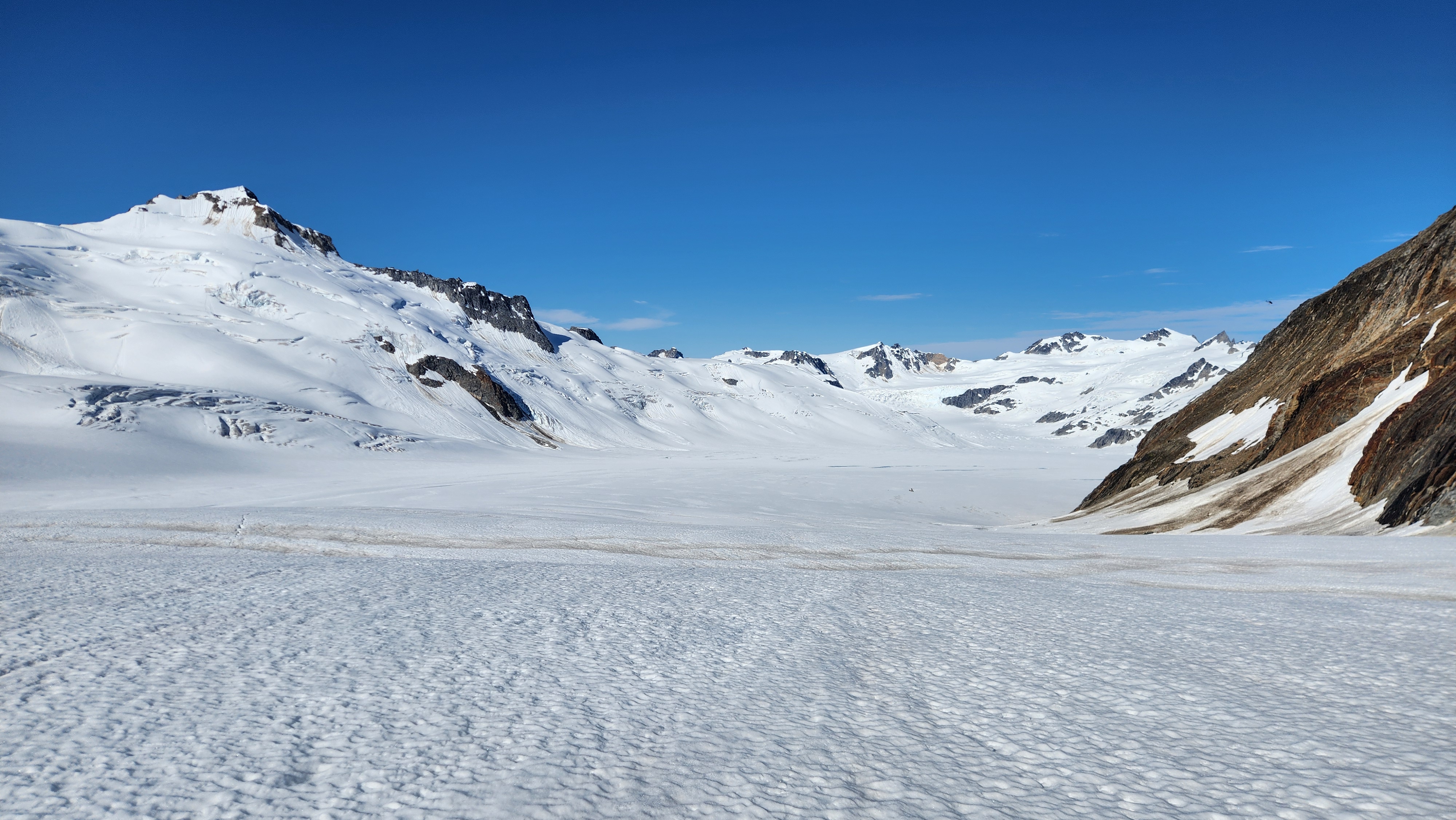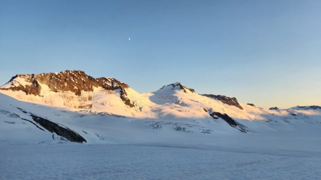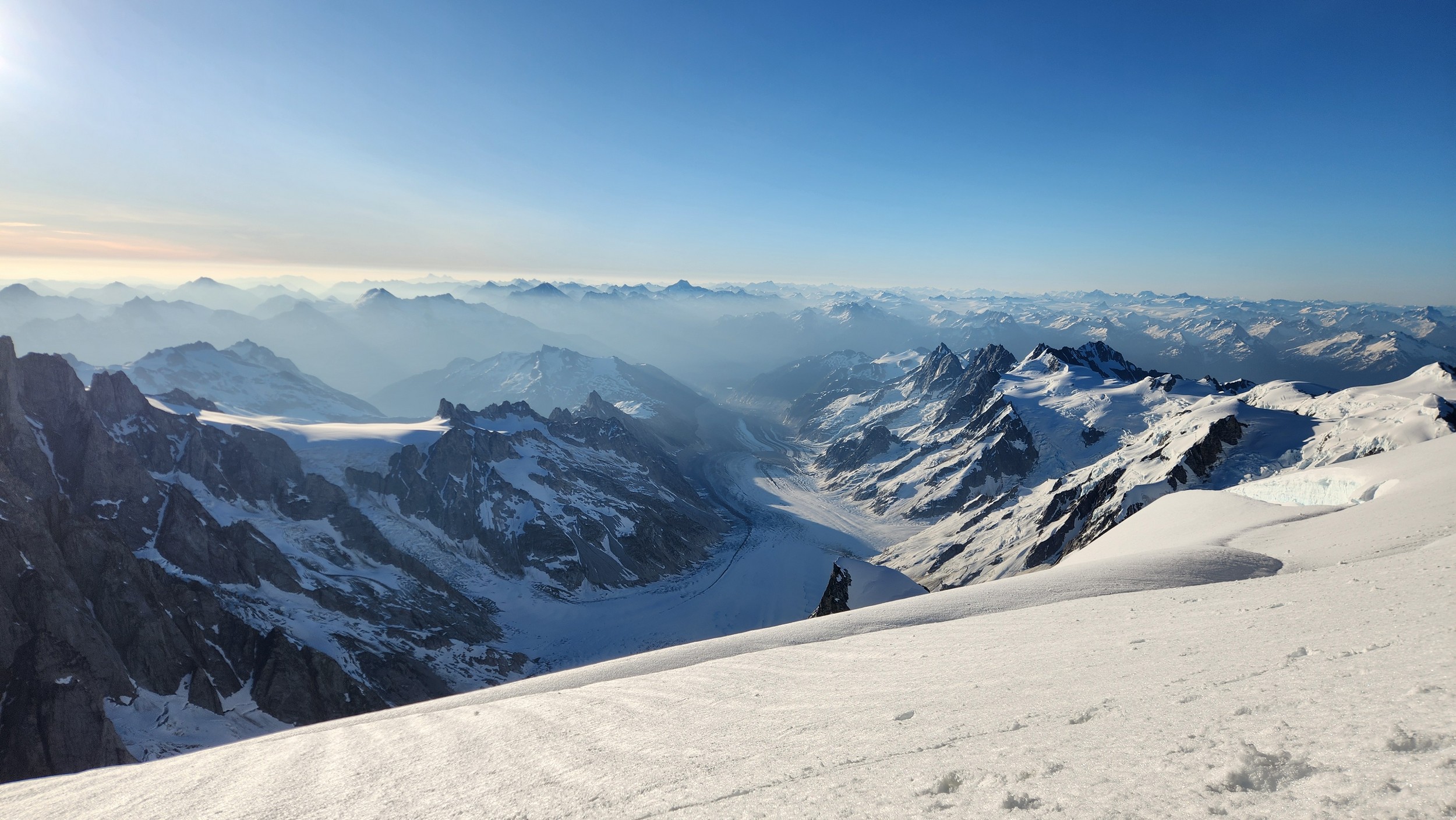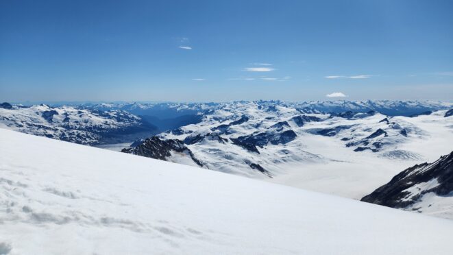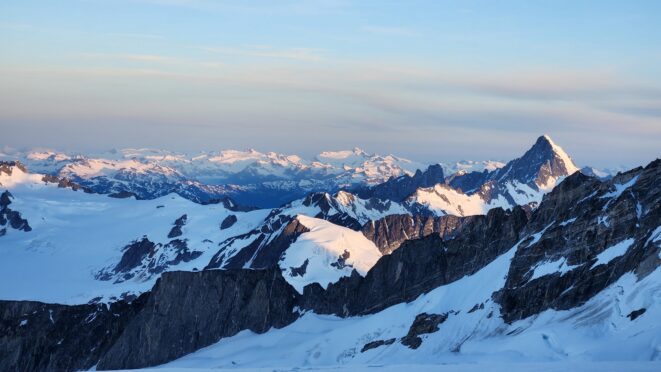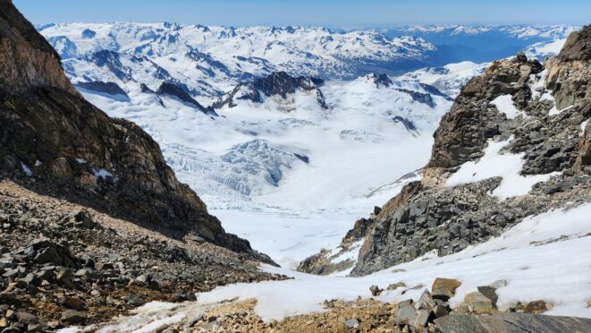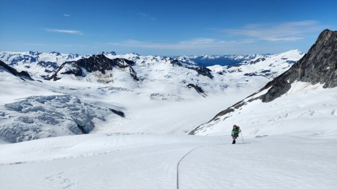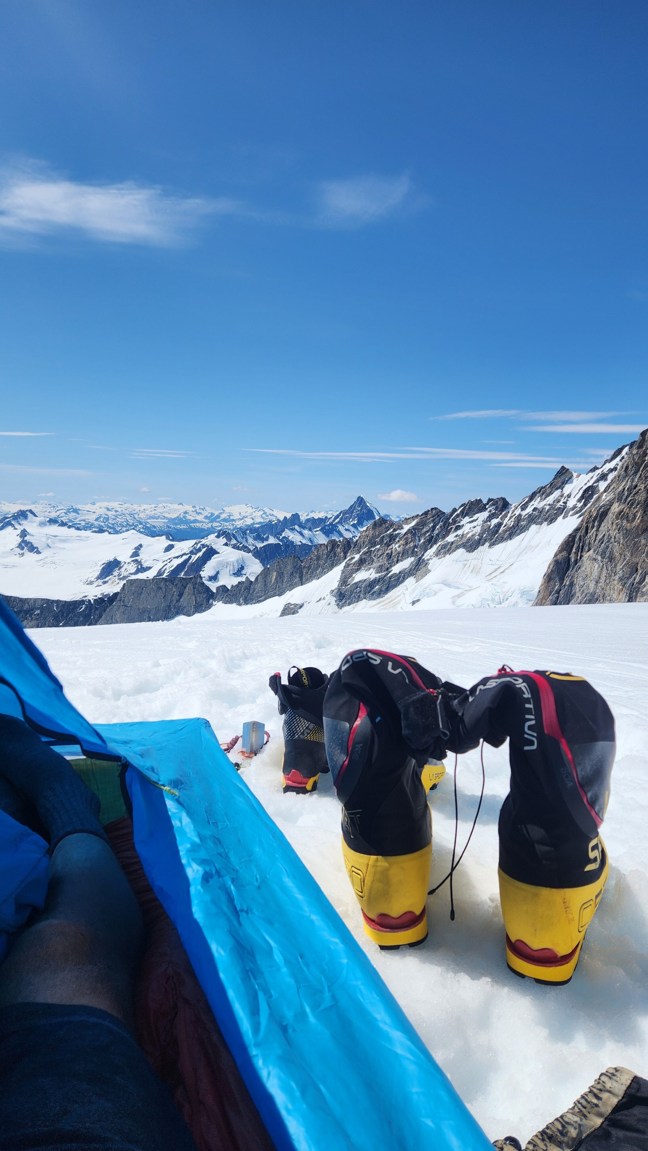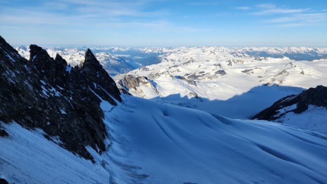 The sky transitioned to light after just a few hours and by 7am I had already climbed out to look to the east and get a good look around. We still had a decent ways to get back to our base camp as we needed to traverse the Stroll north and up to the Angel Shoulder. That part ended up being pretty easy as we were able to just follow footsteps from Langdon's descent. We reascended about 400 feet, then crossed the shoulder and started down the upper Angel Glacier and we saw their camp on Combatant col as we made our way down the Angel Glacier. Instead of following their tracks to the right and down the steep snow directly to the col (via a route called The Tunnel), we continued all the way down the Angel Glacier in a northwest direction to where it starts curving to the right. We then had to make two large crevasse crossings on serviceable snow bridges before reascending a couple hundred feet westward towards Councillor Peak. We jumped one last crevasse before reaching the top of the couloir that would drop us back down onto the Dais Glacier (route 190 in the Waddington guide). Descending this couloir was actually really straightforward plunge stepping. The unfortunate part was the snow on the Dais became quite sloppy in the afternoon as we made our way back down to our base camp, so it took longer than we had hoped and we were told we'd need to wait until the following morning for our helicopter pickup. Not an issue though as the weather was still great and we had plenty of food and drinks stored at the base camp. A gorgeous afternoon of lounging around the tent was had and by 7am the next morning we were picked up and back at White Saddle 45 minutes later. Overall an insanely great success, and one I will never forget.