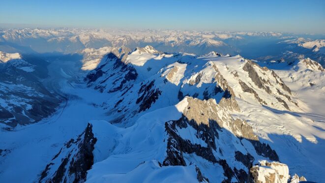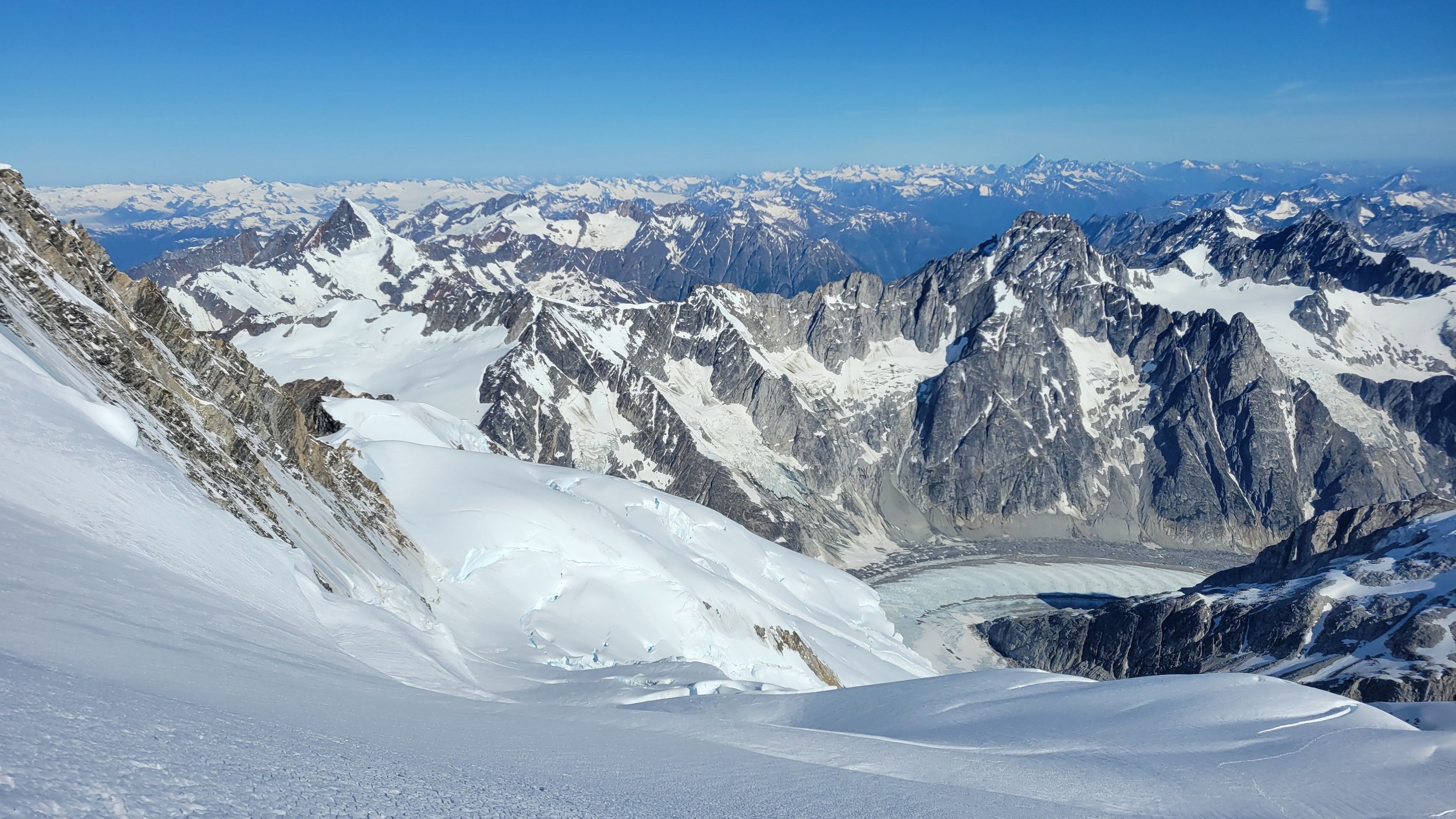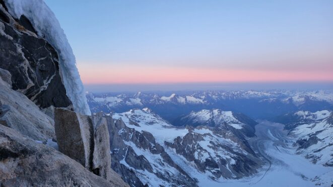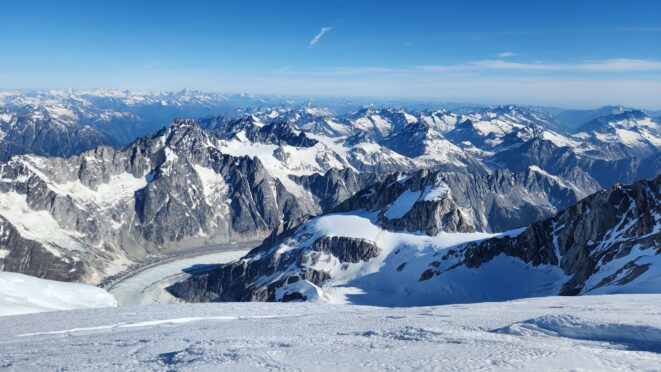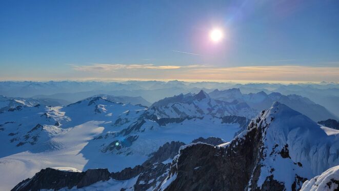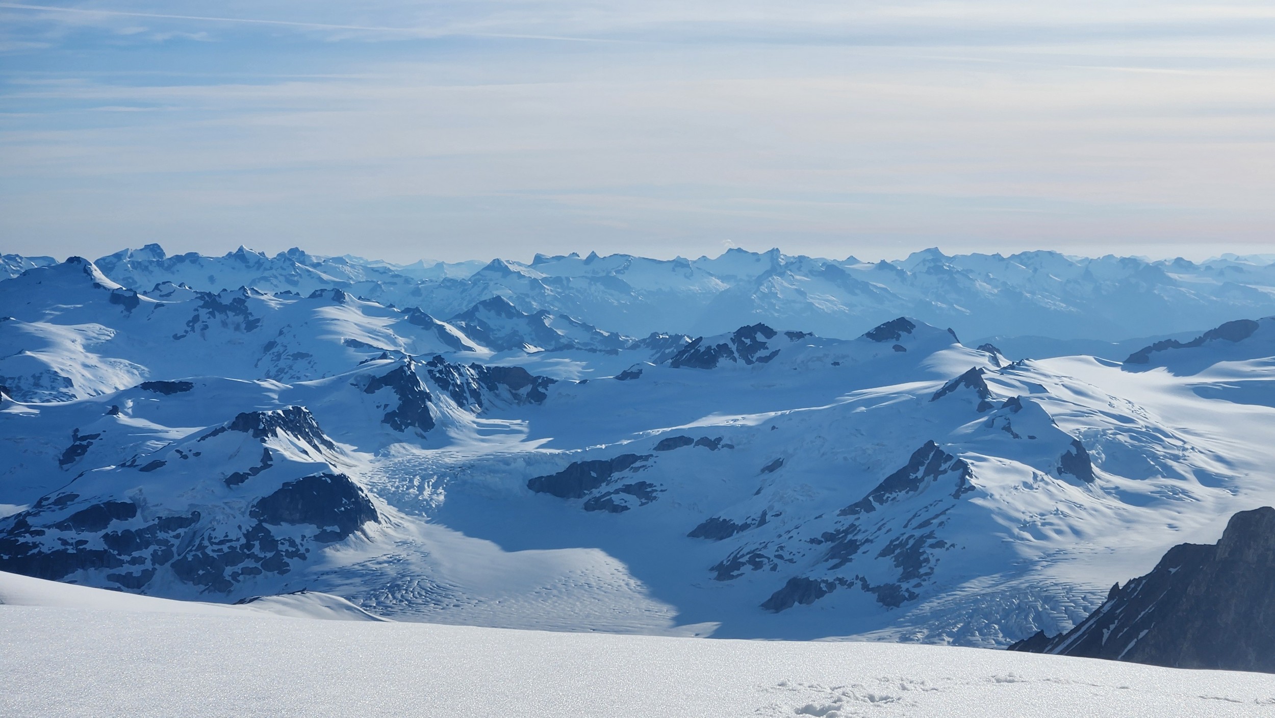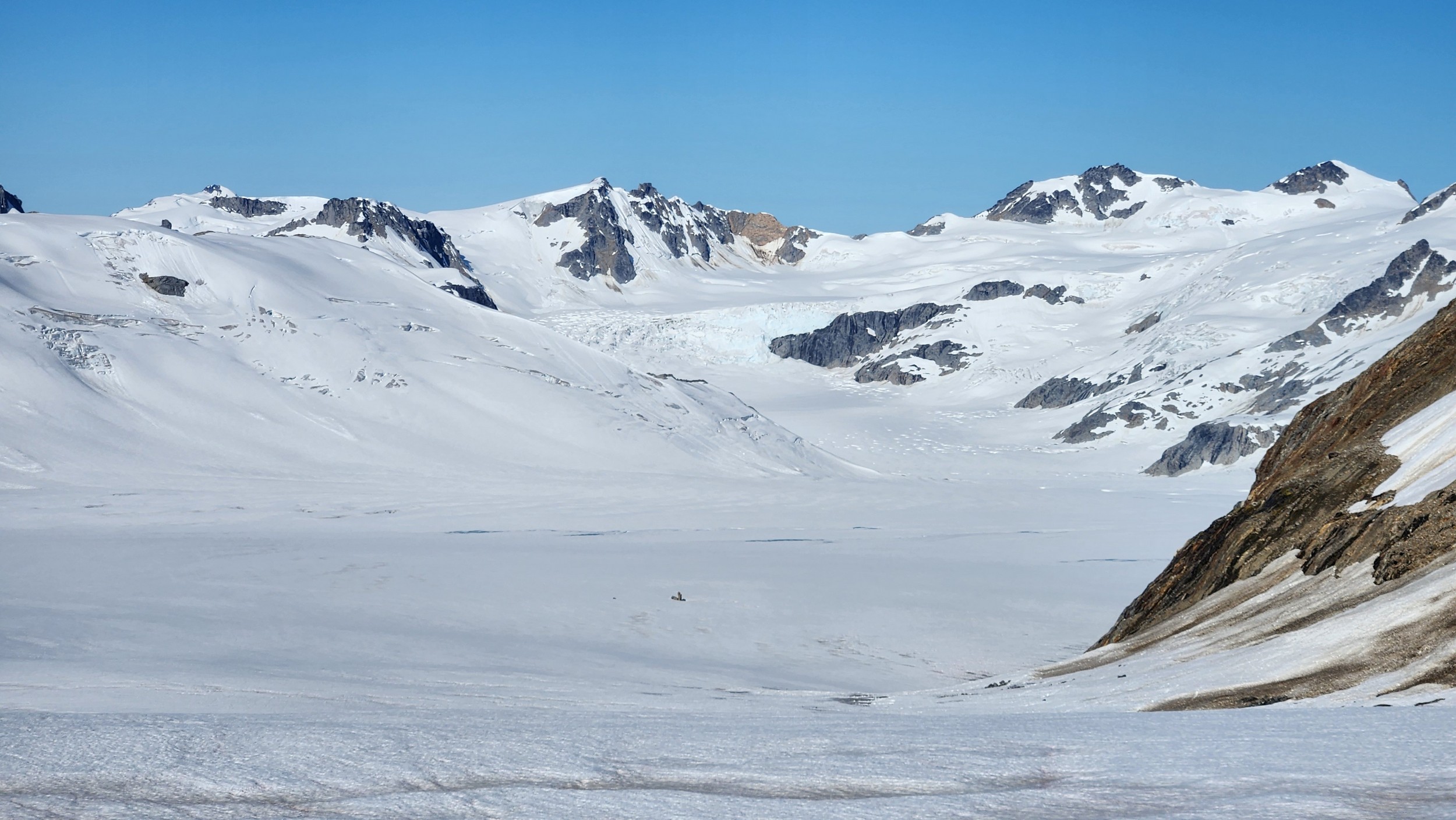 The sky transitioned to light after just a few hours and by 7am I had already climbed out to look to the east and get a good look around. We still had a decent ways to get back to our base camp as we needed to traverse the Stroll north and up to the Angel Shoulder. That part ended up being pretty easy as we were able to just follow footsteps from Langdon's descent. We reascended about 400 feet, then crossed the shoulder and started down the upper Angel Glacier and we saw their camp on Combatant col as we made our way down the Angel Glacier. Instead of following their tracks to the right and down the steep snow directly to the col (via a route called The Tunnel), we continued all the way down the Angel Glacier in a northwest direction to where it starts curving to the right. We then had to make two large crevasse crossings on serviceable snow bridges before reascending a couple hundred feet westward towards Councillor Peak. We jumped one last crevasse before reaching the top of the couloir that would drop us back down onto the Dais Glacier (route 190 in the Waddington guide). Descending this couloir was actually really straightforward plunge stepping. The unfortunate part was the snow on the Dais became quite sloppy in the afternoon as we made our way back down to our base camp, so it took longer than we had hoped and we were told we'd need to wait until the following morning for our helicopter pickup. Not an issue though as the weather was still great and we had plenty of food and drinks stored at the base camp. A gorgeous afternoon of lounging around the tent was had and by 7am the next morning we were picked up and back at White Saddle 45 minutes later. Overall an insanely great success, and one I will never forget.