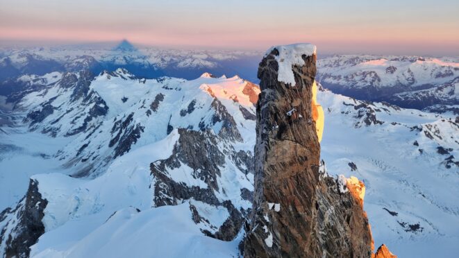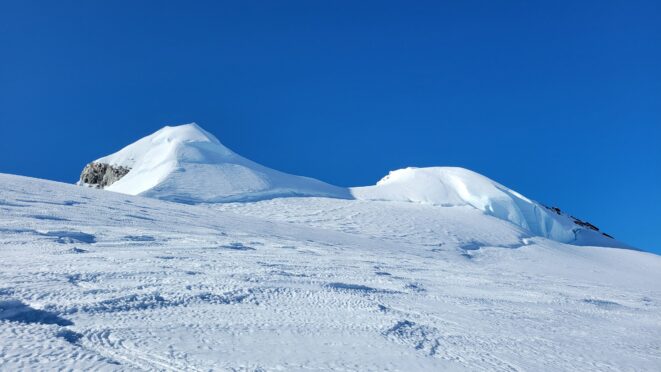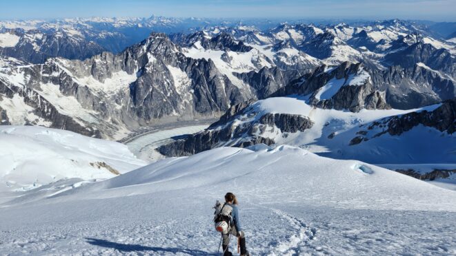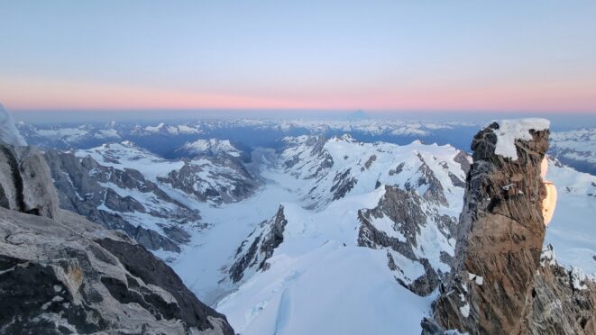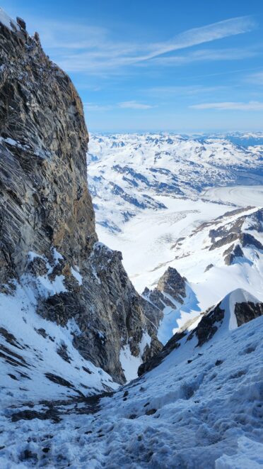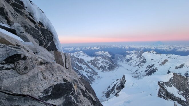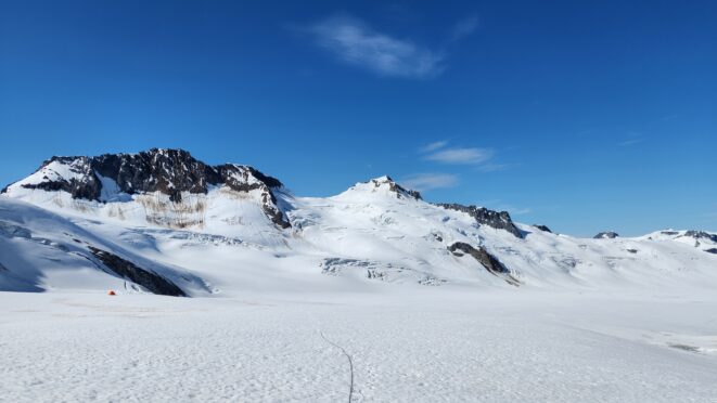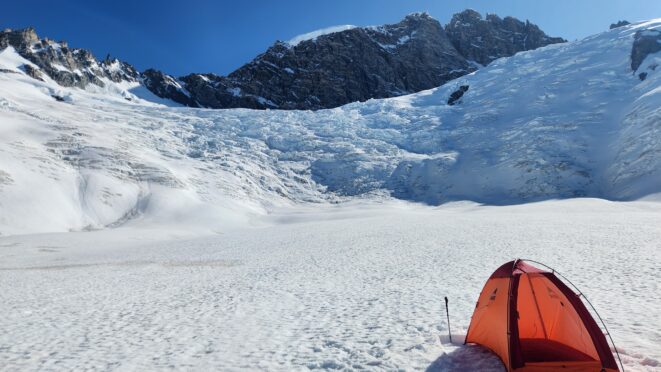 We started rapping down the standard route NE gully. Luckily since Langdon had just been on the summit a few hours prior, we had footprints in the snow to follow. We made something like 7-8 rappels down the ridge towards the Tooth, then once we reached the notch we turned skiers left and continued rapping as it got totally dark. We ended up descending route 169A in the Waddington guide. We really struggled to find anchors on this part of the descent in the dark and ended up leaving a few pieces. On top of that, it was an awfully loose pile of crap with not much in the way of climbable features, and I would not recommend this route as a bypass for the full chimney route that begins further south. Finally, by about 2am we finished the last rappel over the large bergschrund and onto the Stroll and by some miracle, Sarah found a flat spot to pitch the tent just a few steps away right at the base of a large cliff. I was too exhausted and beat to eat anything and since I was already dry heaving on those final couple rappels I already lost any appetite. We went right to sleep.