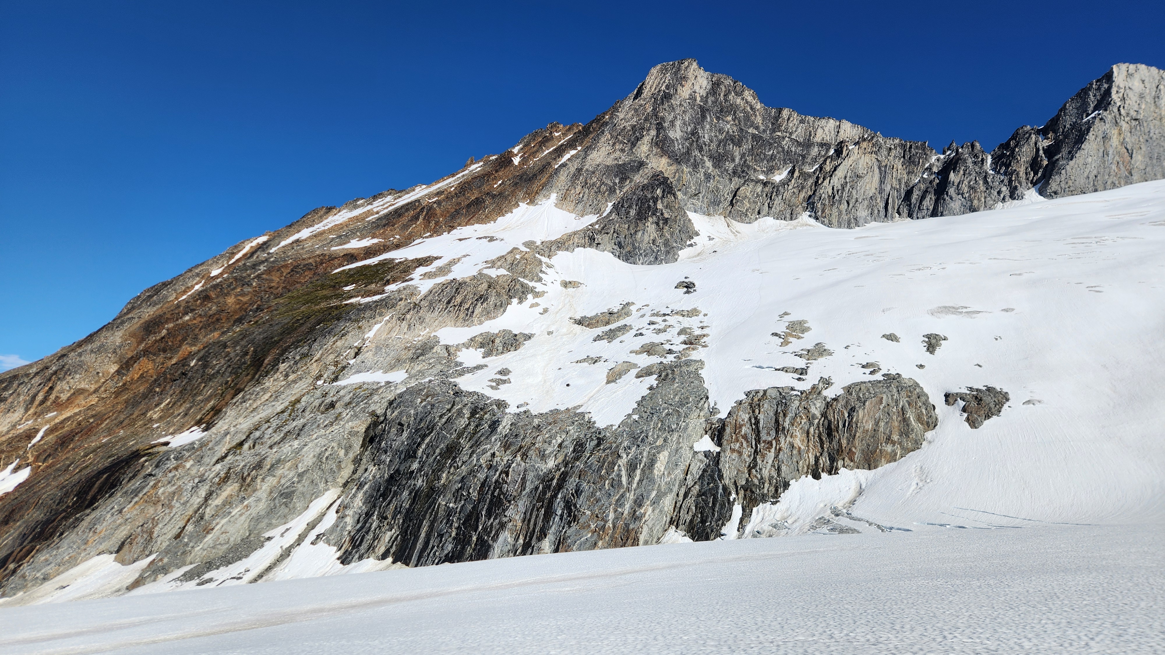 Sarah took lead and made a slabby 5.7 runout lead on nice and dry rock in the sun, followed by another lead until we hit another small snow patch that had softened a lot. My decision to leave my big boots on paid off. At this point we hit a crossroads, and Beckey traversed right into the wide amphitheater on his second ascent rather than climb the rock buttress jumping up and left. Since we were seeing large snow and ice chunks falling in this amphitheater quite often we decided to follow the original Weissner route and continue climbing moderate rock up the buttress to the left of the amphitheater. We were safer for the next few hundred feet, but we would trade off for it later.