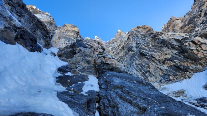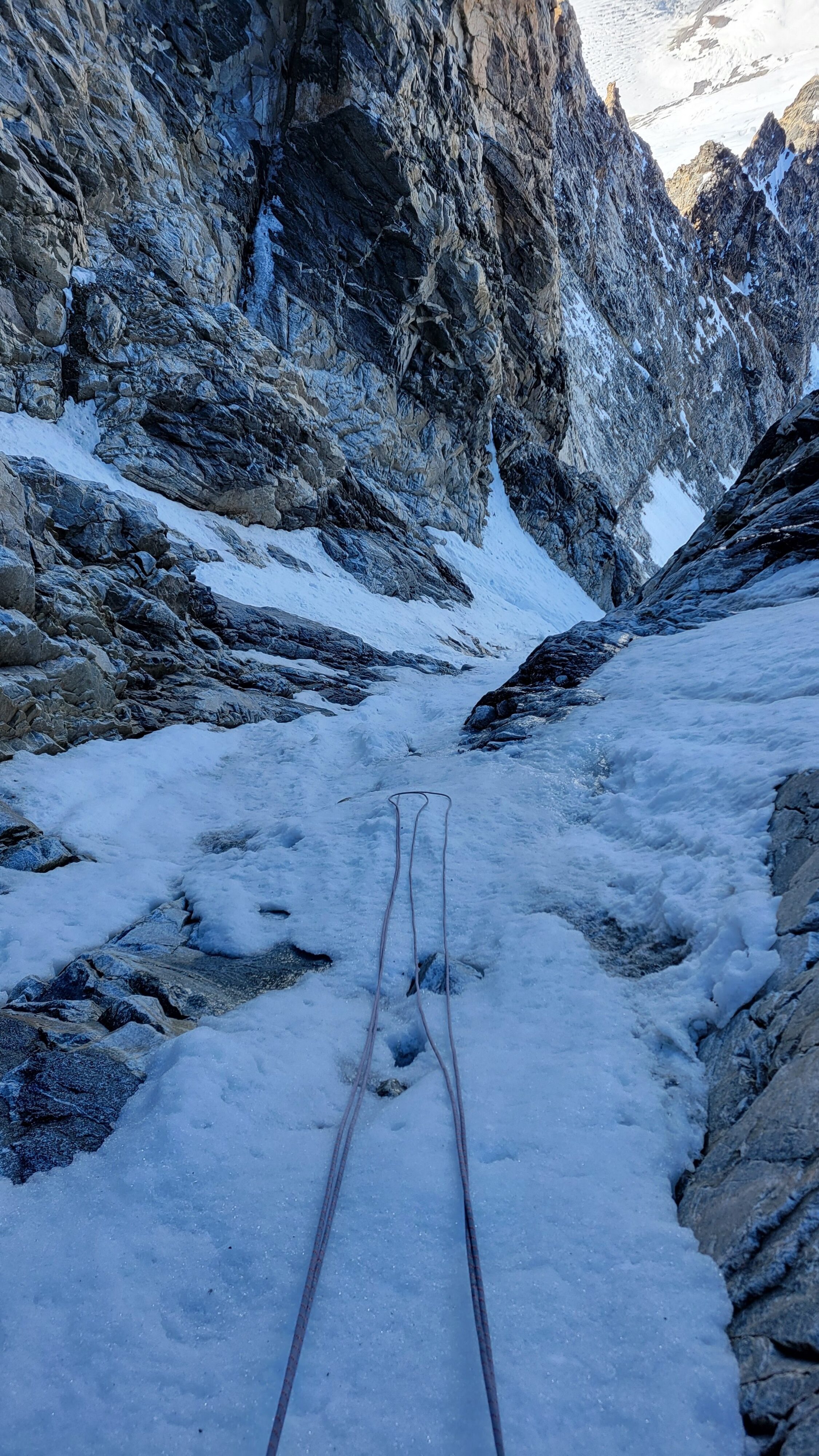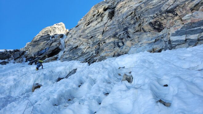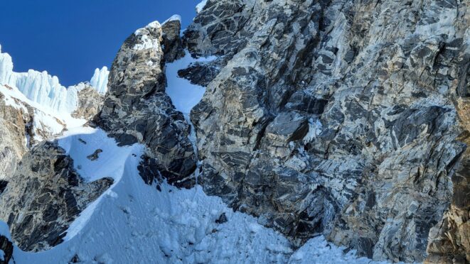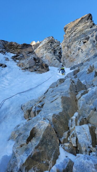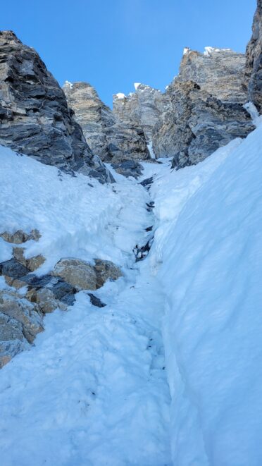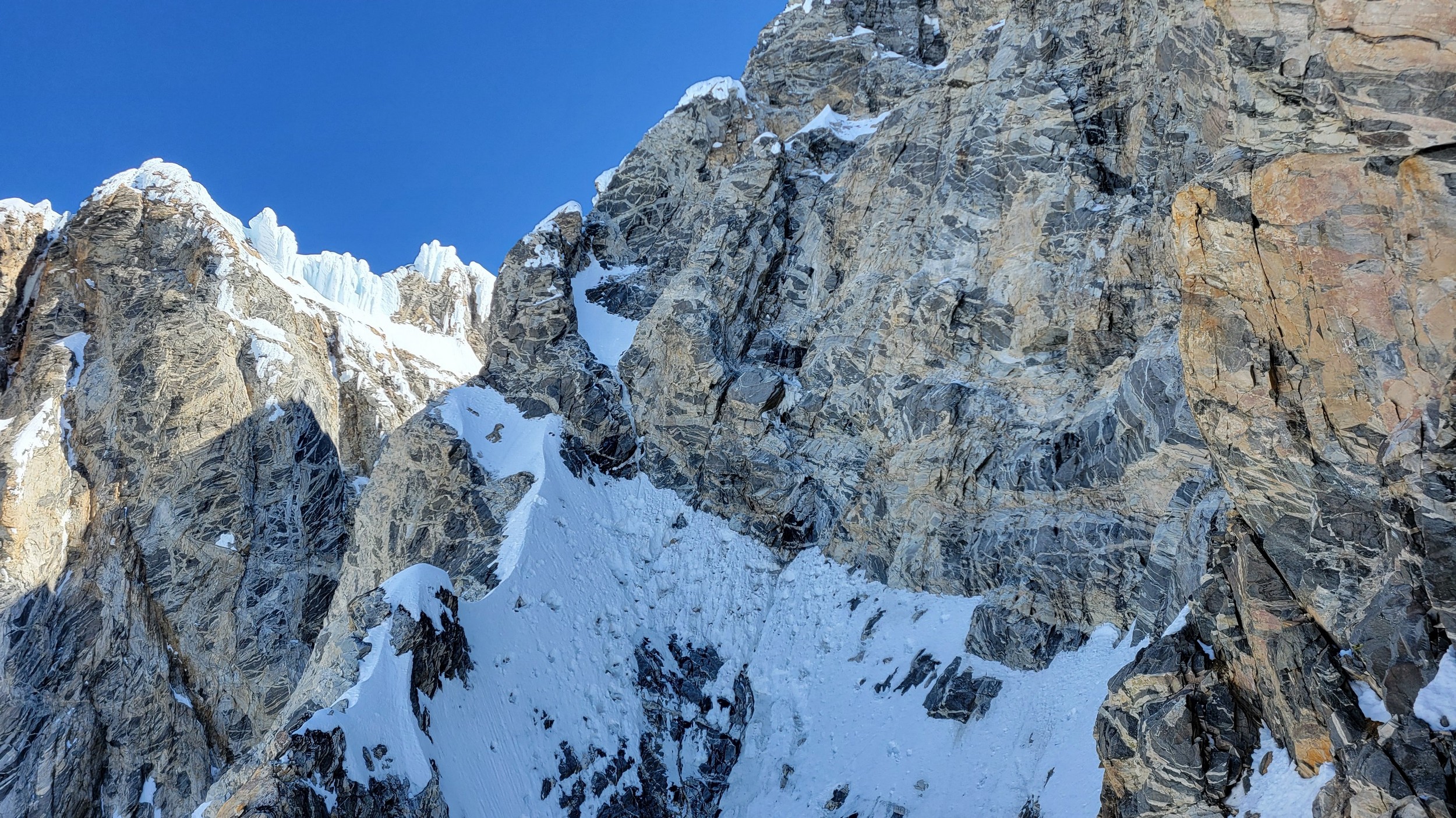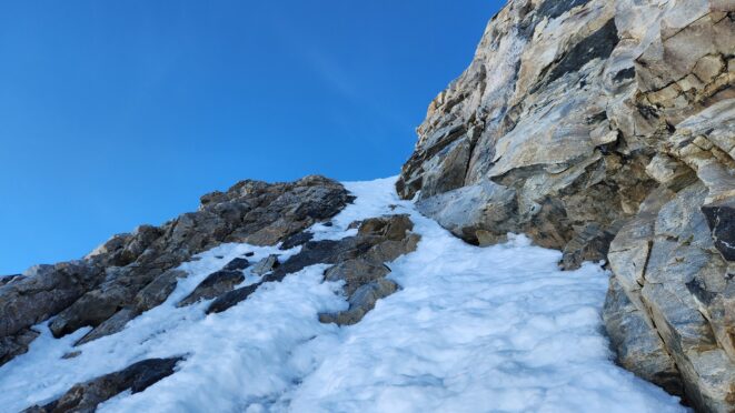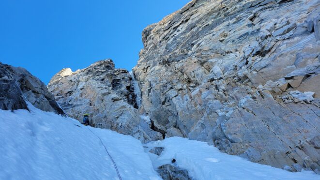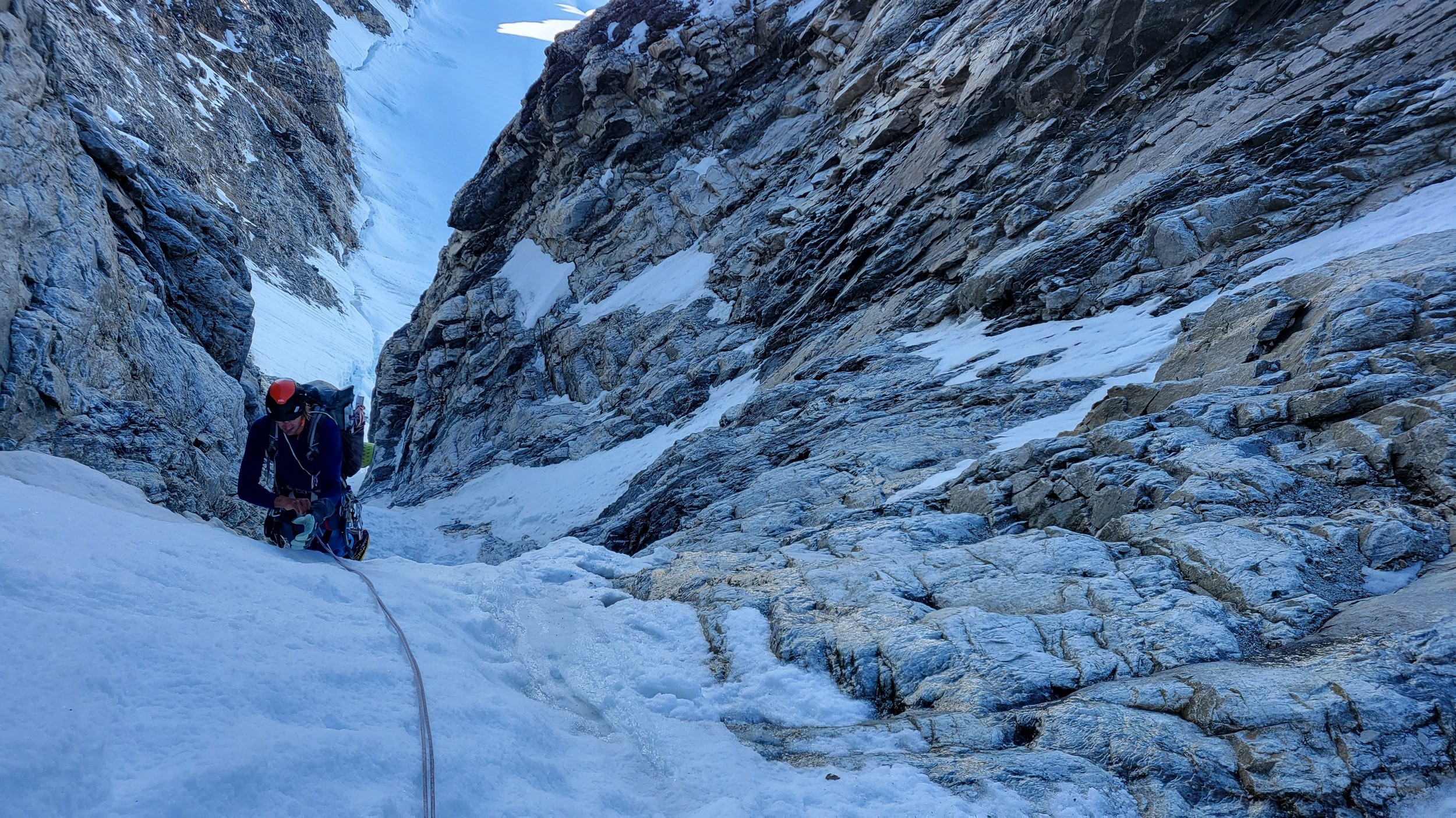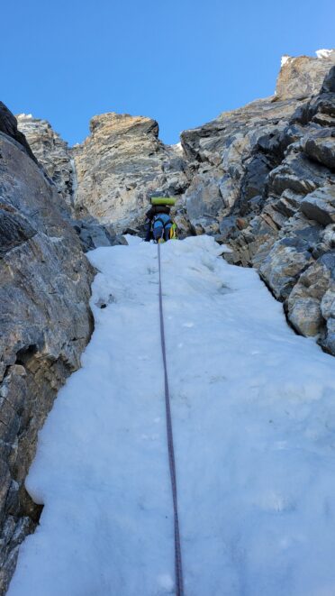 Above this we continued climbing up the now uniform shaded couloir which stayed a consistent 50 degrees. We made a special point to finish climbing the couloir before the sun hit it to ensure we were not getting pummeled with snow and ice due to sunlight thawing. The weather was perfect and warm for the foreseeable future and the temperatures were warm which was incredibly lucky. Conditions like this were something I'd waited half a decade for! We pretty quickly hit a fork in the couloir and we turned left and followed the ramp traversing up and cutting under a prominent rock pillar with a light colored cross on it shown in the beta photo above. The snow ramp abruptly ended and we found ourselves on some dry rock scrambling. The route took a sharp rightward traverse on a low angle but icy rock ledge to the triangle shaped snowfield. This infamous snowfield that had given previous parties pause or difficulty ended up being one of the easiest parts of the day for us. The snow had receded substantially in recent years and offered a very simple traverse across, with large steps/holes from where rocks had fallen offering plenty of places to casually stand. The photos below show the entry couloir through the triangle snowfield.