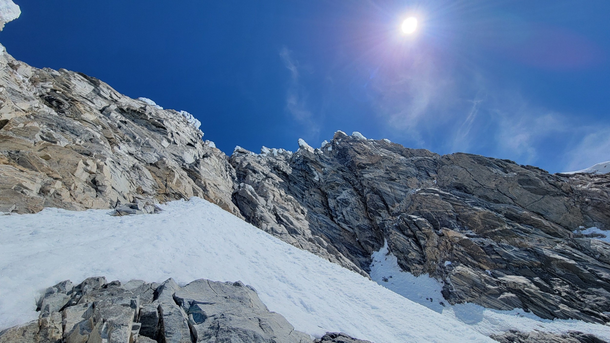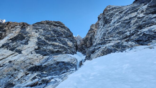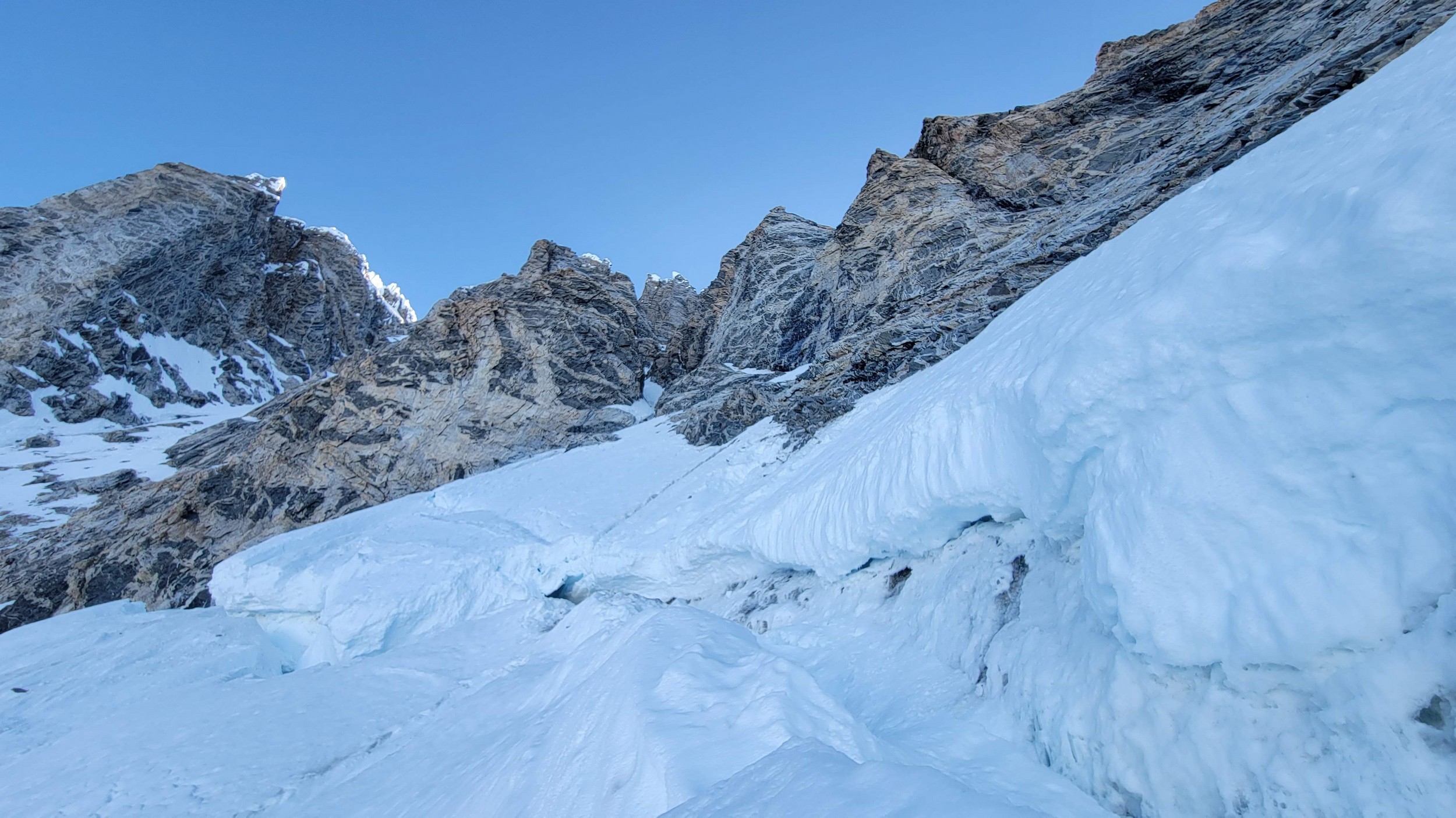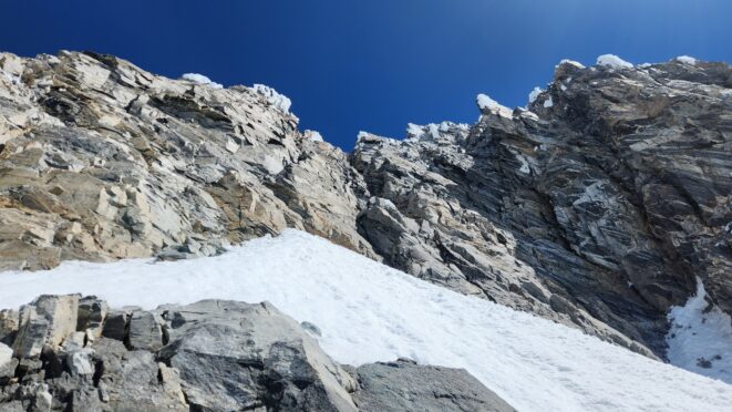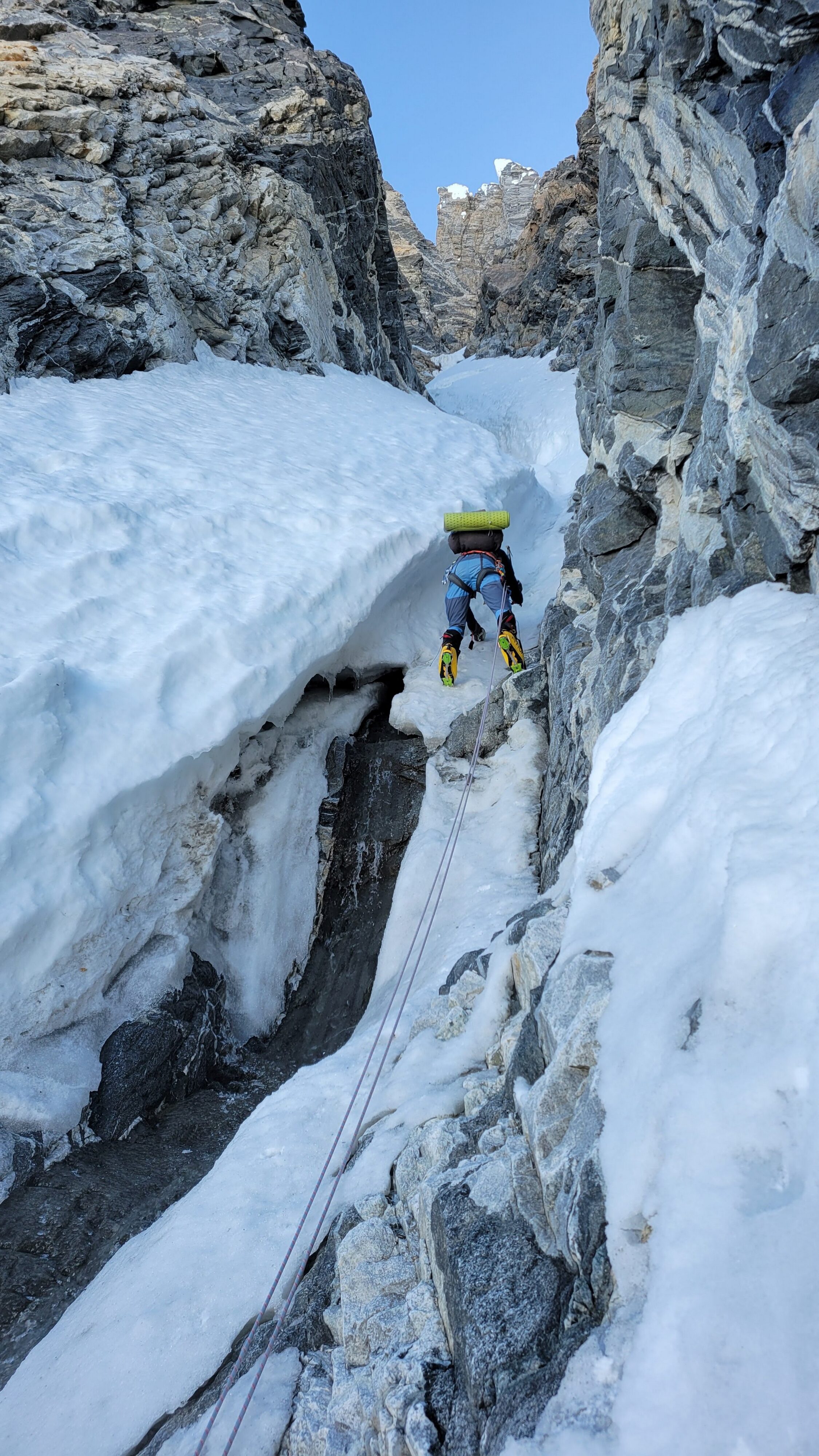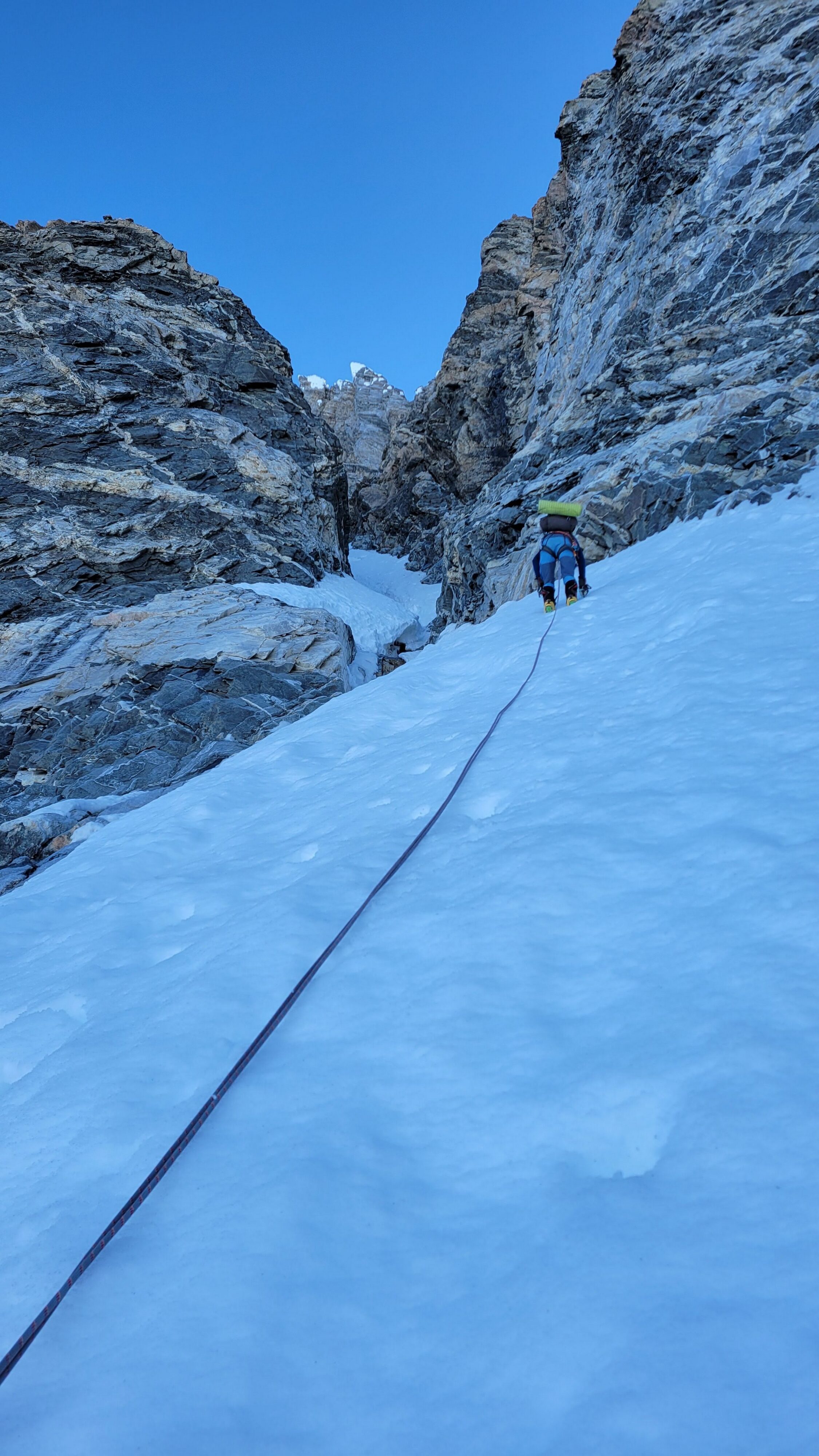 Above this we continued climbing up the now uniform shaded couloir which stayed a consistent 50 degrees. We made a special point to finish climbing the couloir before the sun hit it to ensure we were not getting pummeled with snow and ice due to sunlight thawing. The weather was perfect and warm for the foreseeable future and the temperatures were warm which was incredibly lucky. Conditions like this were something I'd waited half a decade for! We pretty quickly hit a fork in the couloir and we turned left and followed the ramp traversing up and cutting under a prominent rock pillar with a light colored cross on it shown in the beta photo above. The snow ramp abruptly ended and we found ourselves on some dry rock scrambling. The route took a sharp rightward traverse on a low angle but icy rock ledge to the triangle shaped snowfield. This infamous snowfield that had given previous parties pause or difficulty ended up being one of the easiest parts of the day for us. The snow had receded substantially in recent years and offered a very simple traverse across, with large steps/holes from where rocks had fallen offering plenty of places to casually stand. The photos below show the entry couloir through the triangle snowfield.