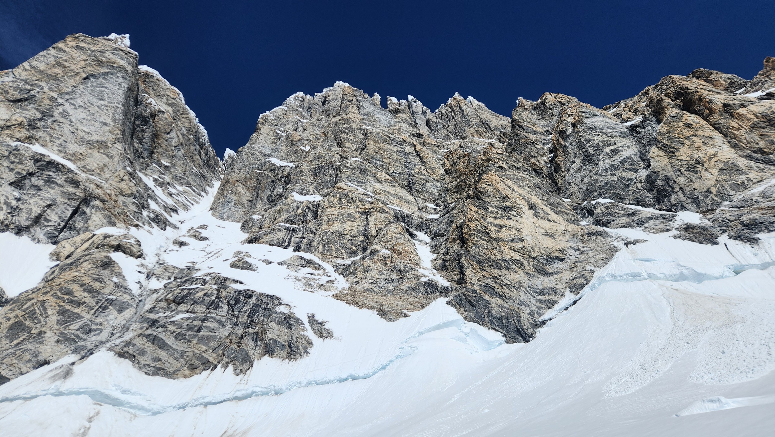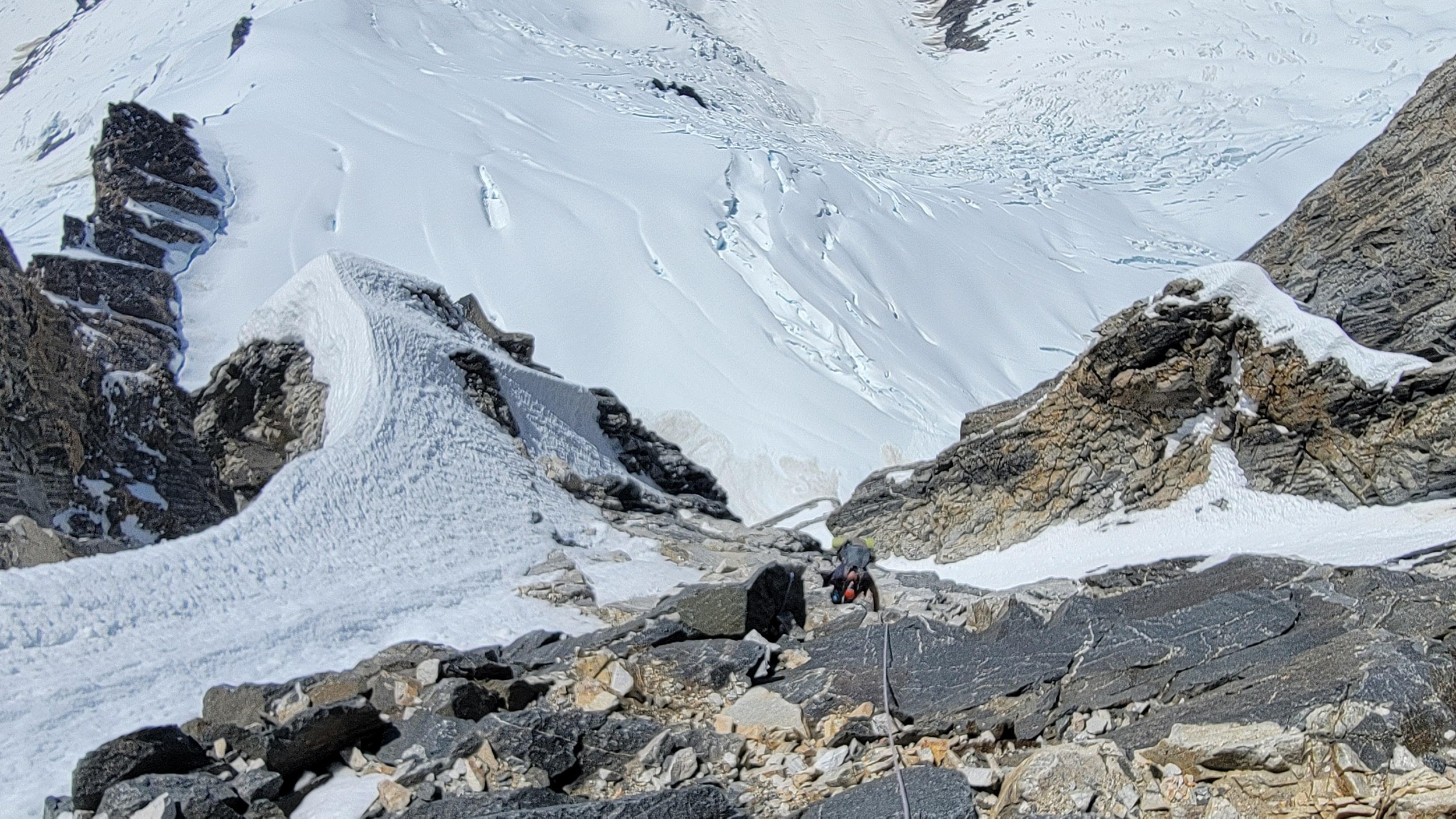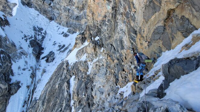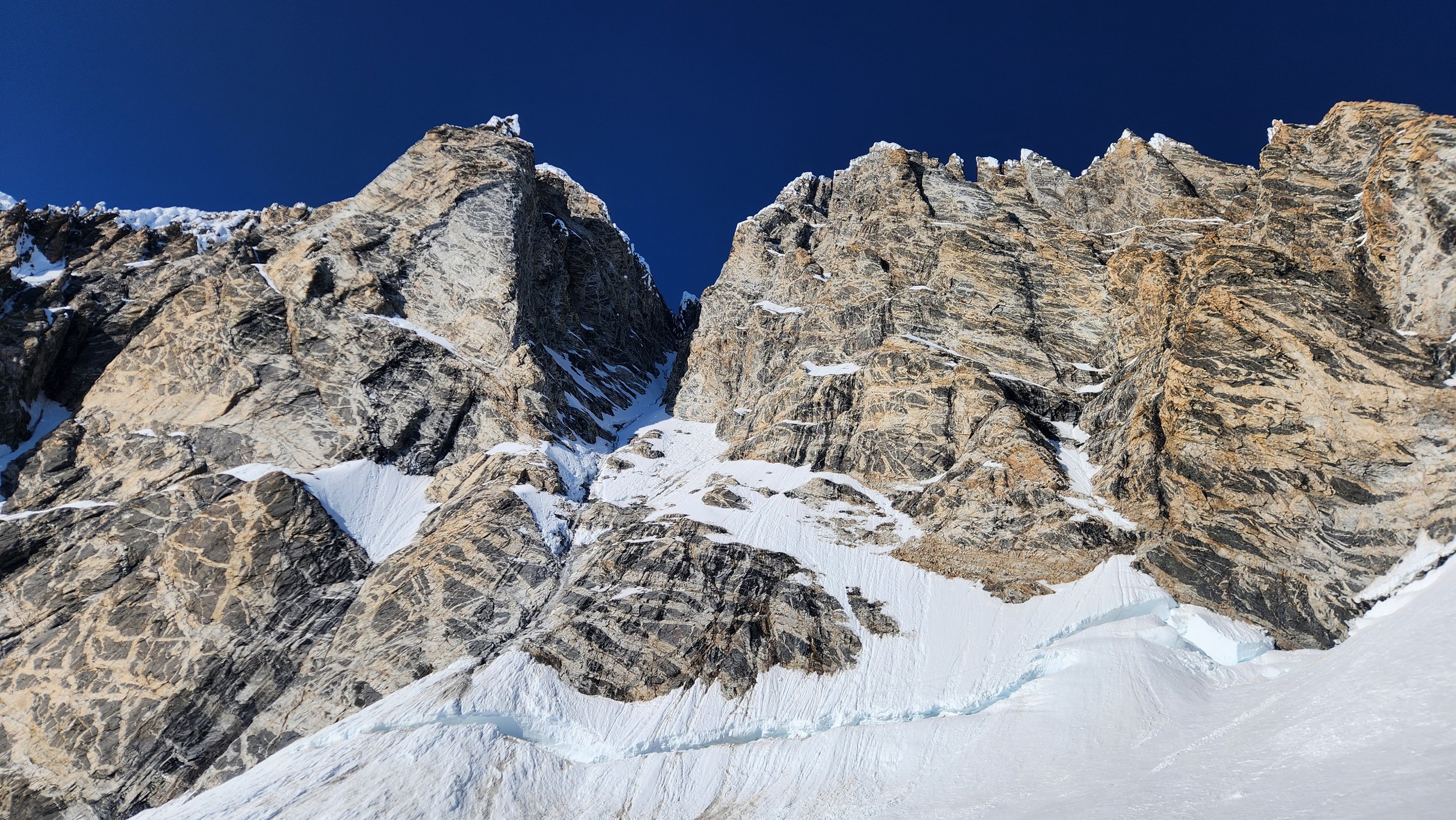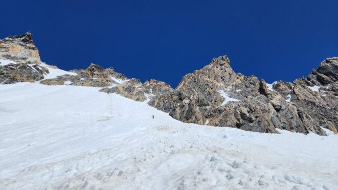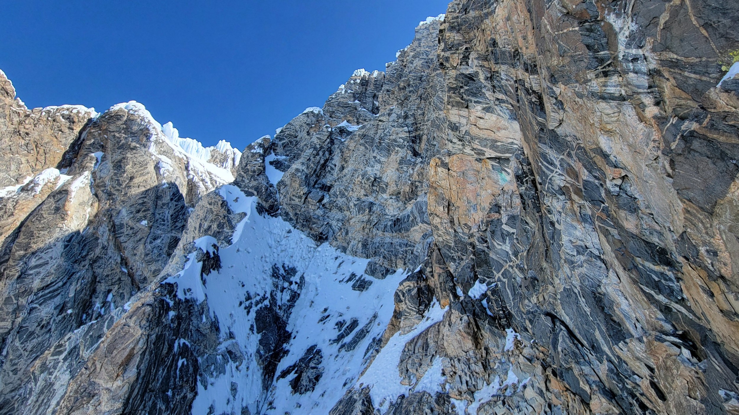 Above this we continued climbing up the now uniform shaded couloir which stayed a consistent 50 degrees. We made a special point to finish climbing the couloir before the sun hit it to ensure we were not getting pummeled with snow and ice due to sunlight thawing. The weather was perfect and warm for the foreseeable future and the temperatures were warm which was incredibly lucky. Conditions like this were something I'd waited half a decade for! We pretty quickly hit a fork in the couloir and we turned left and followed the ramp traversing up and cutting under a prominent rock pillar with a light colored cross on it shown in the beta photo above. The snow ramp abruptly ended and we found ourselves on some dry rock scrambling. The route took a sharp rightward traverse on a low angle but icy rock ledge to the triangle shaped snowfield. This infamous snowfield that had given previous parties pause or difficulty ended up being one of the easiest parts of the day for us. The snow had receded substantially in recent years and offered a very simple traverse across, with large steps/holes from where rocks had fallen offering plenty of places to casually stand. The photos below show the entry couloir through the triangle snowfield.
